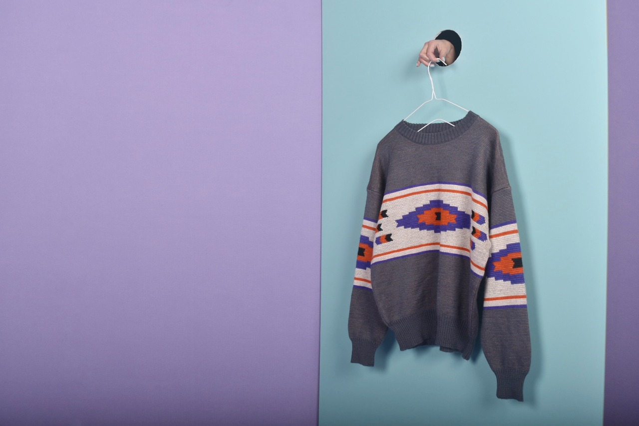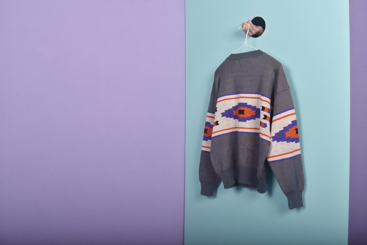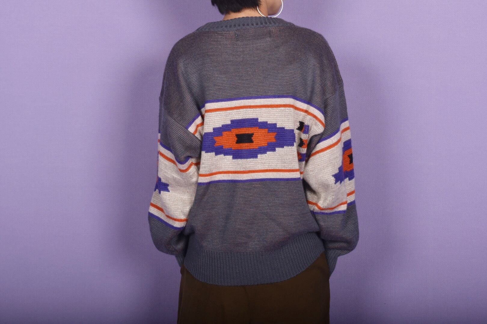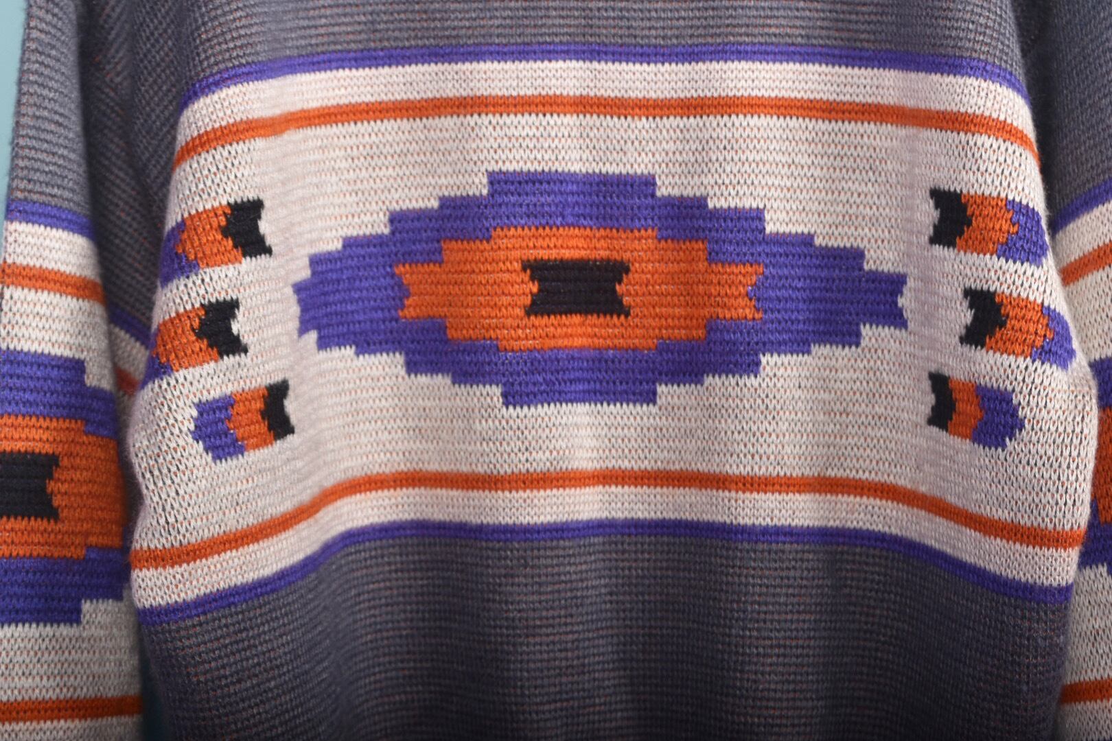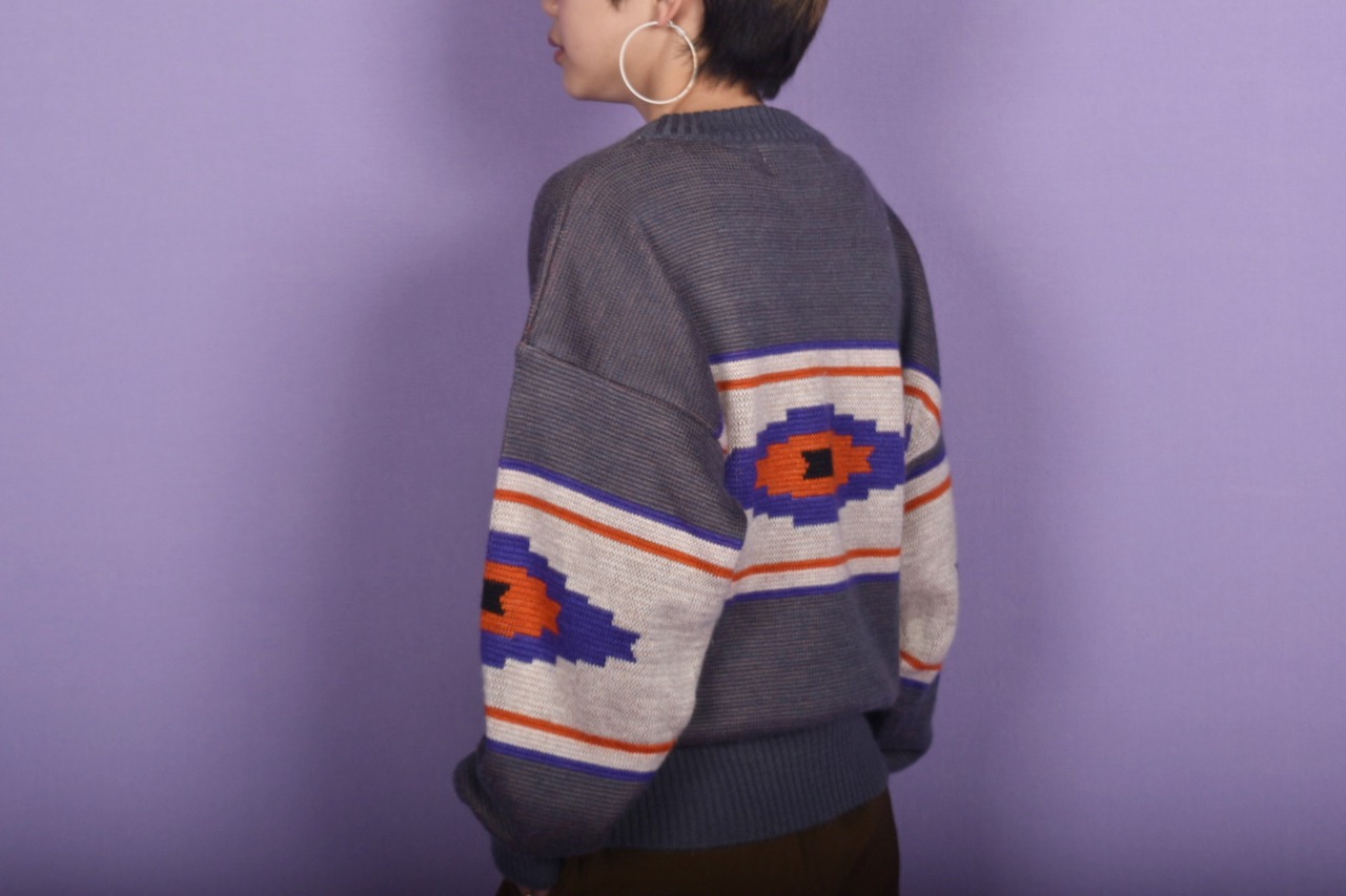 スモーキーなラベンダーカラーのネイティブ風ニットです。ジャガード織の風合いがポイントです。サラッとソフトな質感で非常に着心地が良いです。女性がゆったりと着るのにいい感じのサイズ感となります。
