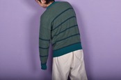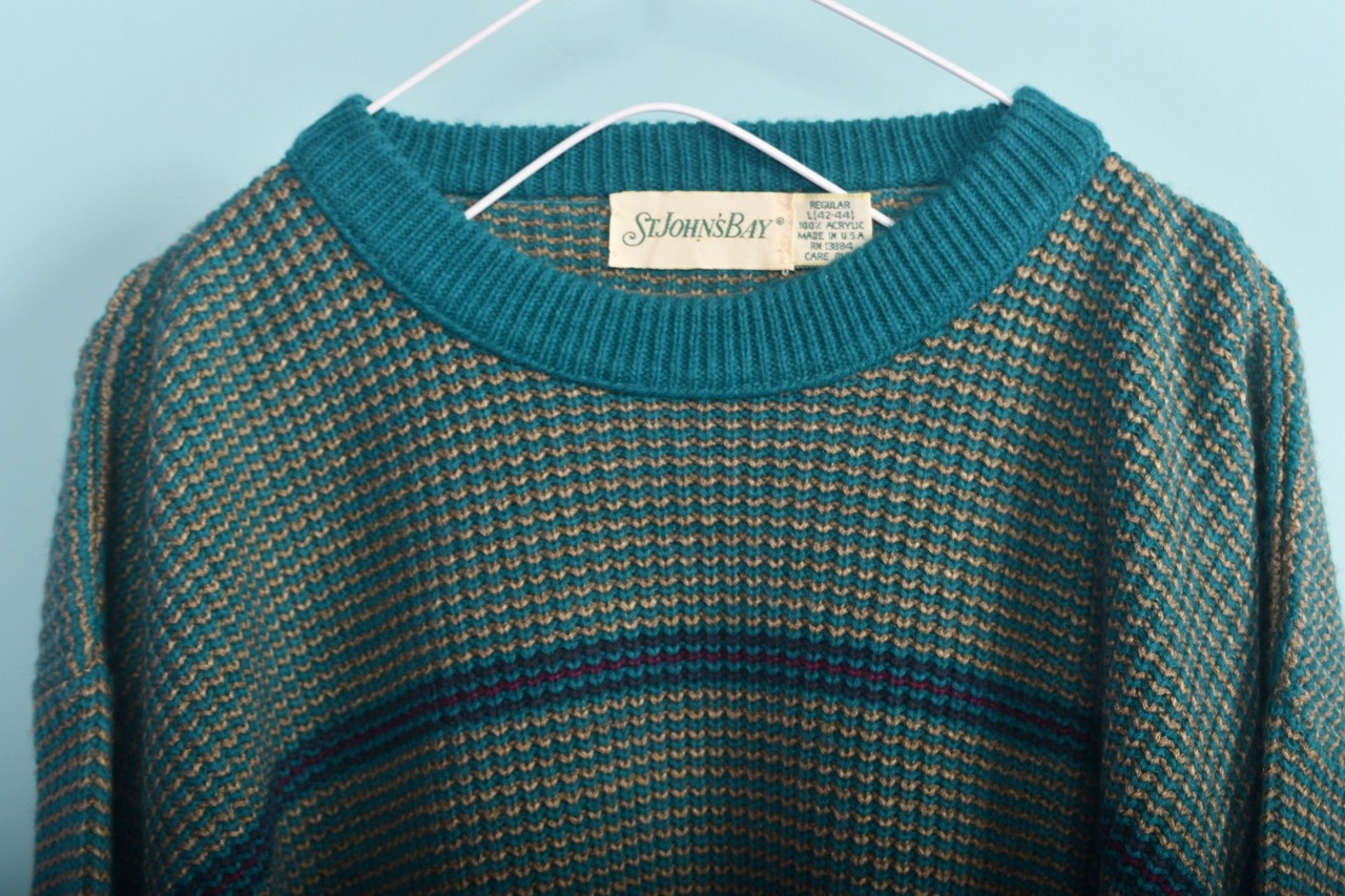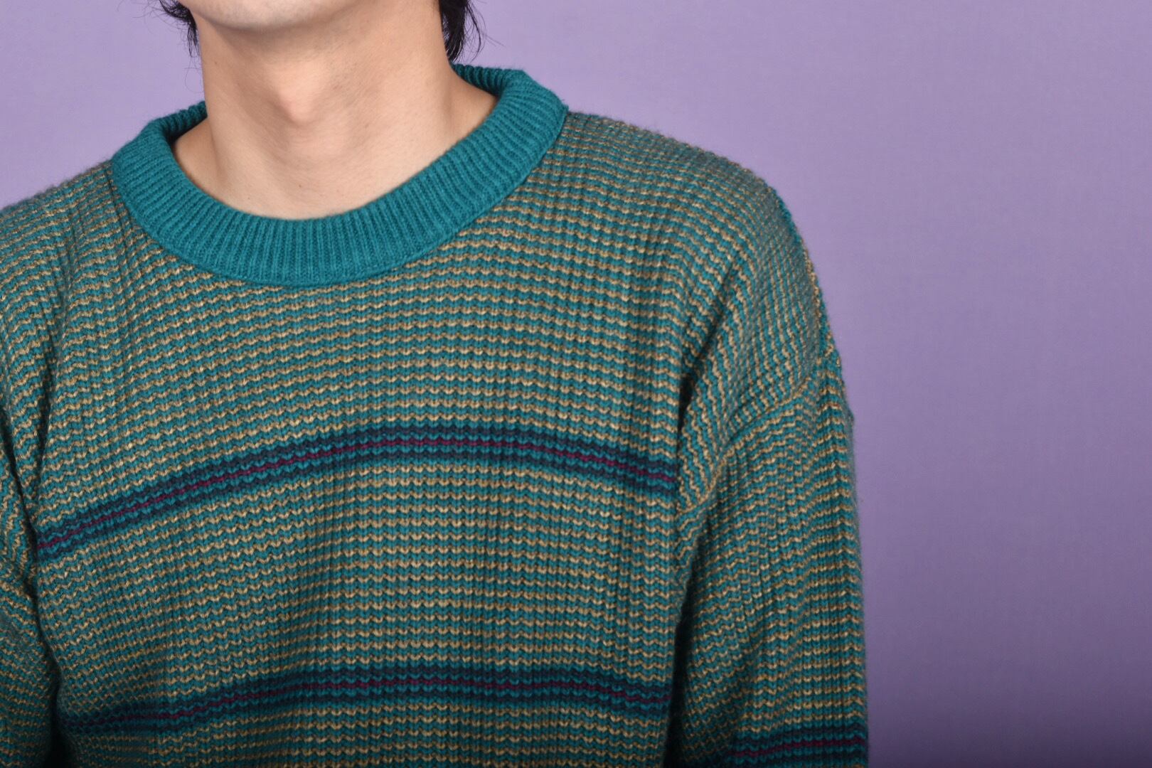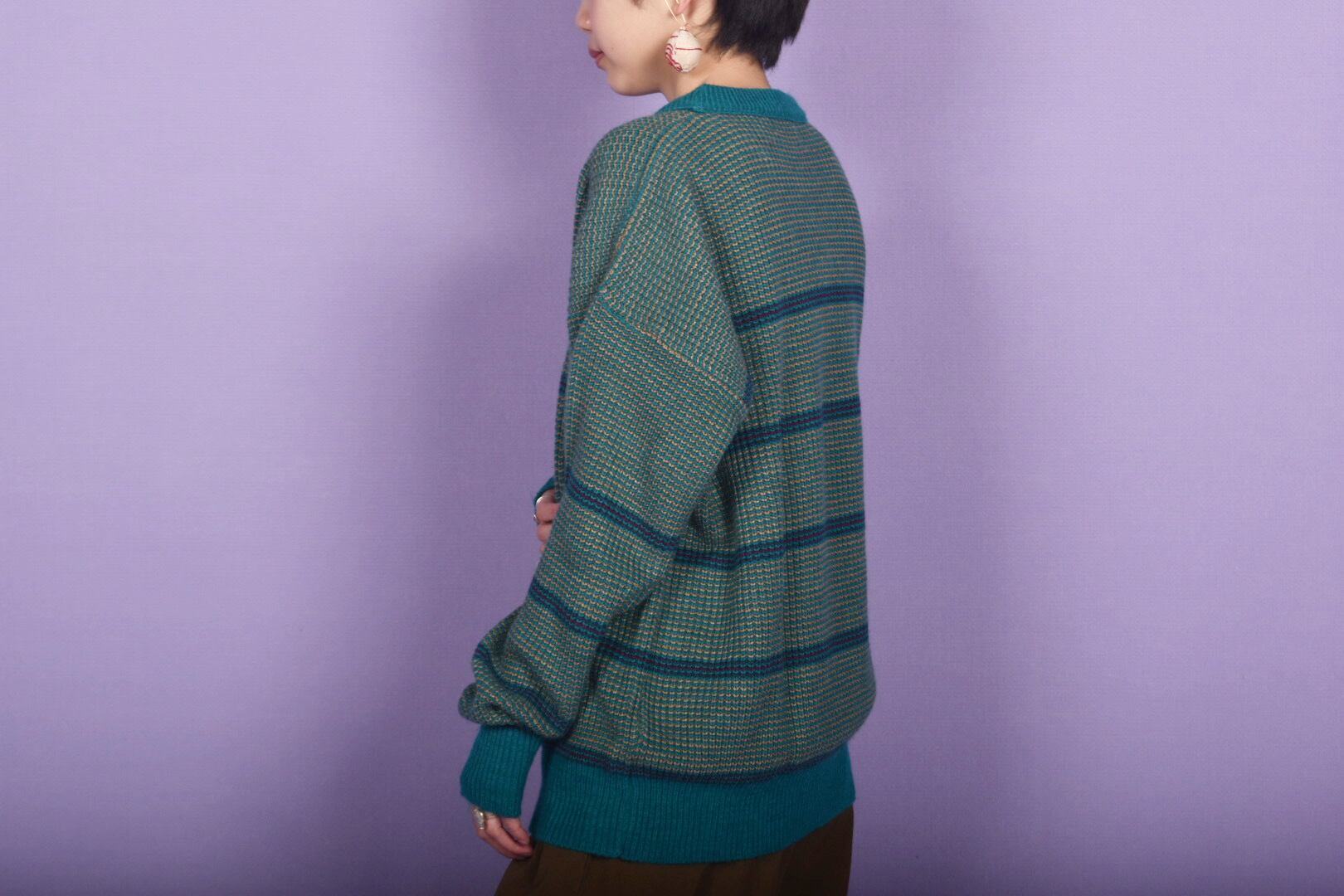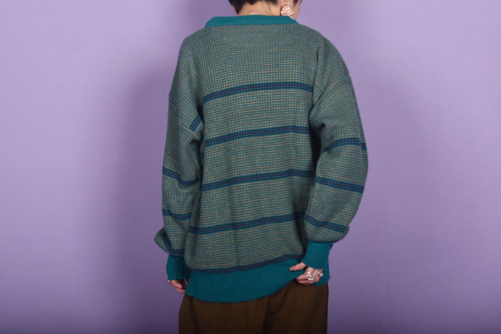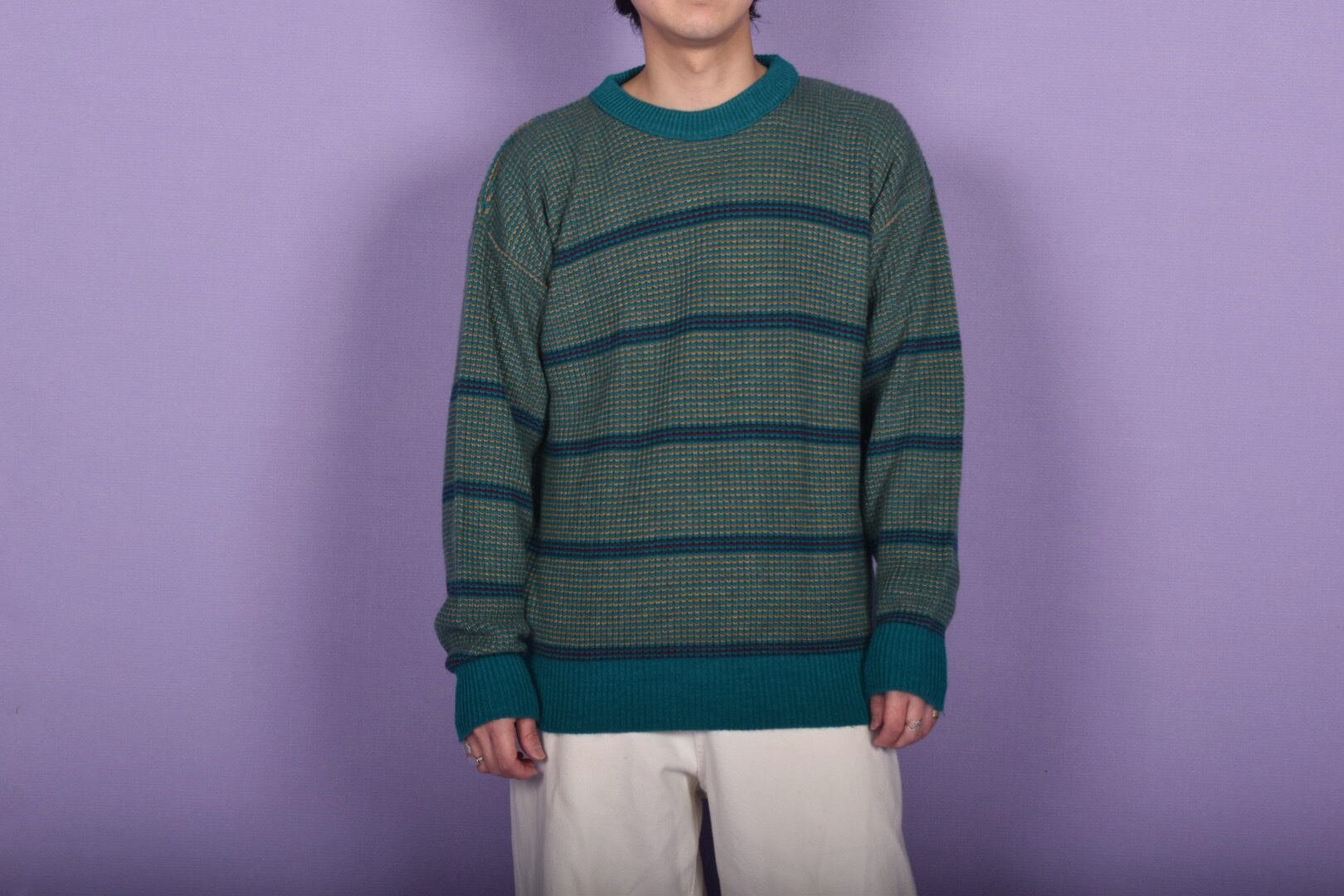 青緑とゴールドの糸で編まれたUSA製のニットです。配色の可愛さと鹿子の編み地が素晴らしい1着。さりげなくセンスを感じるニットです。