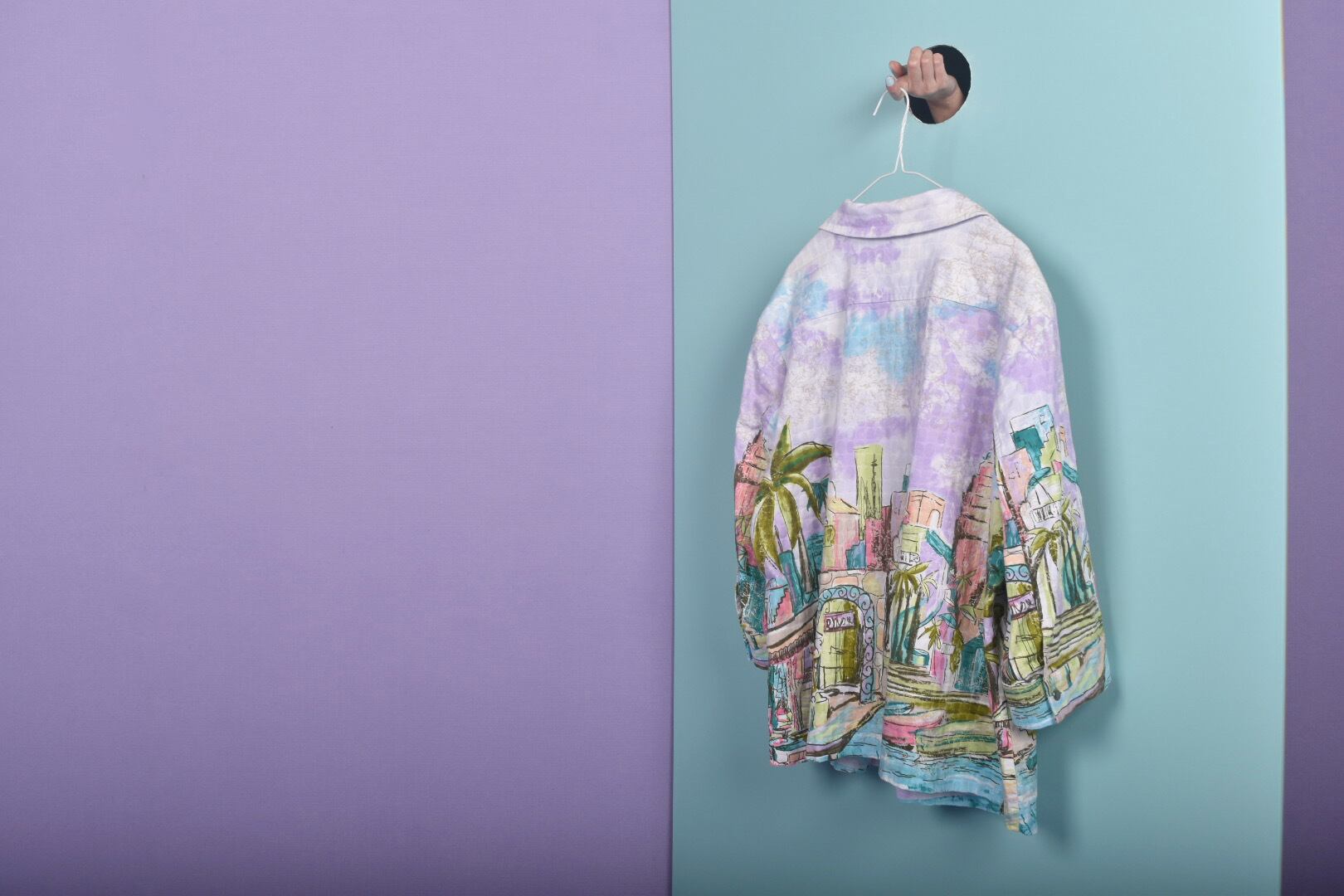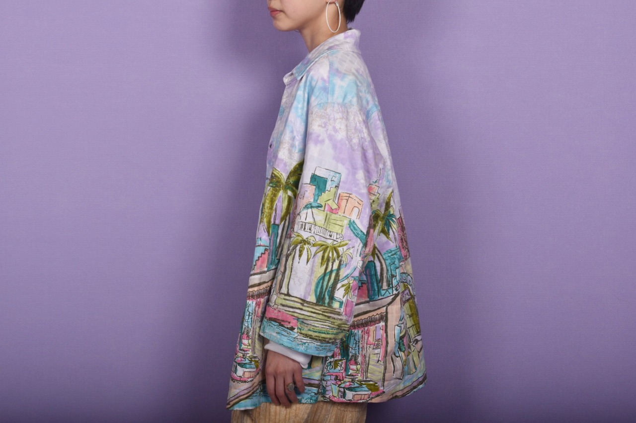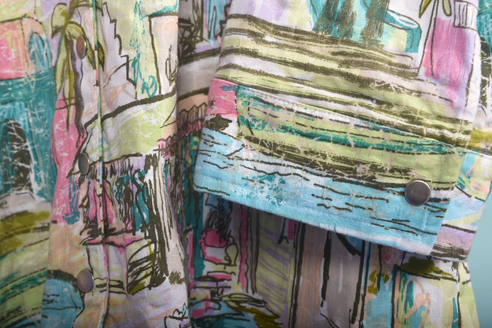 リゾート感たっぷりのプリントがされたジャケットです。エンボス加工された凹凸感のある生地が可愛いです。バストダーツ位置を改善し、シルエット調整をしました。