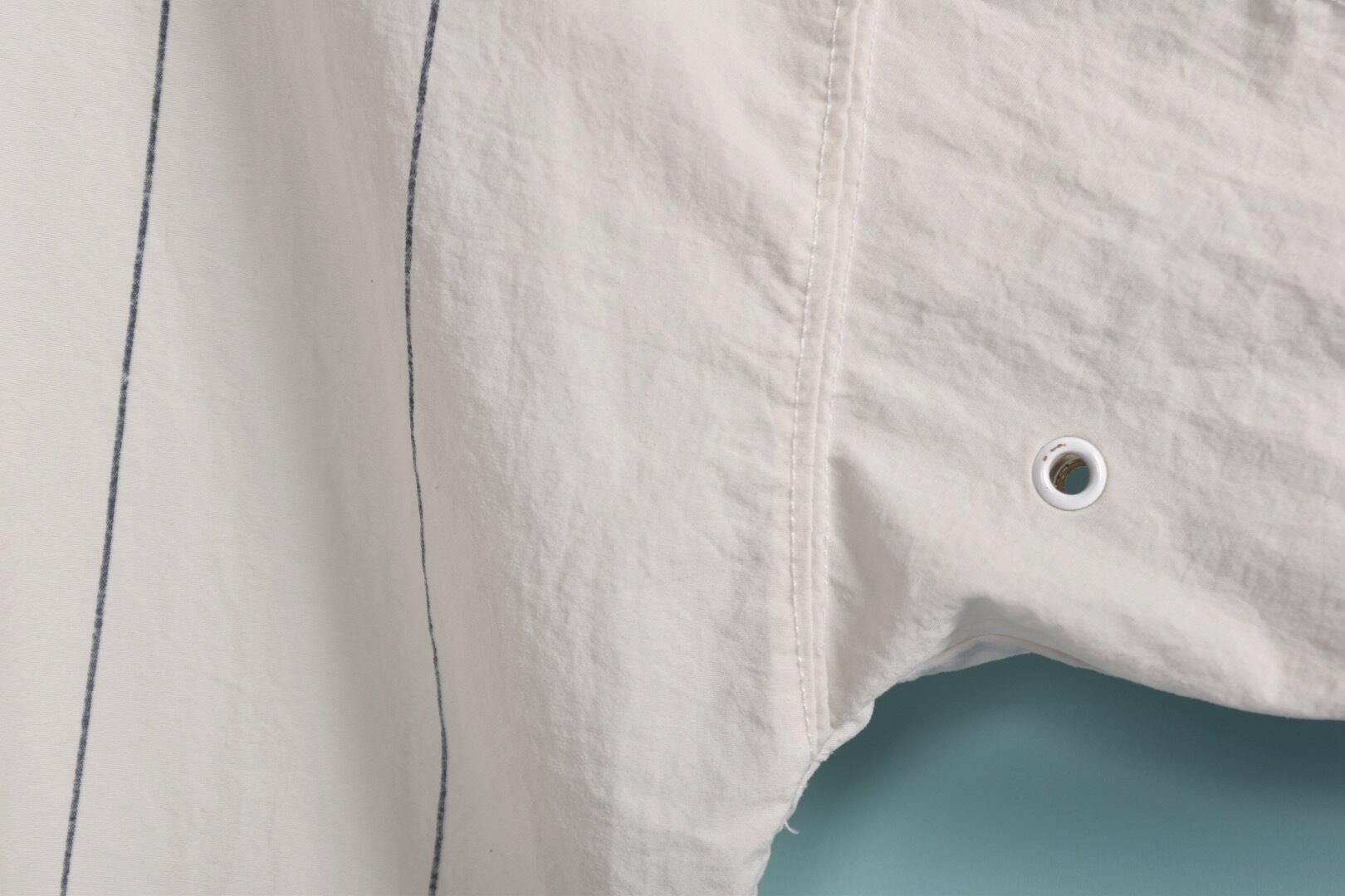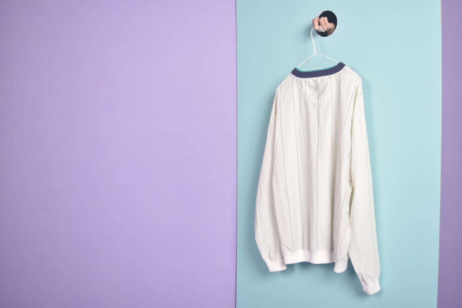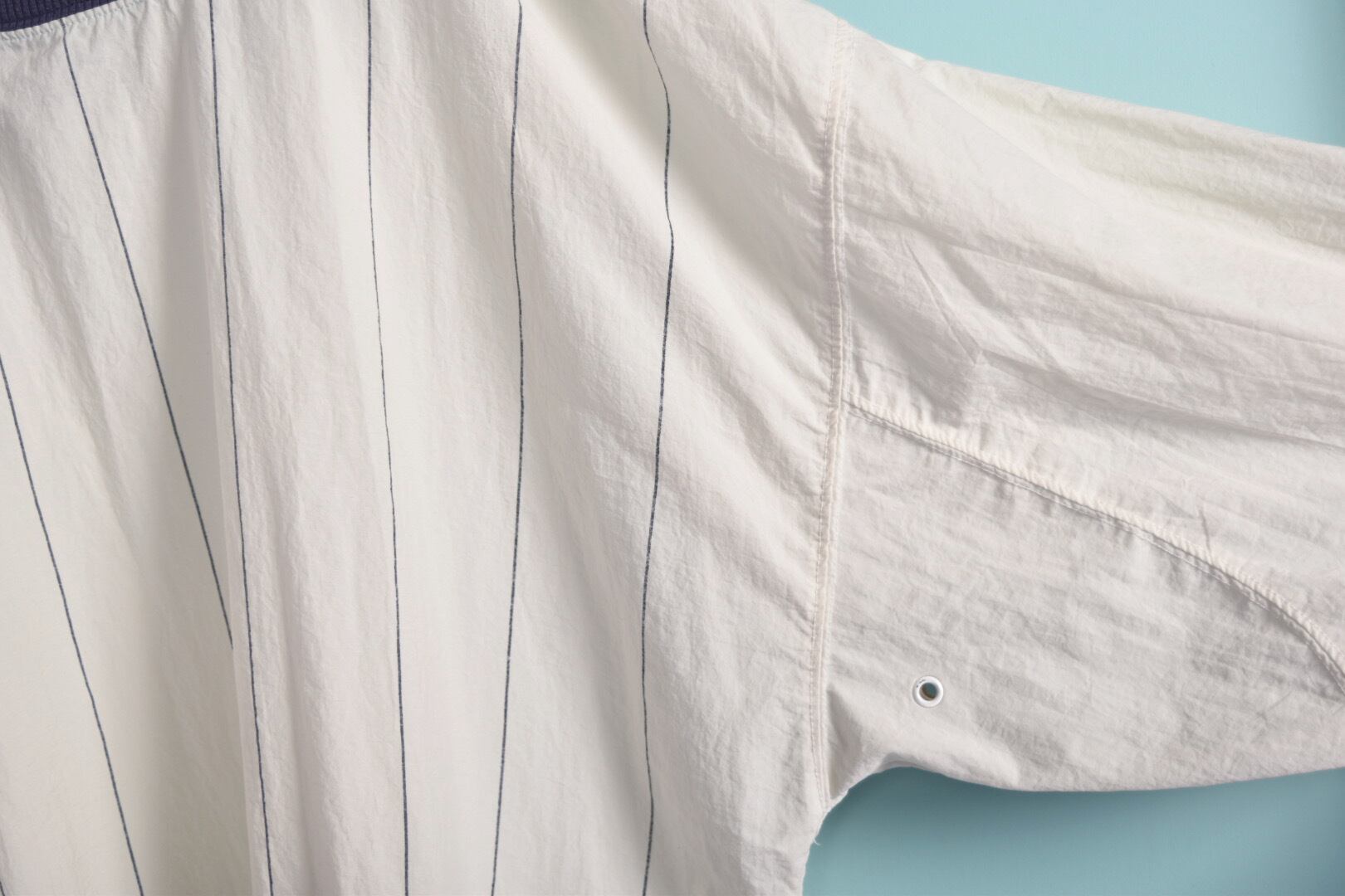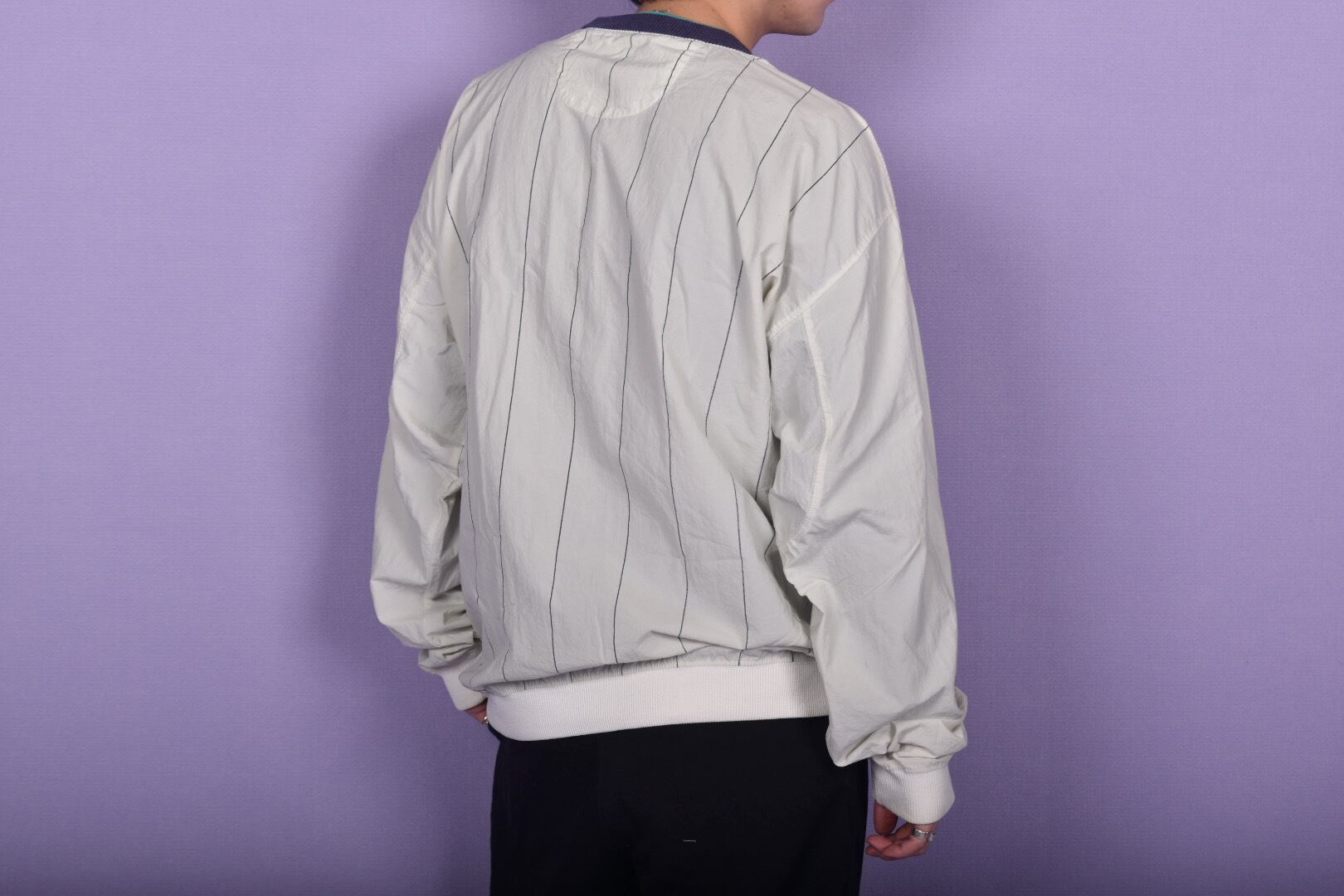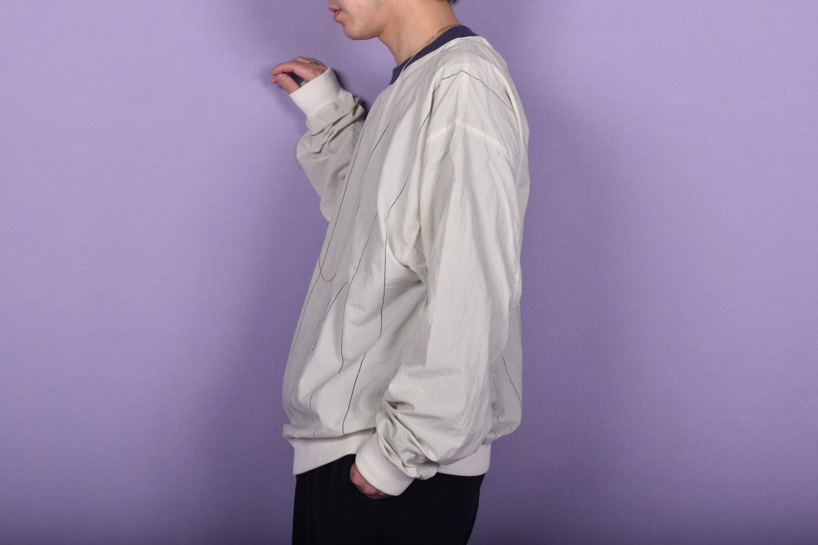 紙のようなサラッとした質感のストライプ生地を使用したプルオーバーです。ネックのリブはネイビーとグリーンの二重仕様です。ゆるっと丸みのあるフォルム、一枚でも様になる春に活躍する1着です。