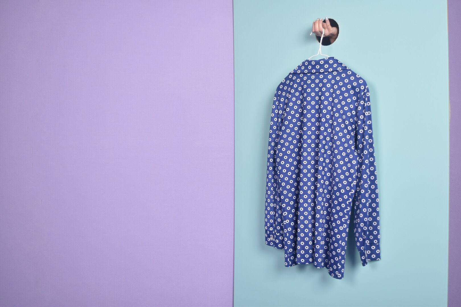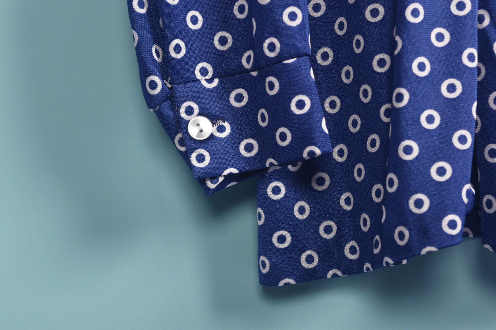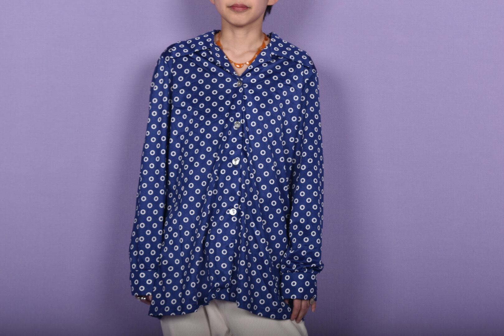 70年代のドット柄ブラウスです。ドットが○なのが面白いです。ナイロン素材のトロッとした生地で落ち感が良いです。