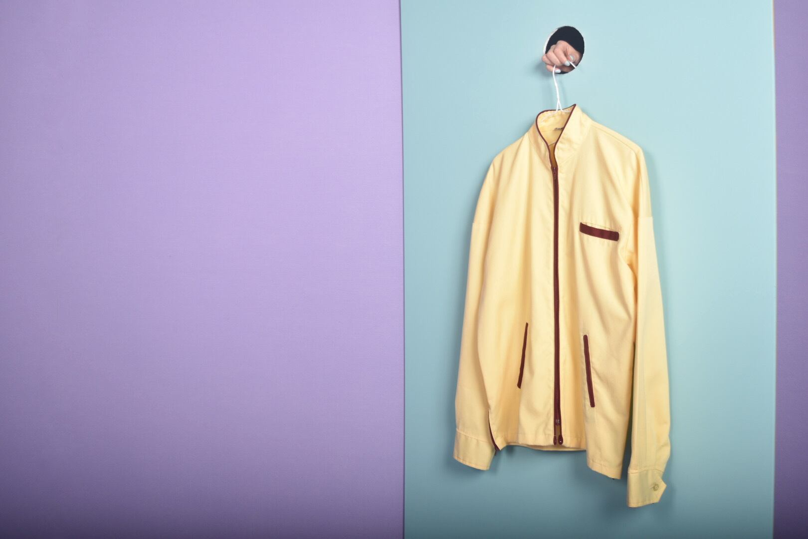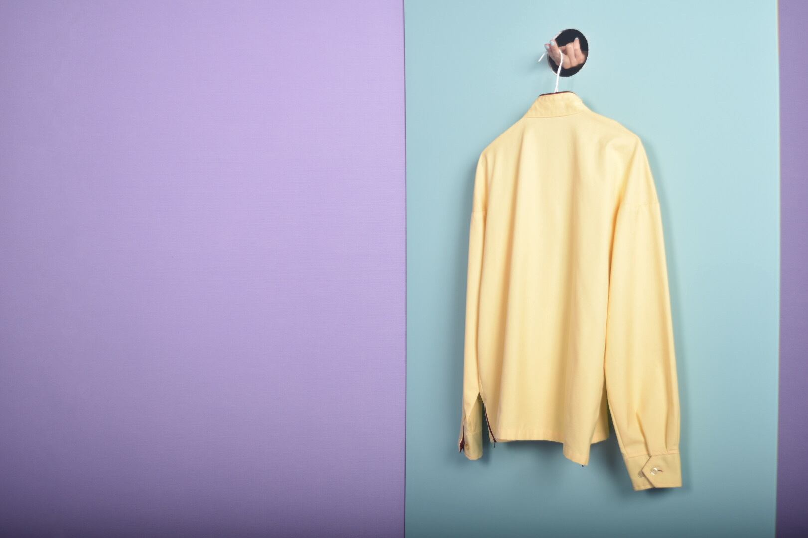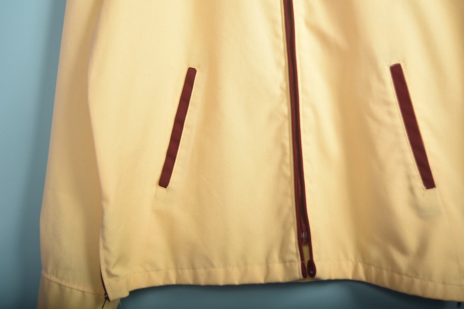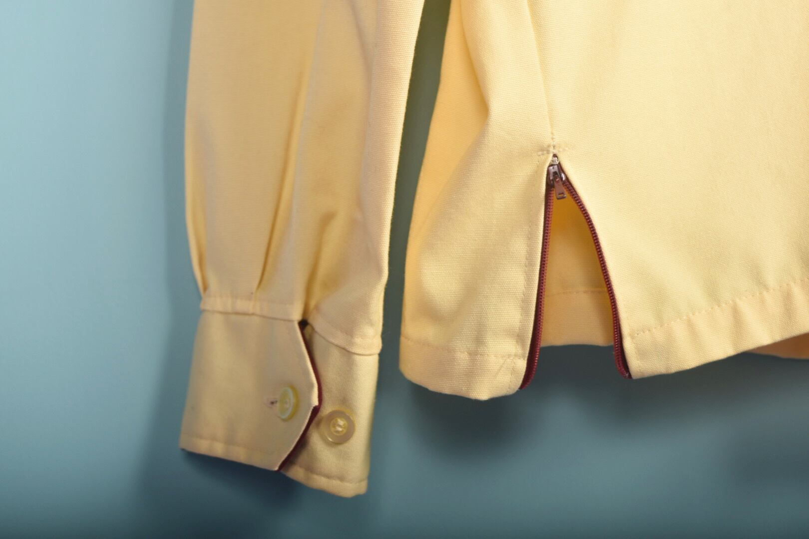 エンジとイエローの配色が可愛いジップジャケットです。薄手なのでシャツとしてインナーにもおすすめです。見た目の面白さは勿論、袖付けのパターンやジップ仕様のスリットなど細かいディテールも遊び心がある1着です。