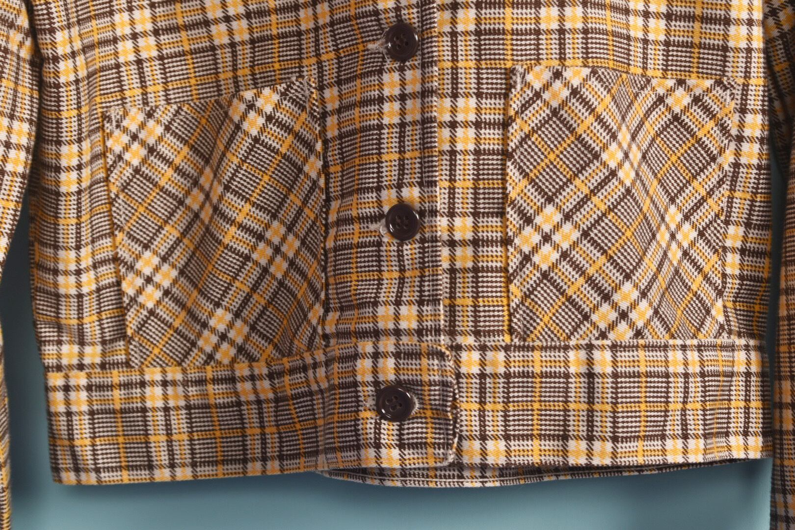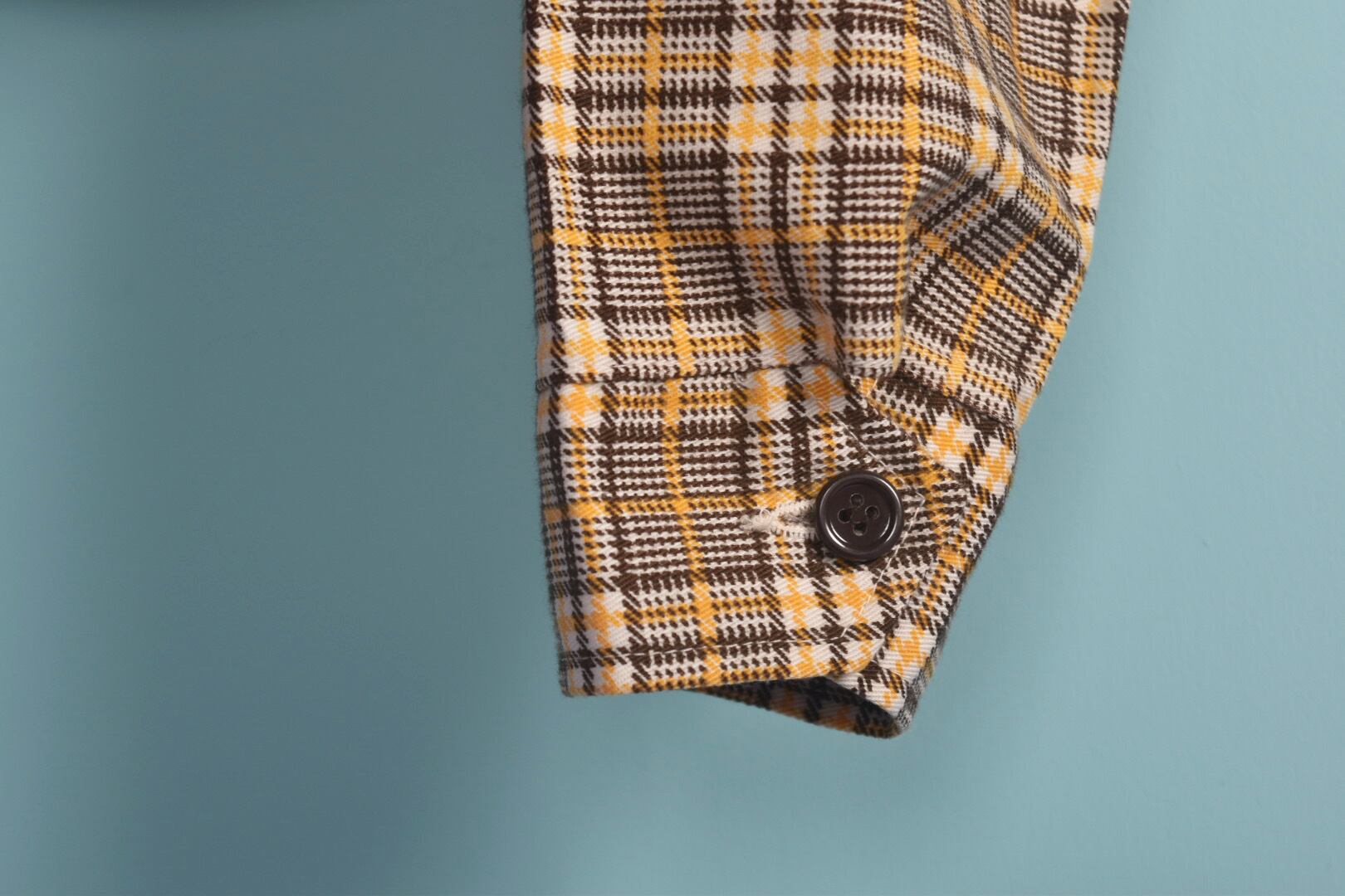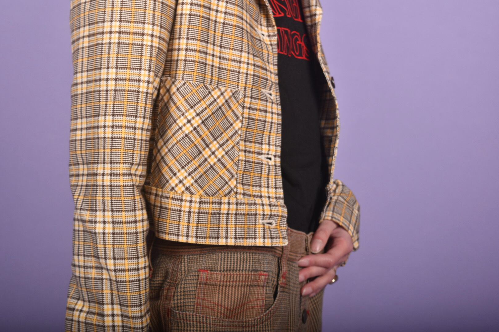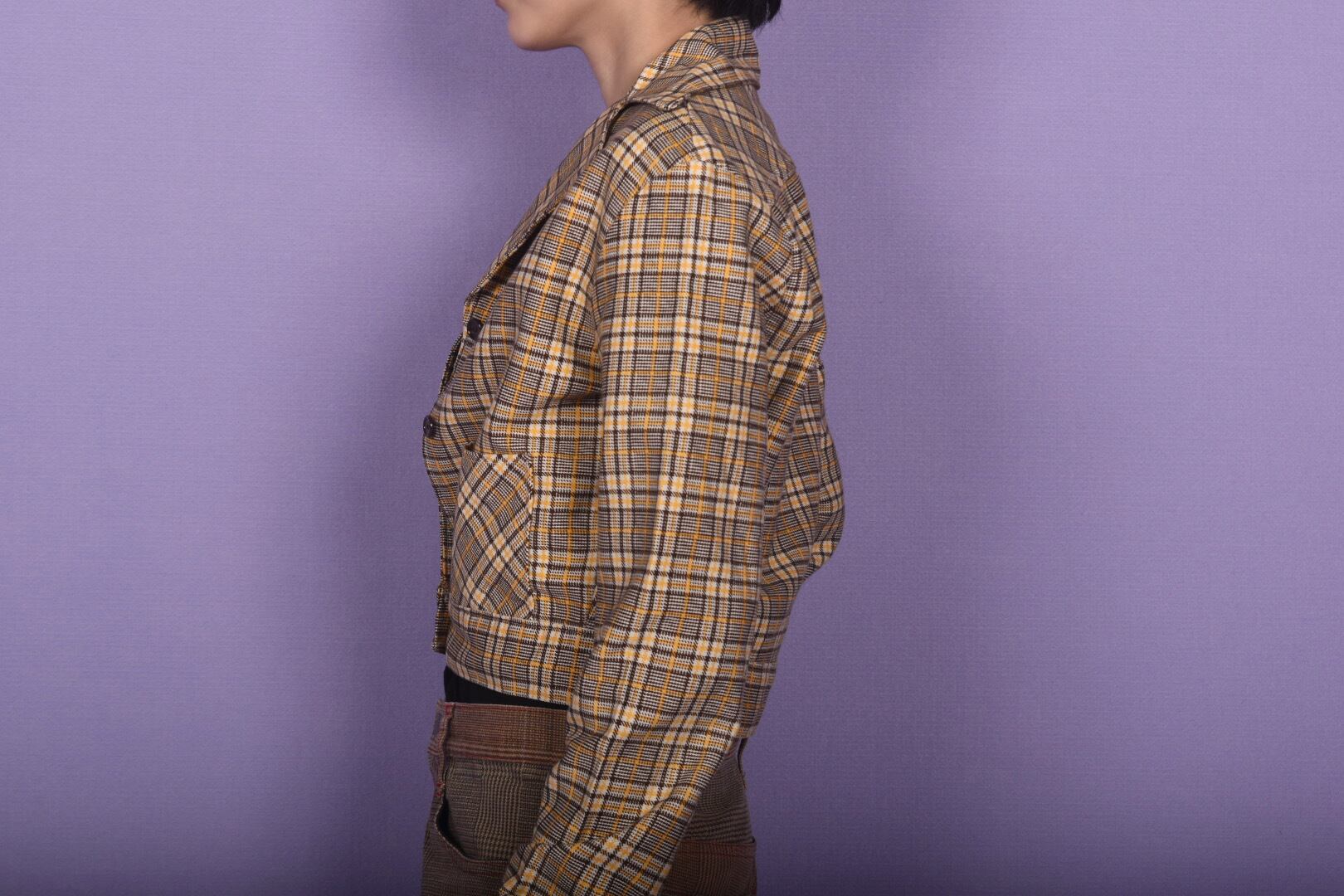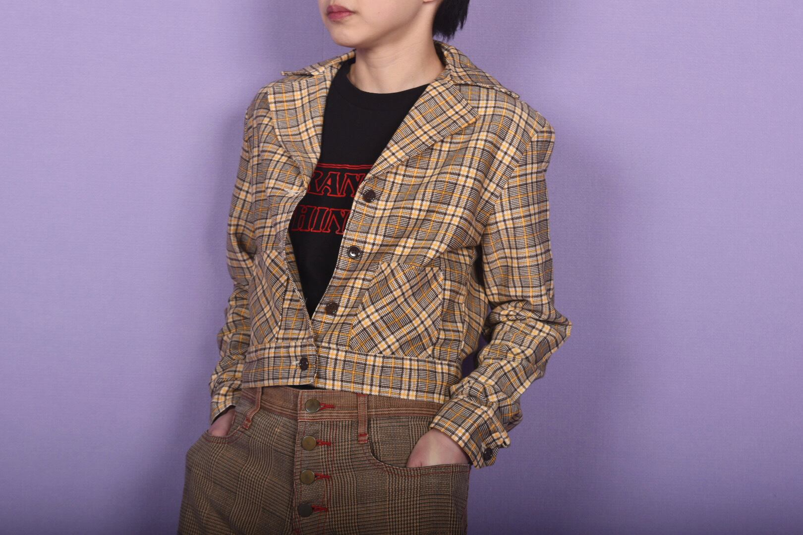硬さのあるチェック生地を使用したショート丈のジャケットです。かなり大きい襟を程よいバランスの大きさにリメイクしました。緩めのファッションに飽きた方にぜひチャレンジしていただきたい1着です。新鮮でかっこいい。