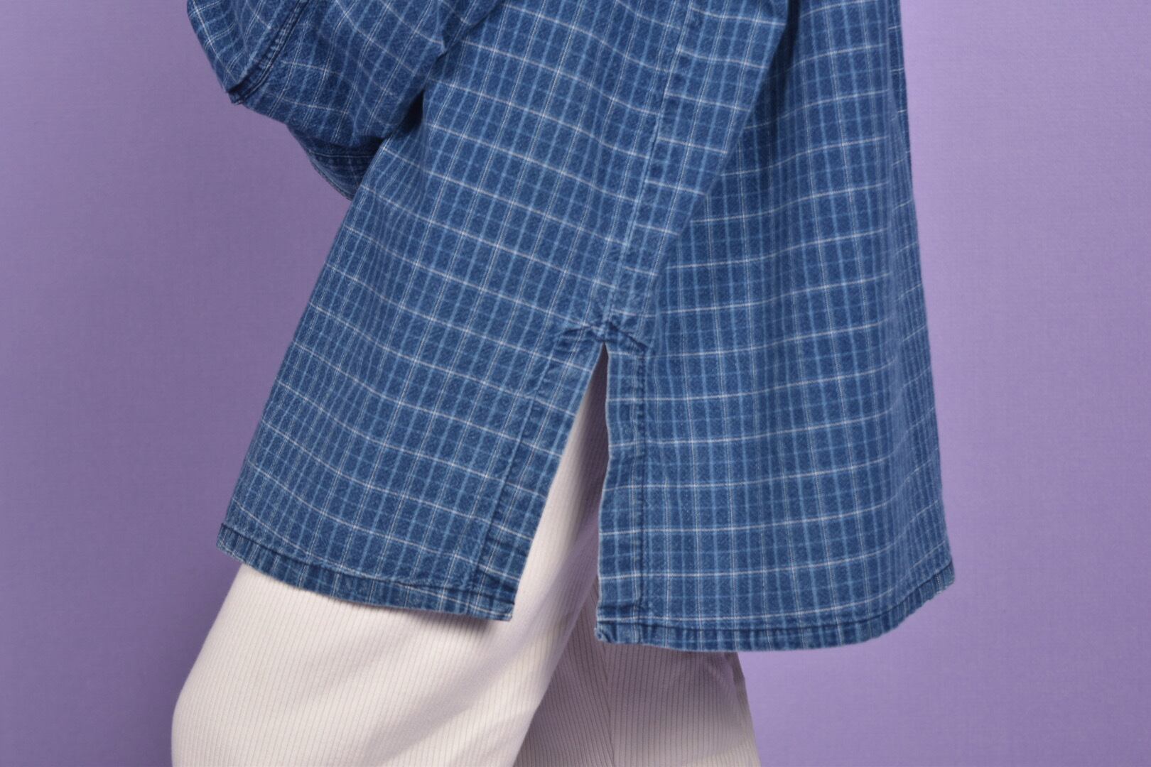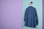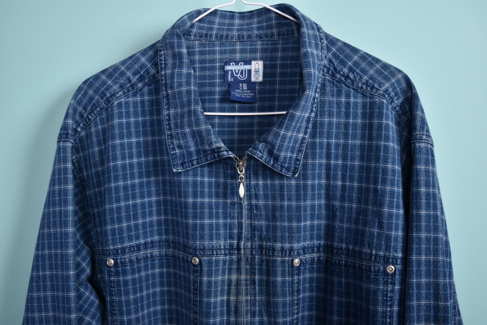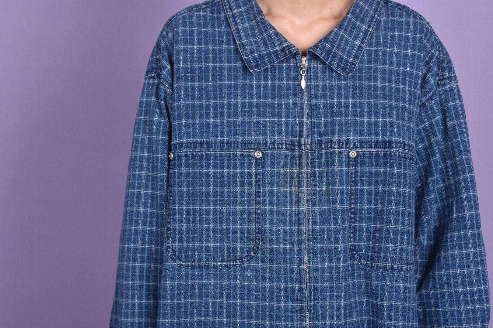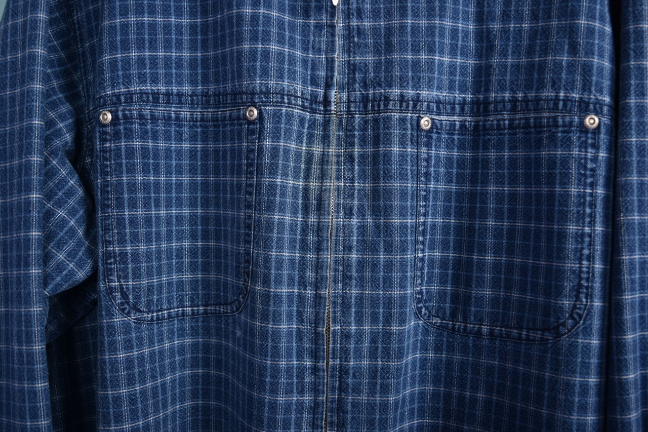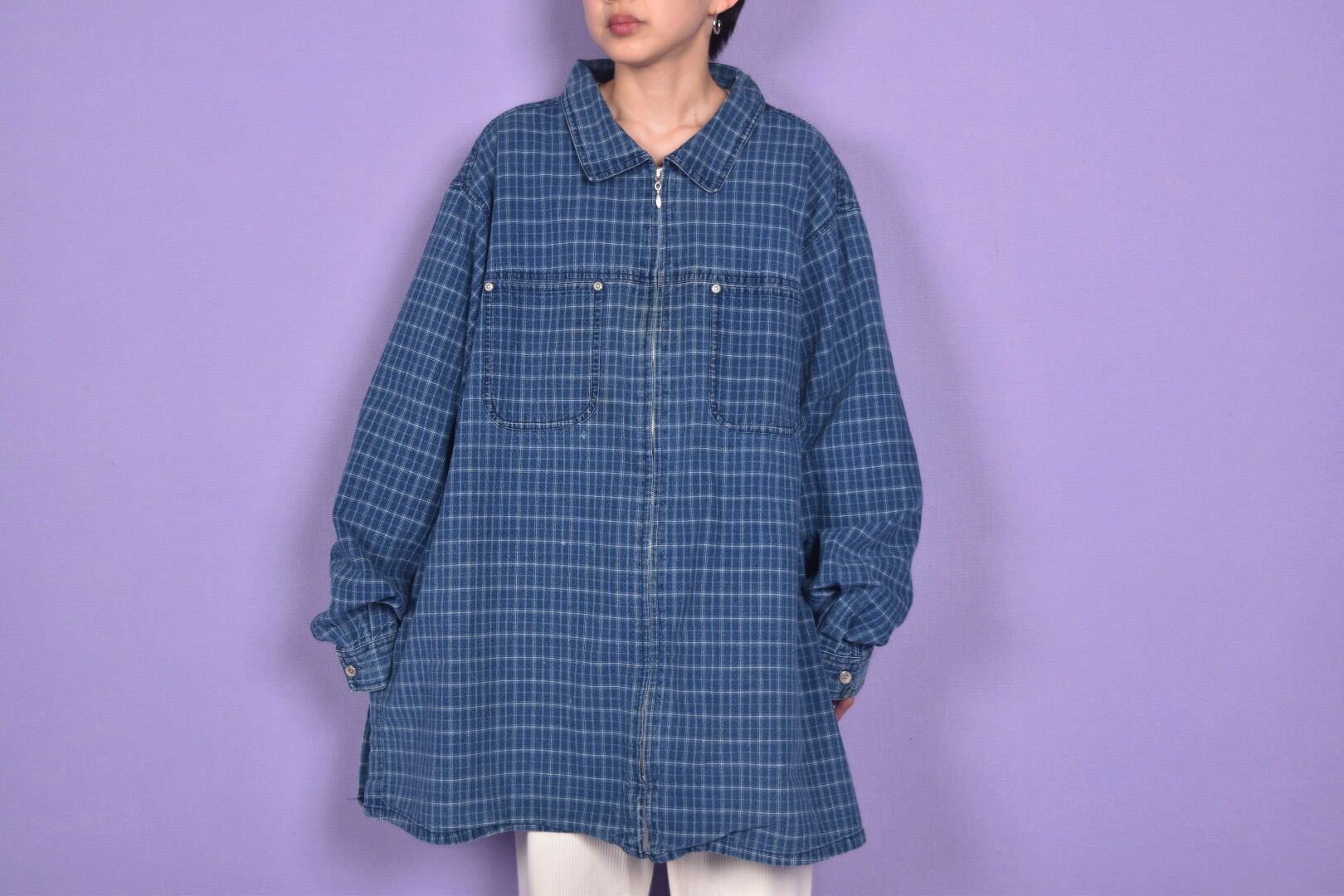 薄手のチェックデニム生地を使用したシャツブルゾンです。ゆったりとしたサイズ感に、zip仕様がクールです。女性がシャツワンピースのように着ても可愛いです。
