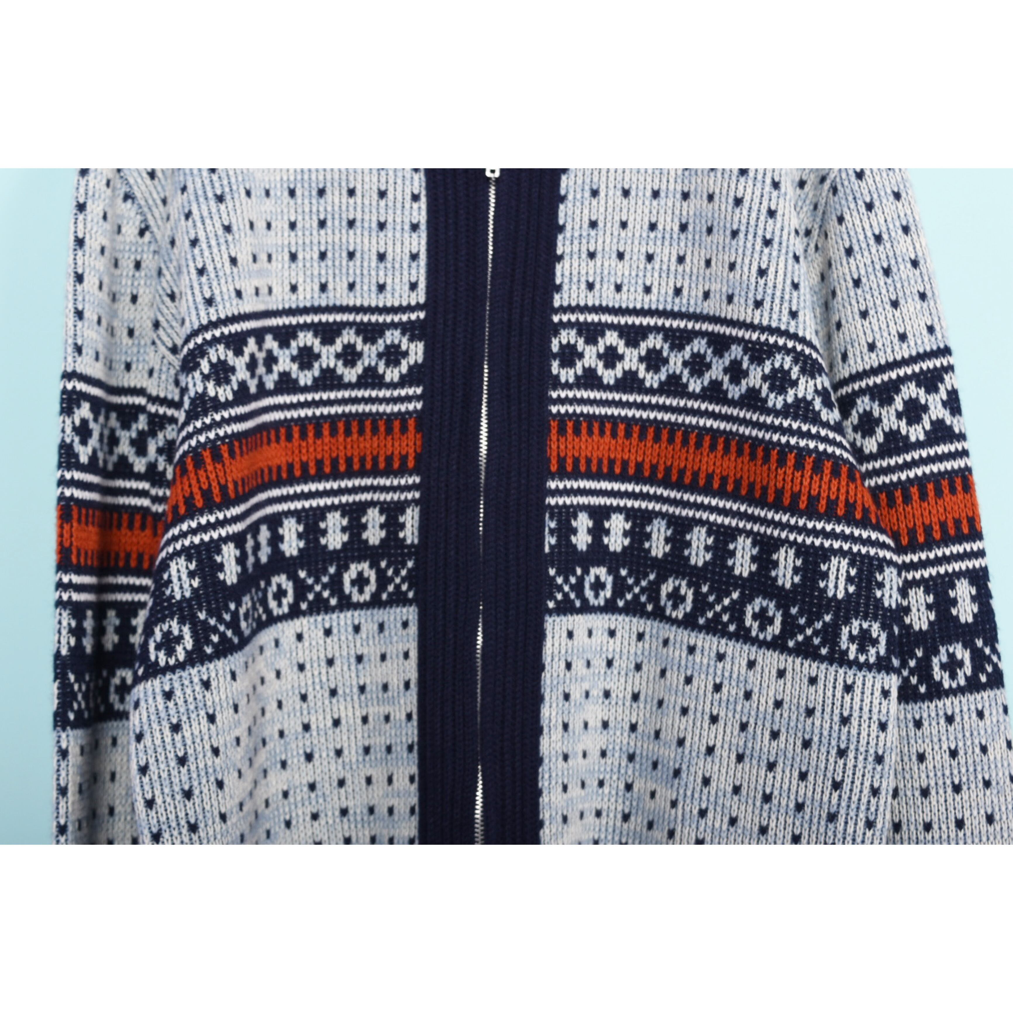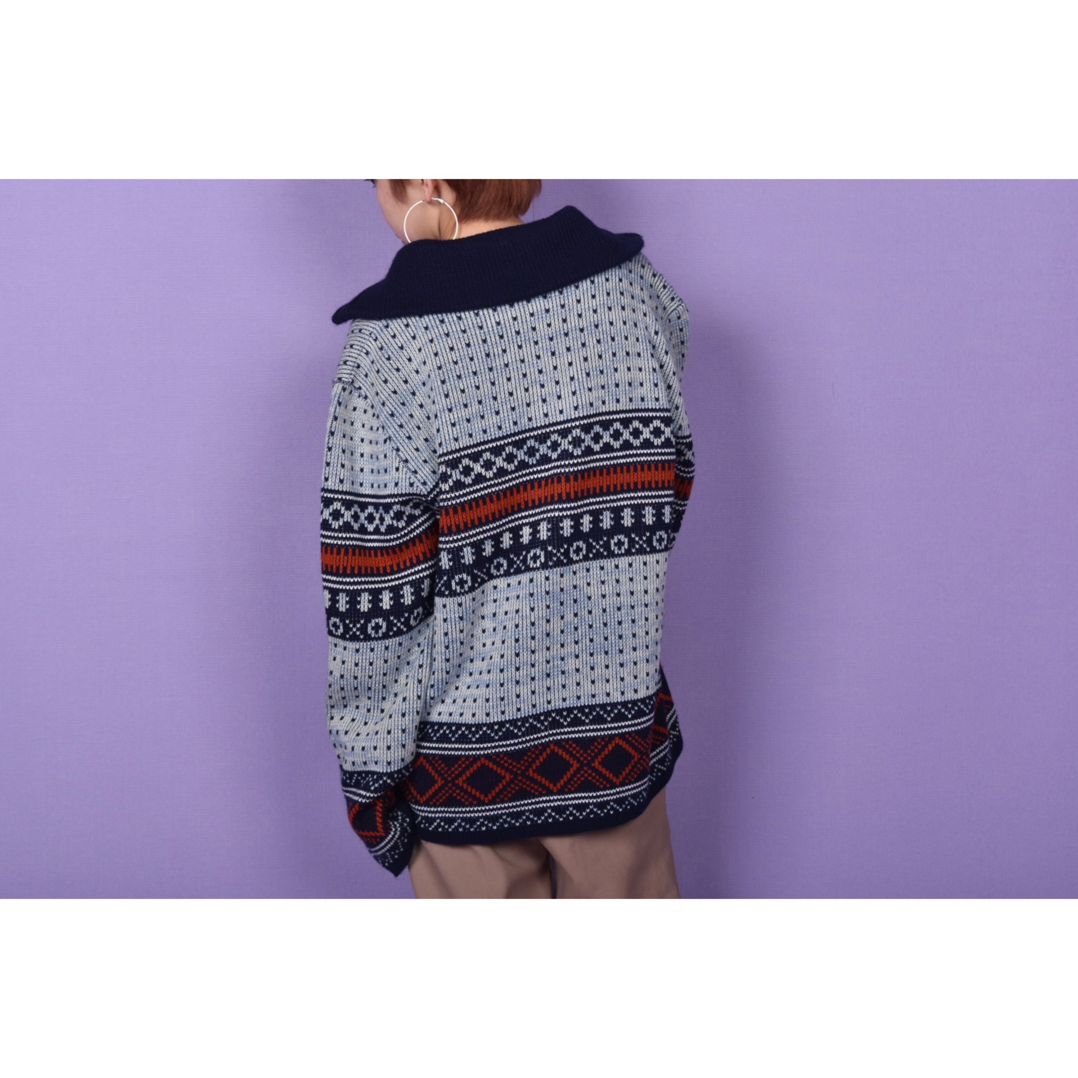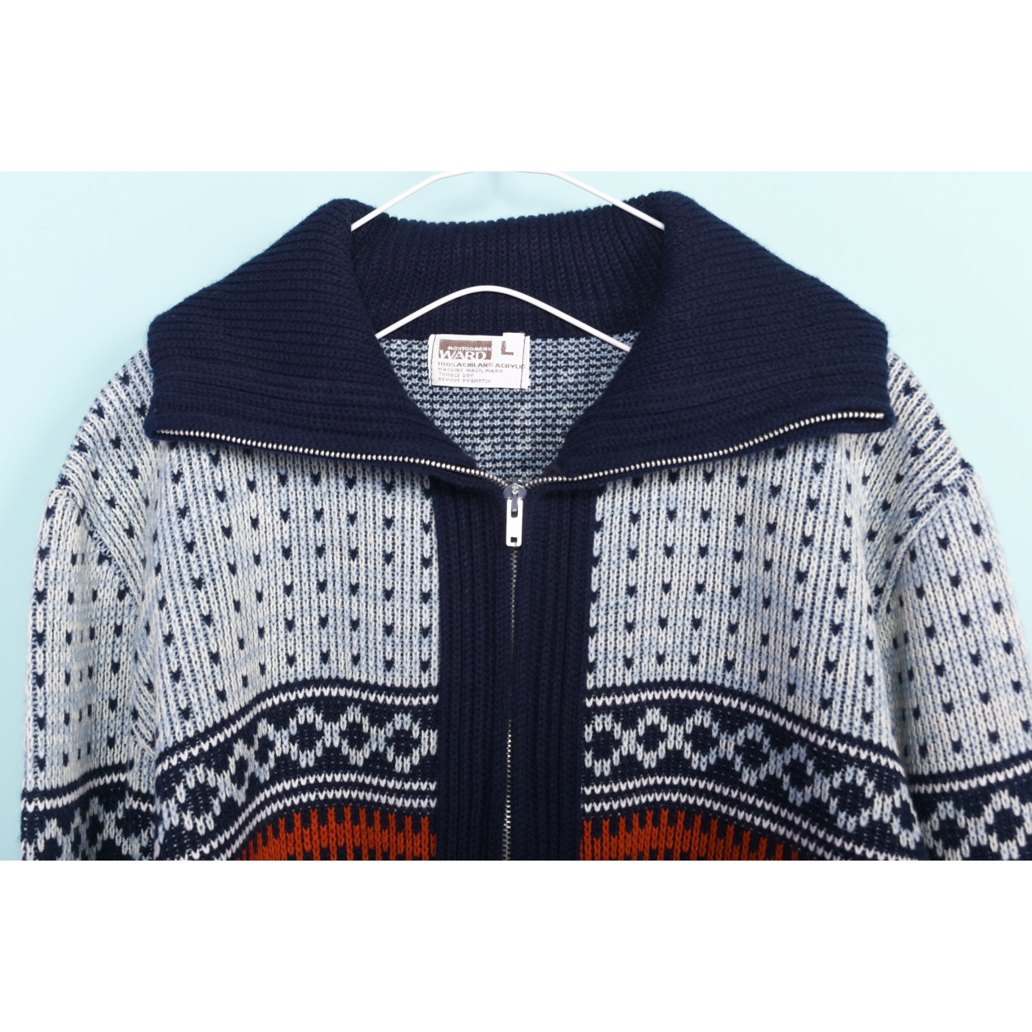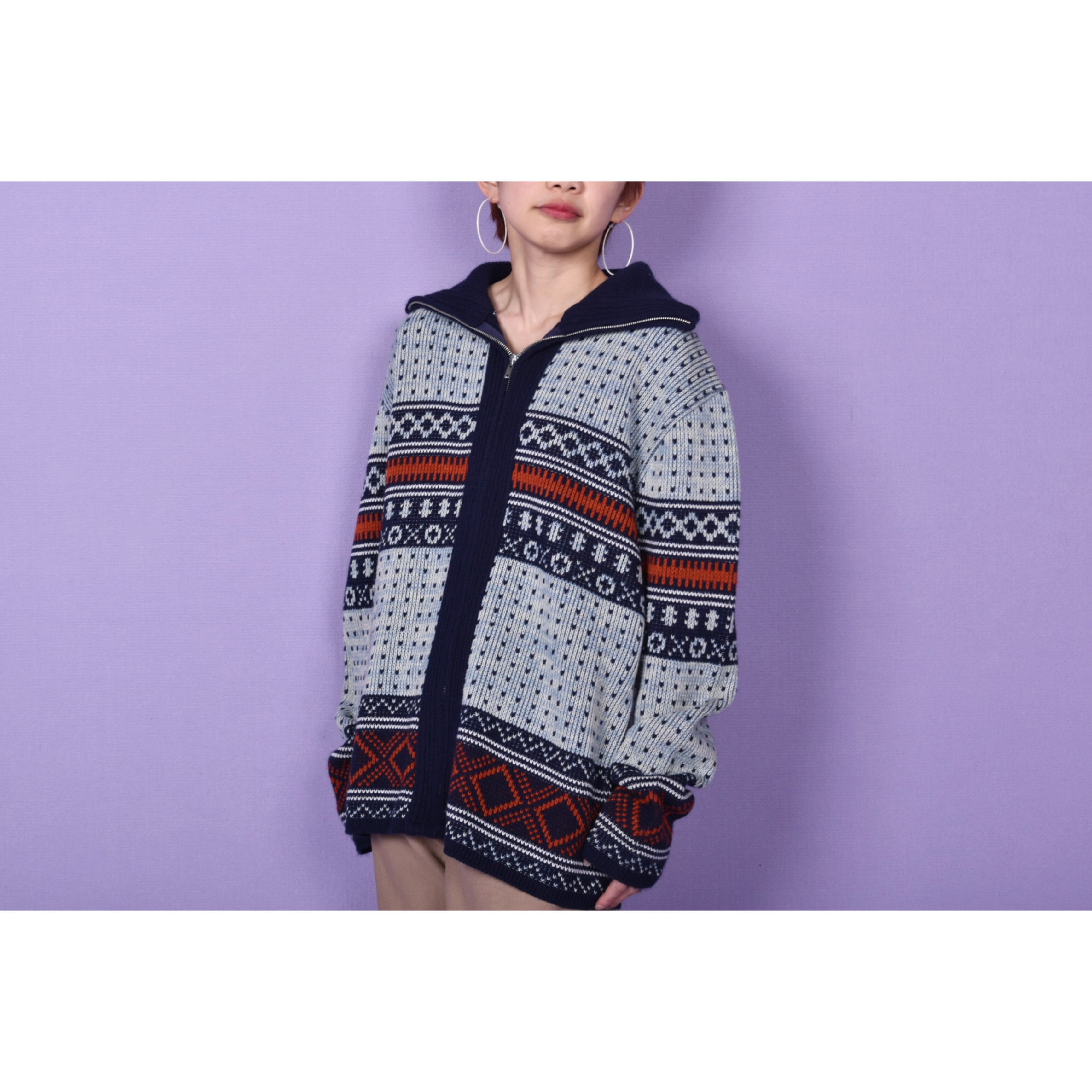 70年代に作られたモンゴメリーワードのアクリルニットカーディガンです。着用感がなく、おそらくデッドストックではないかと思います。ジップを全て締めてタートルネックとしても着用可能です。メンズアイテムですが女性がセーラーカラーの様にして着用するのも可愛いと思います!色味も美しく、春先の羽織におすすめです。