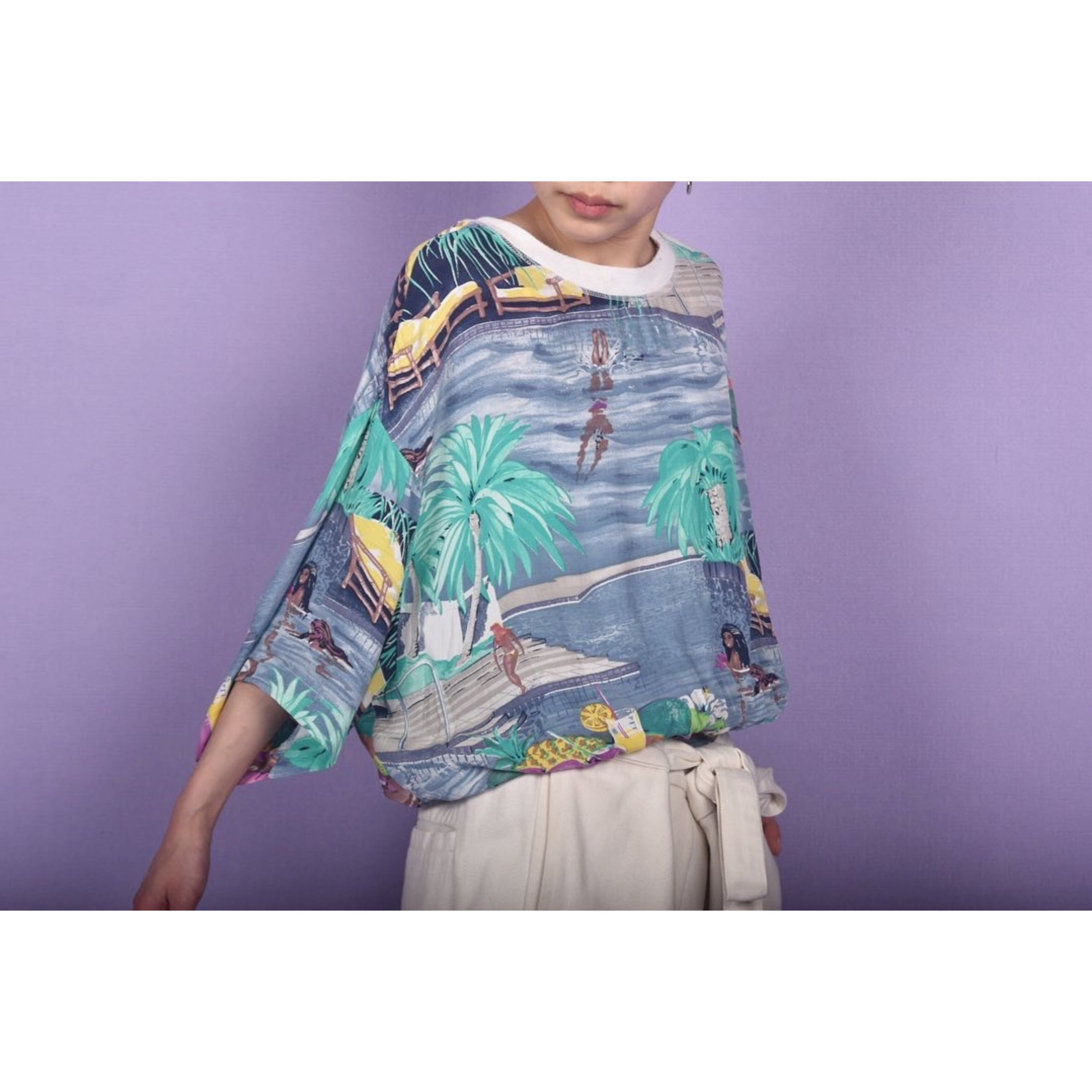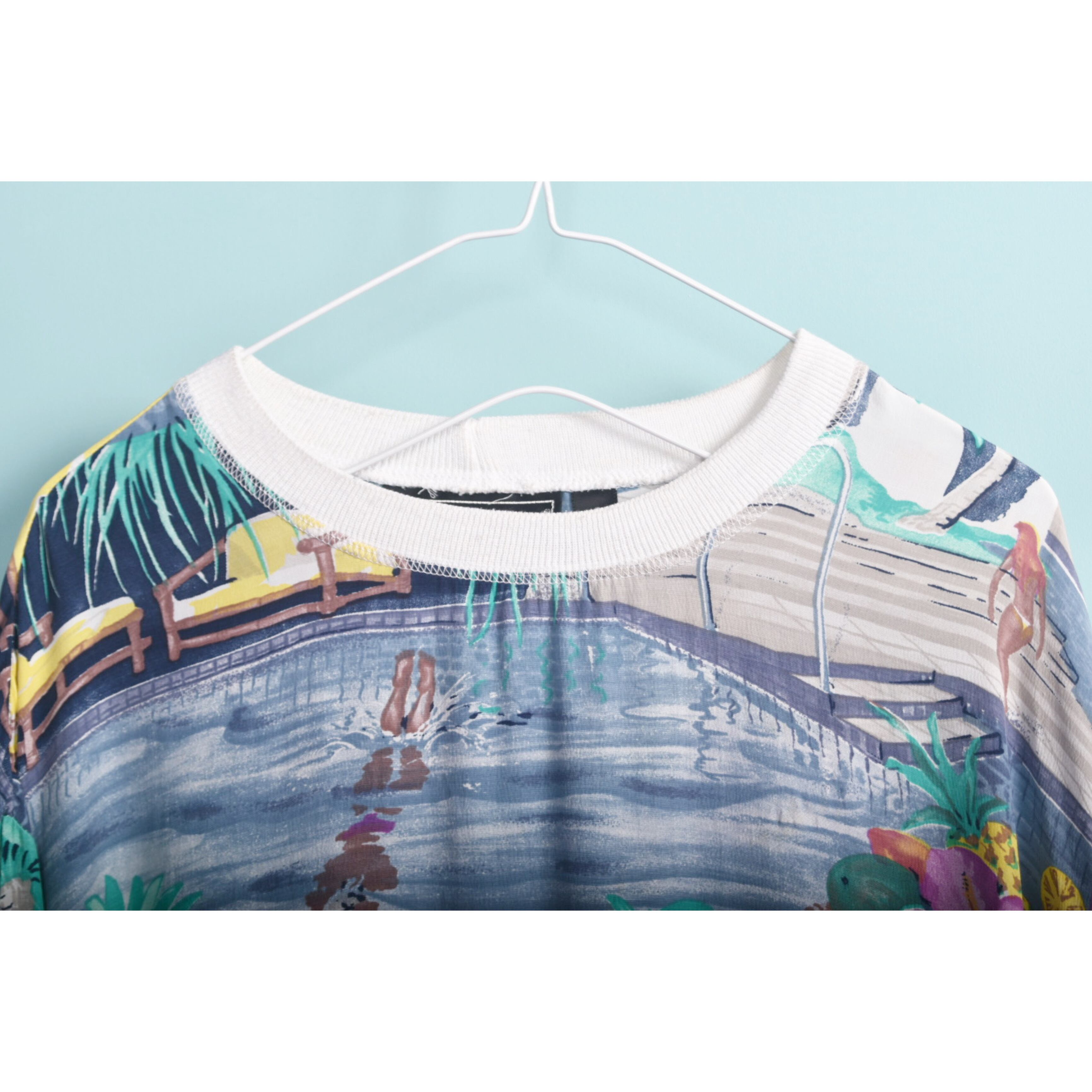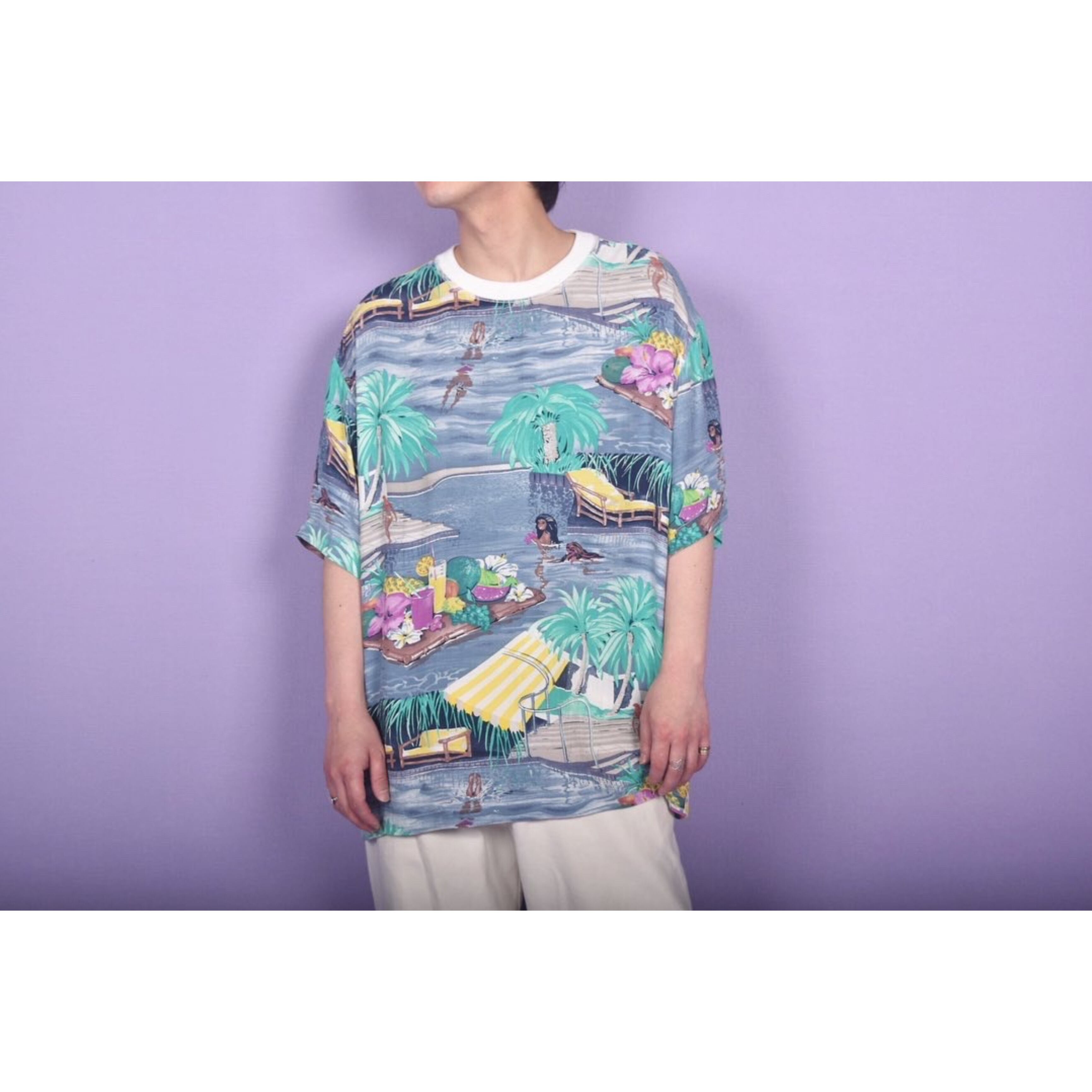 プールの絵画がプリントされた、レーヨン素材のteeです。ネックのリブがポイントです!オーバーサイズですので女性はインもおすすめ、男性はゆる〜く!これは夏の定番の形にしたいと思えるグッドデザインです。