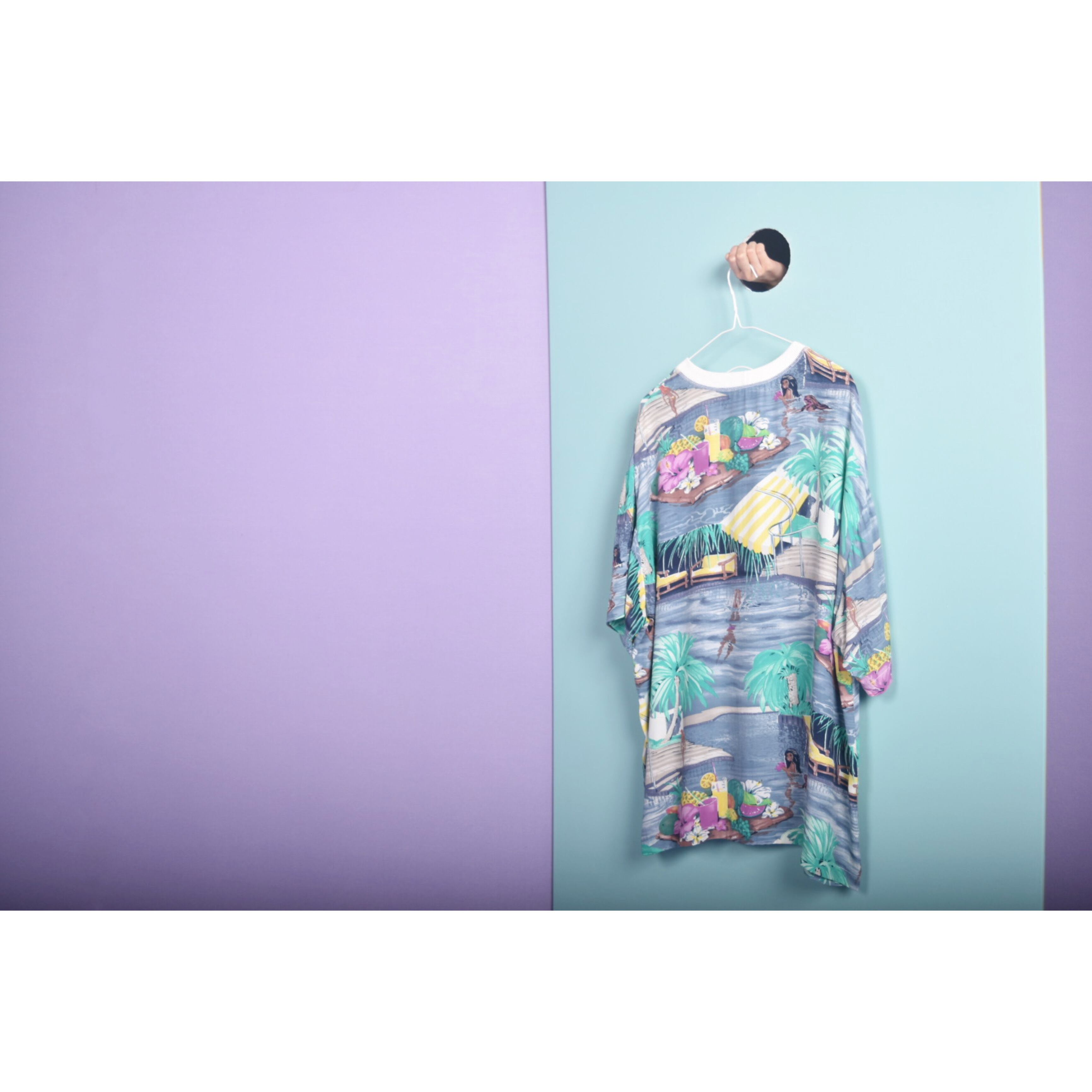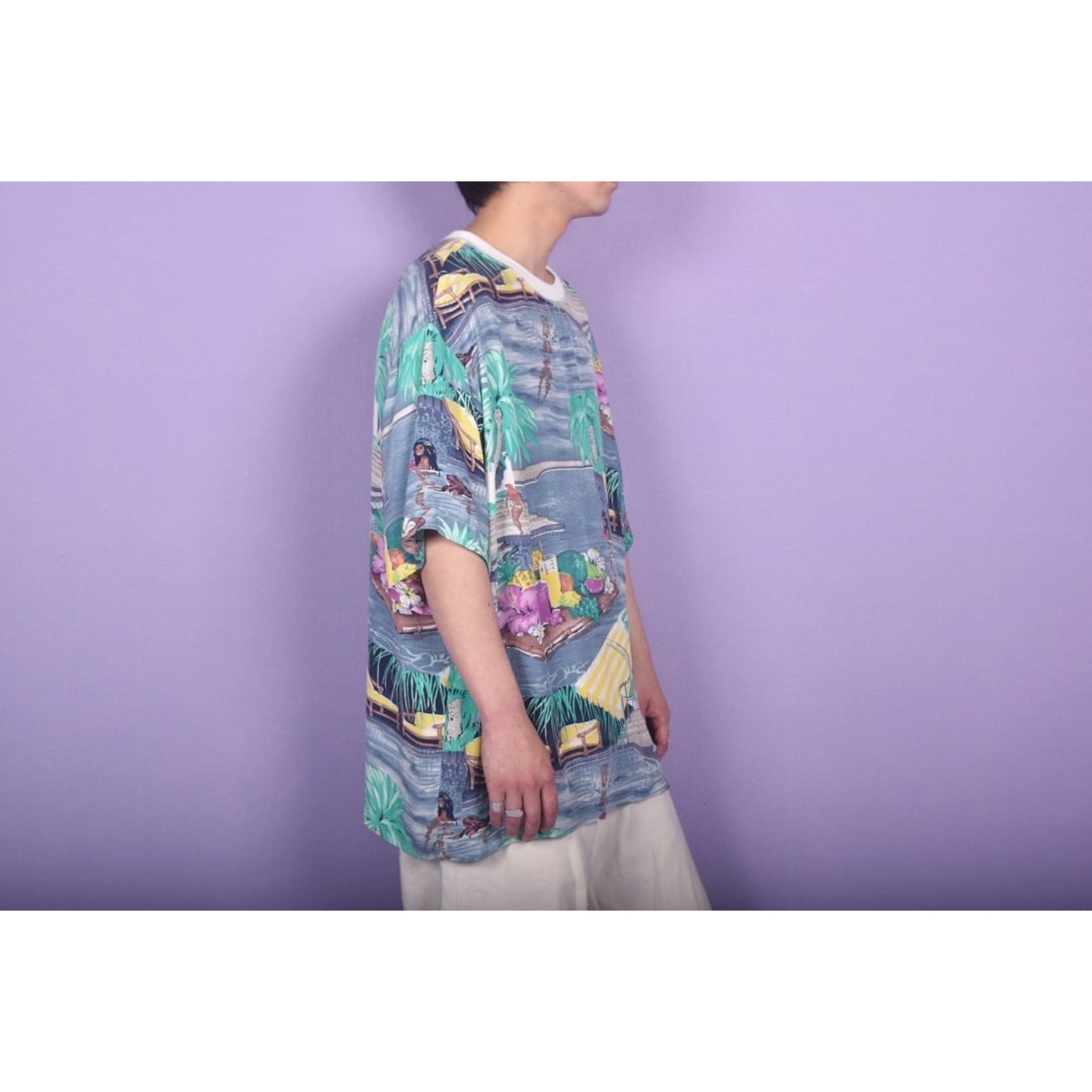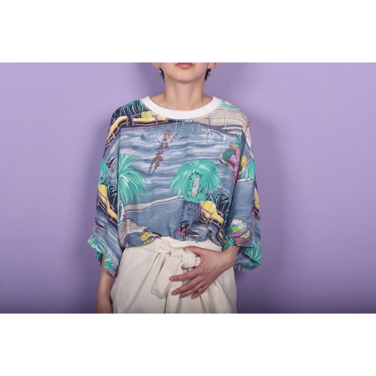 プールの絵画がプリントされた、レーヨン素材のteeです。ネックのリブがポイントです!オーバーサイズですので女性はインもおすすめ、男性はゆる〜く!これは夏の定番の形にしたいと思えるグッドデザインです。