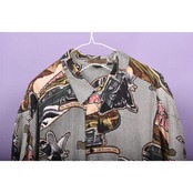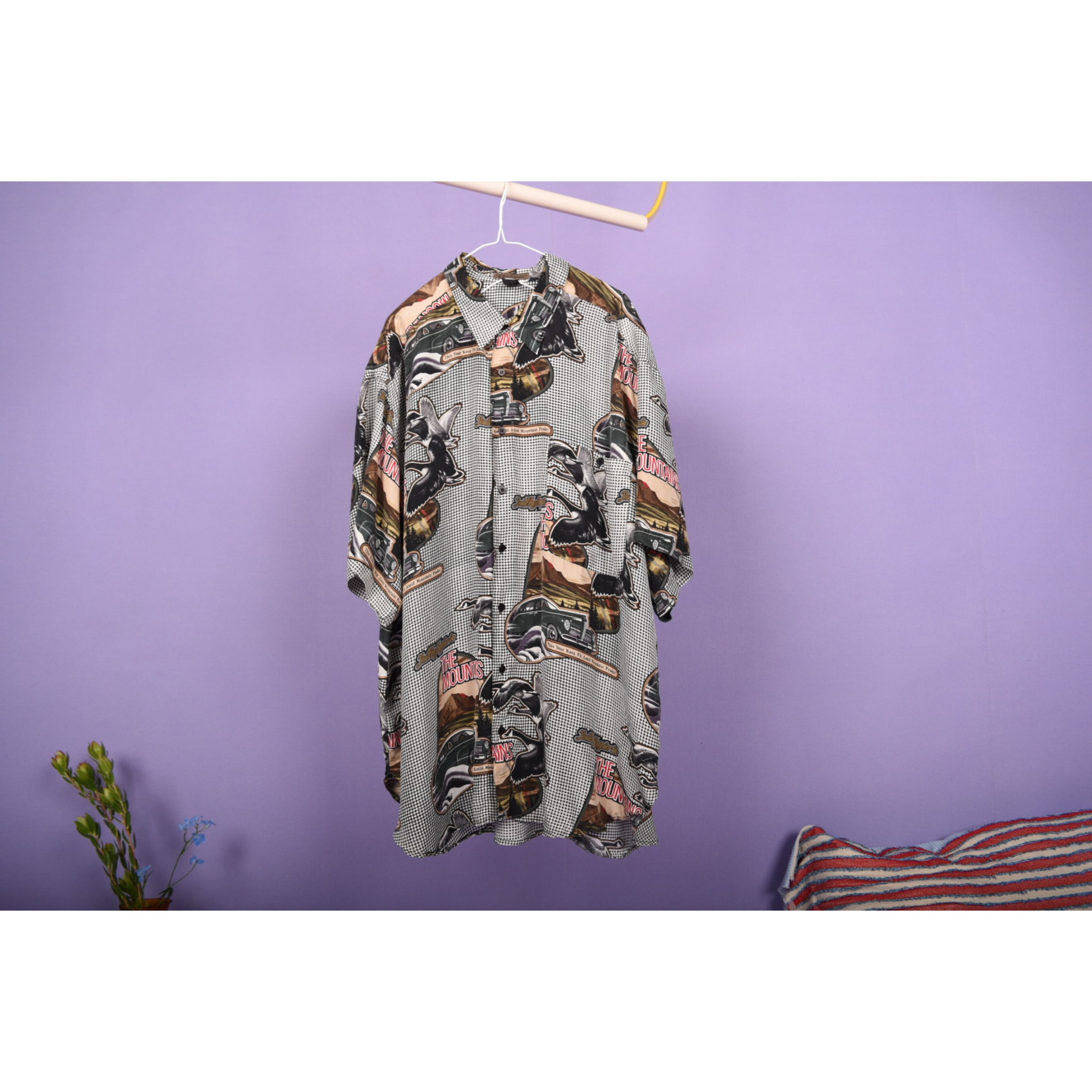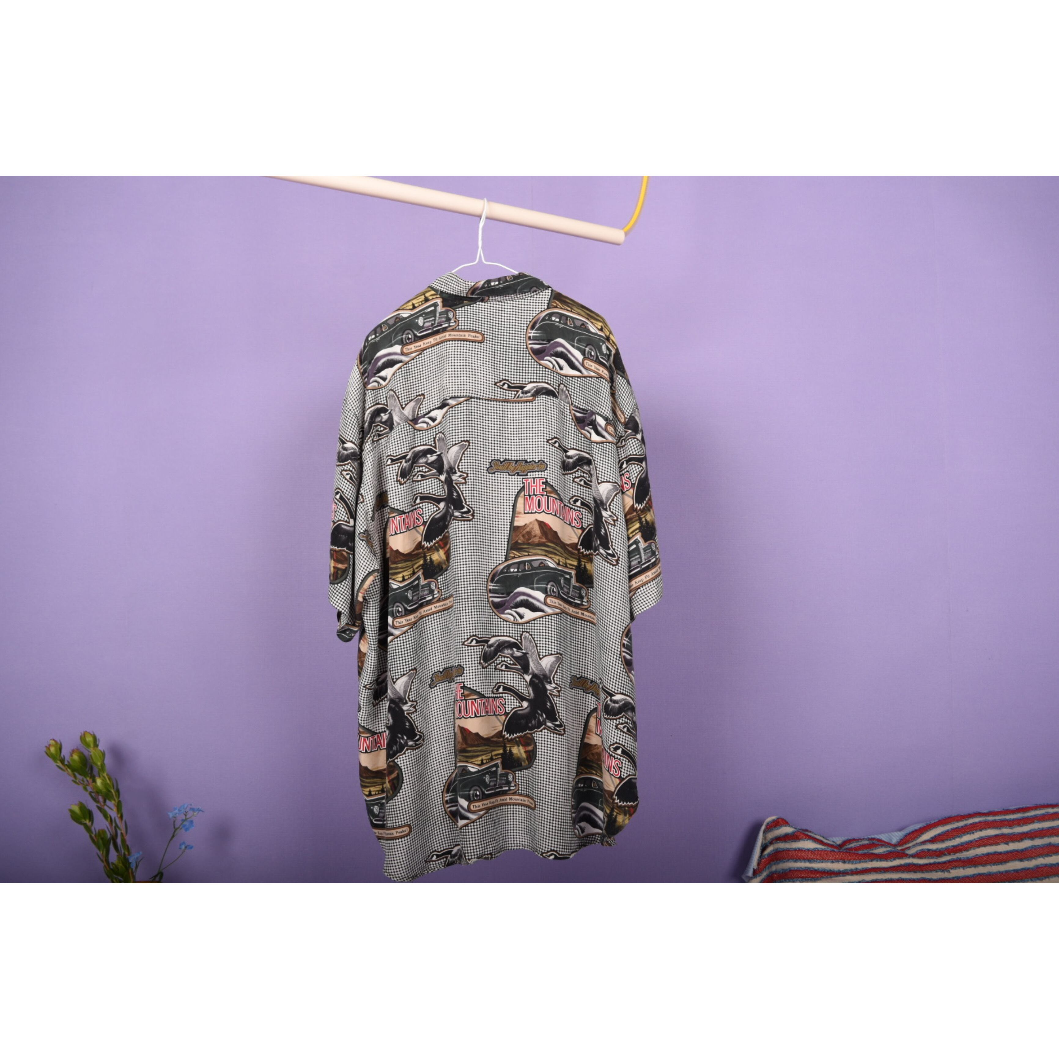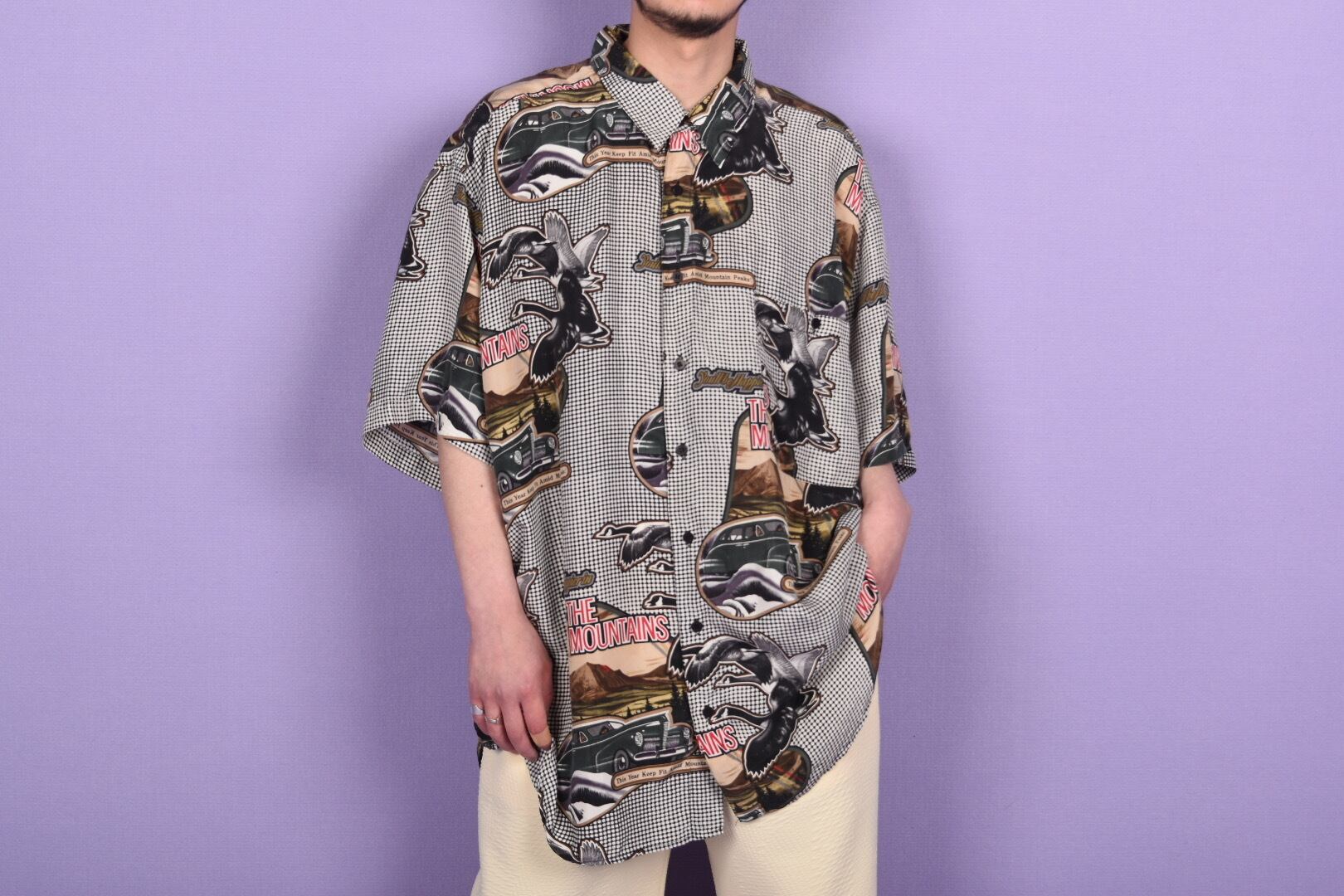 モノトーンチェックベースに、車と鳥のプリントが大きく入ったシルクシャツです。柄と生地素材のアンバランスが可愛いです。シルクシャツなので着心地抜群です。夏はショーツと合わせたいですね。
