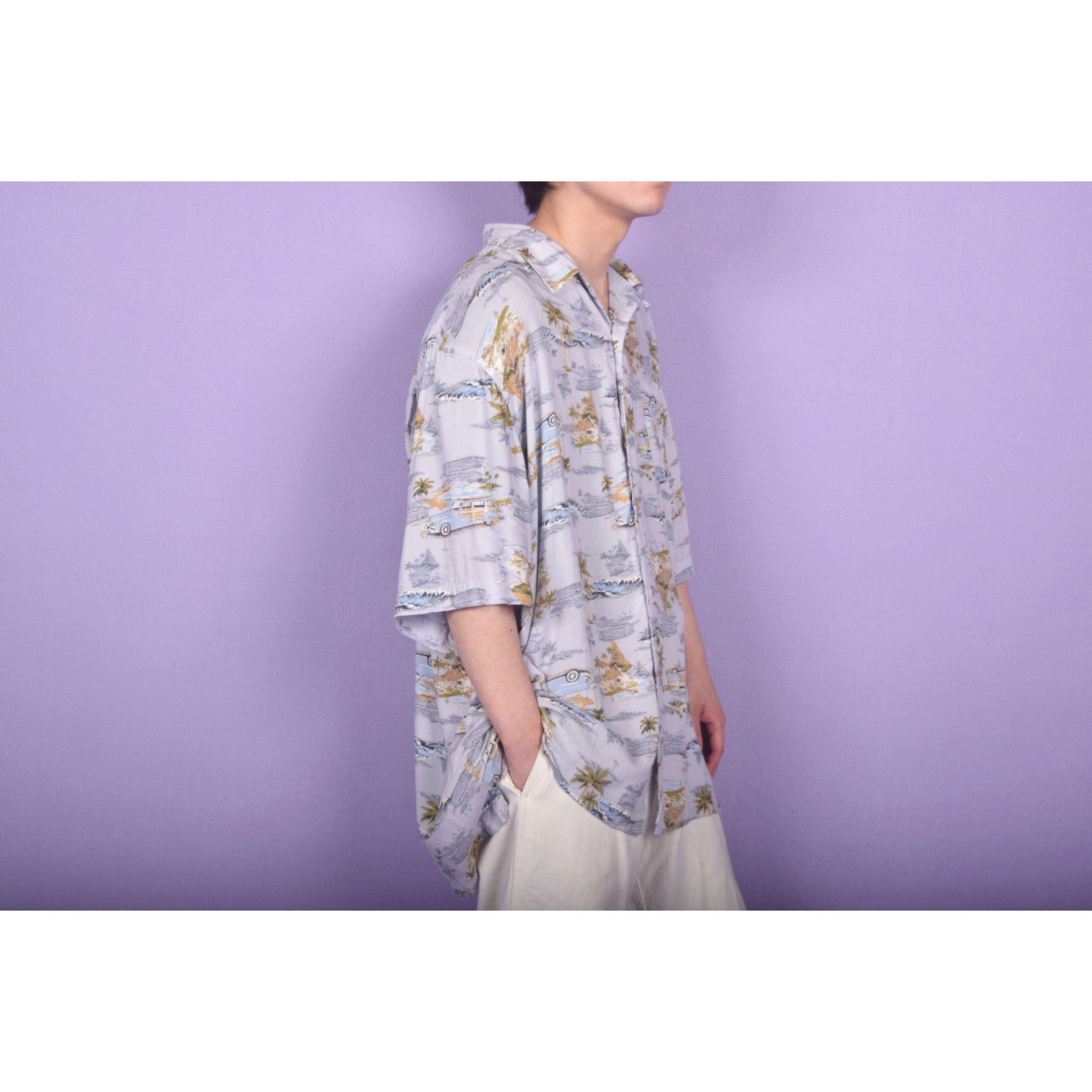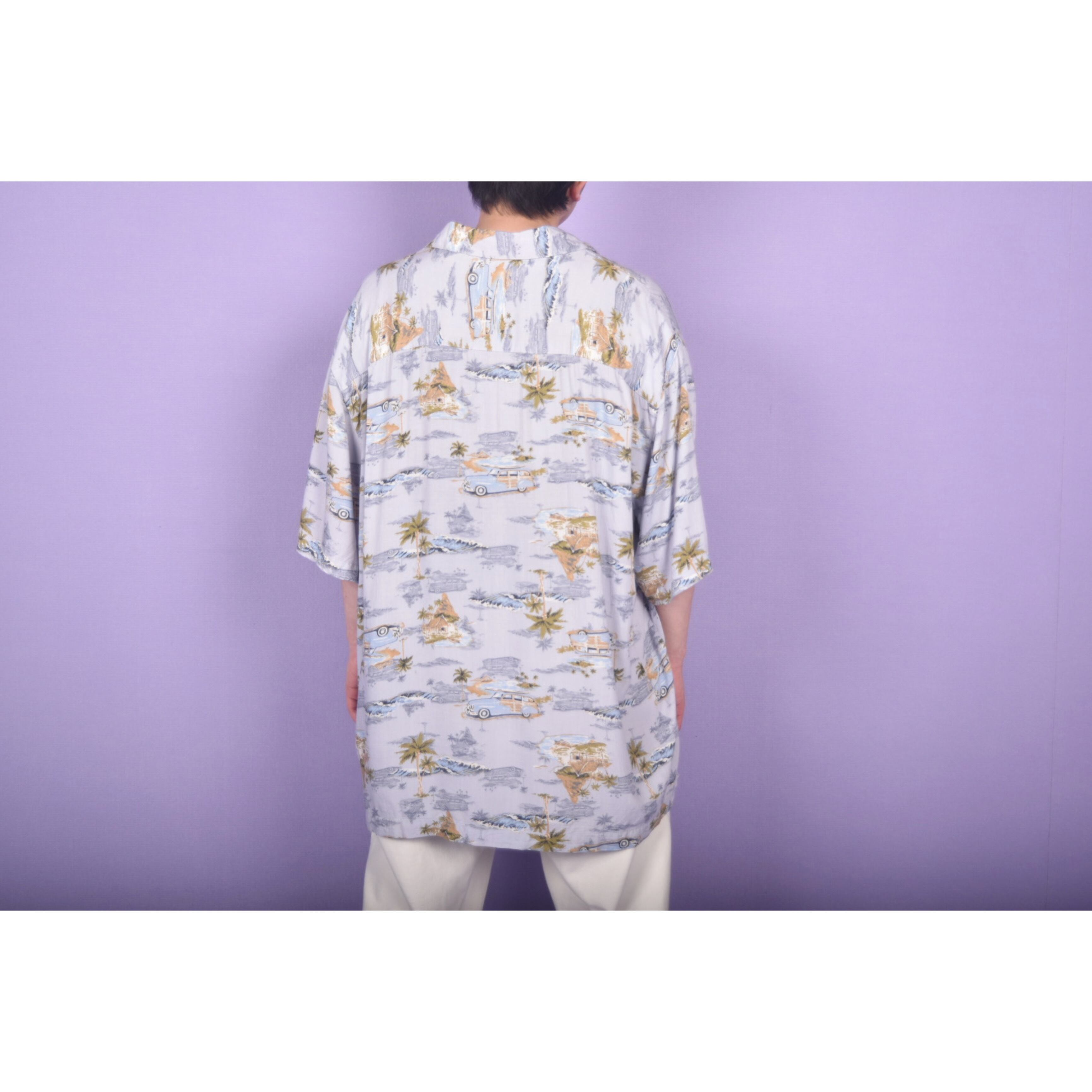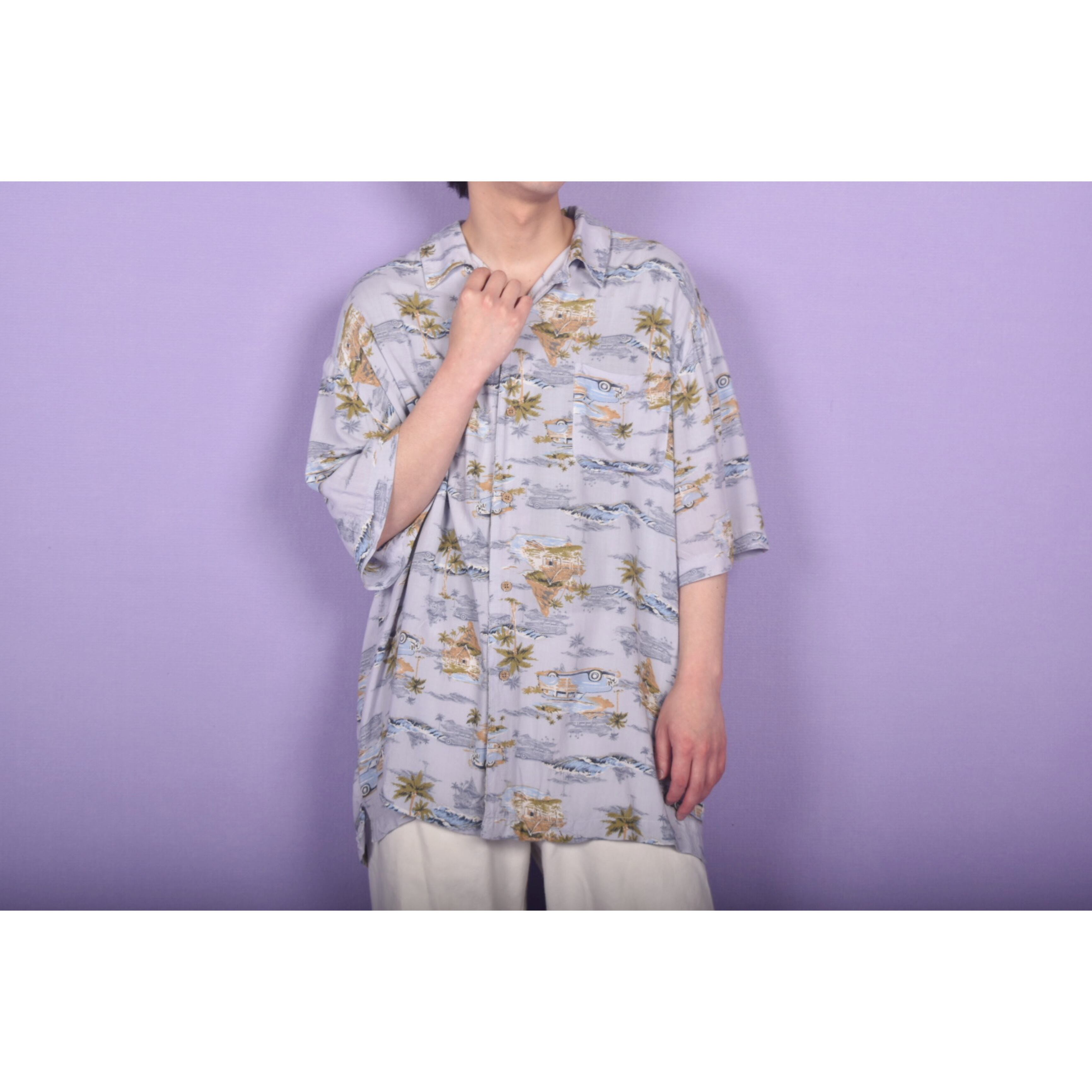 グレイッシュなパープルカラーにヤシの木&車のプリントが可愛いショートスリーブシャツです。レーヨン100%ですので、非常に滑らかな質感で着心地も良いです。また、着るとひんやり感じられ、吸水性も高くアンモニア臭などを中和する性質があるので汗をかく夏にはぴったりなシャツです!ユニセックスです。