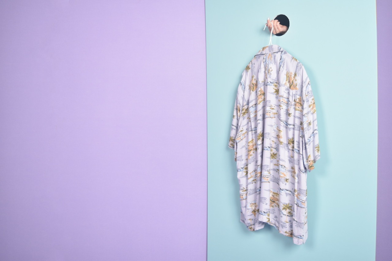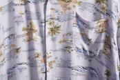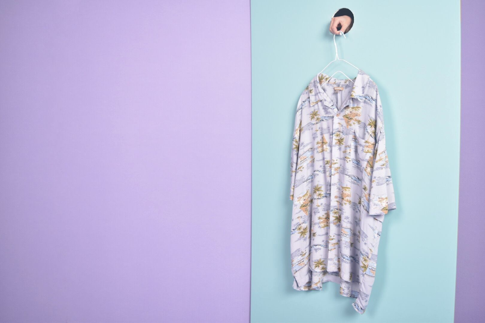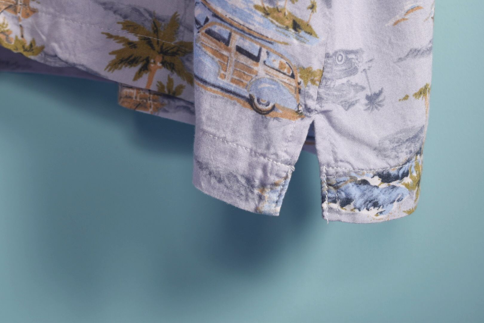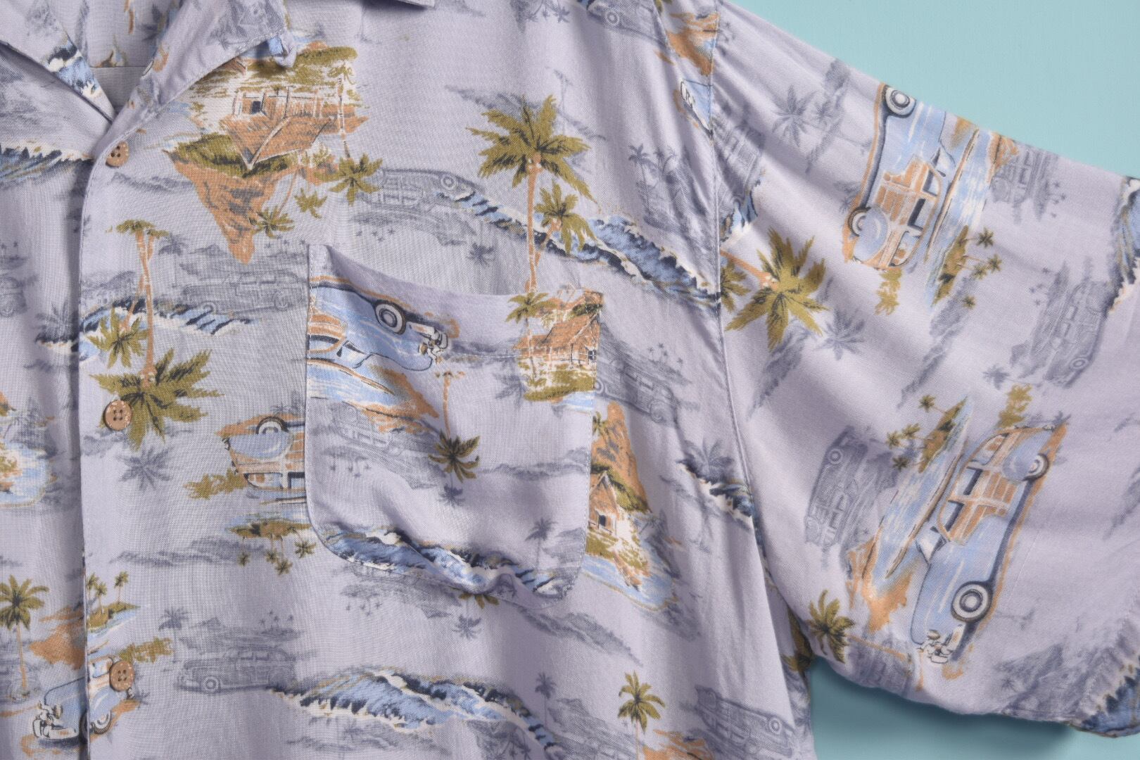 グレイッシュなパープルカラーにヤシの木&車のプリントが可愛いショートスリーブシャツです。レーヨン100%ですので、非常に滑らかな質感で着心地も良いです。また、着るとひんやり感じられ、吸水性も高くアンモニア臭などを中和する性質があるので汗をかく夏にはぴったりなシャツです!ユニセックスです。
