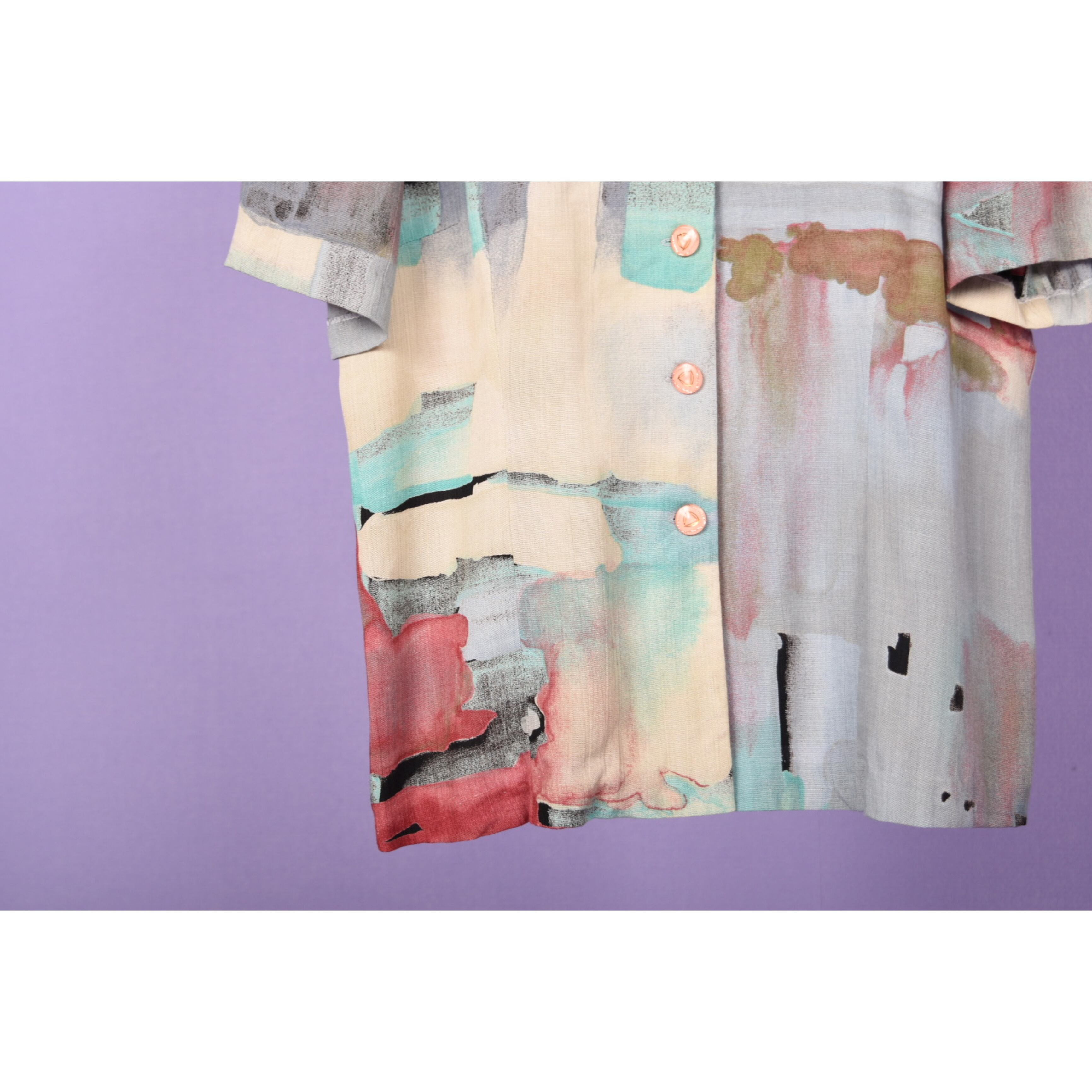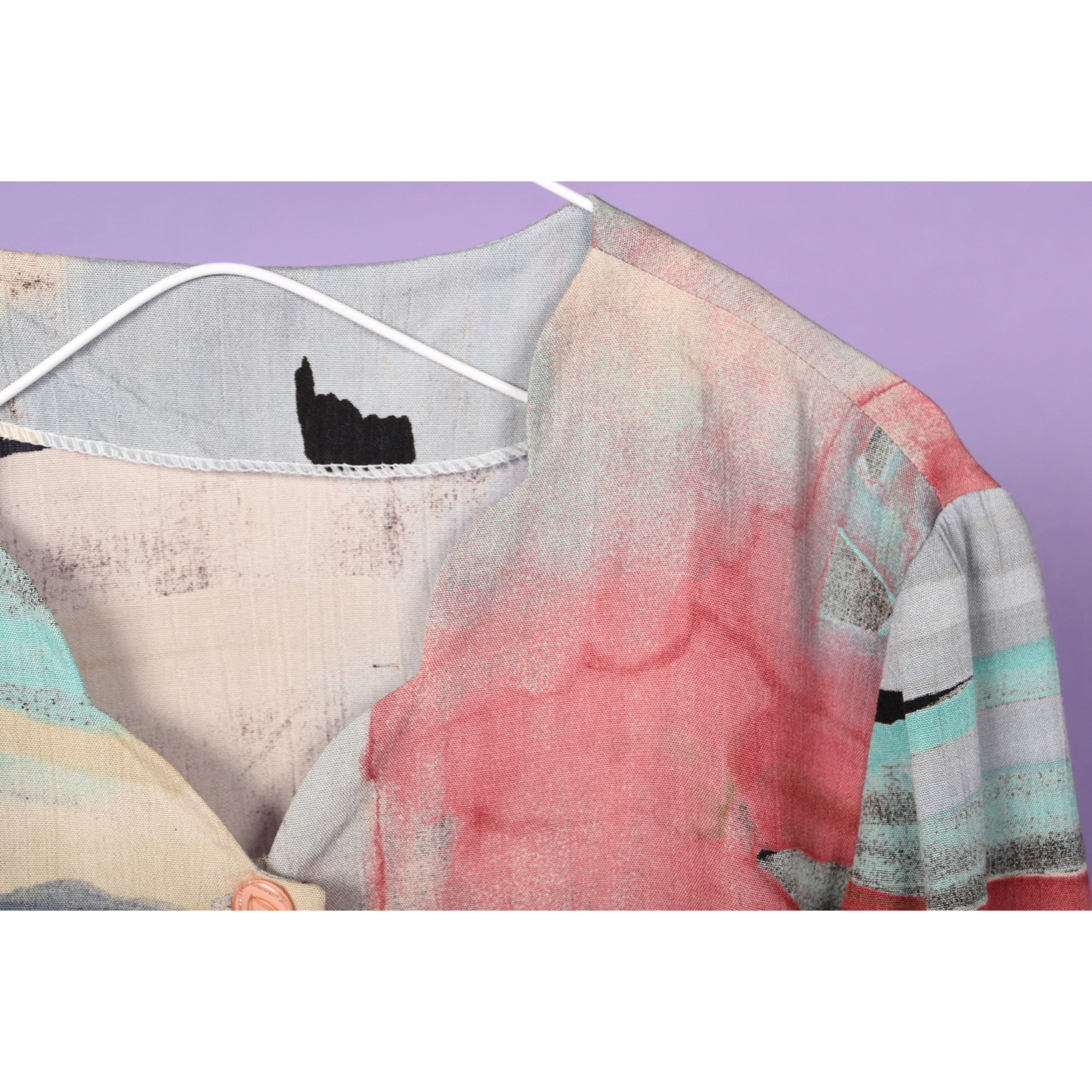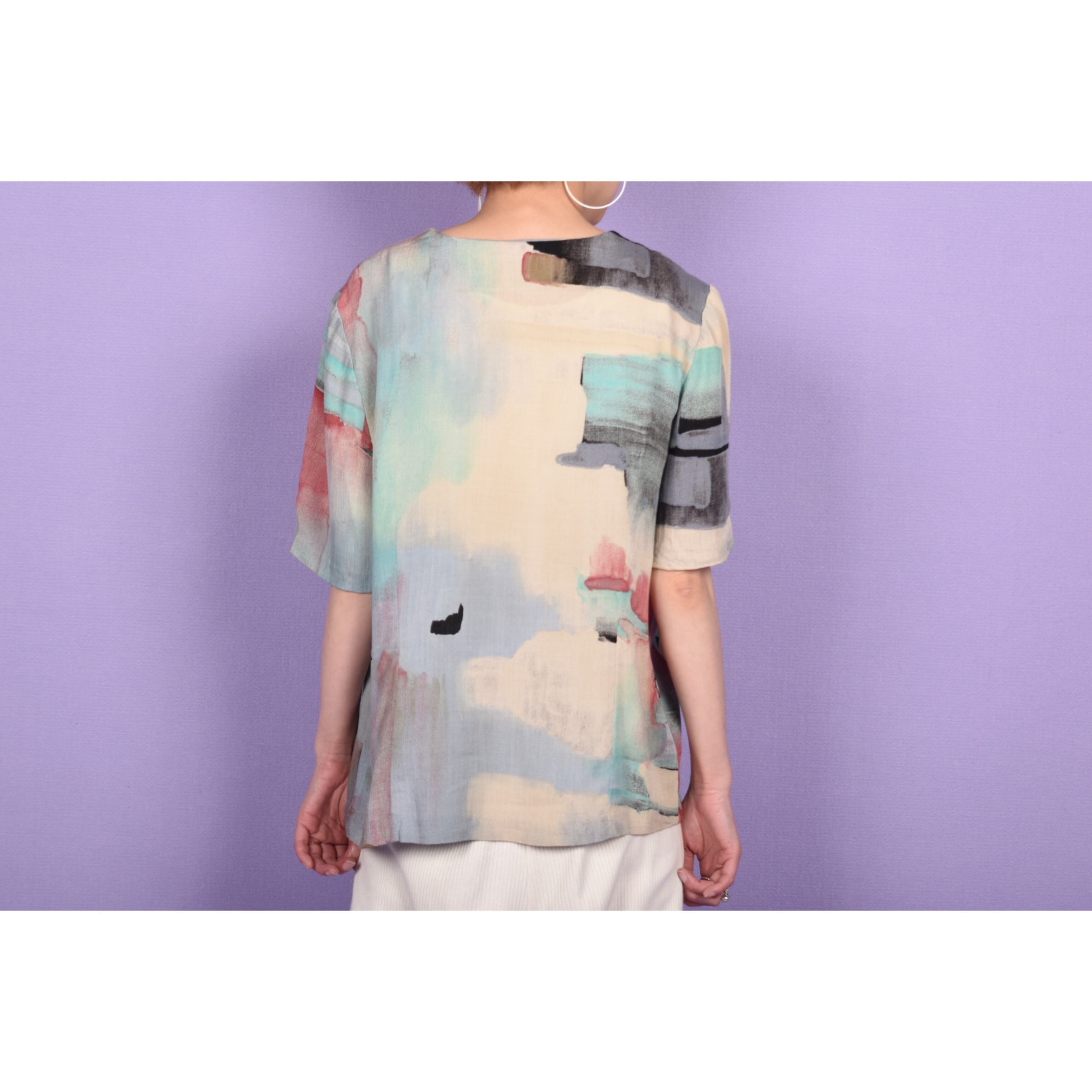 ネックのカッティングデザインが面白いノーカラーブラウスです。鮮やかな配色の水彩画のようなプリント柄が美しいです。レーヨン素材なので、さらりと快適で、夏にぴったりな着心地です。