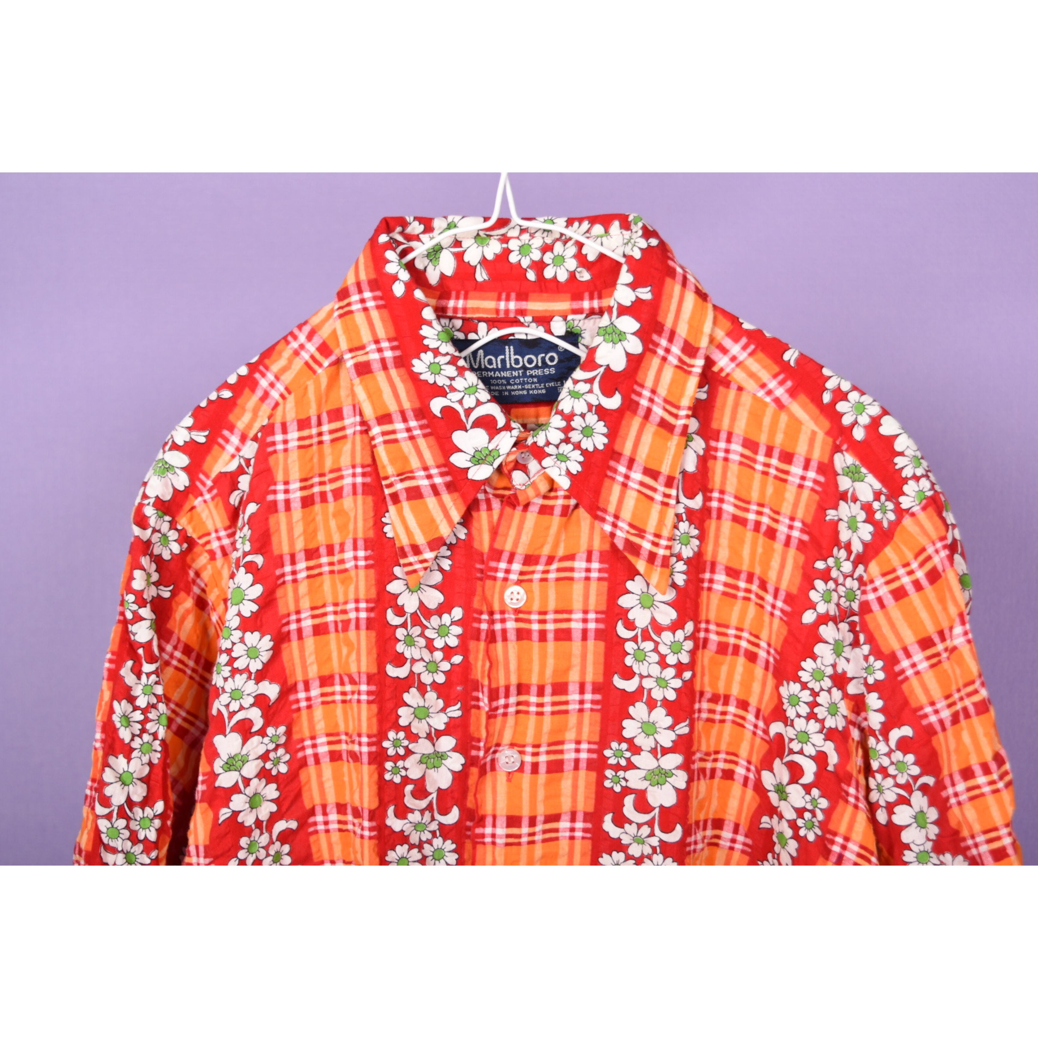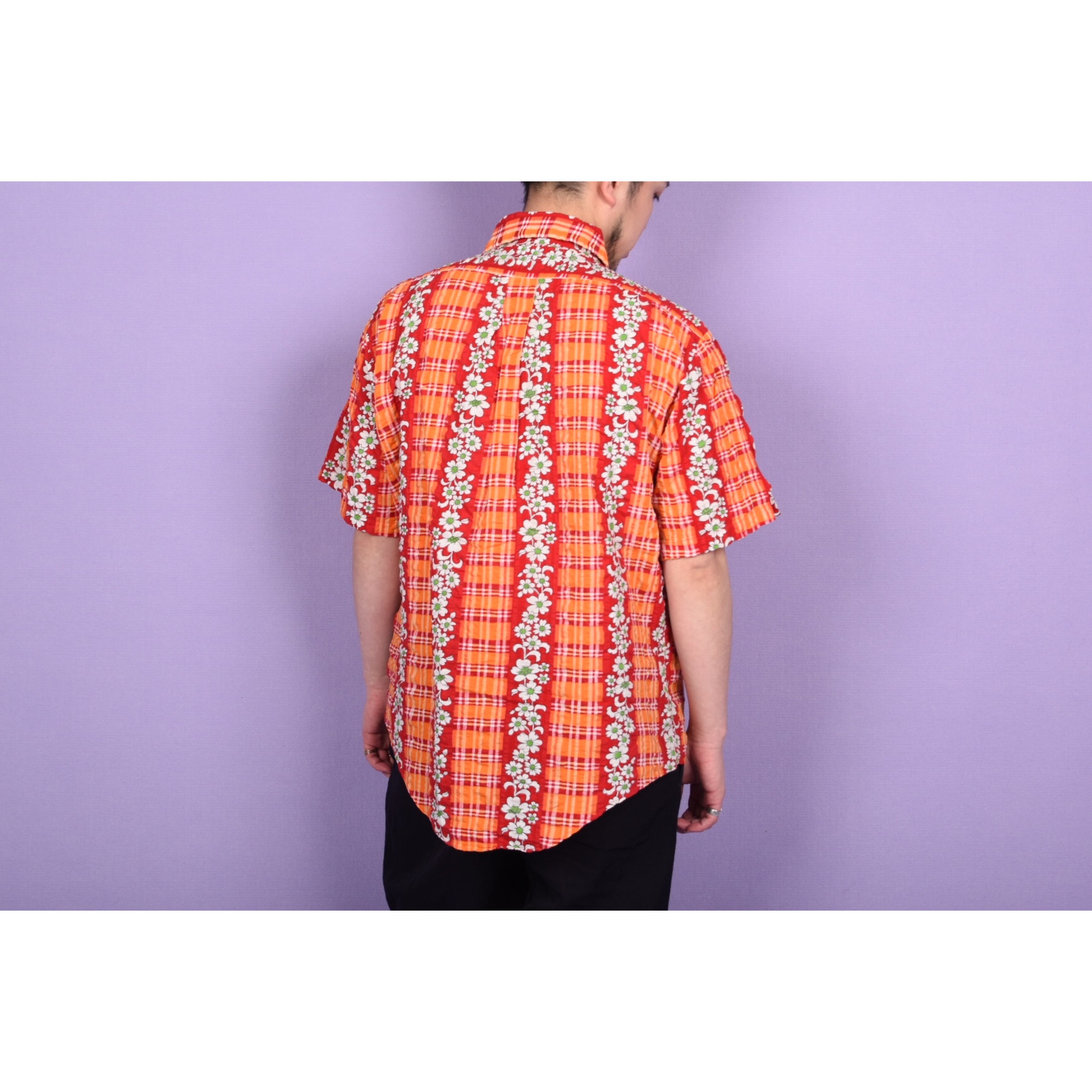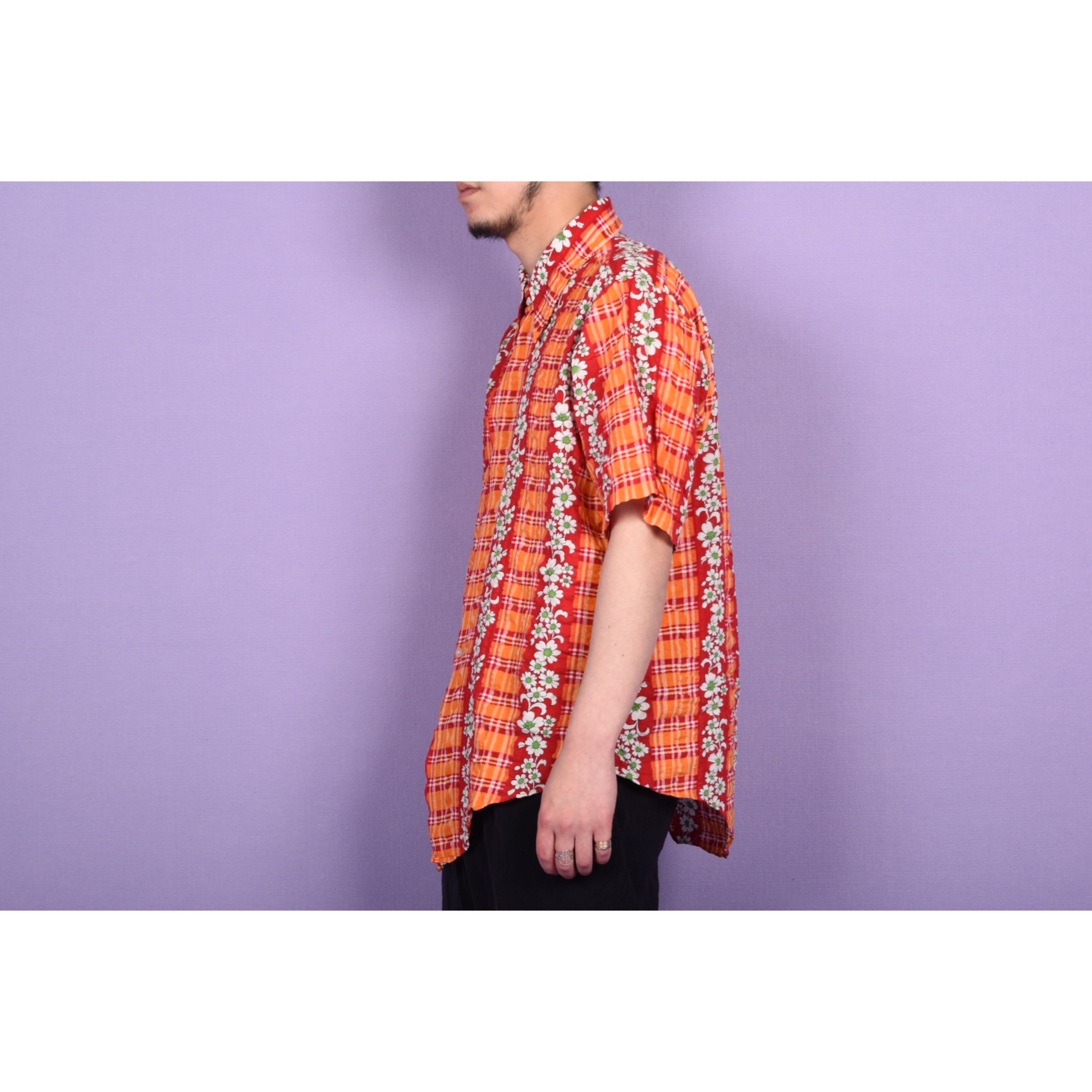 大胆なプリントデザインとシワ加工がされた存在感抜群な70年代の半袖シャツです。サラッとした素材、軽快で夏に快適な着心地です。絶妙な配色もセンスを感じます。お洒落です。