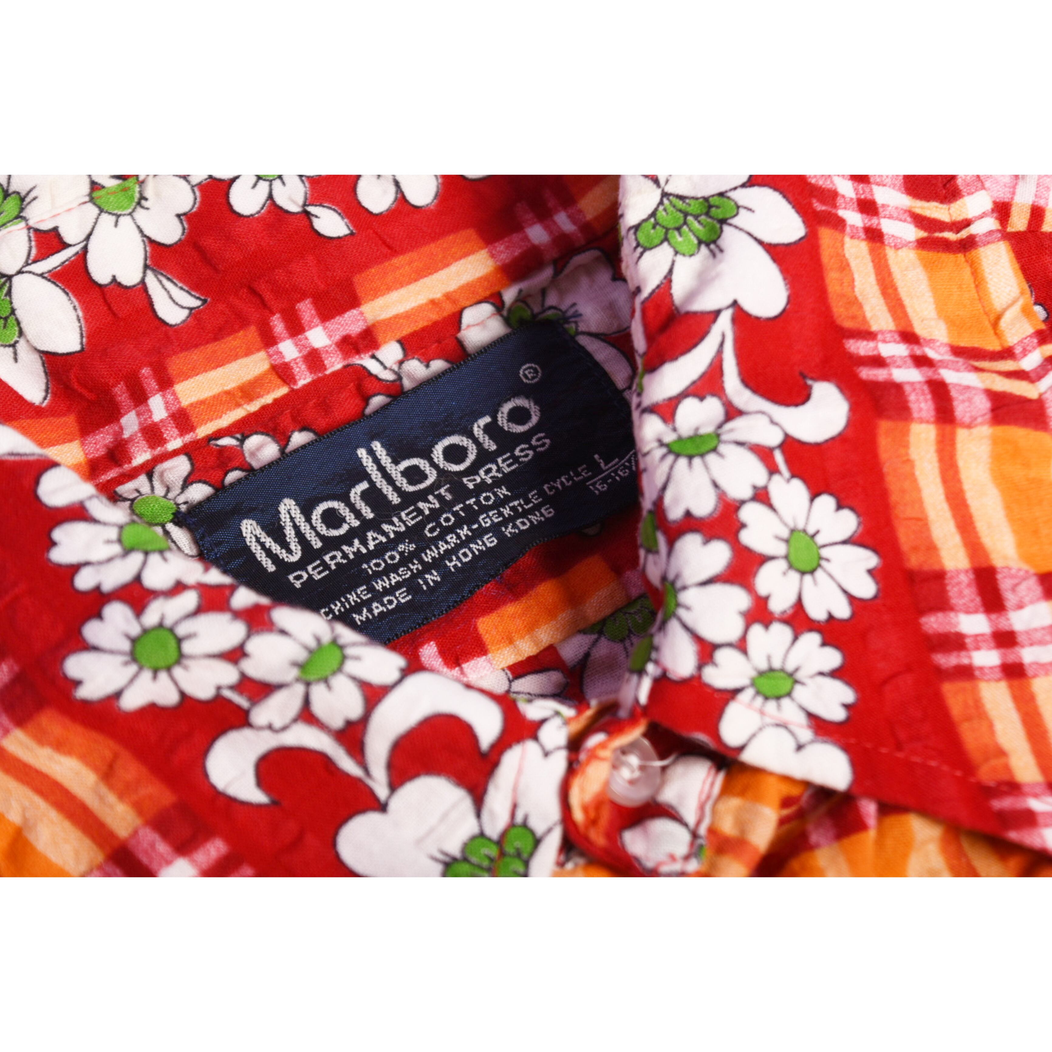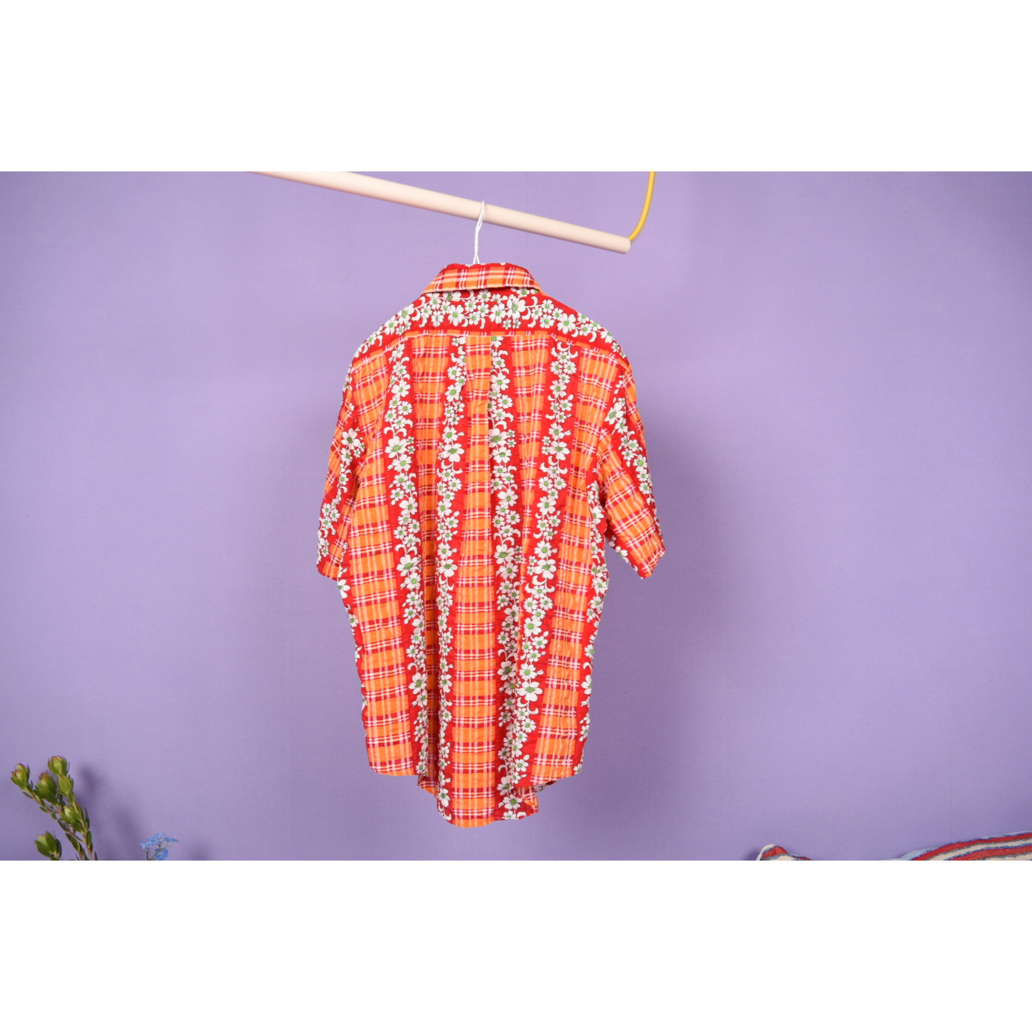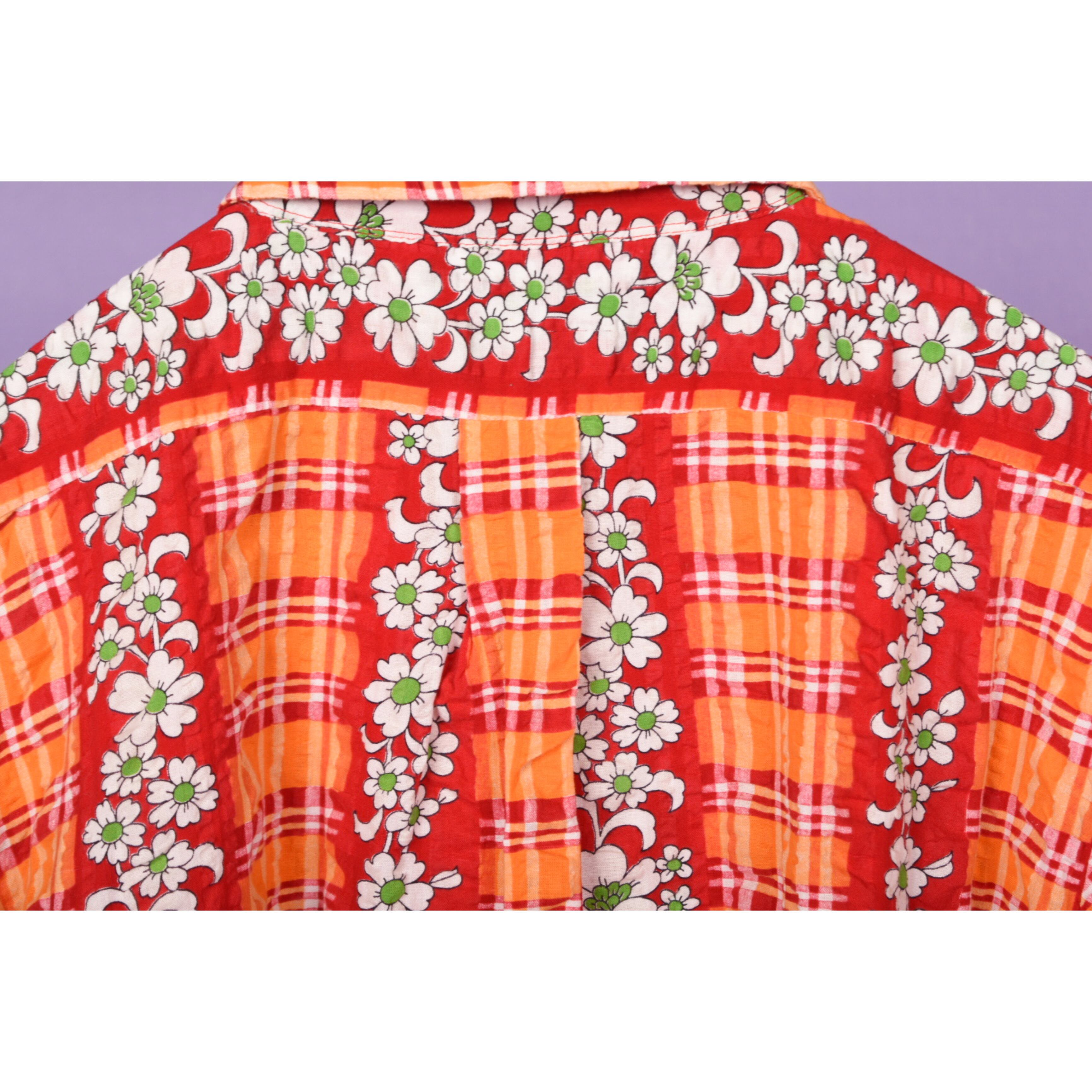大胆なプリントデザインとシワ加工がされた存在感抜群な70年代の半袖シャツです。サラッとした素材、軽快で夏に快適な着心地です。絶妙な配色もセンスを感じます。お洒落です。