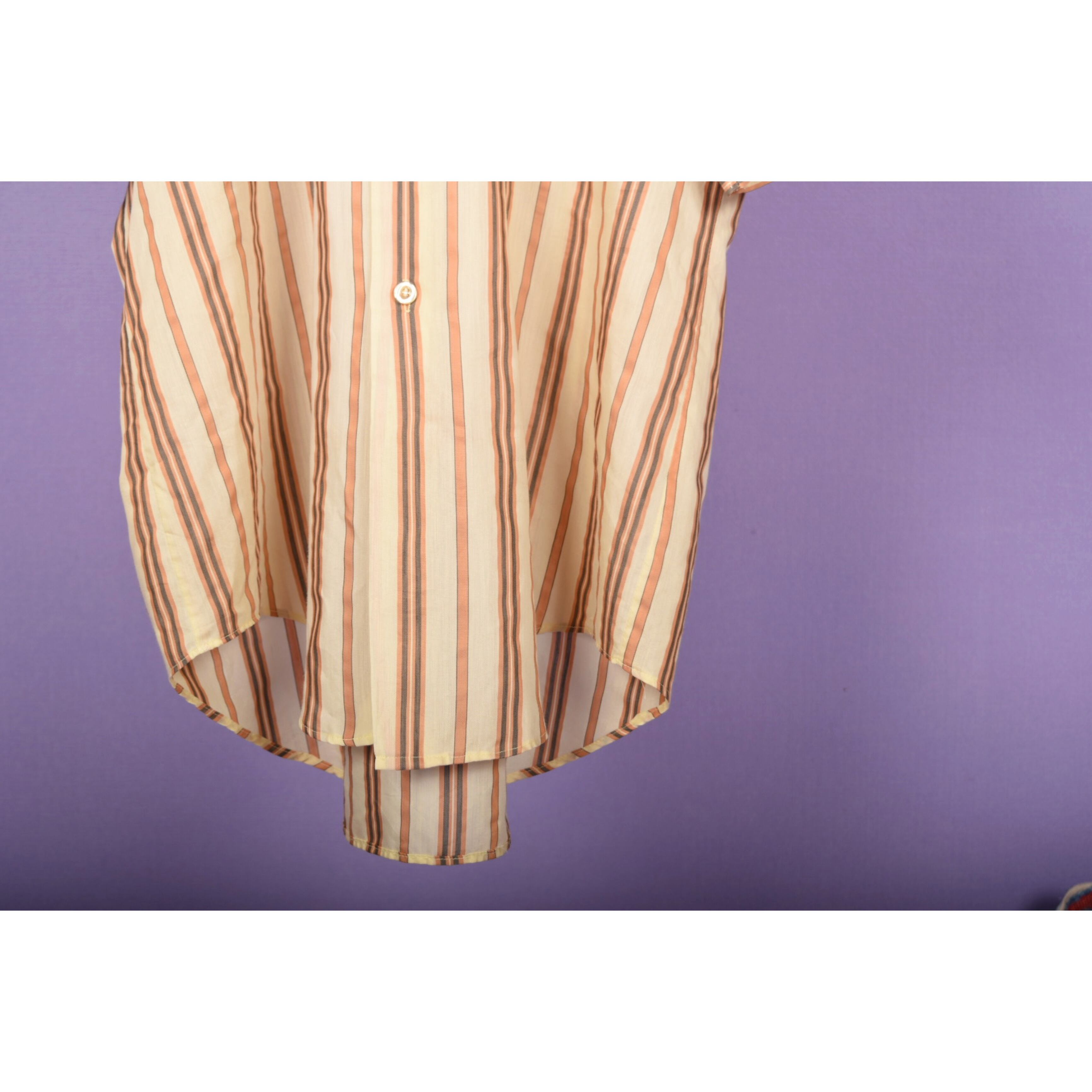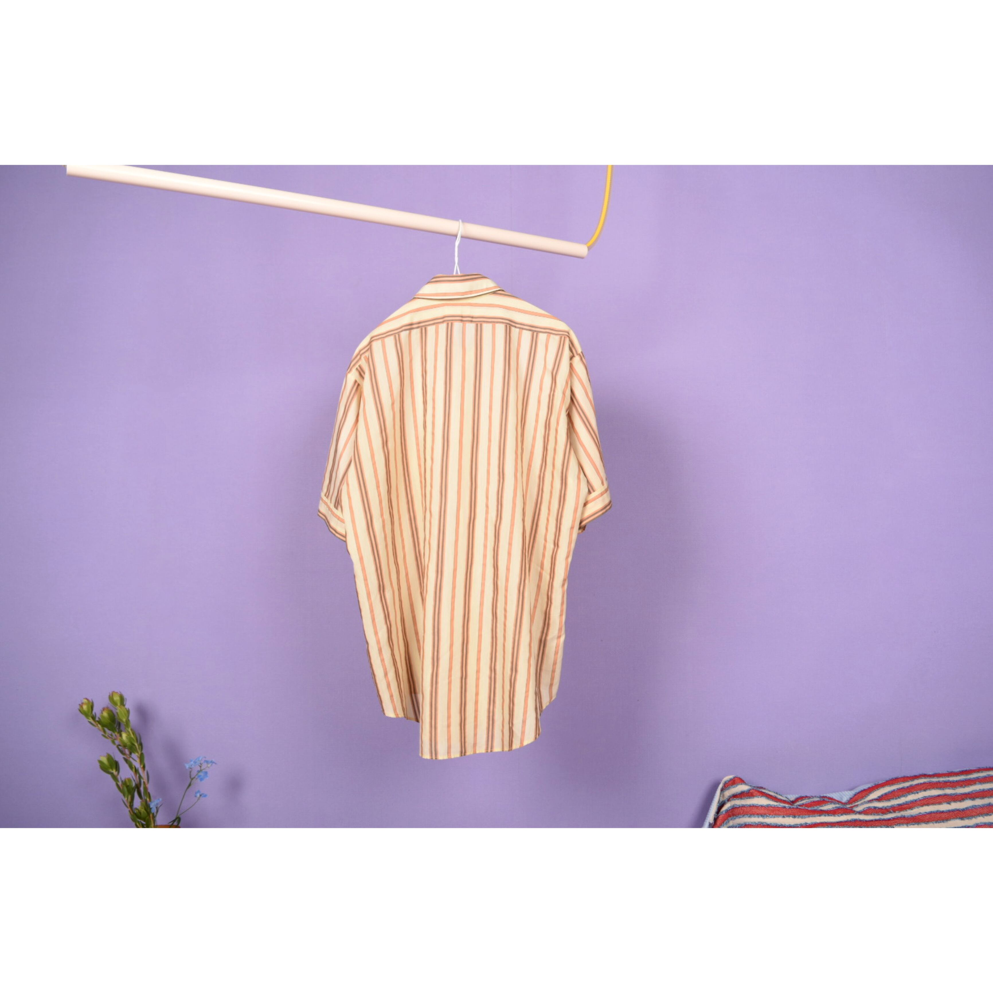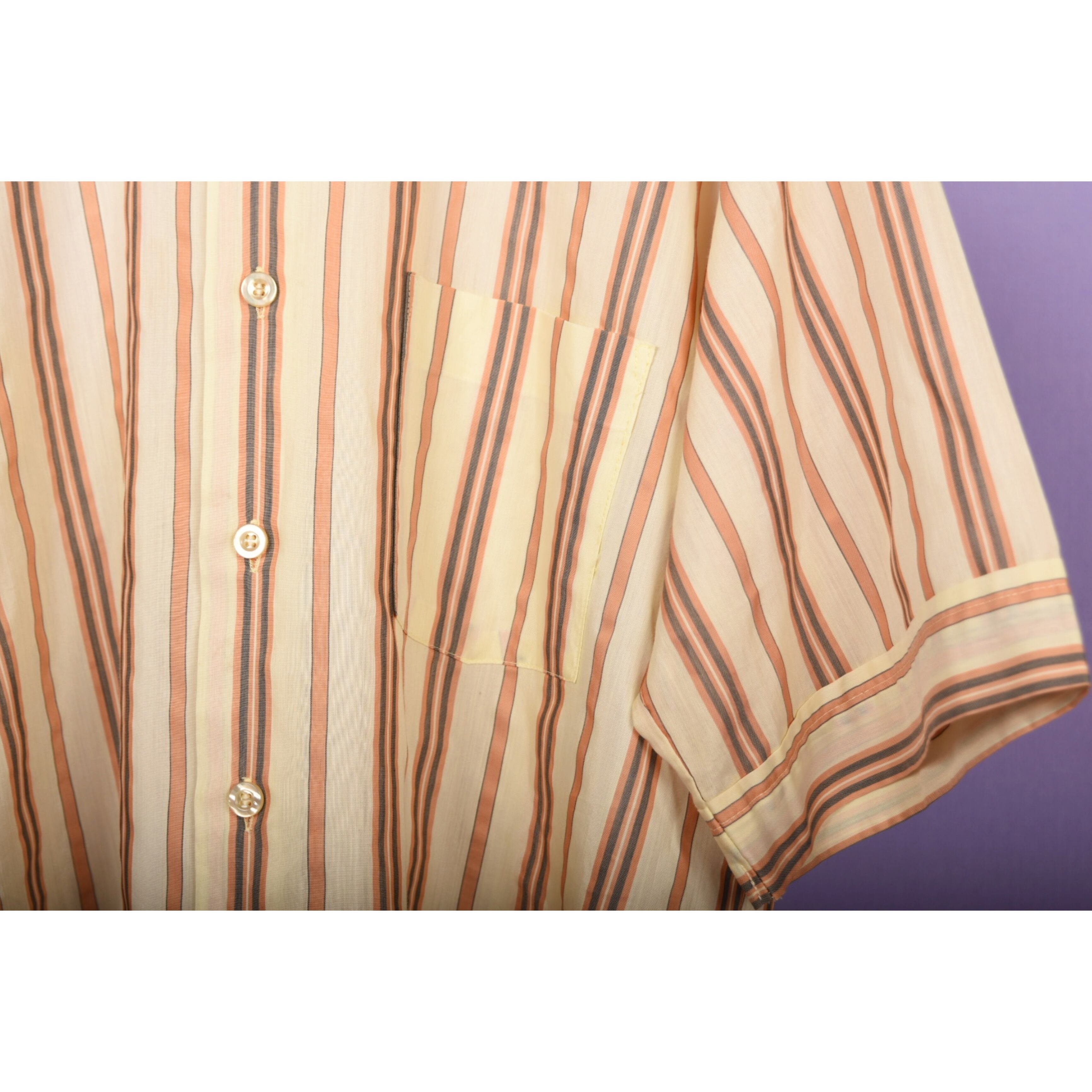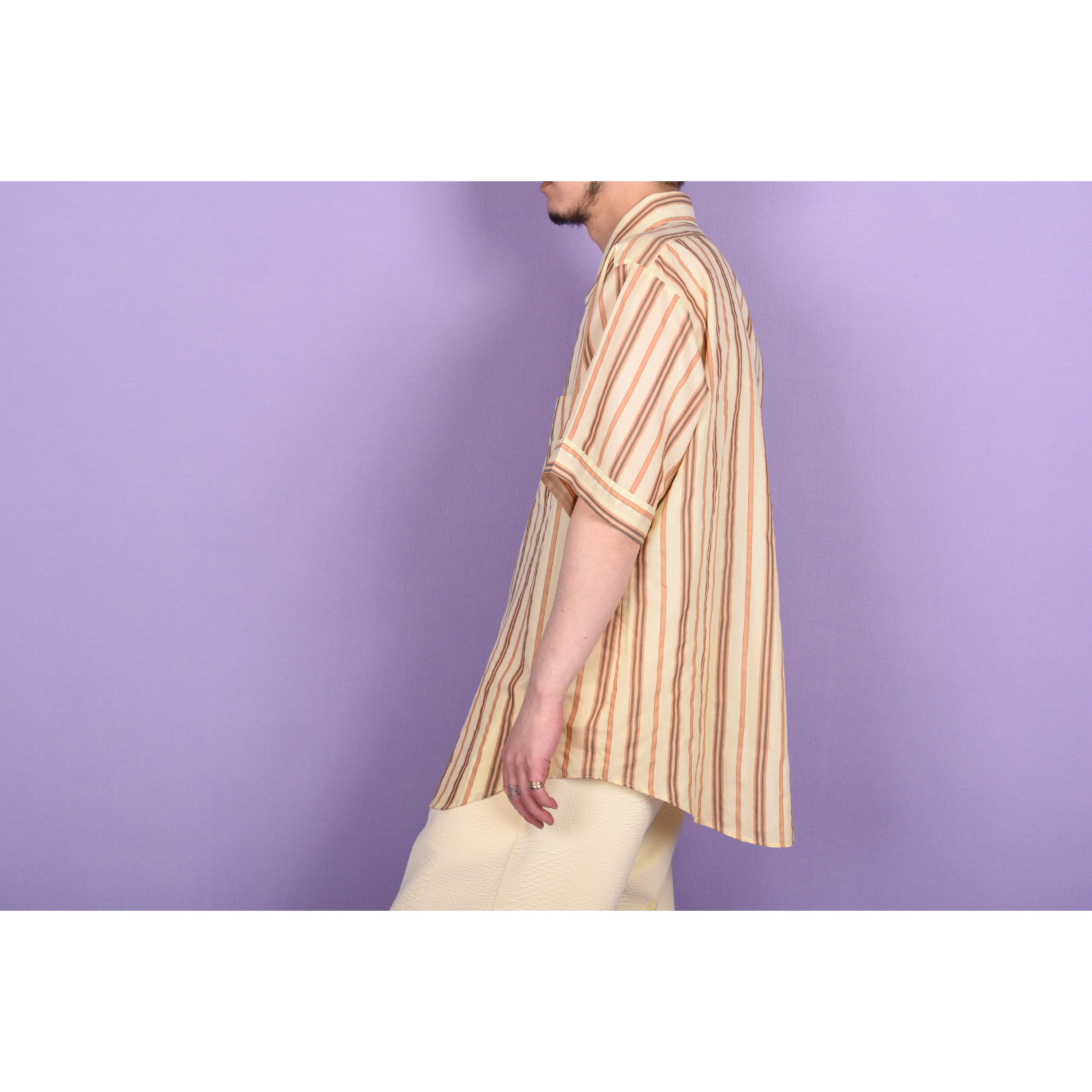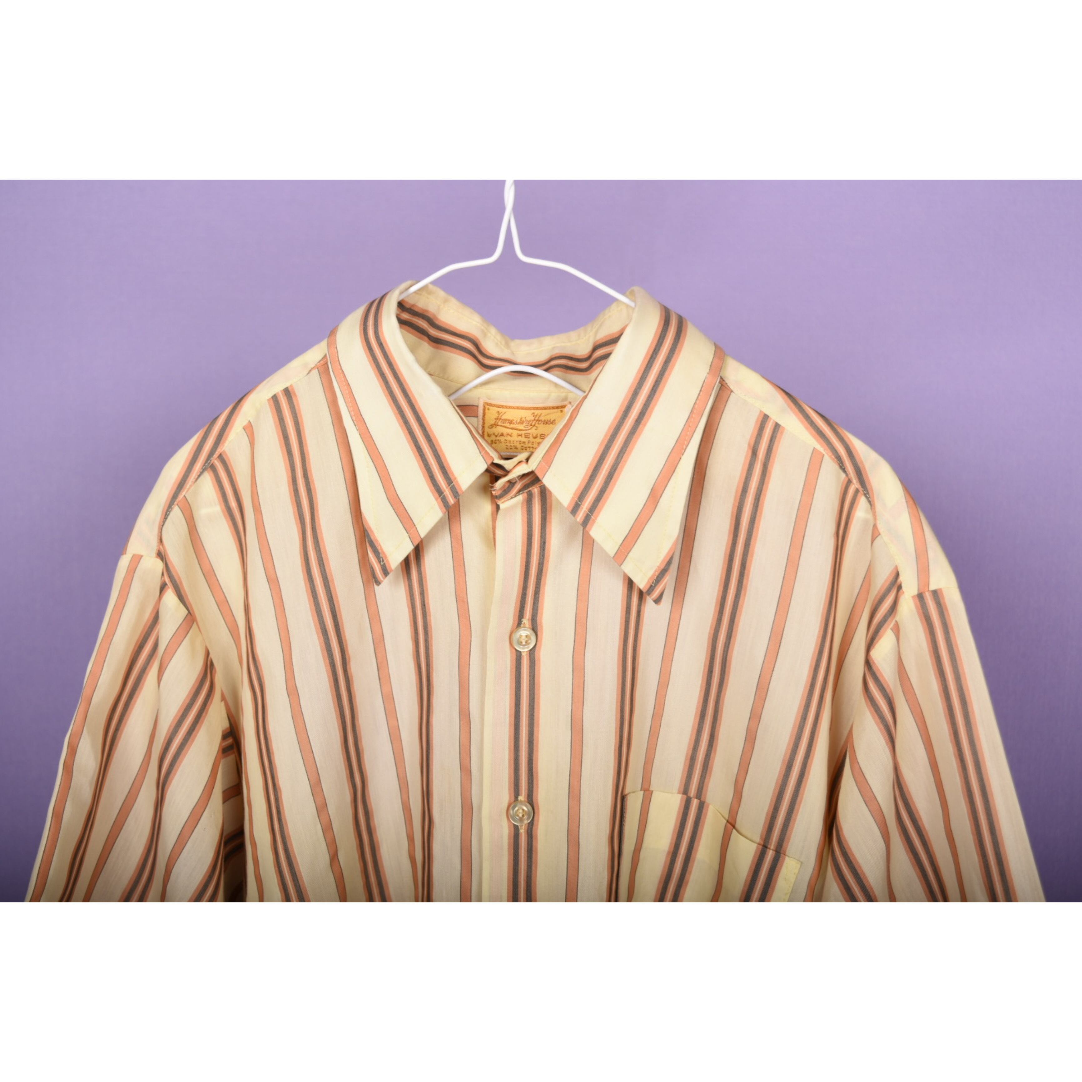 薄手で、美しい生地感の70年代バンヒューセンの半袖シャツです。クラシックな印象です。左前見頃の下の方にうっすらとスタンプのような文字が入っています。