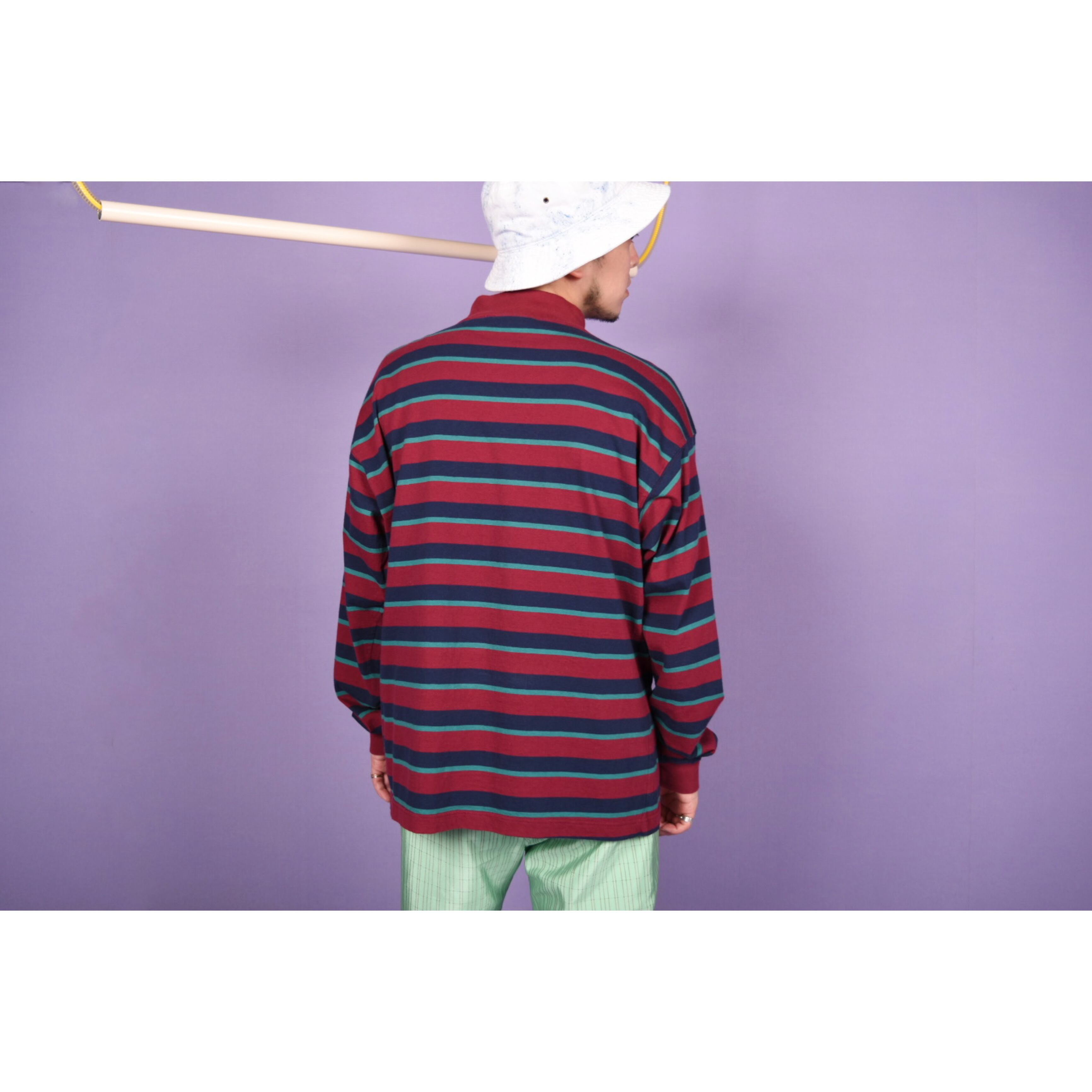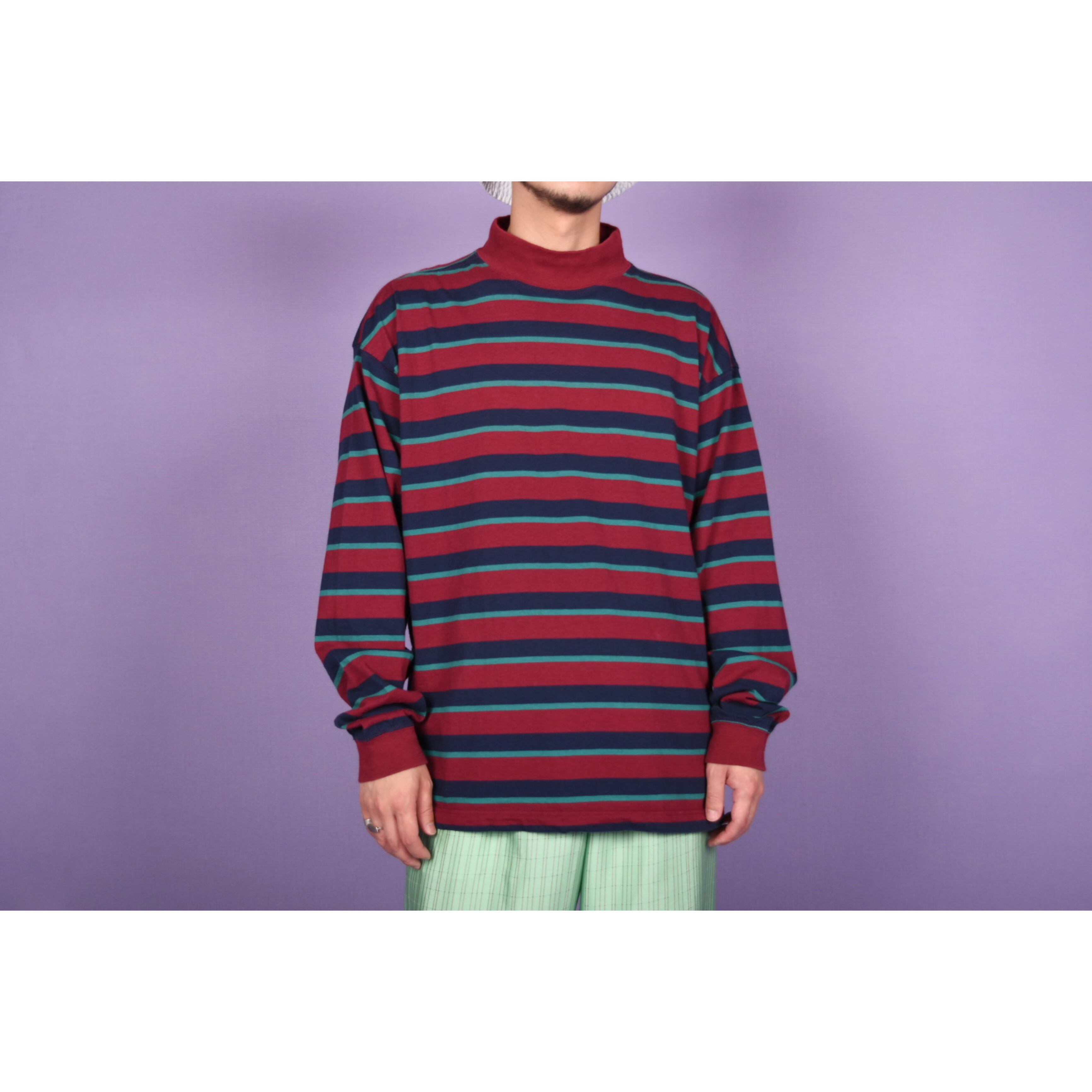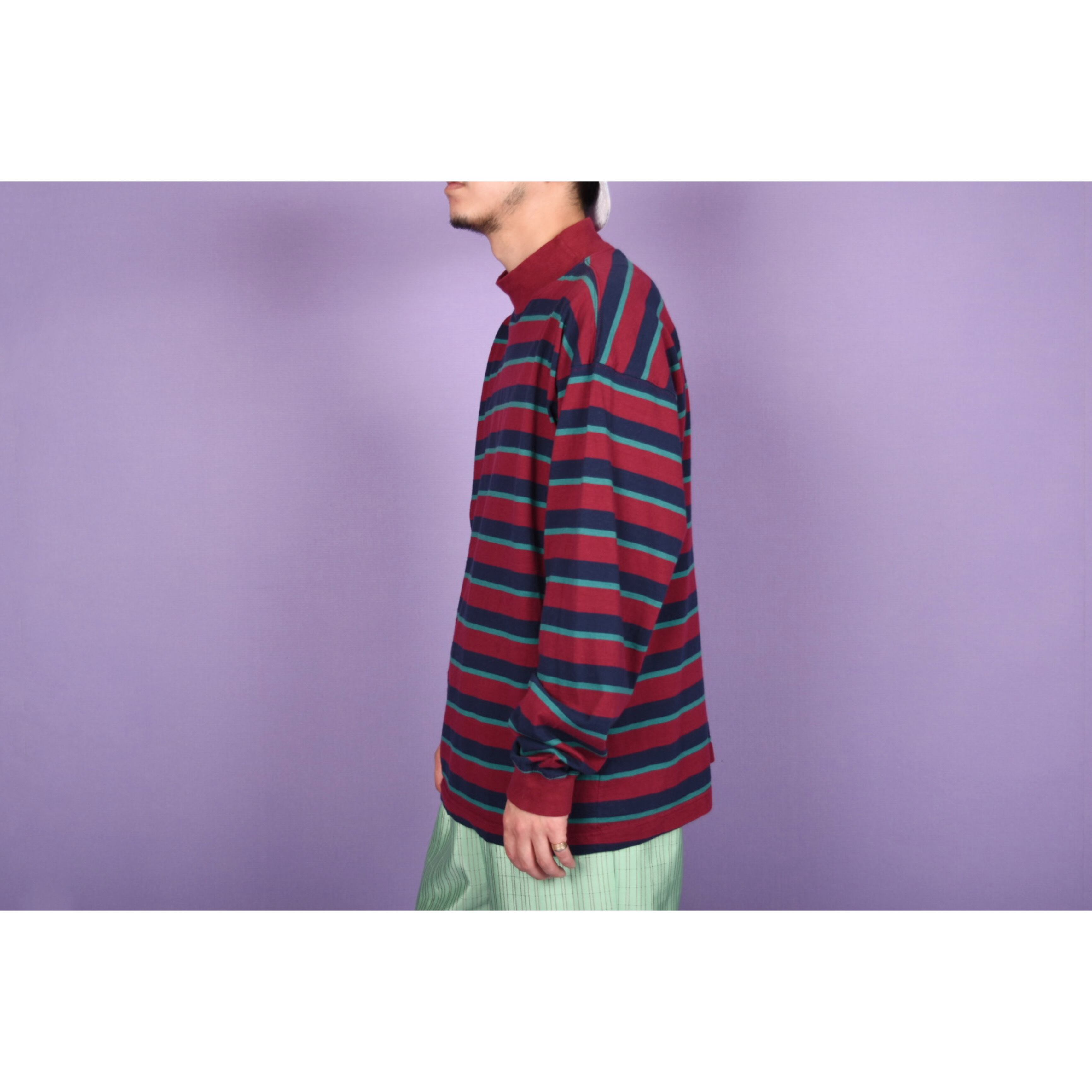 ボーダーの配色バランスがお洒落なモックネックロンTです。幅広いスタイリングに合わせやすそうです。男女ともにおすすめです。