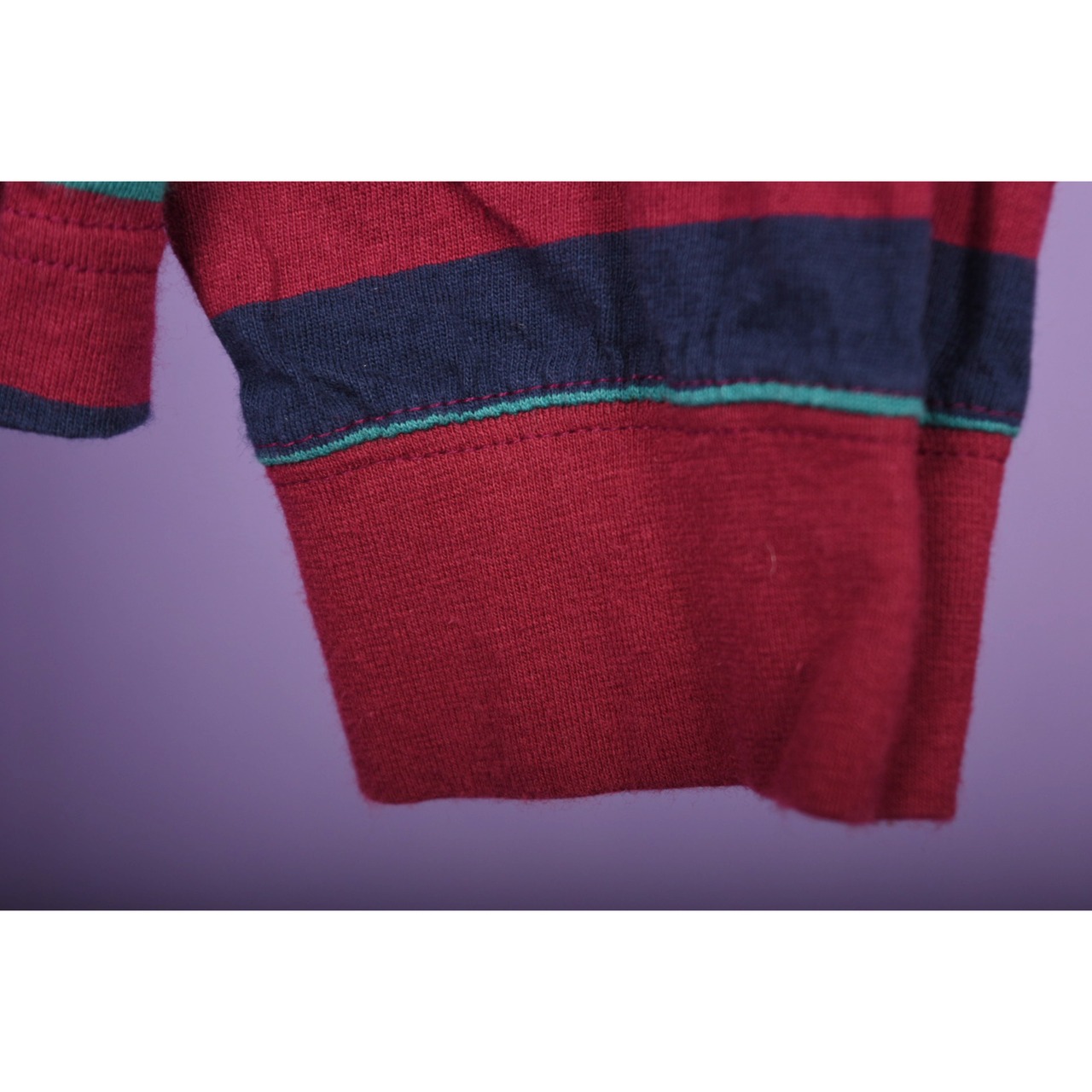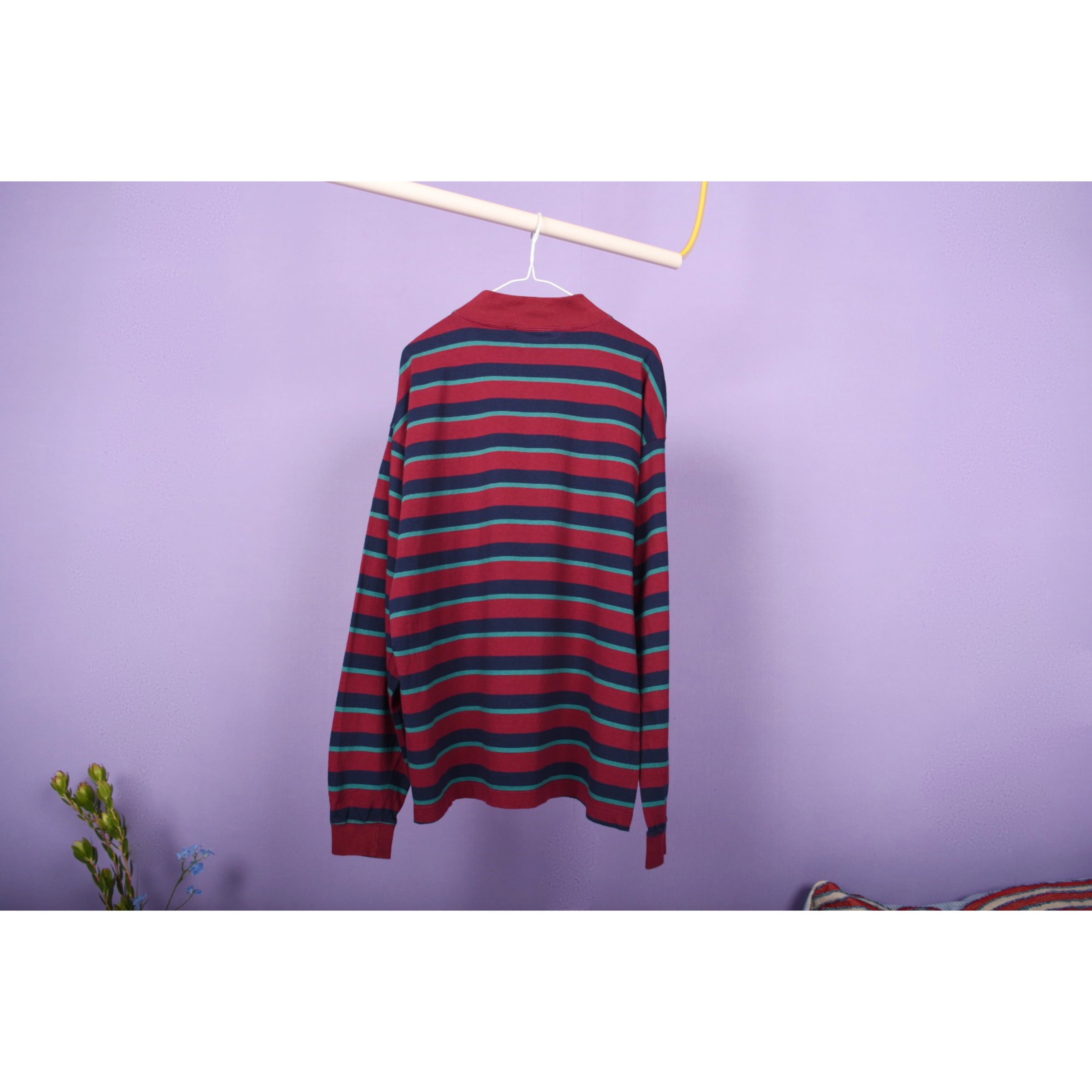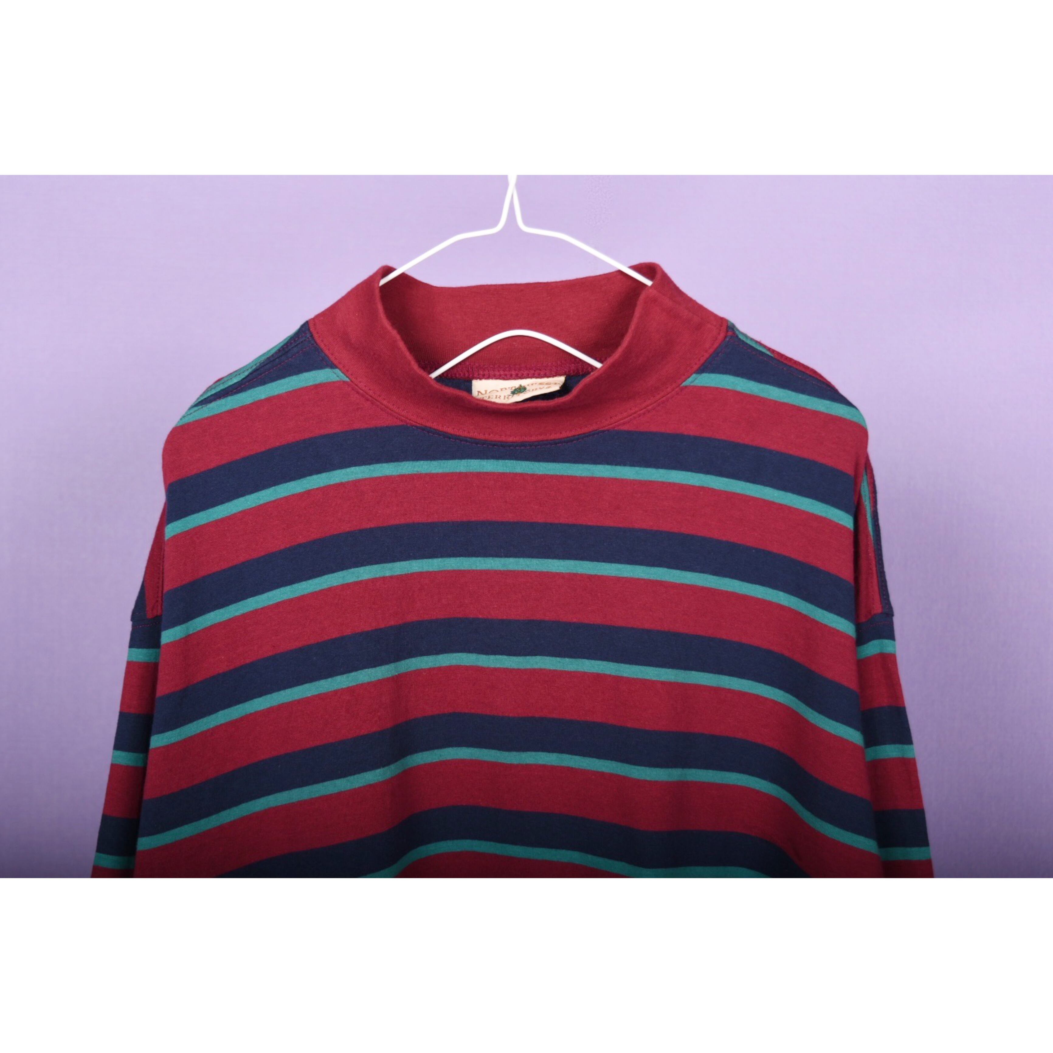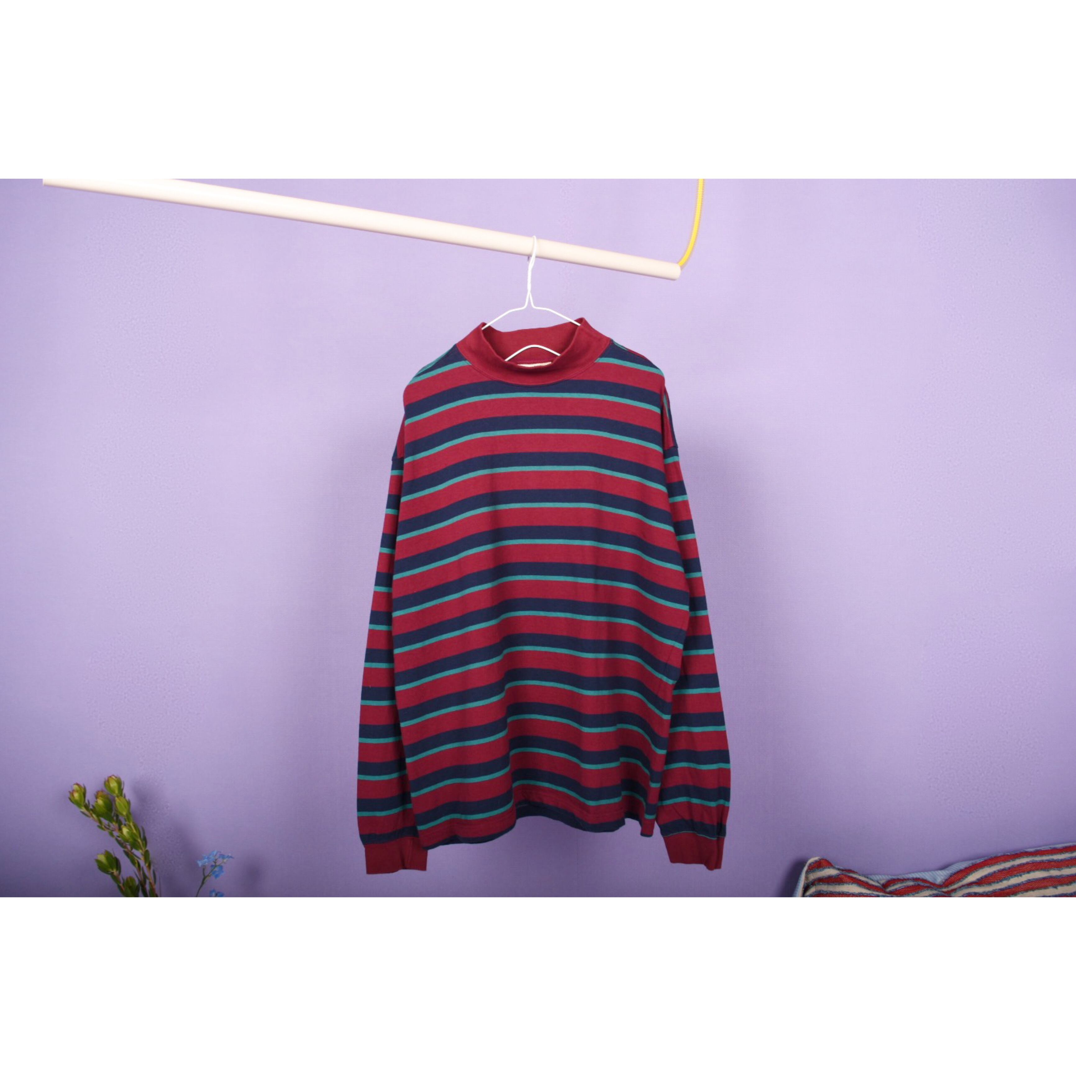 ボーダーの配色バランスがお洒落なモックネックロンTです。幅広いスタイリングに合わせやすそうです。男女ともにおすすめです。