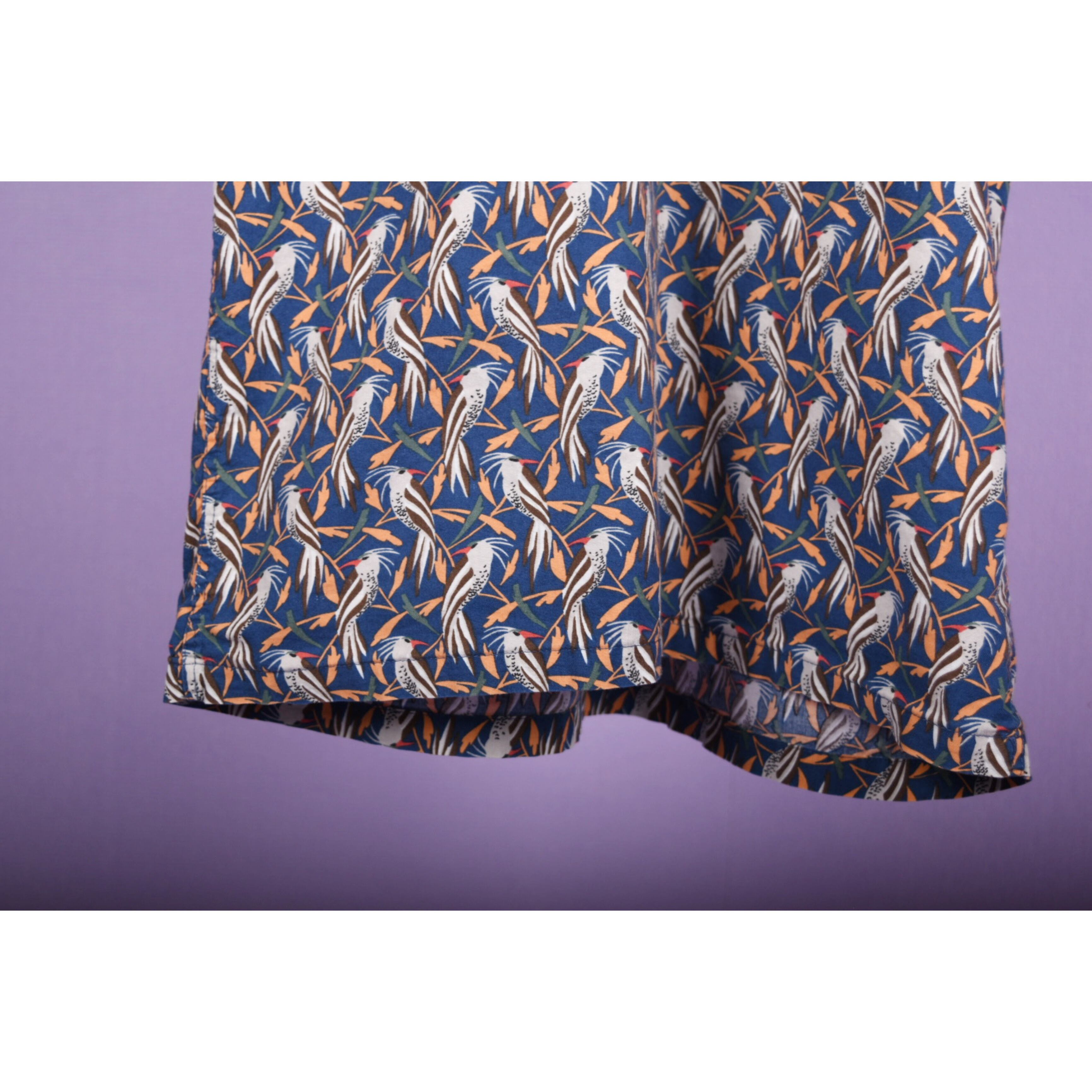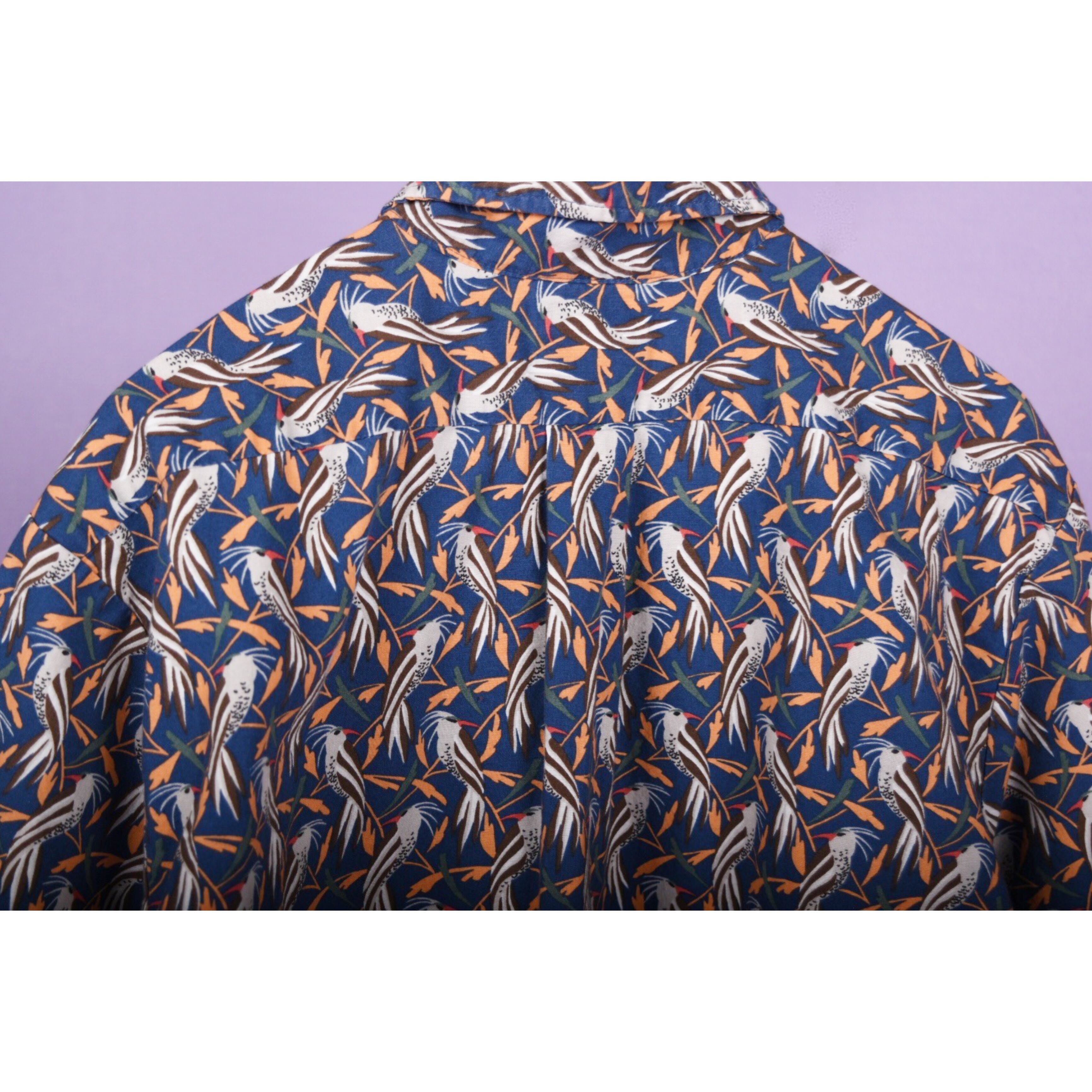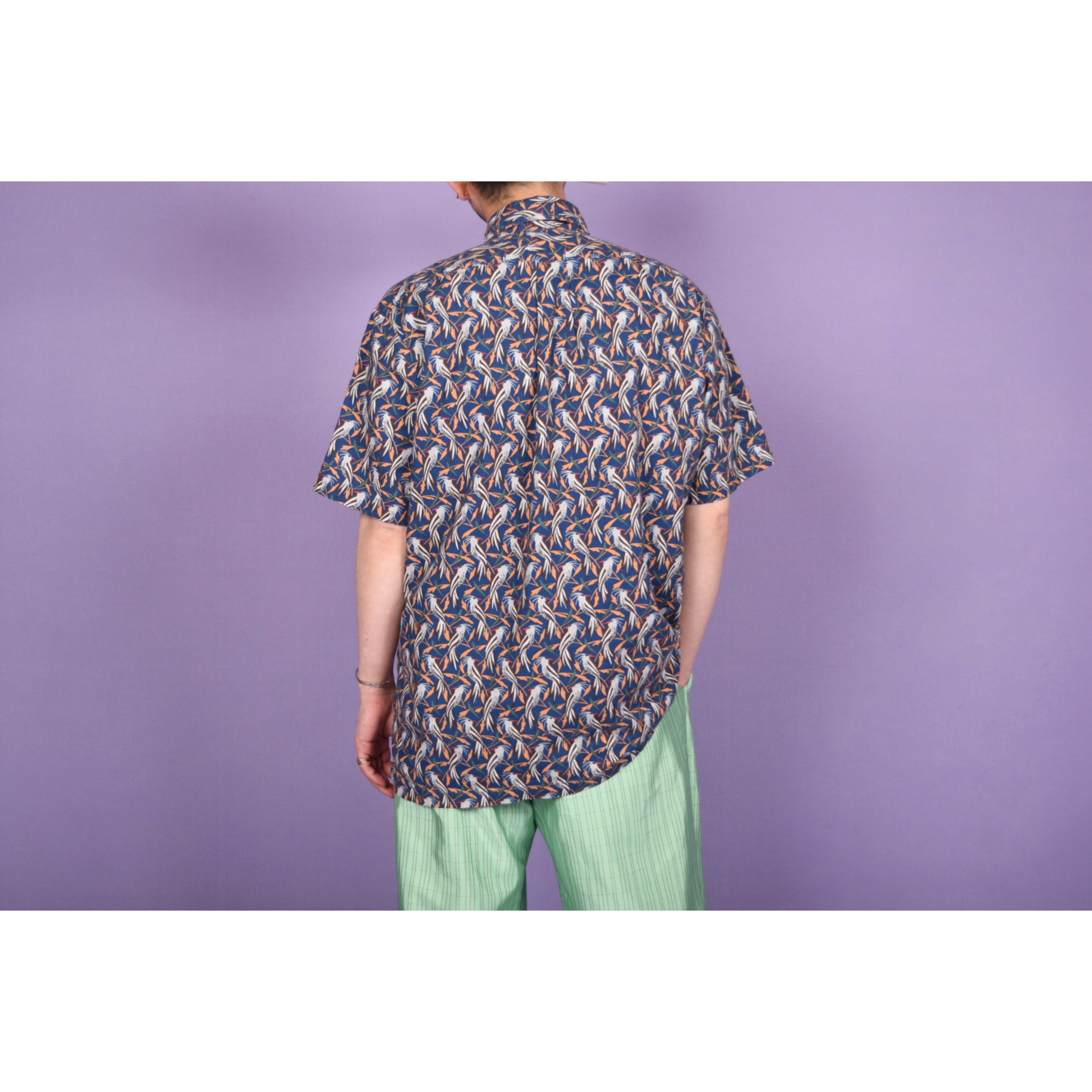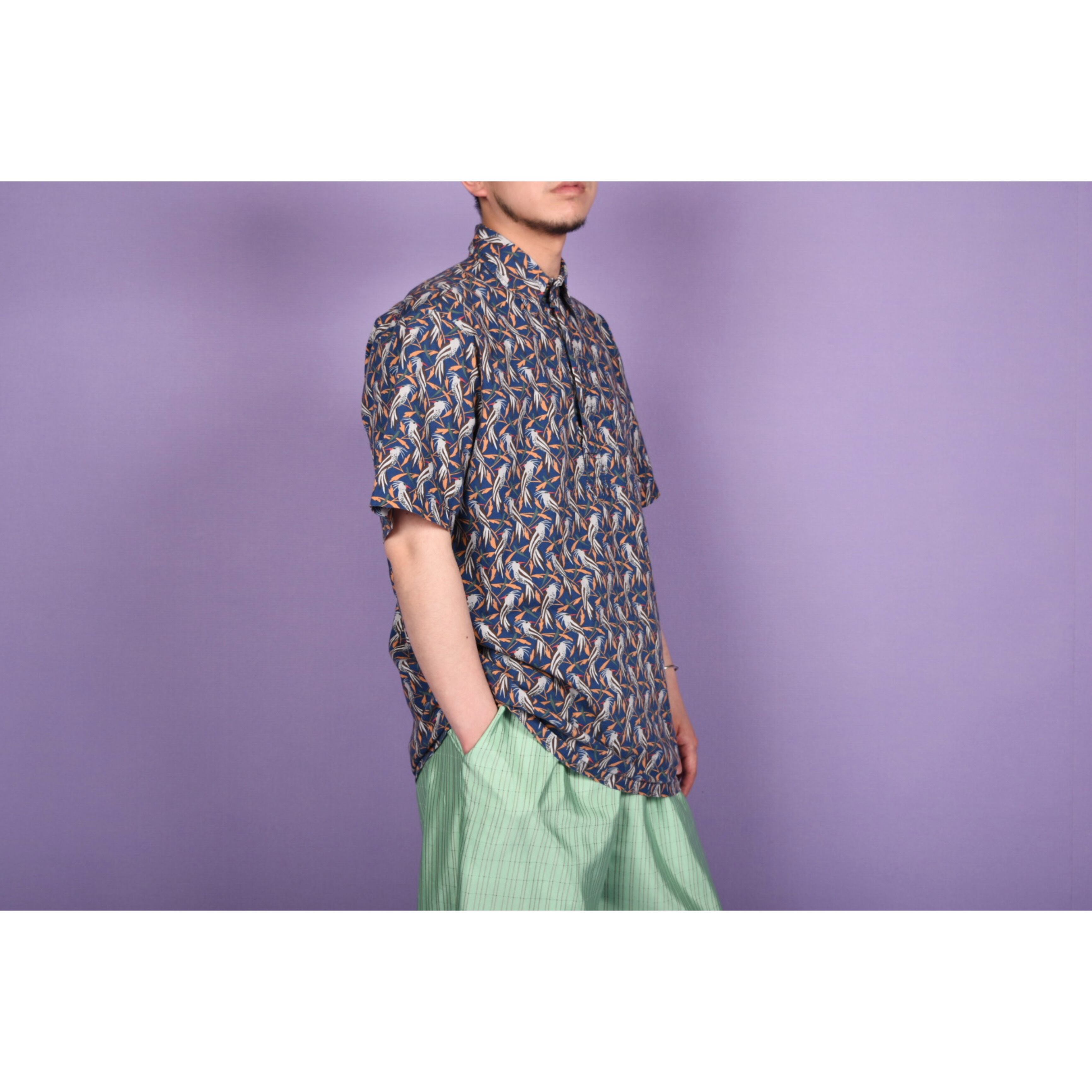 鳥の総柄プリントが全体に入ったプルオーバータイプのシャツです。全体の配色バランスが良くお洒落です。男女問わず着用可能なサイズ感です。