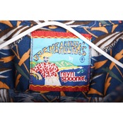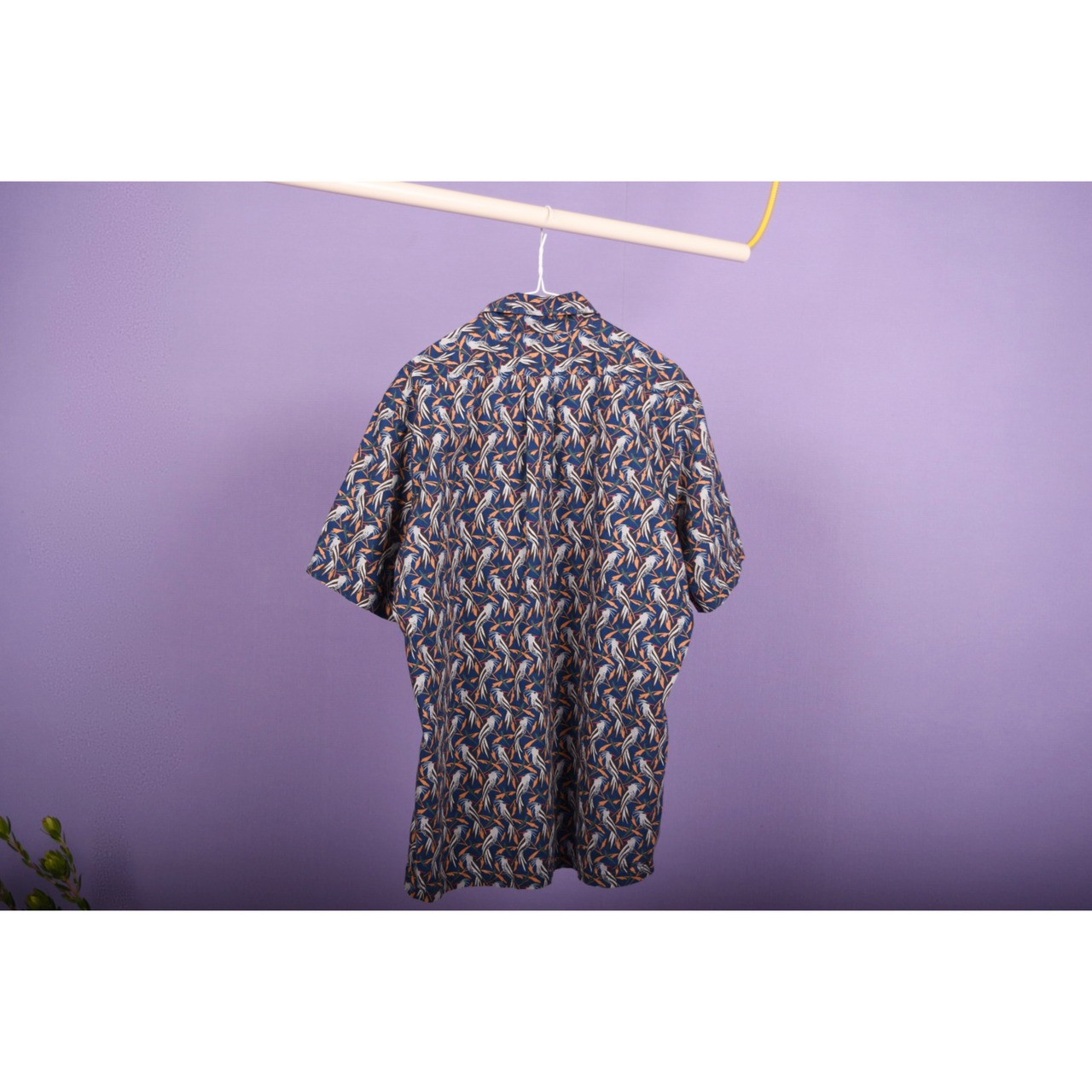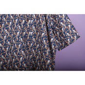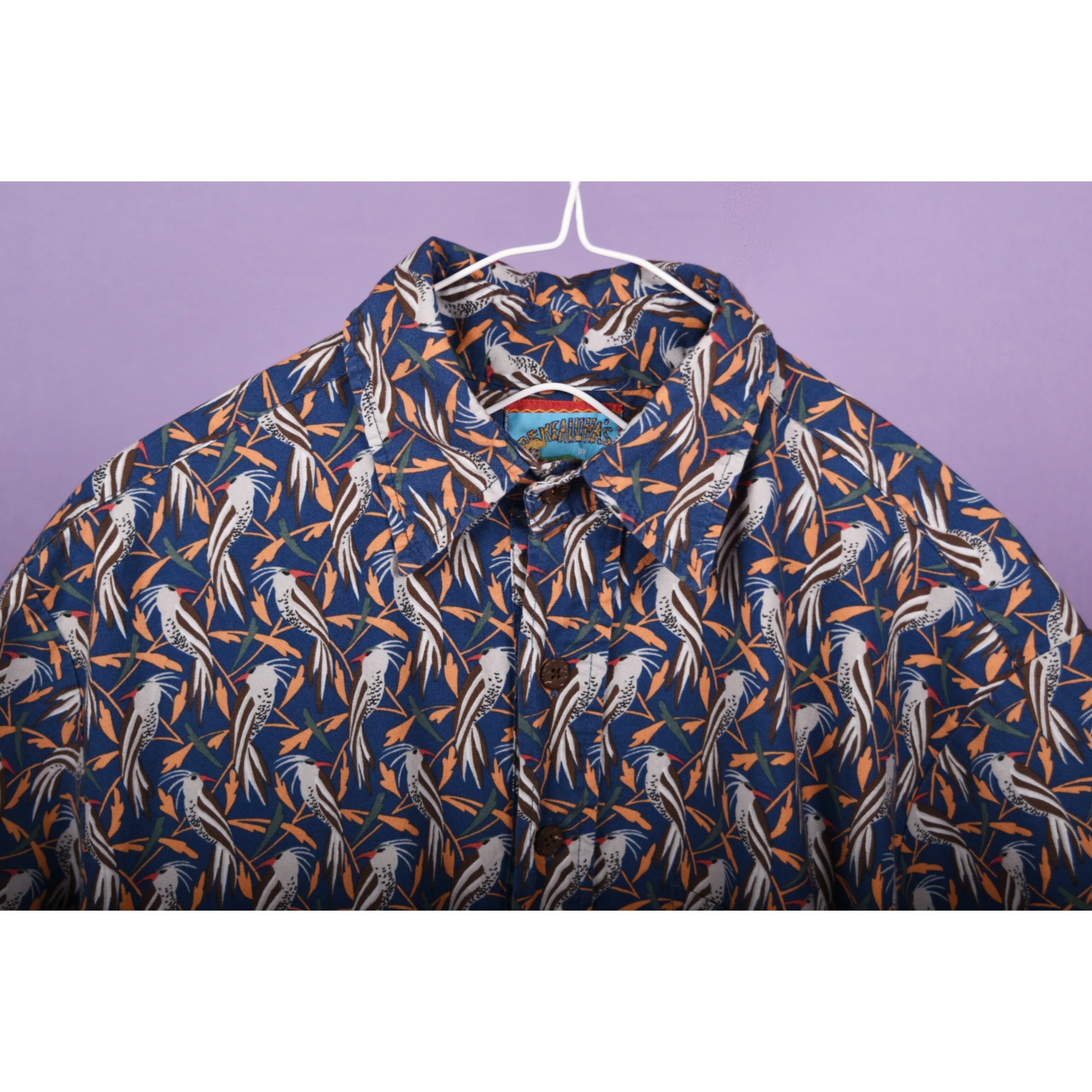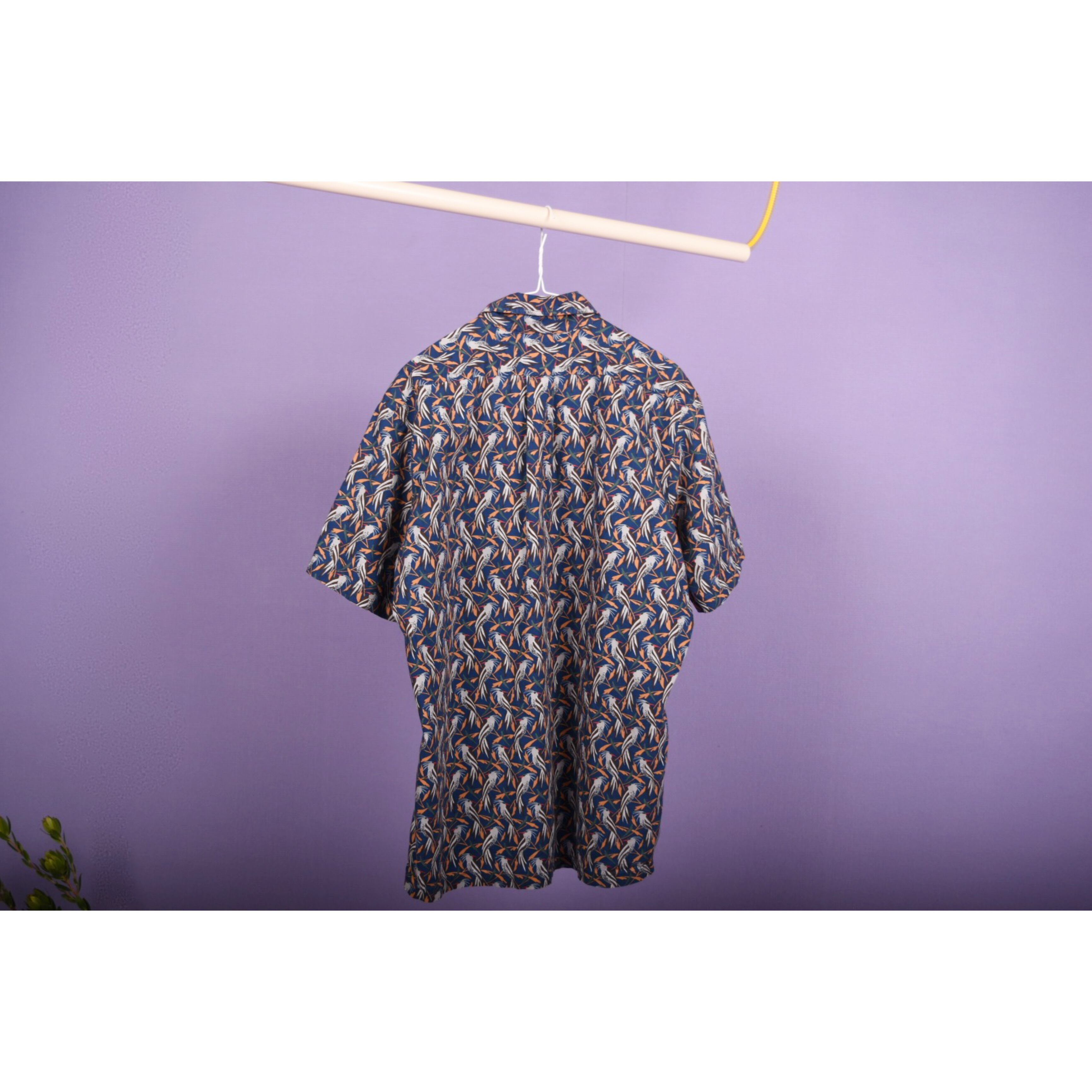 鳥の総柄プリントが全体に入ったプルオーバータイプのシャツです。全体の配色バランスが良くお洒落です。男女問わず着用可能なサイズ感です。