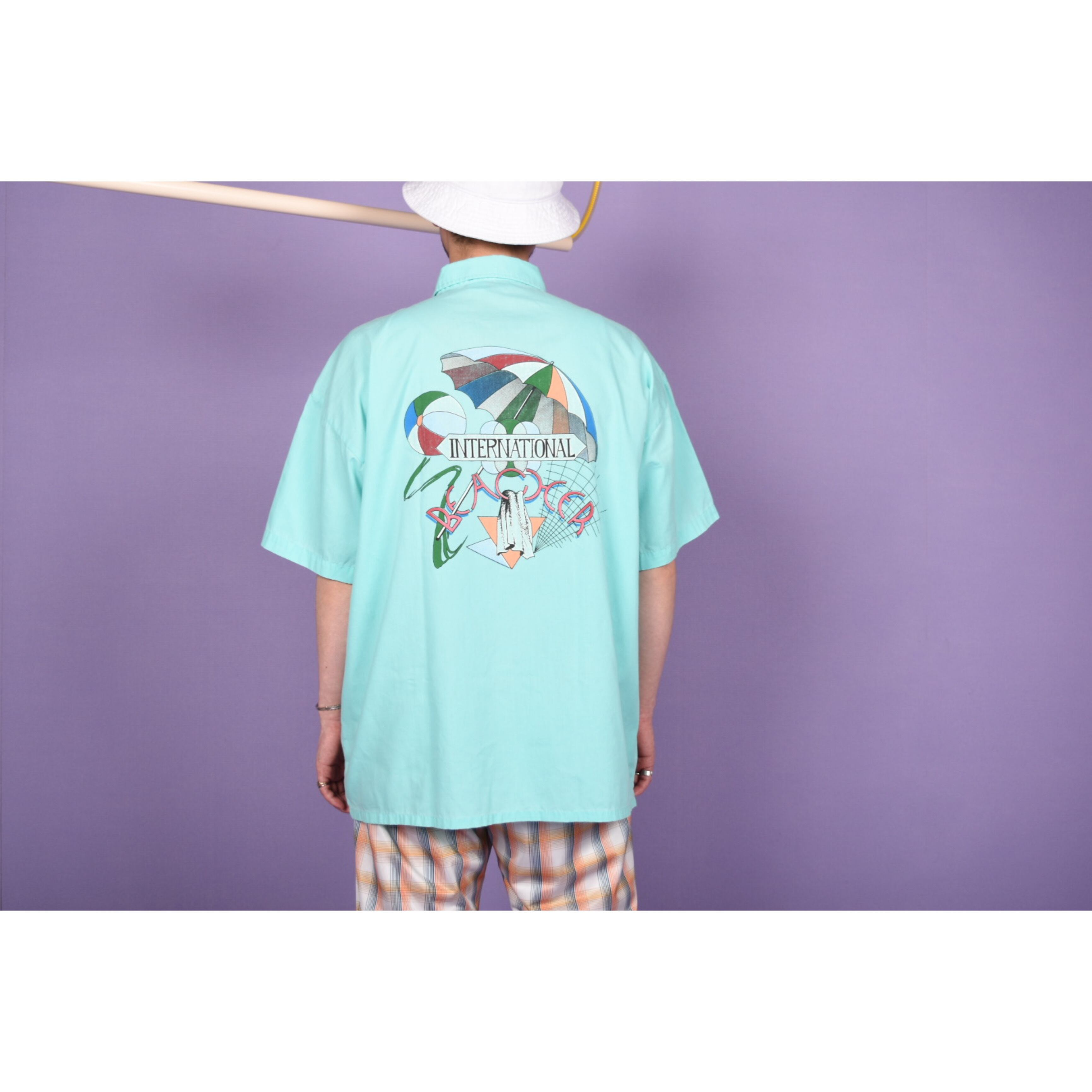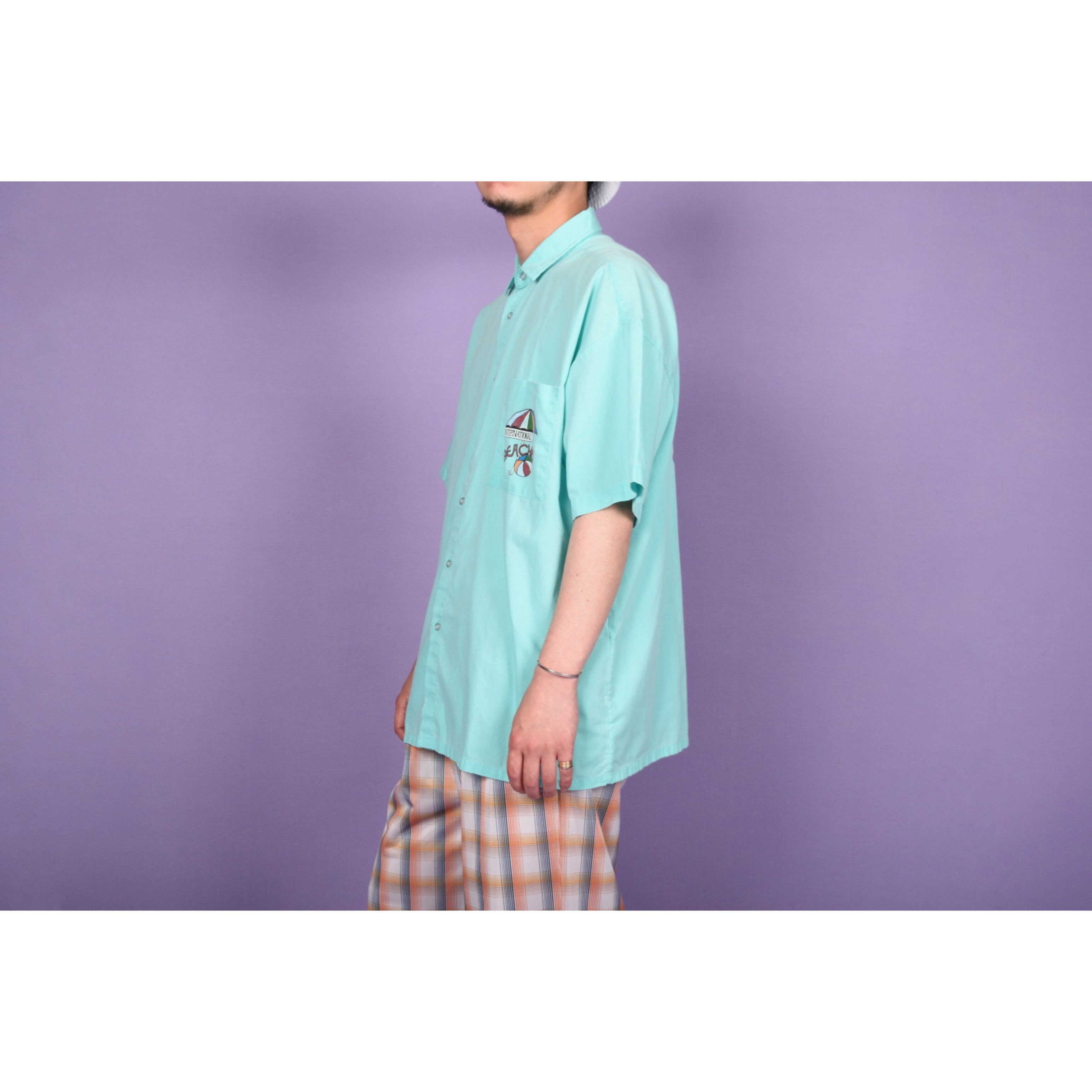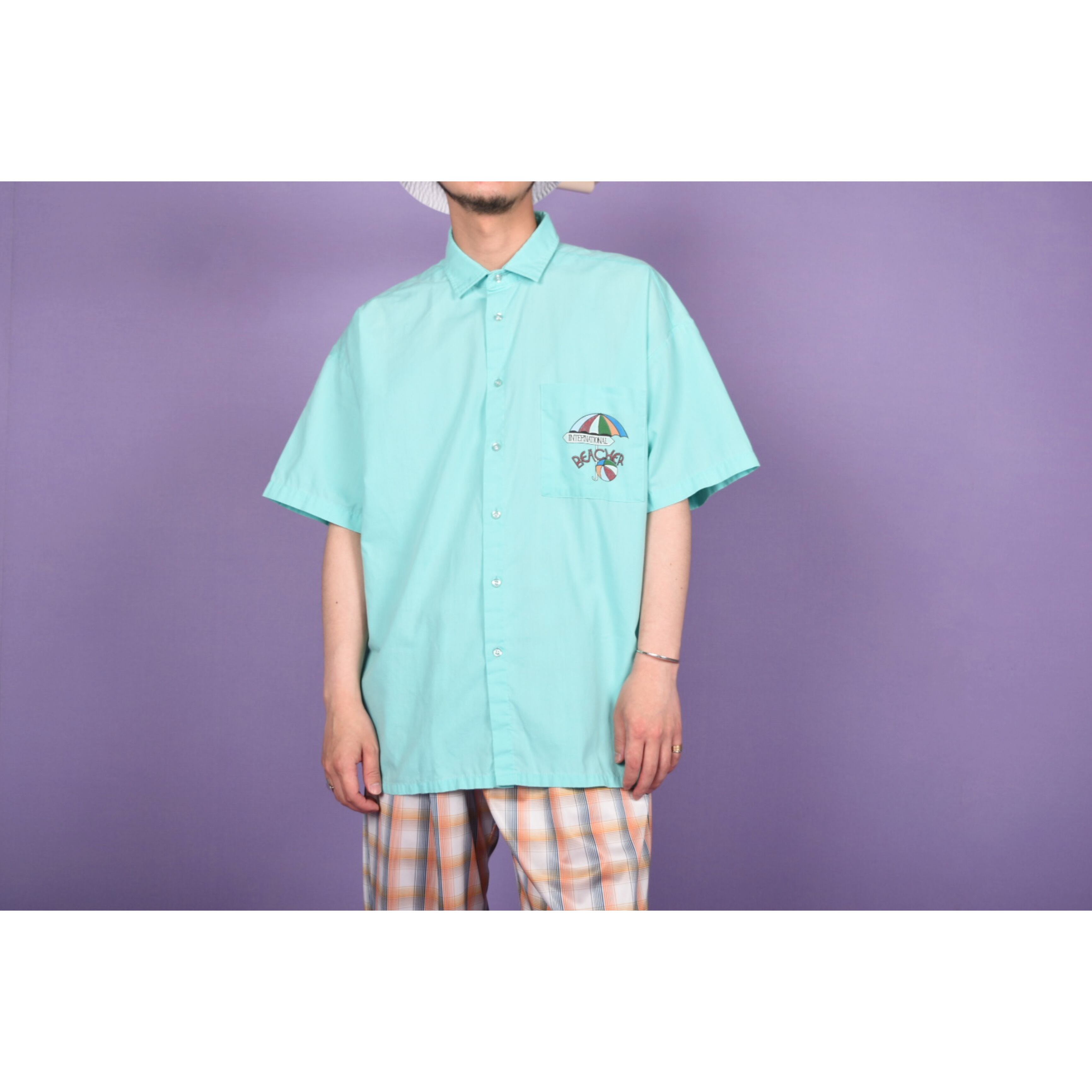 フロント、バックに入ったパラソルプリントがとても可愛い半袖シャツです。セラドンカラーが夏にぴったりです。ユニセックスでおすすめです!