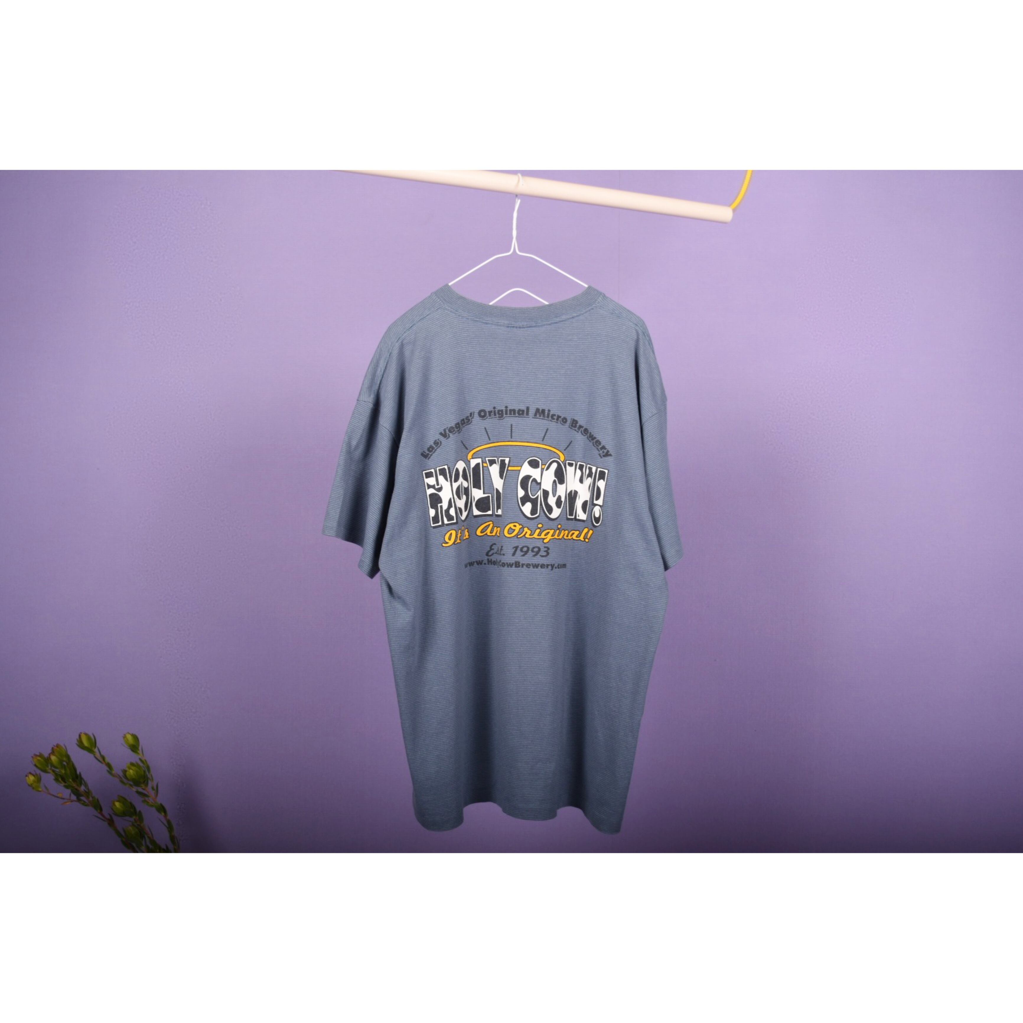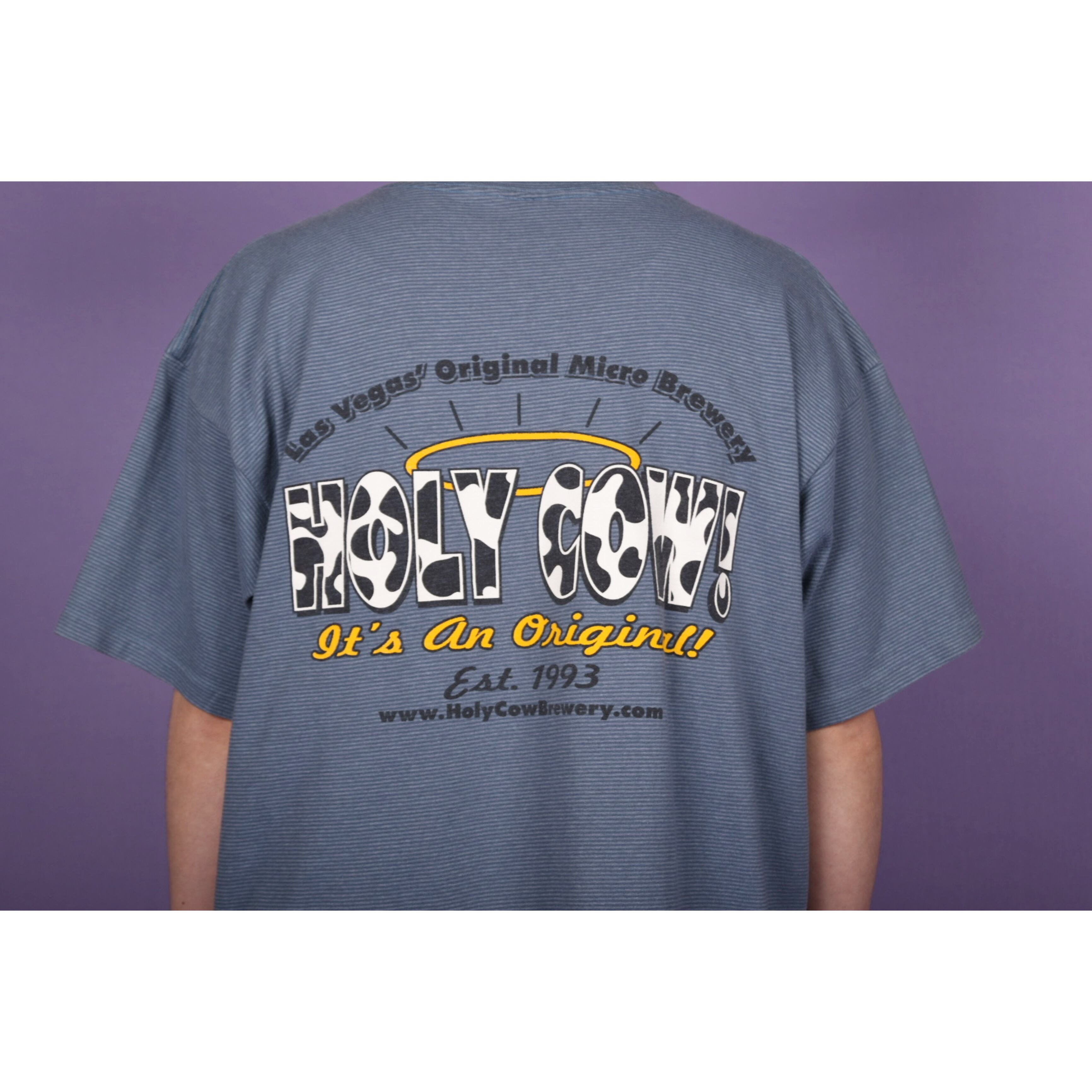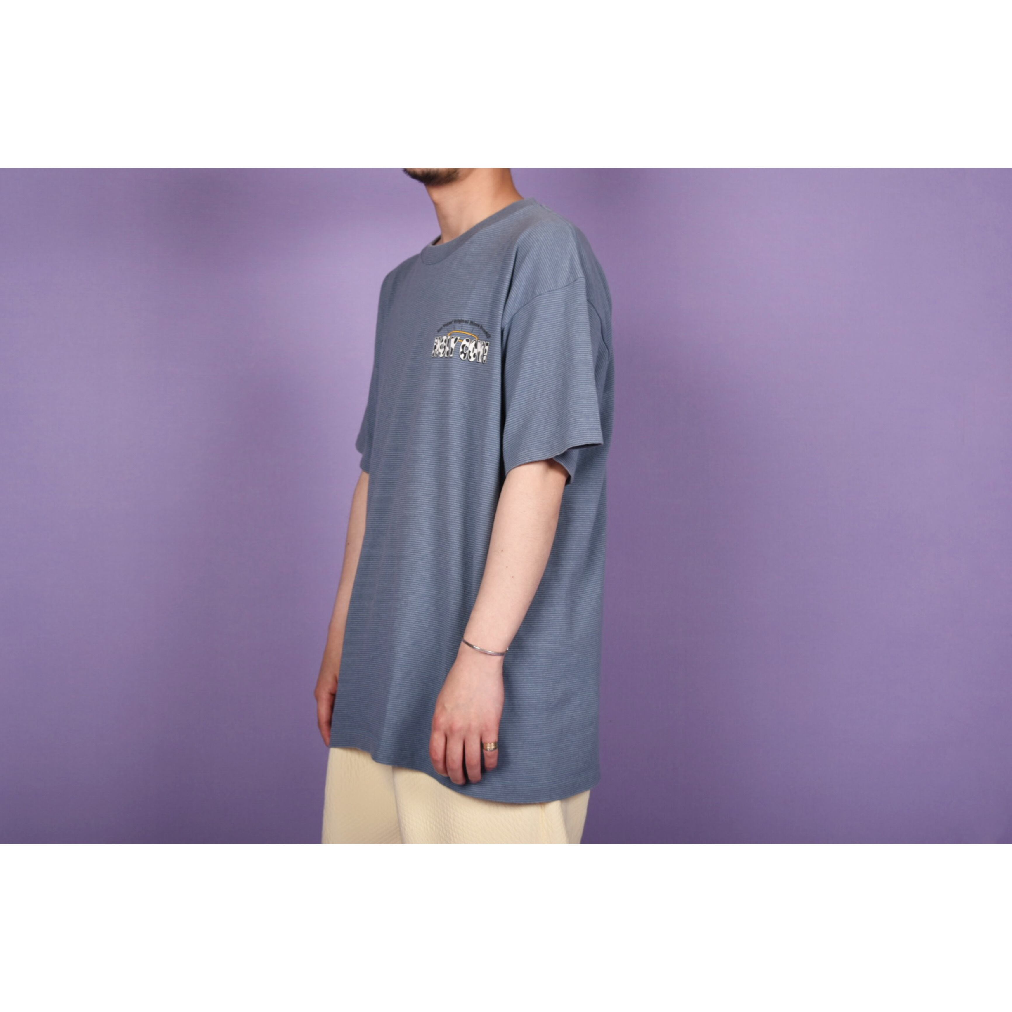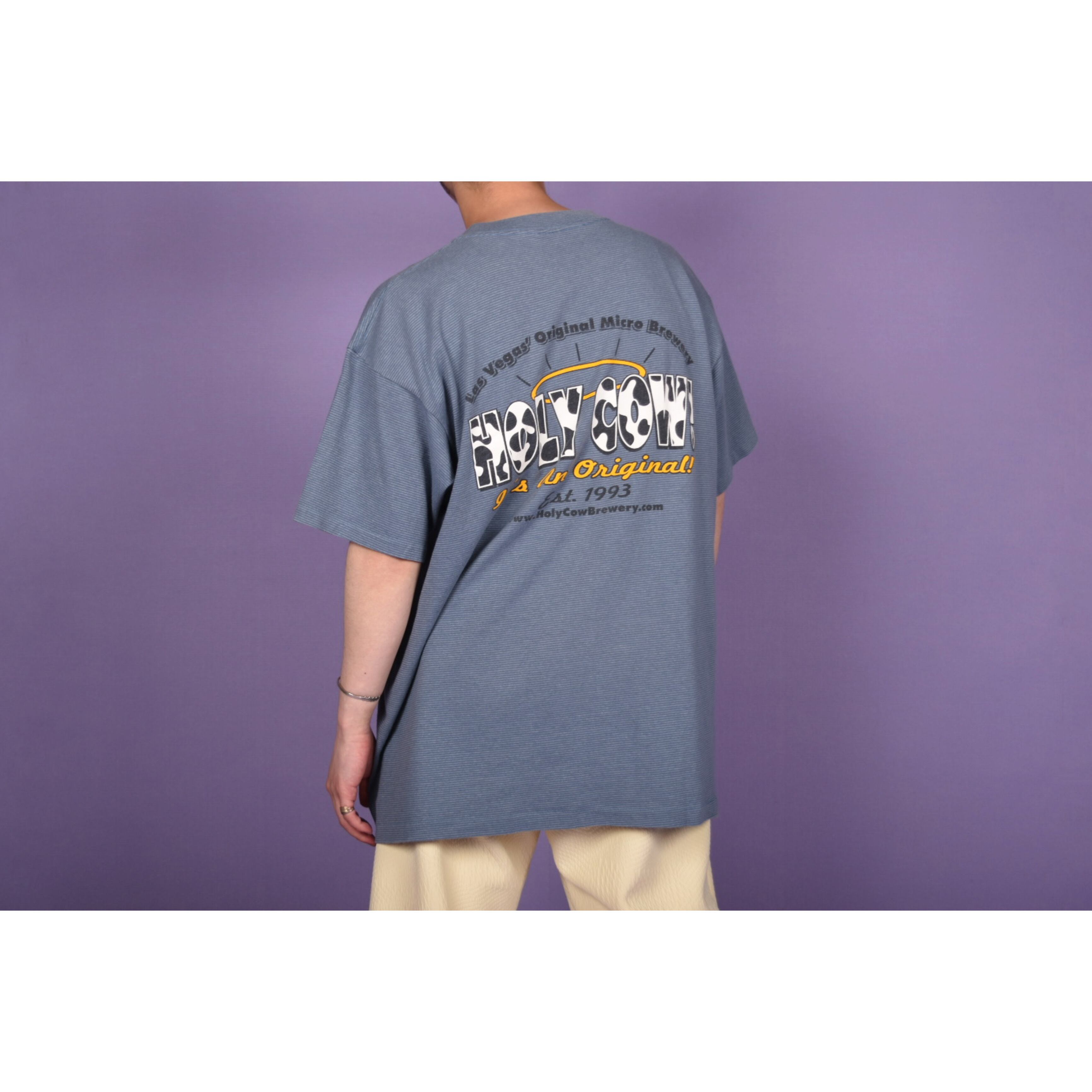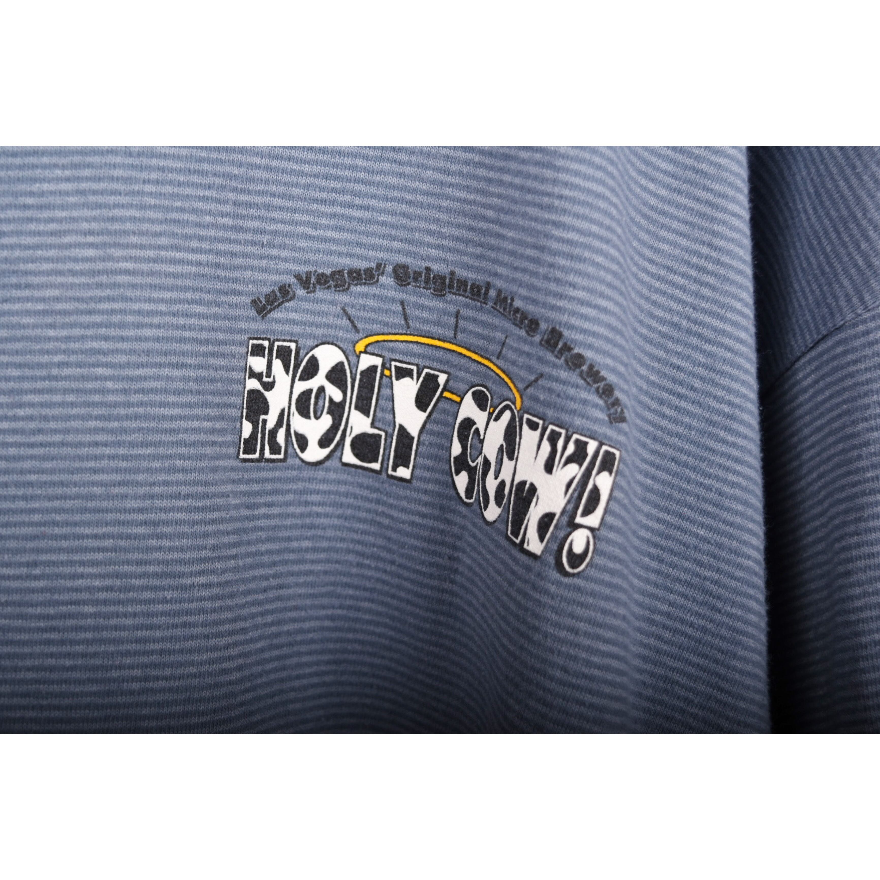 ブルーグレーの細ボーダーボディに牛柄のHOLY COWのロゴプリントがめちゃ可愛いです!生地感もしっかりかつソフトな着心地が良いTEEです。これはお洒落です。