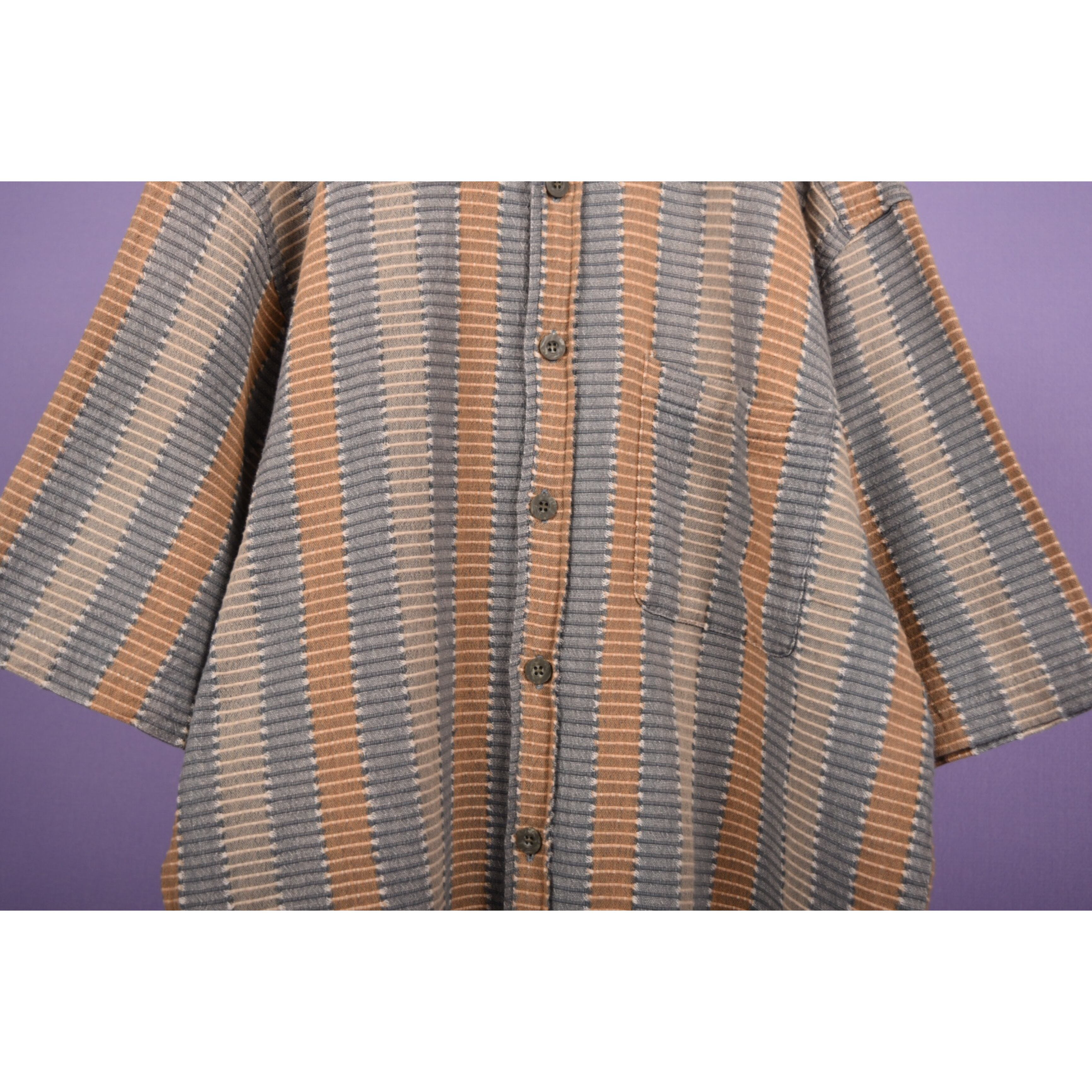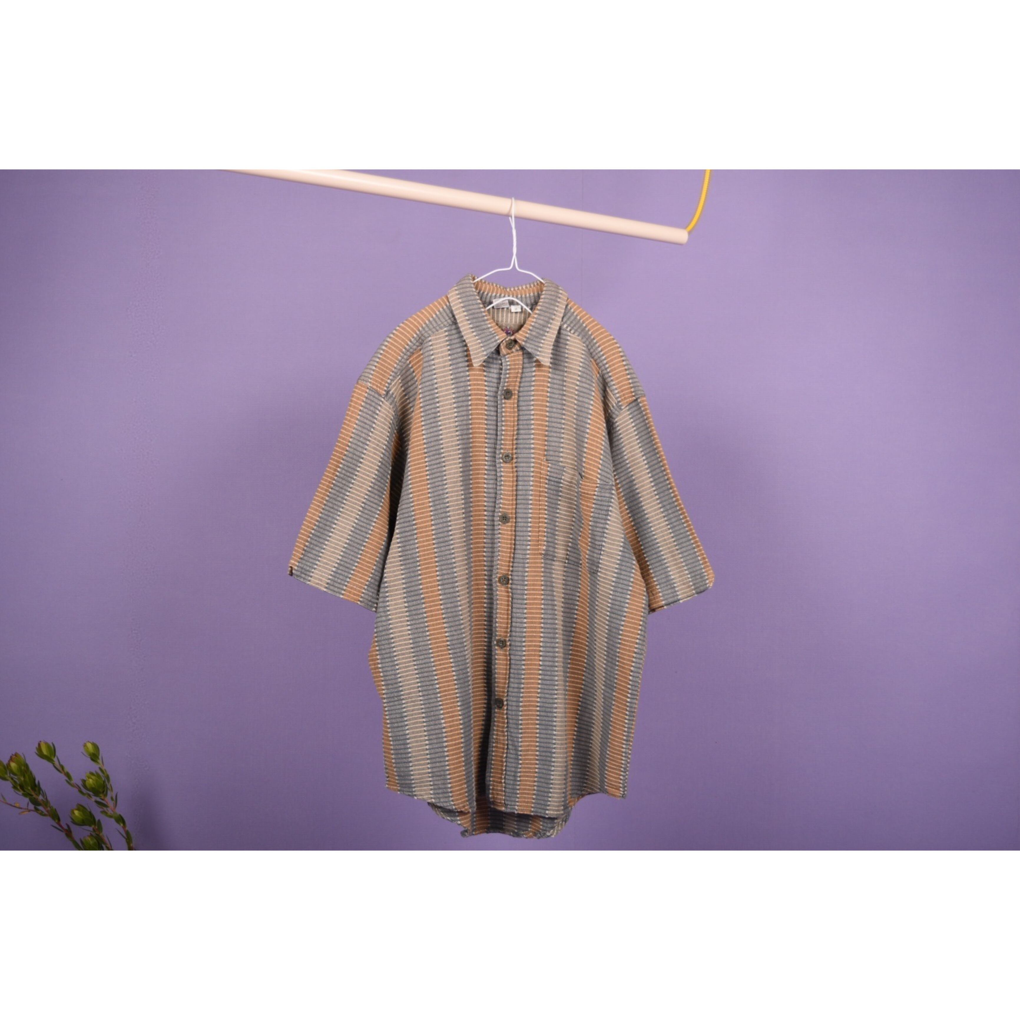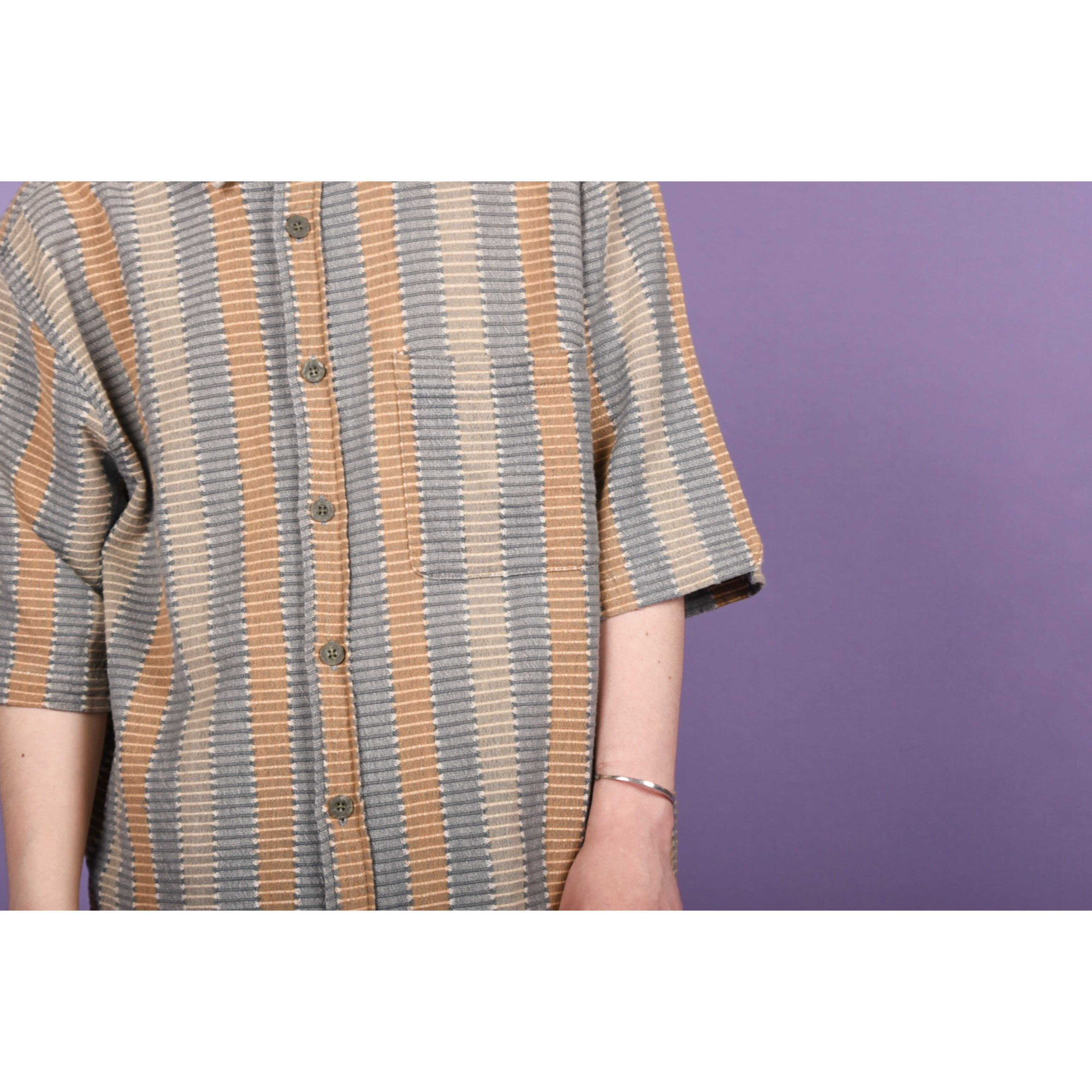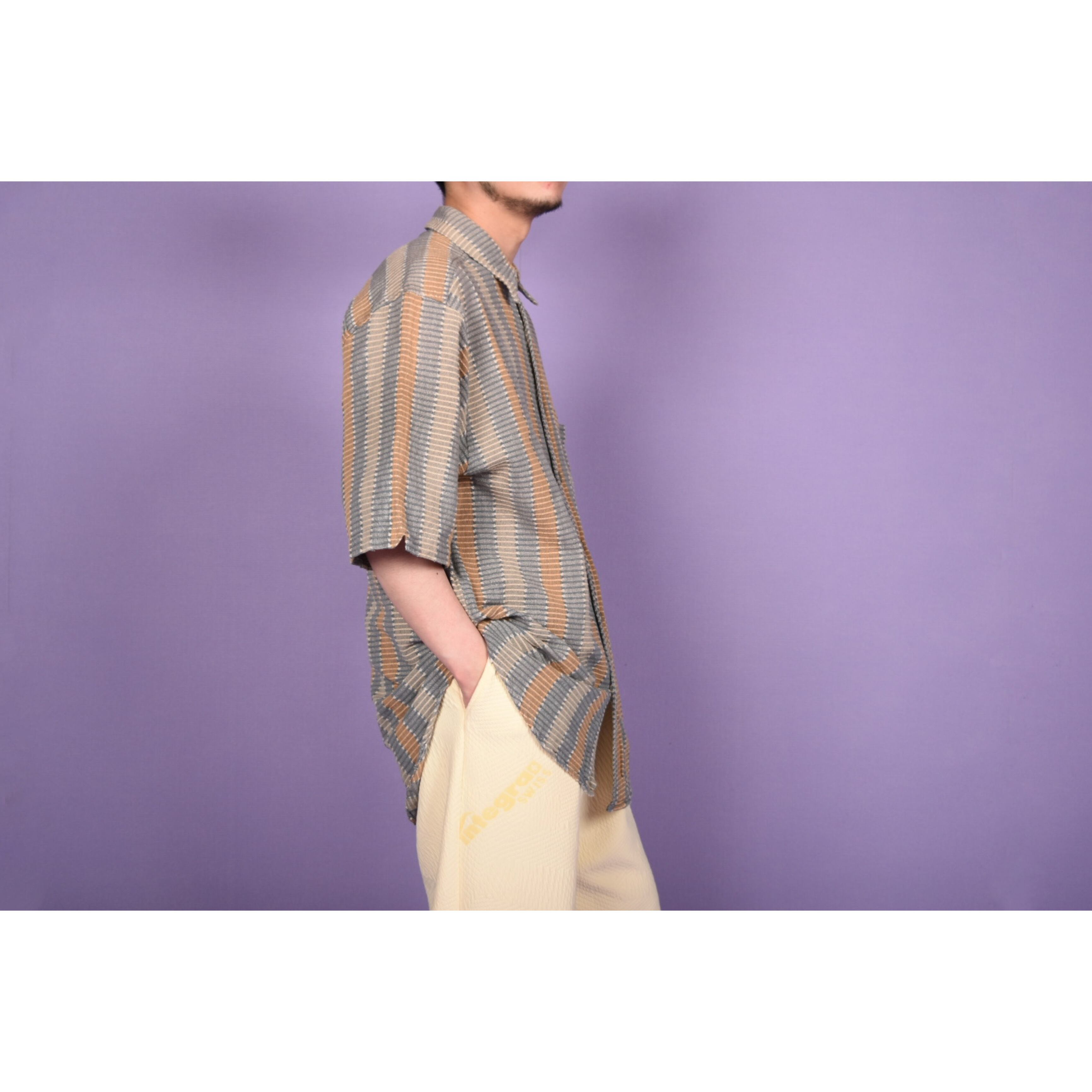 凸凹のテキスタイルが面白い半袖シャツです。一枚で様になるデザインのシャツは薄着になるこの季節に活躍します!