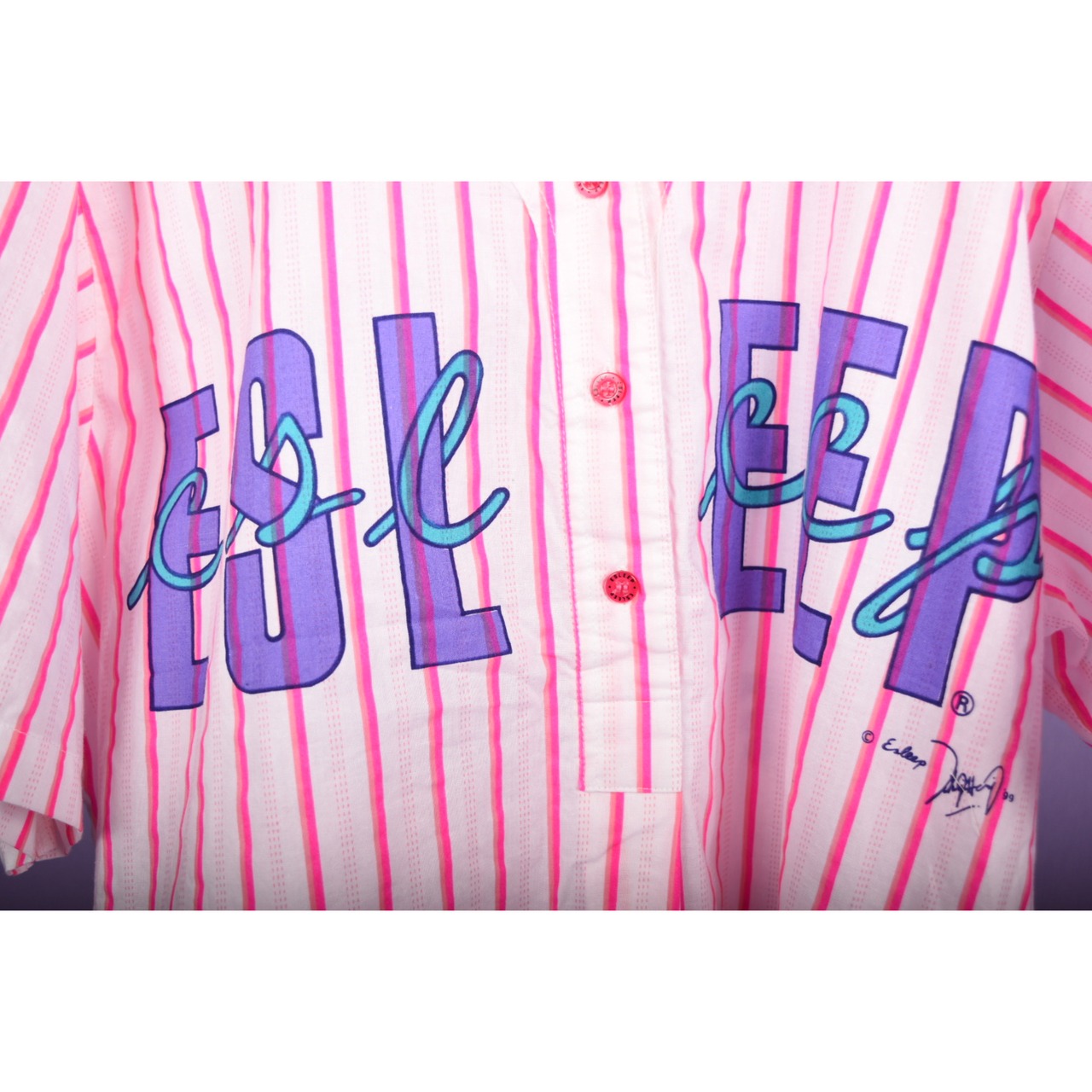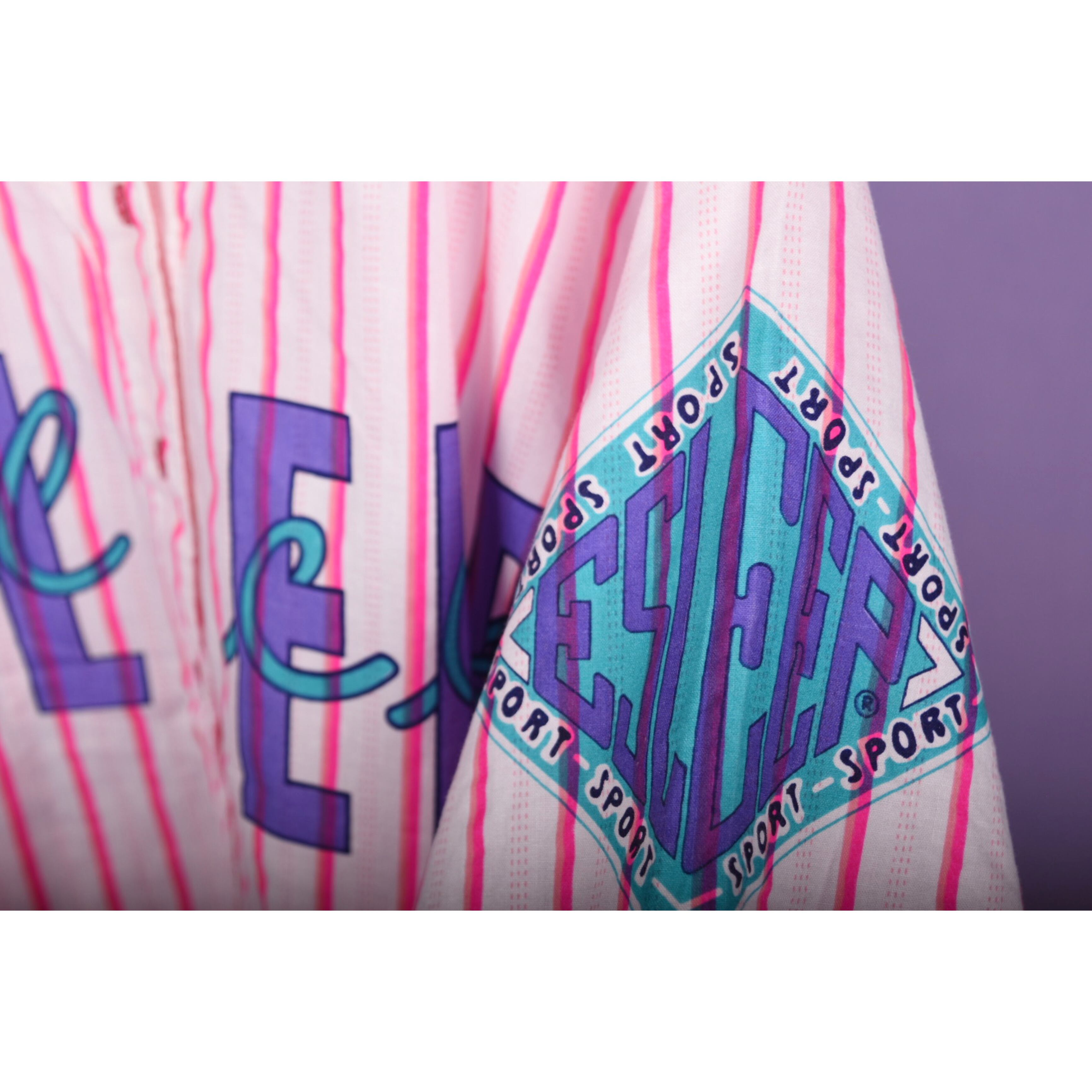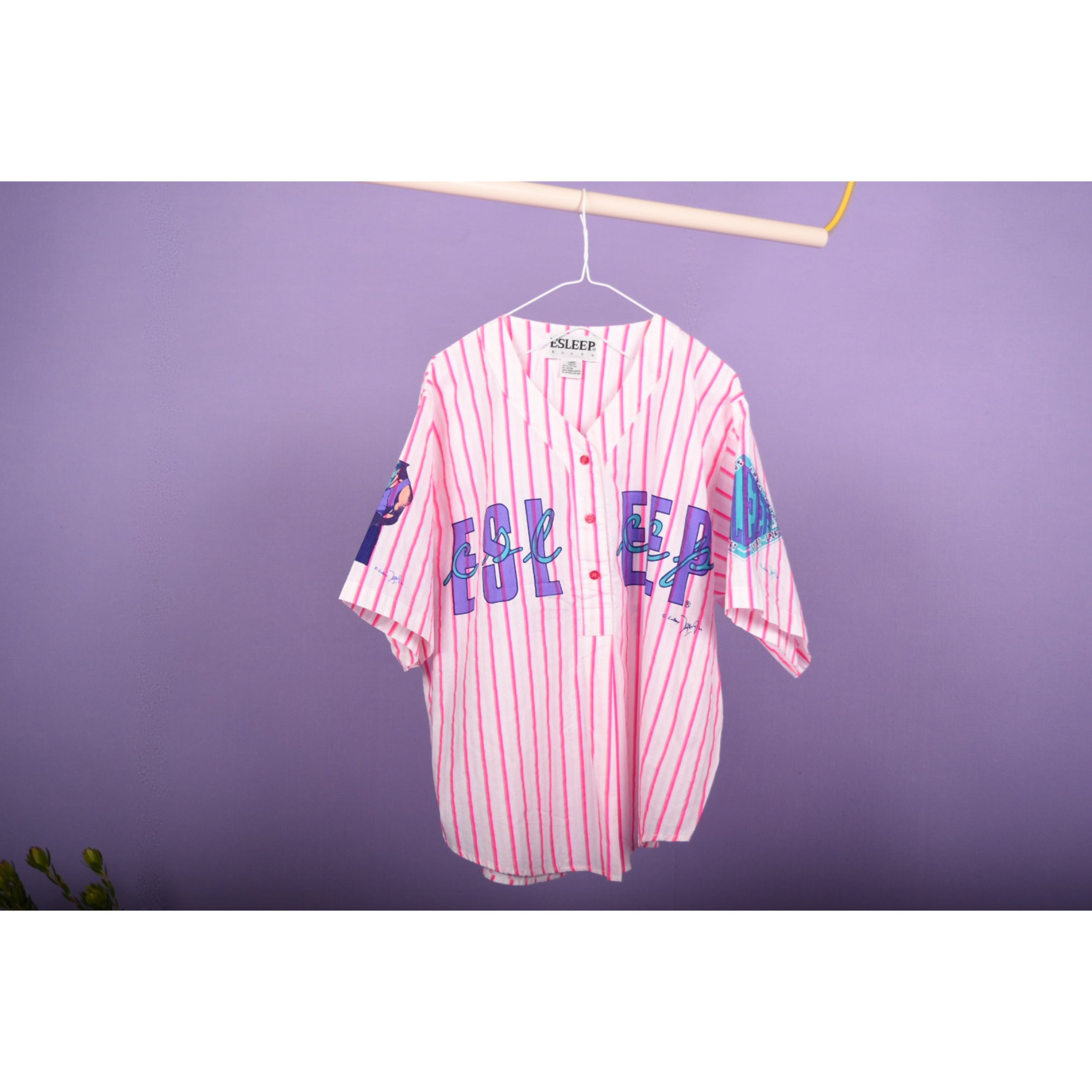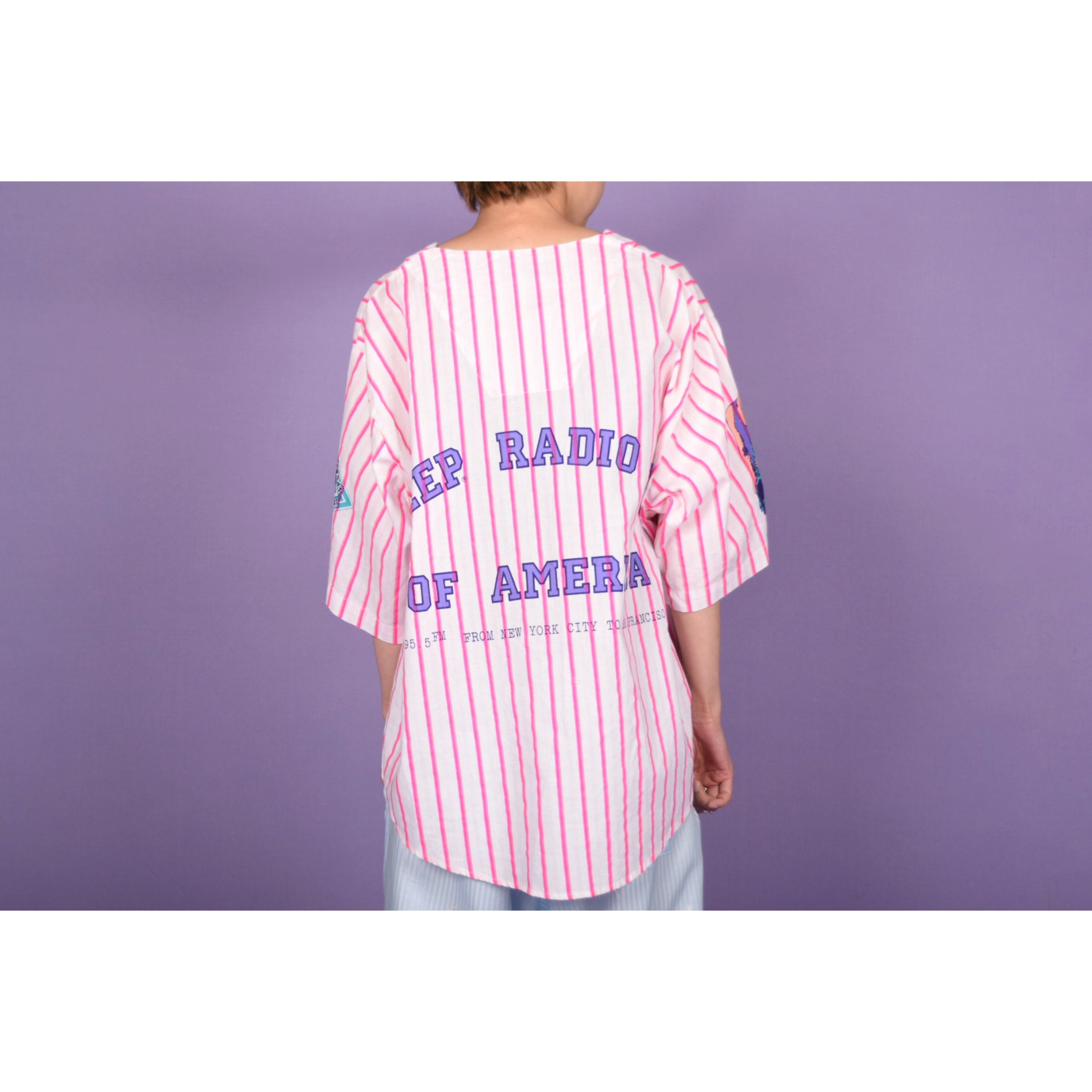 90年代らしい可愛さが詰まったベースボールシャツです。プリントの配色バランスが抜群です!オリジナルのピンククリアーのボタンもすごく可愛いです。