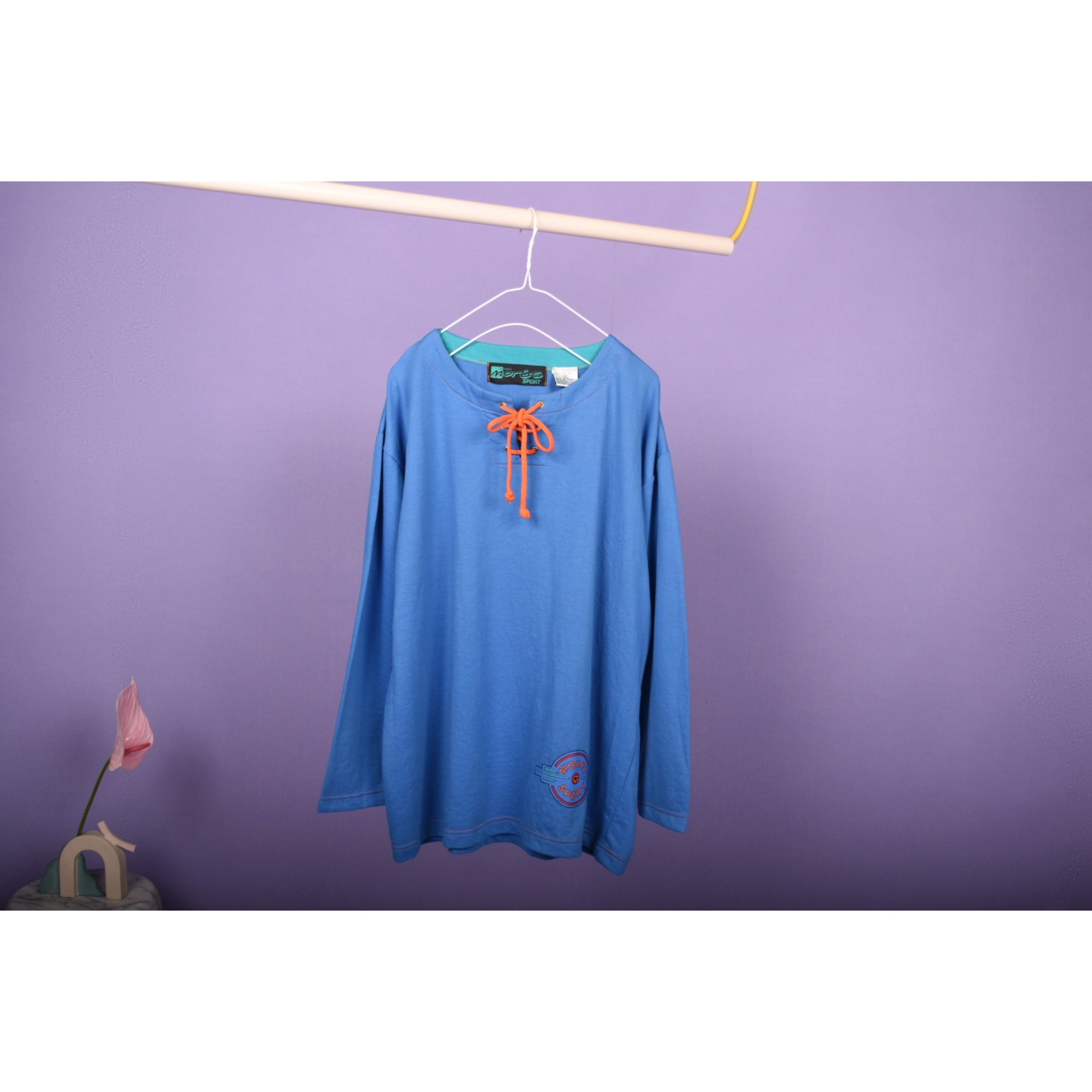 首元がレースアップ仕様になったロングスリーブTeeです。オレンジの太紐がアクセントに。袖口付近が色が切り替えられているのもめちゃ可愛いポイントです。程よく肉感がありソフトな着心地です。男女ともにおすすめです!