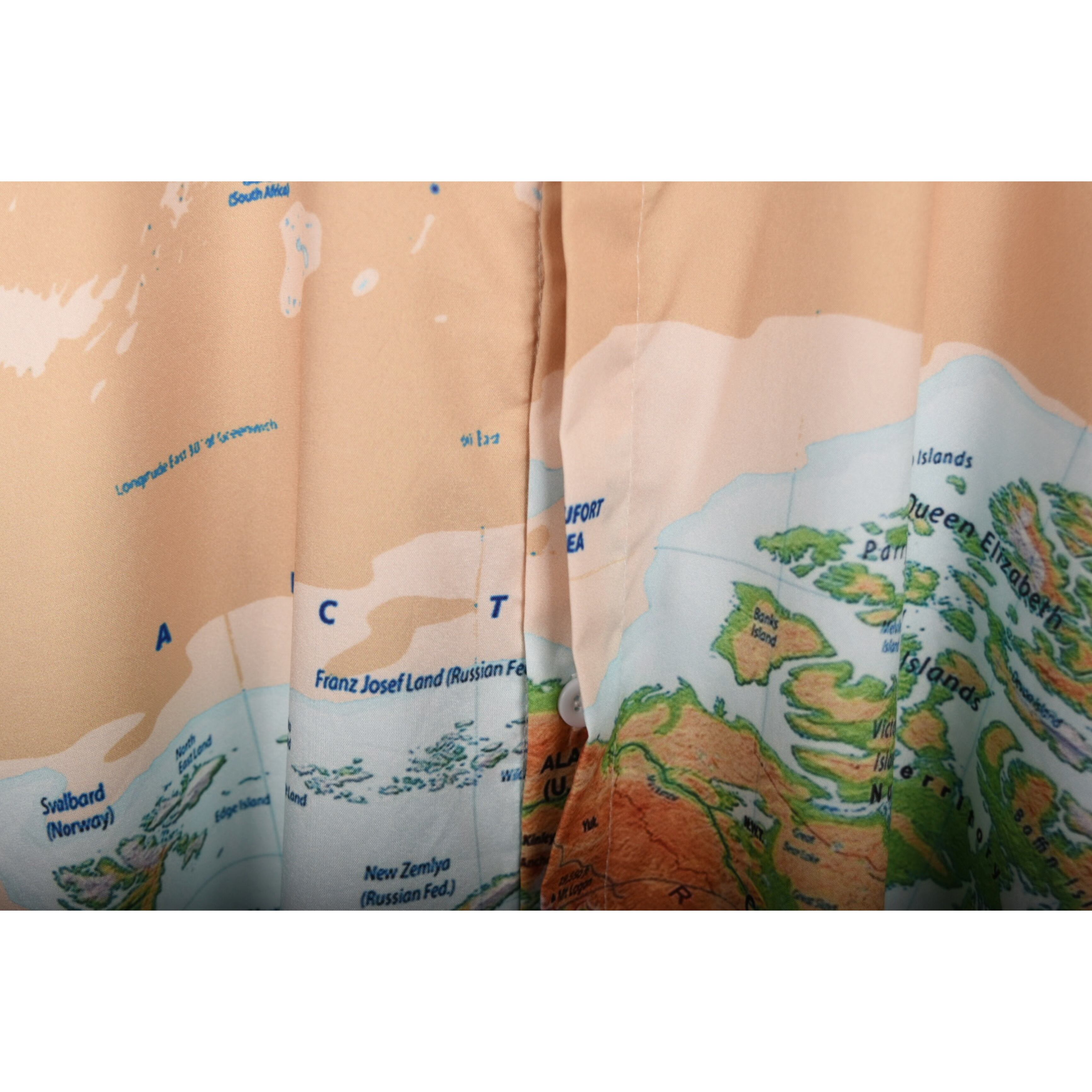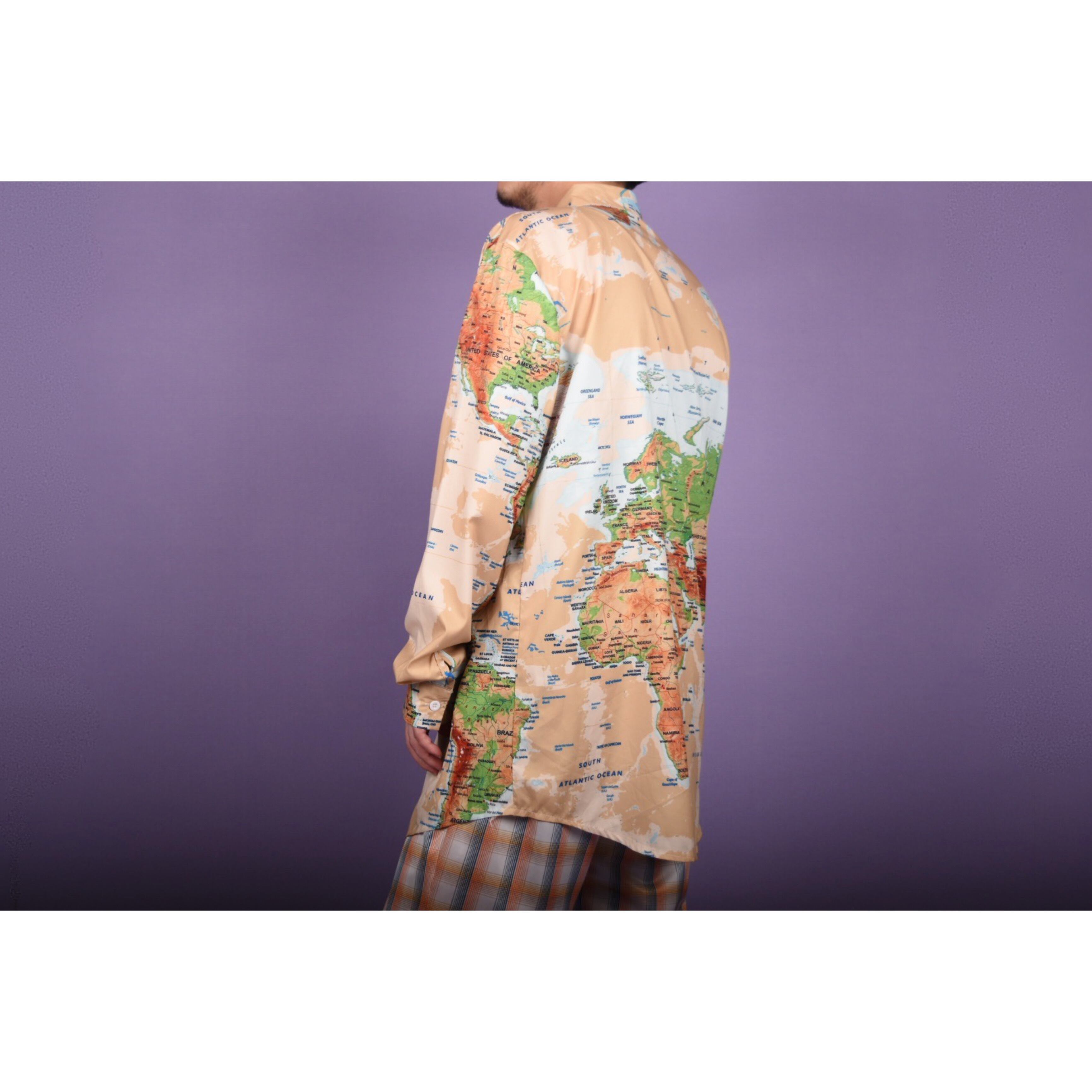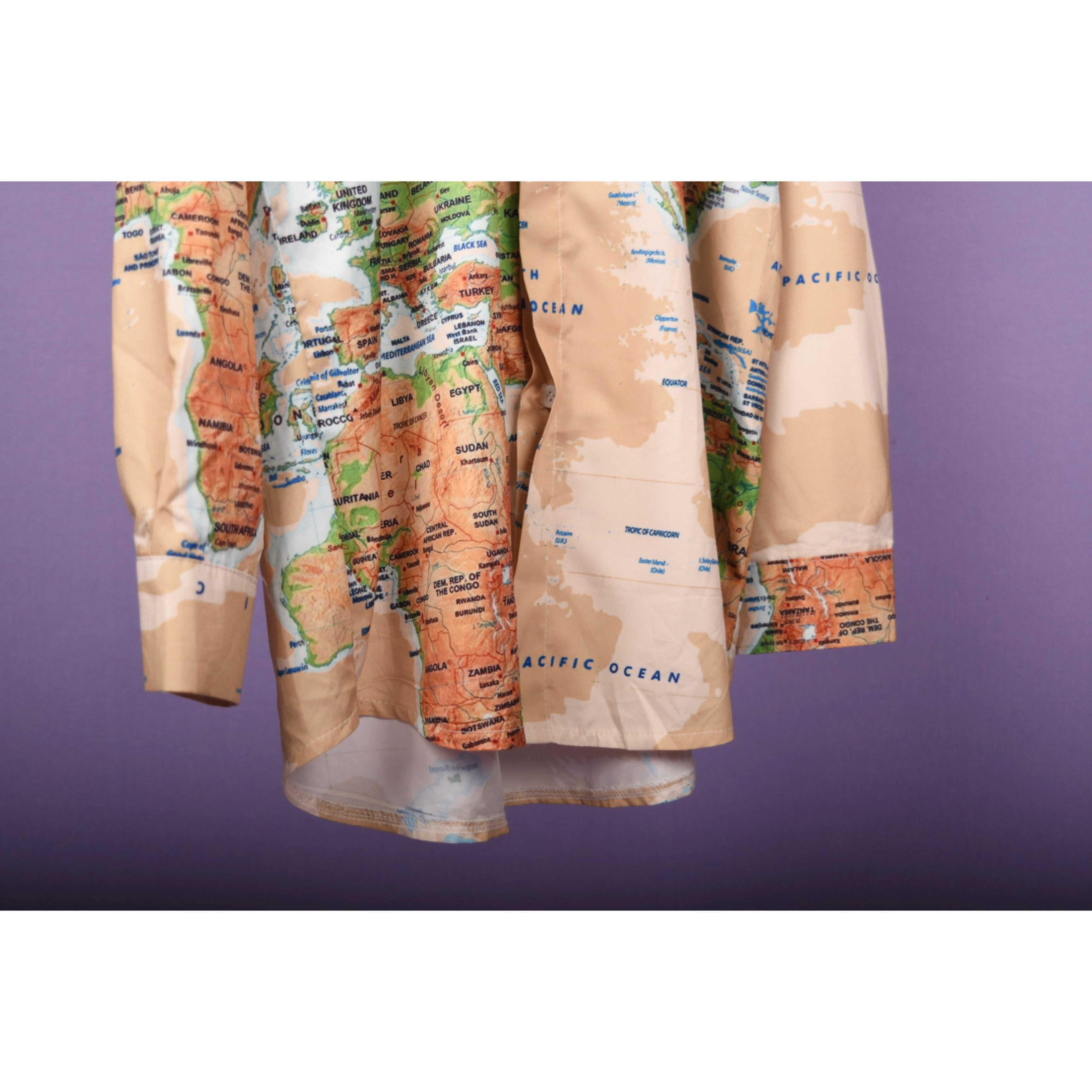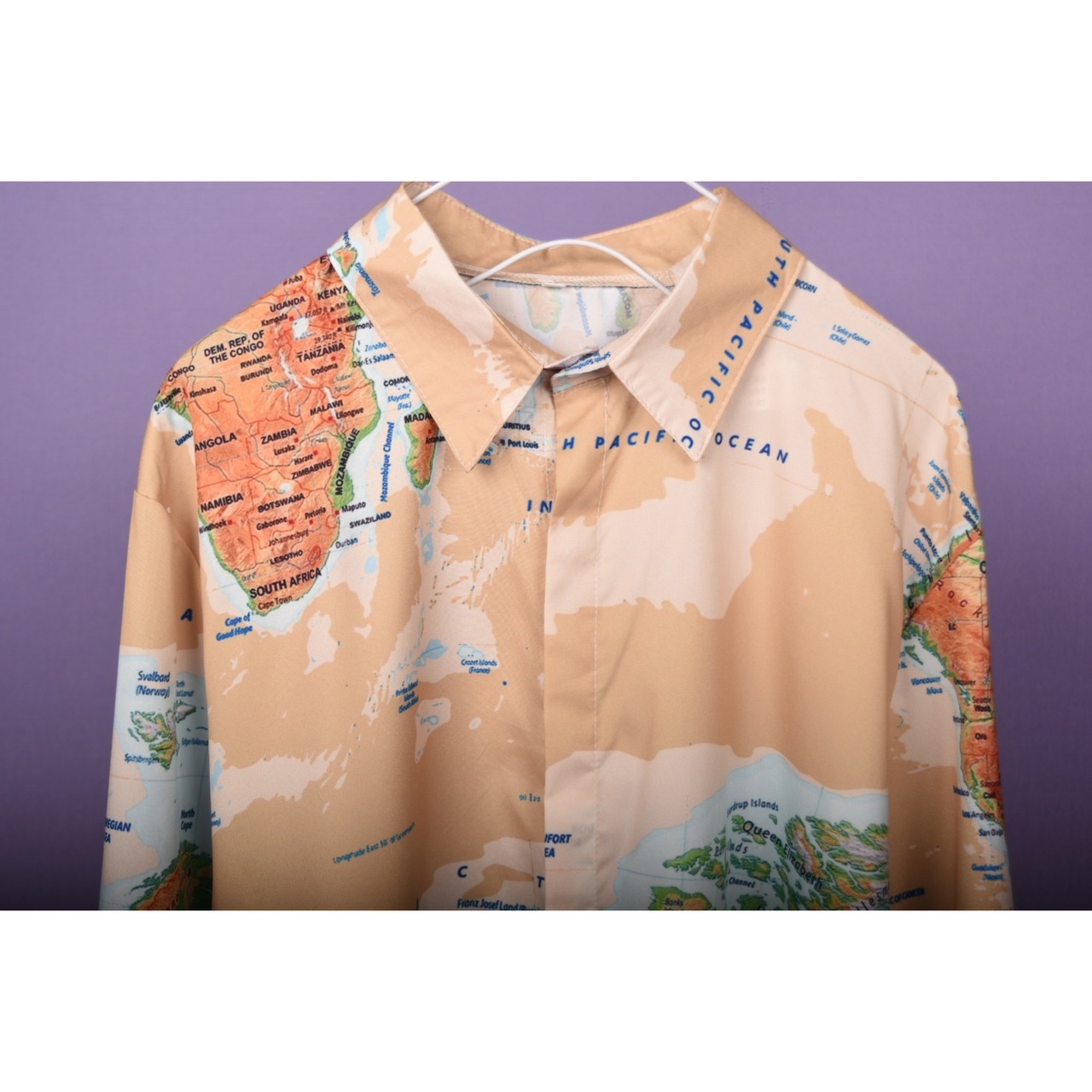 世界地図がプリントされたロング丈のシャツです。やや小さめの襟、比翼仕様、少しタイトめなシルエットです。ベージュベースにブルーの文字がとてもお洒落な配色。美しいシャツです。これは男女問わずオススメです。