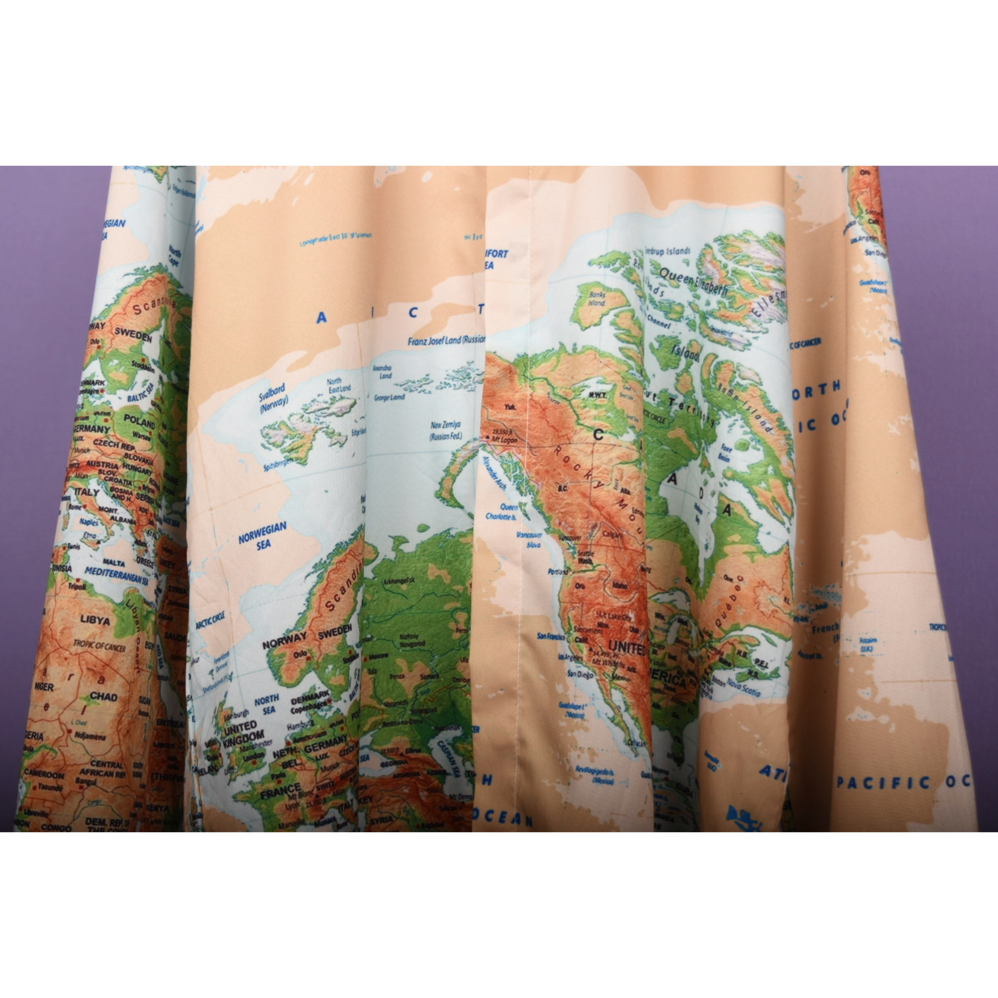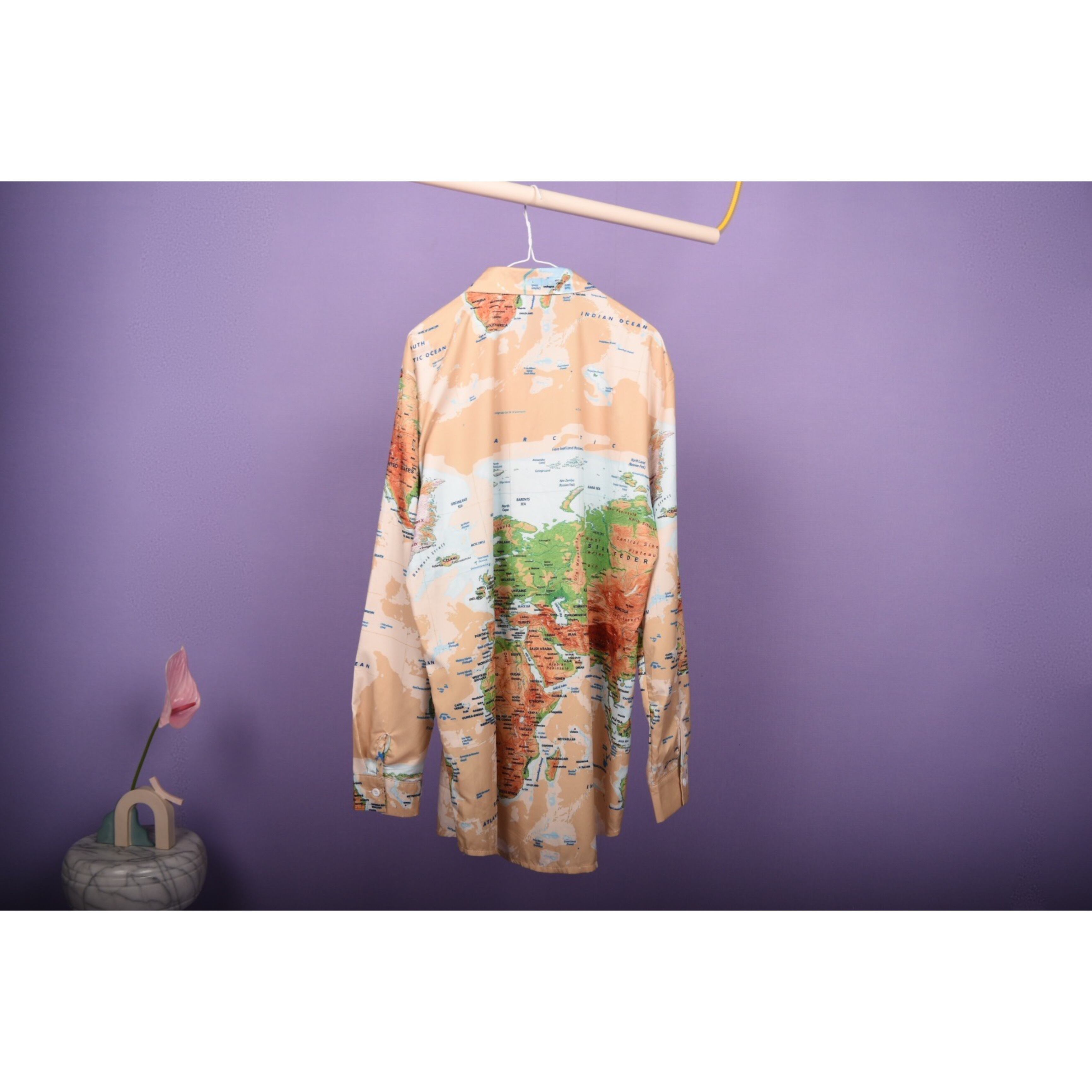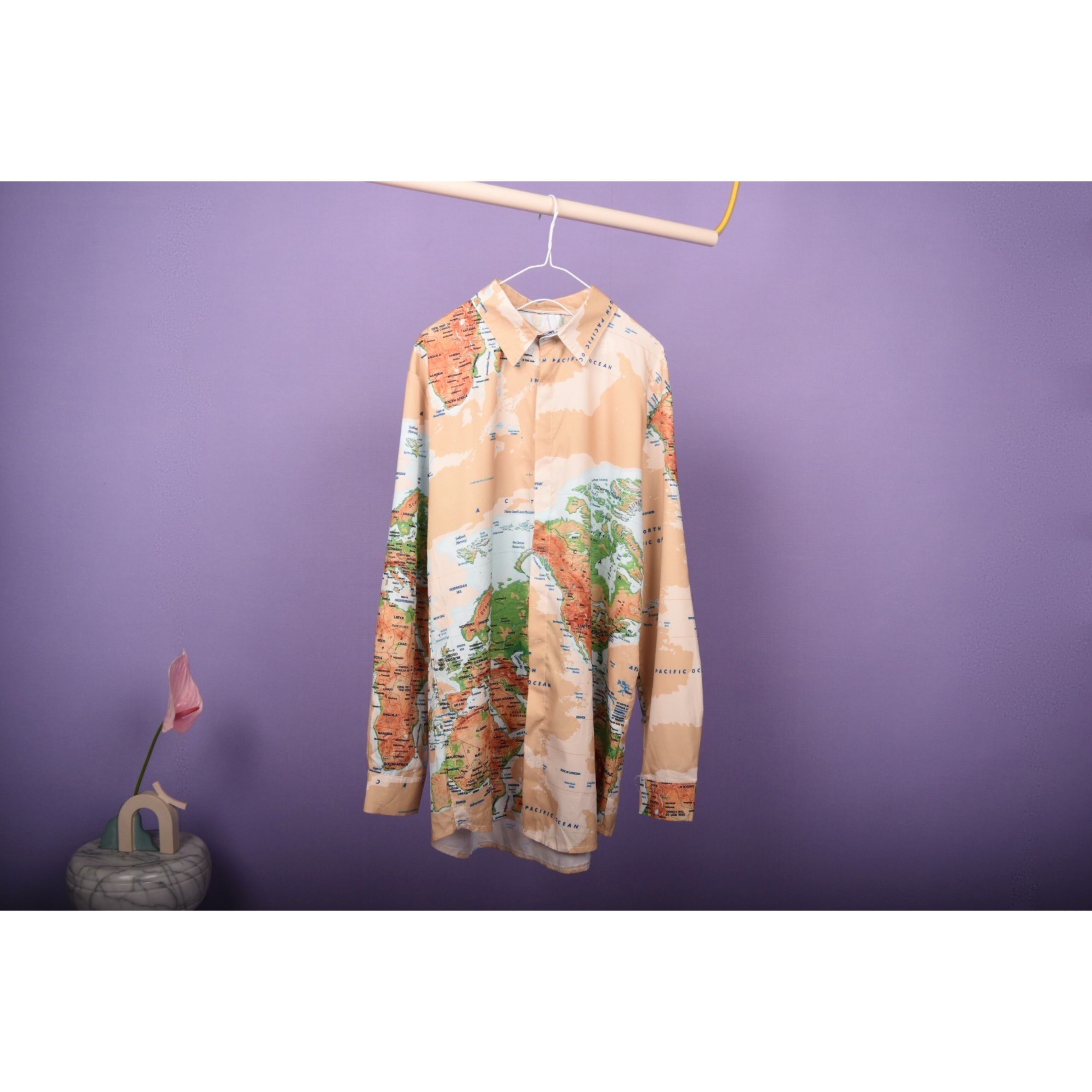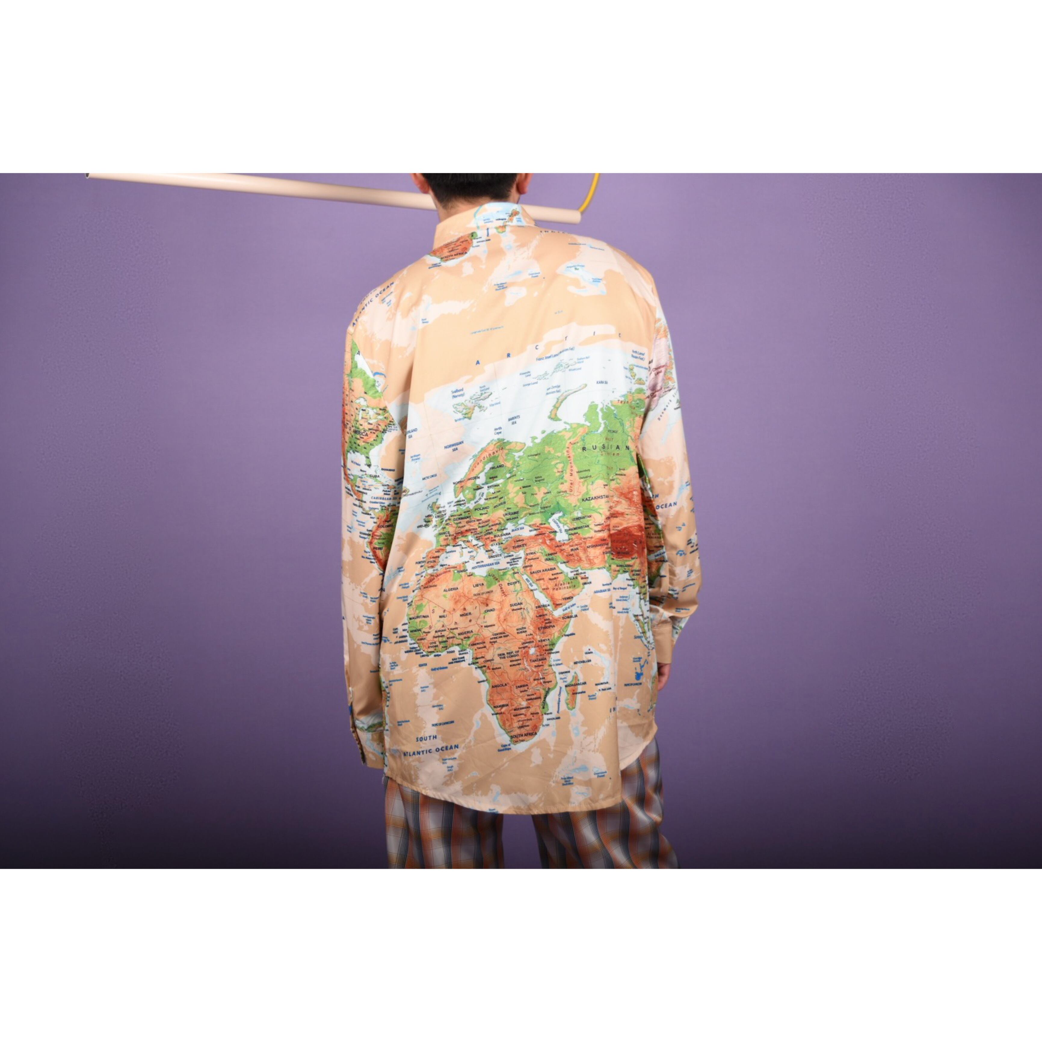 世界地図がプリントされたロング丈のシャツです。やや小さめの襟、比翼仕様、少しタイトめなシルエットです。ベージュベースにブルーの文字がとてもお洒落な配色。美しいシャツです。これは男女問わずオススメです。