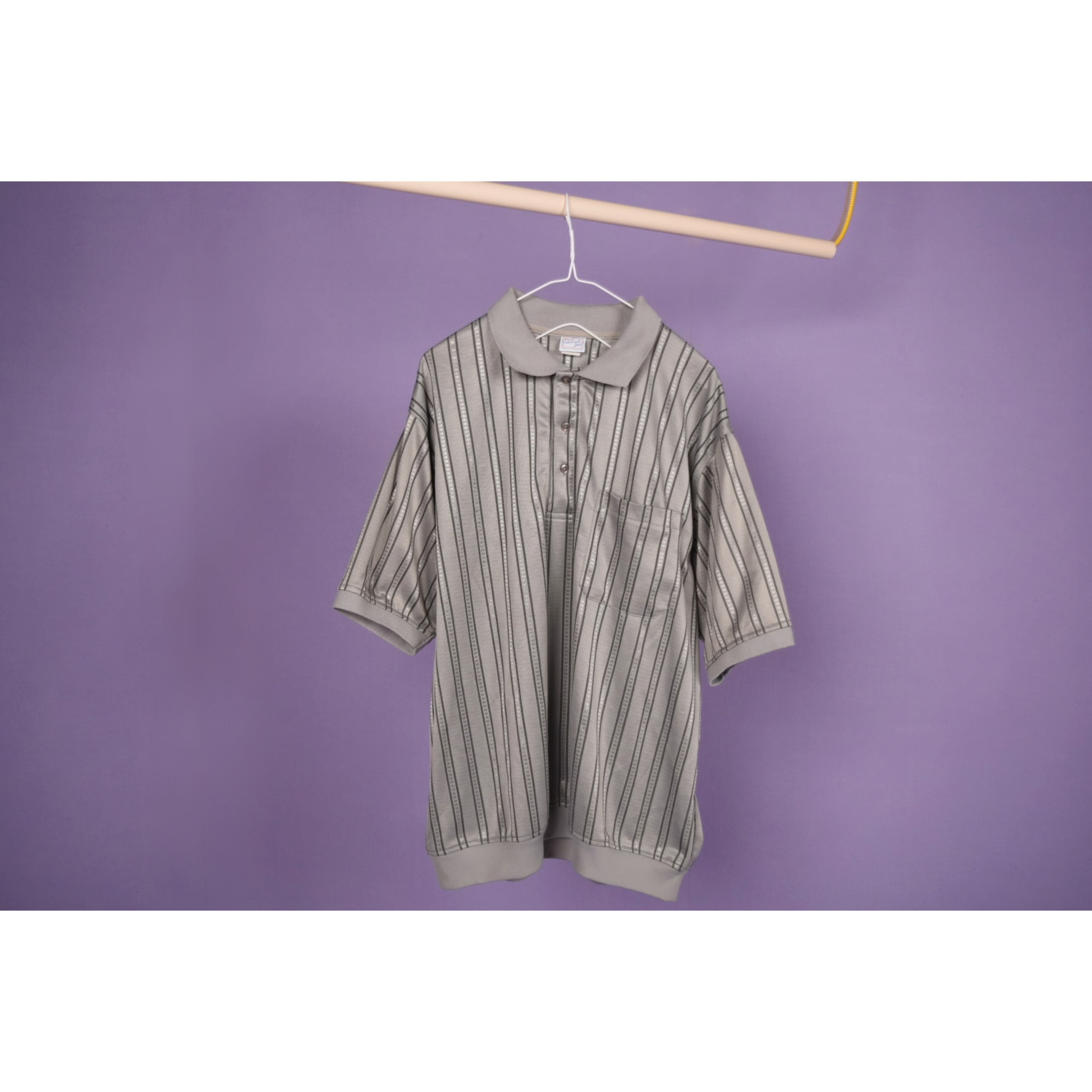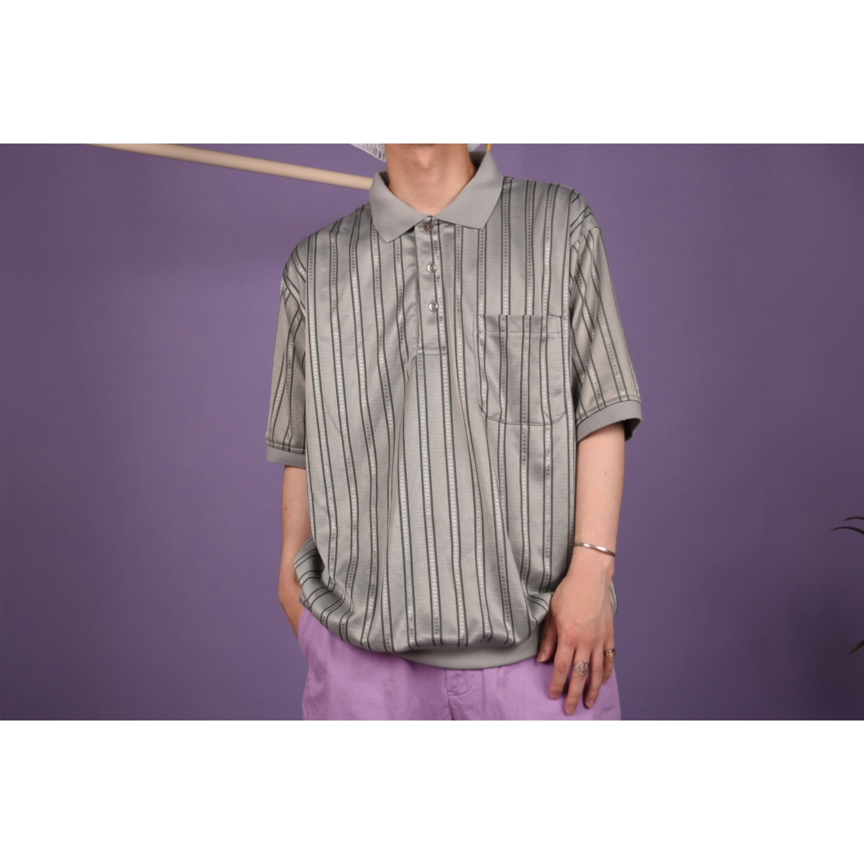 シルバーのストライプが美しい半袖ニットポロシャツです。ゆるっとしていて着心地が良いです。綺麗めで大人の雰囲気ですが、あえてカジュアルに着崩して欲しい一着です。