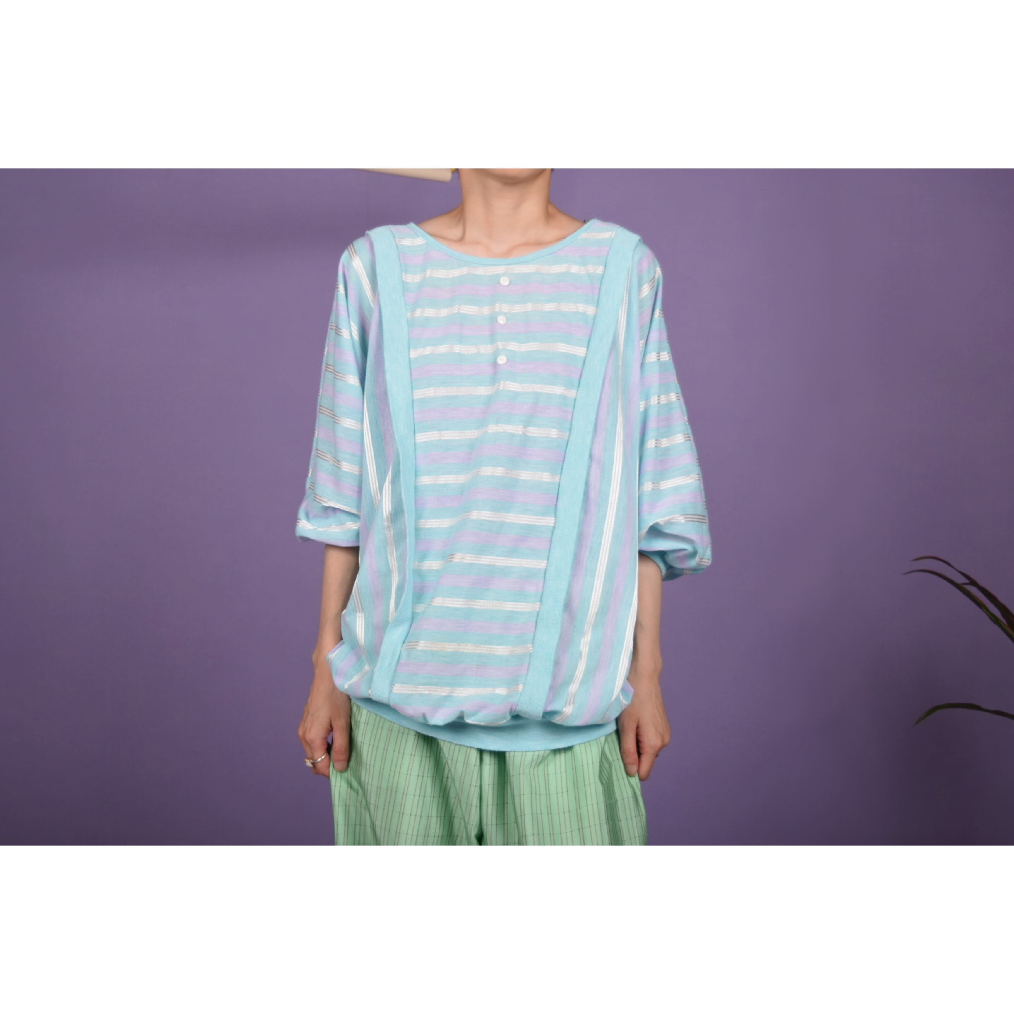 ラグランスリーブのゆったりとしたトップスです。80年代によく見られるフロントの切り替えデザインが可愛いです。さわやかなカラーでこの時期にピッタリな一着です。USA製。