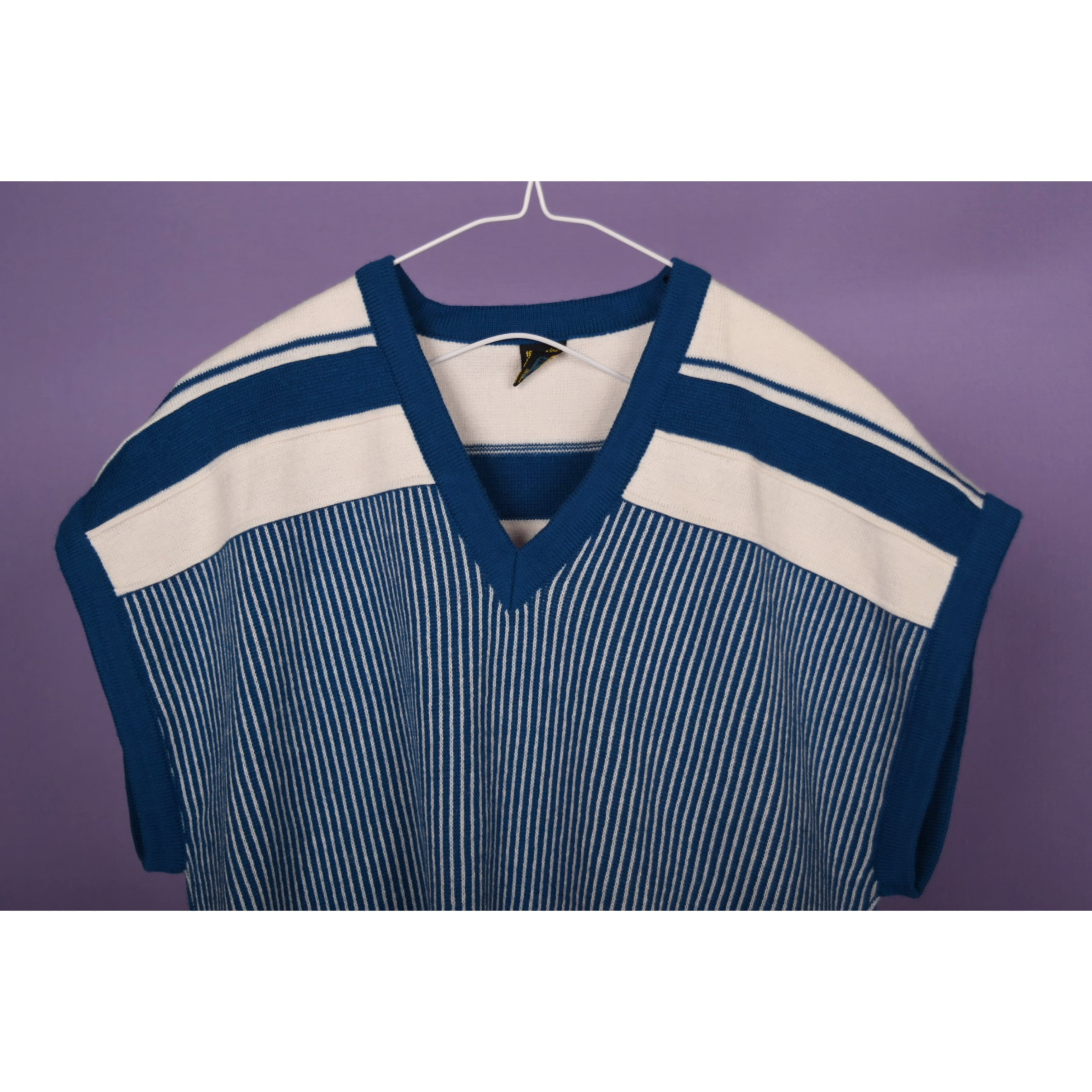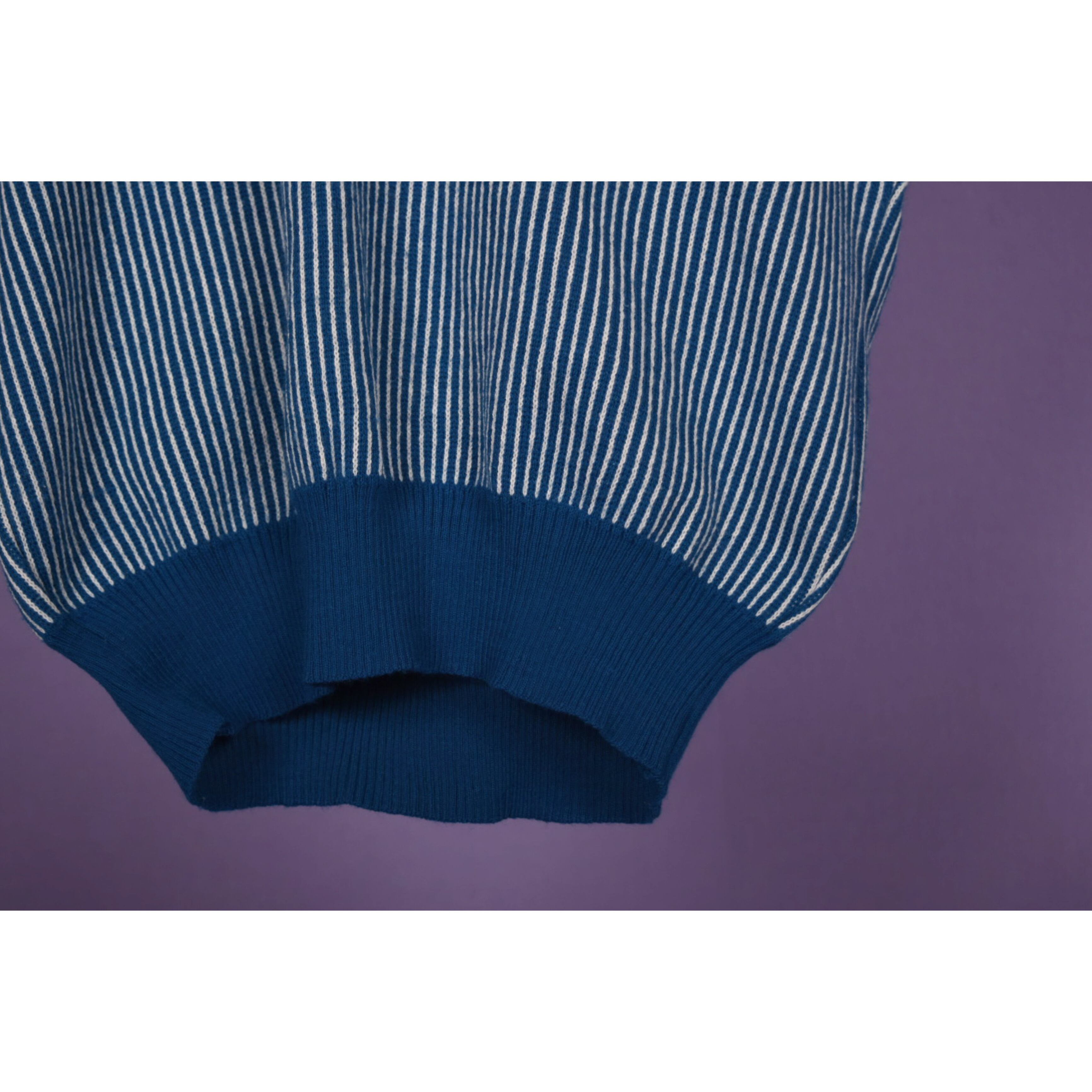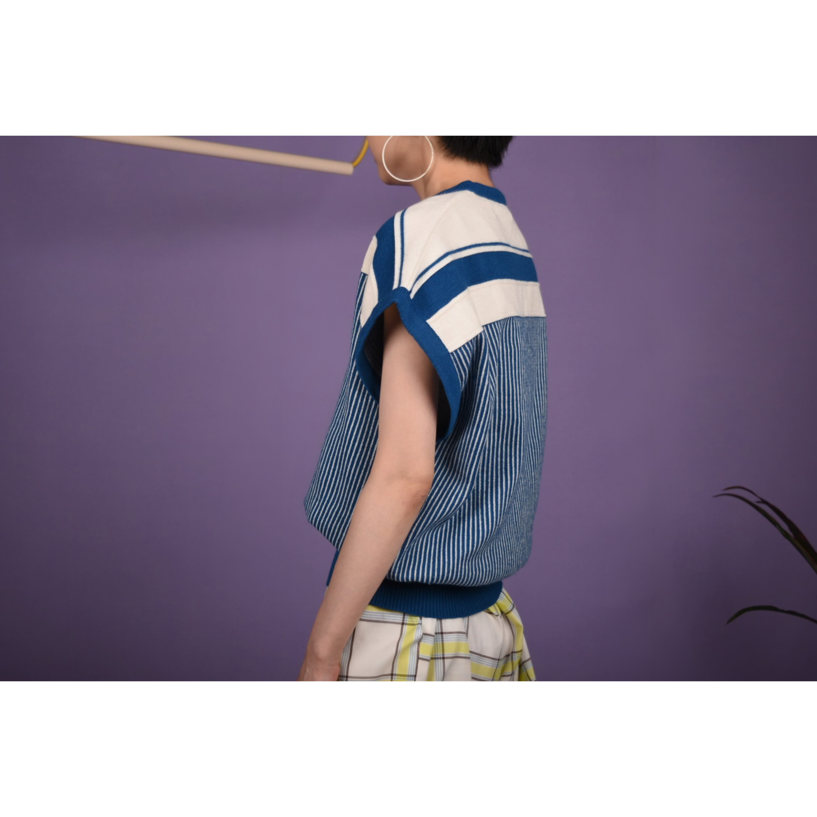 ニットのショートスリーブトップスです。青と白の配色が可愛いです。ショート丈でパンツ、ロングスカートなどバランスよくコーディネートできます。