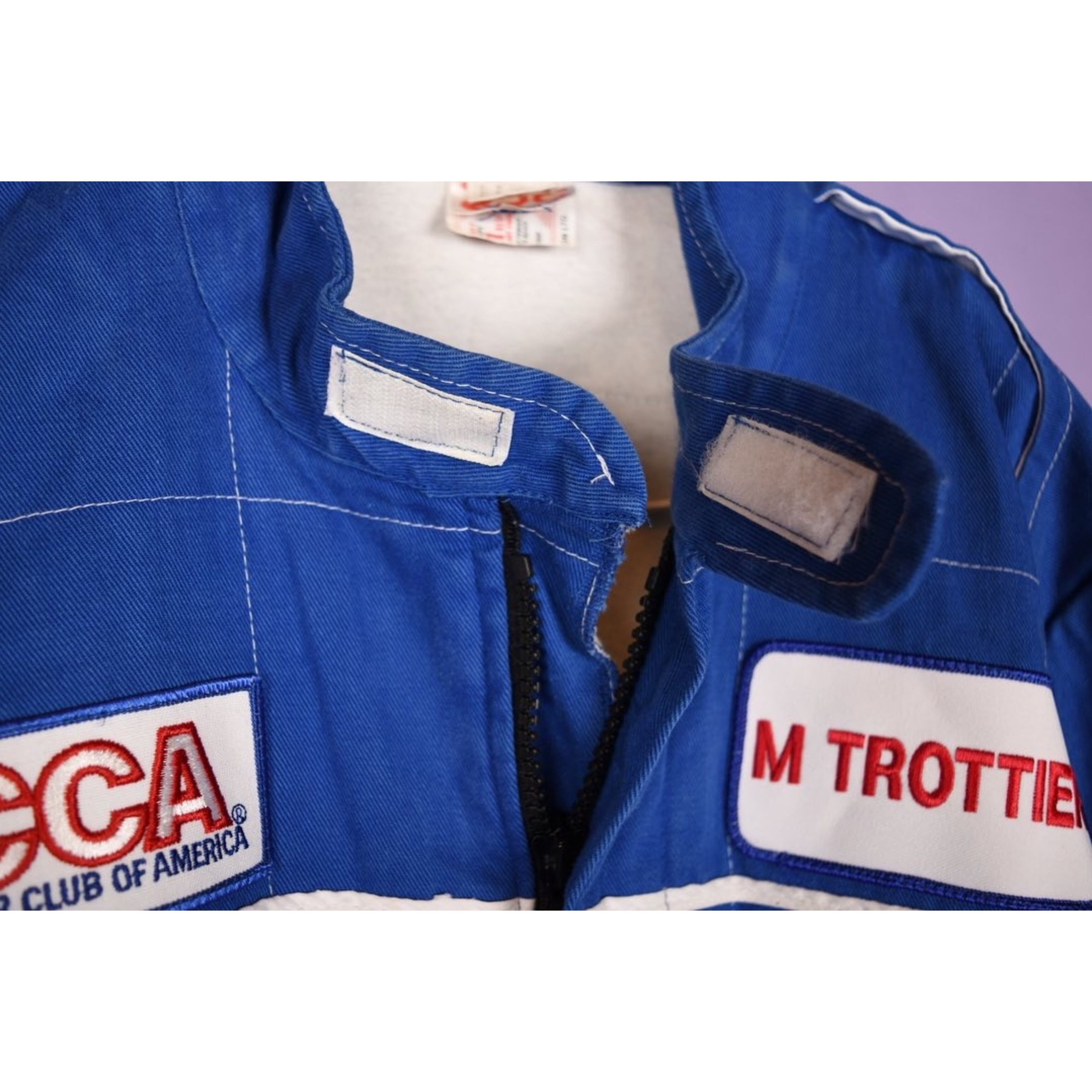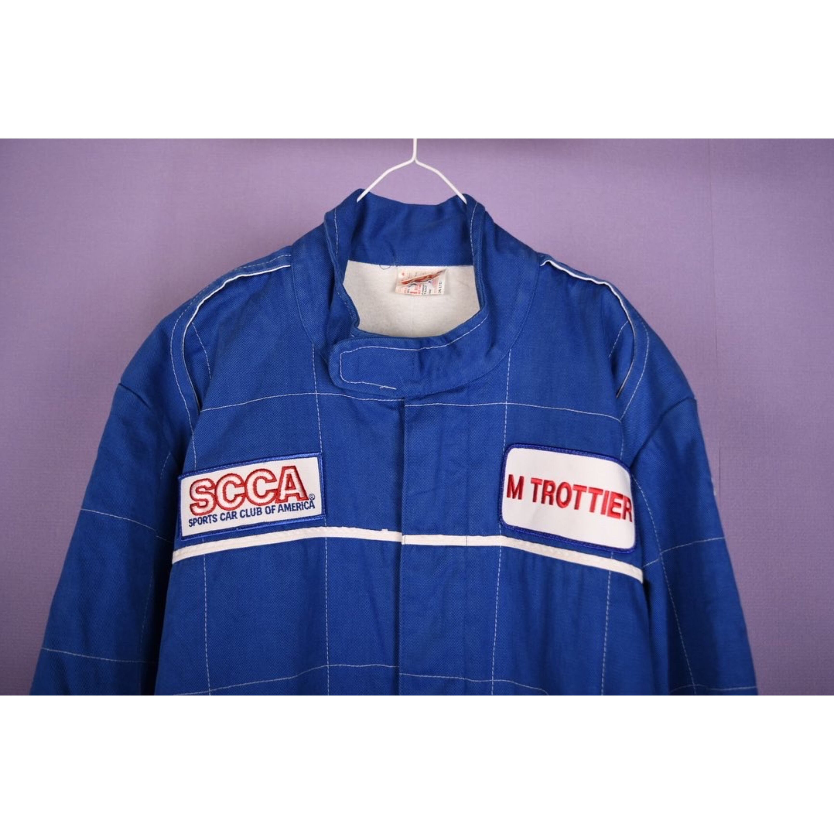 90年代イングランド製のレーシング用ツナギです。スタンドカラーです。テキスタイルの可愛さ、ディテール、全てにおいて秀逸です。これはお洒落。ユニセックスでおすすめです。袖口に油汚れがあったので、リブ交換しております。