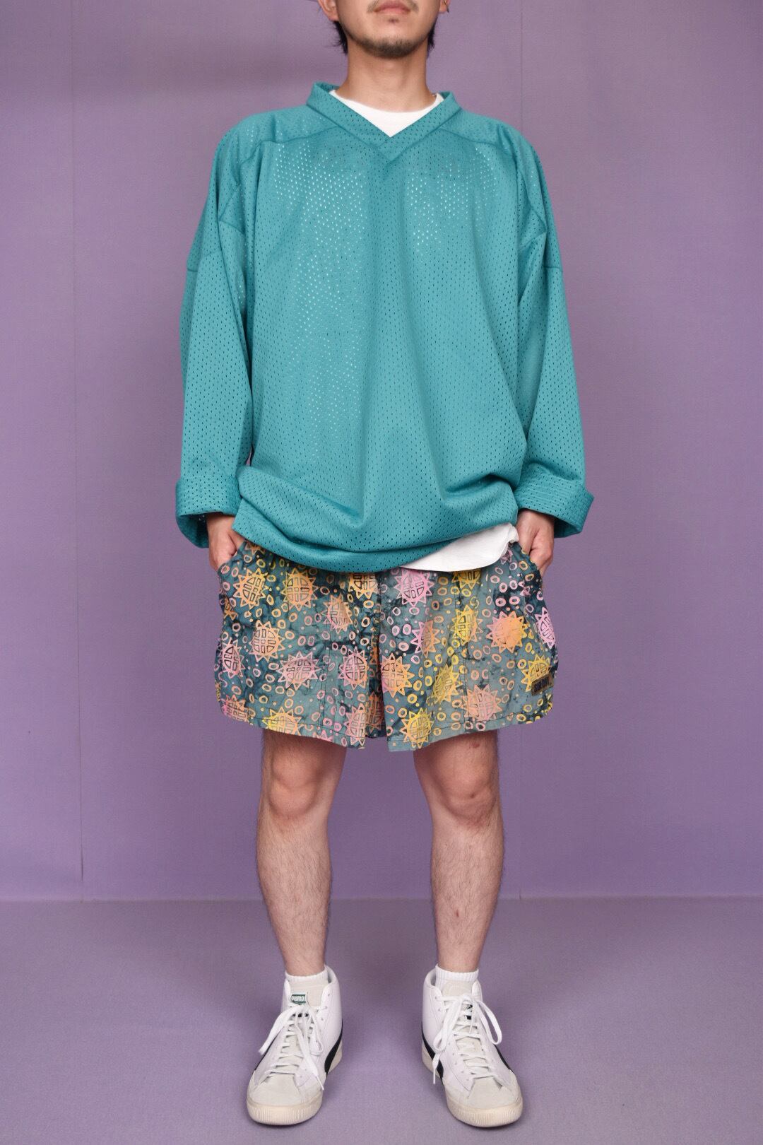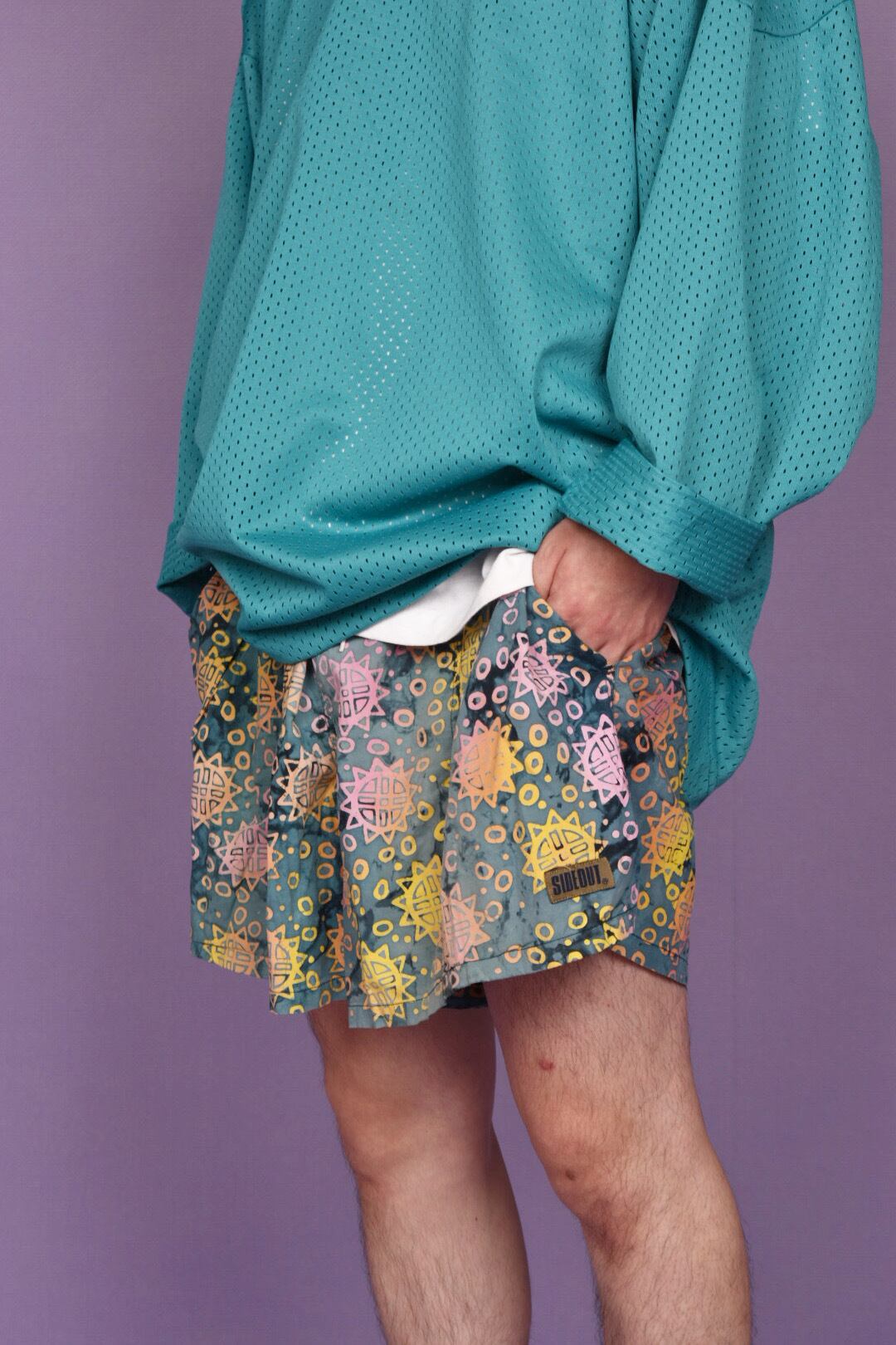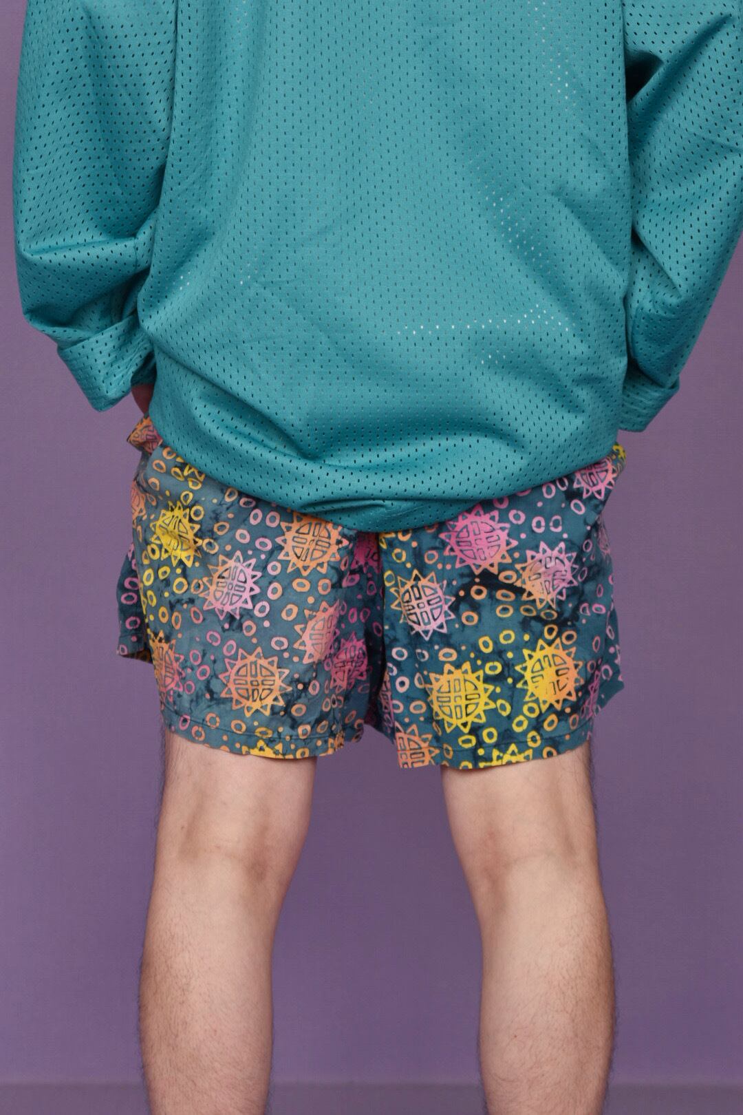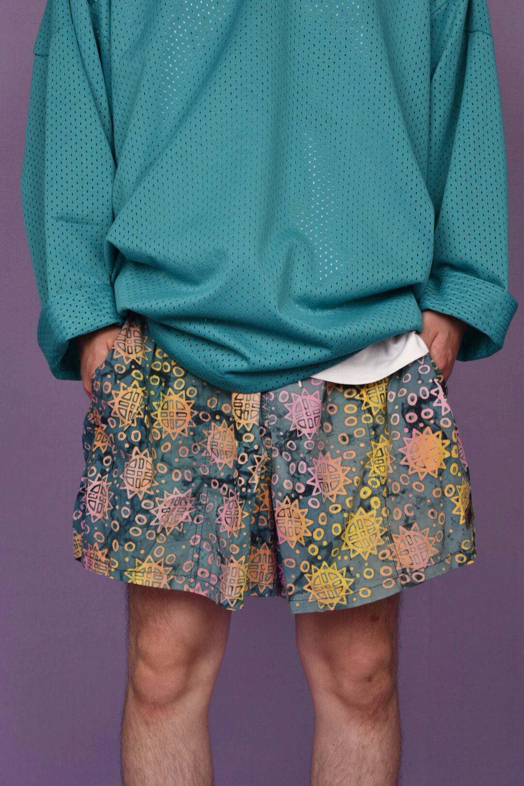 タイダイ柄のボディに鮮やかなヒマワリのようなカラフルなプリントが全体に入ったスイムショーツです。カラーセンス抜群で、幅のあるパターンメイキングも秀逸。両サイドにポケット有、ユニセックスで着用可能です。