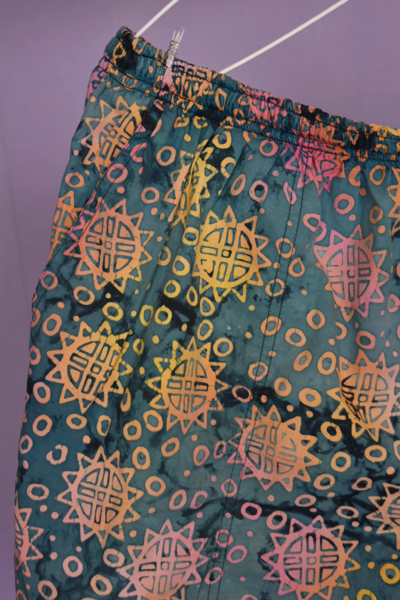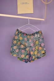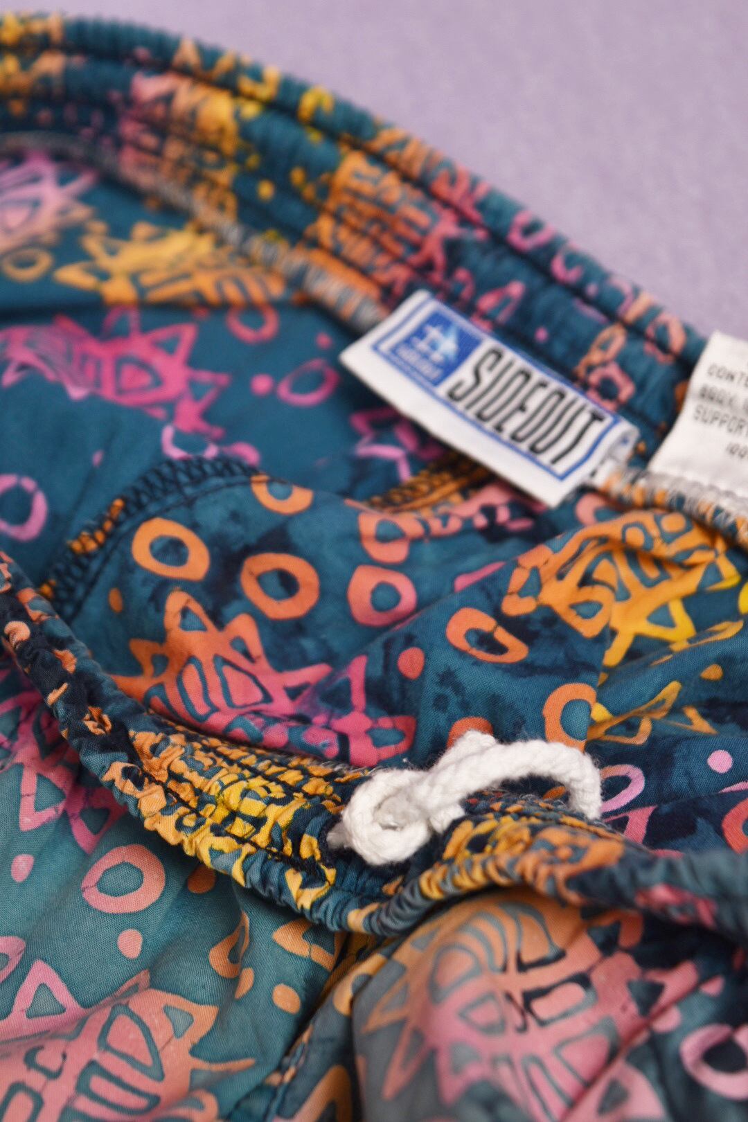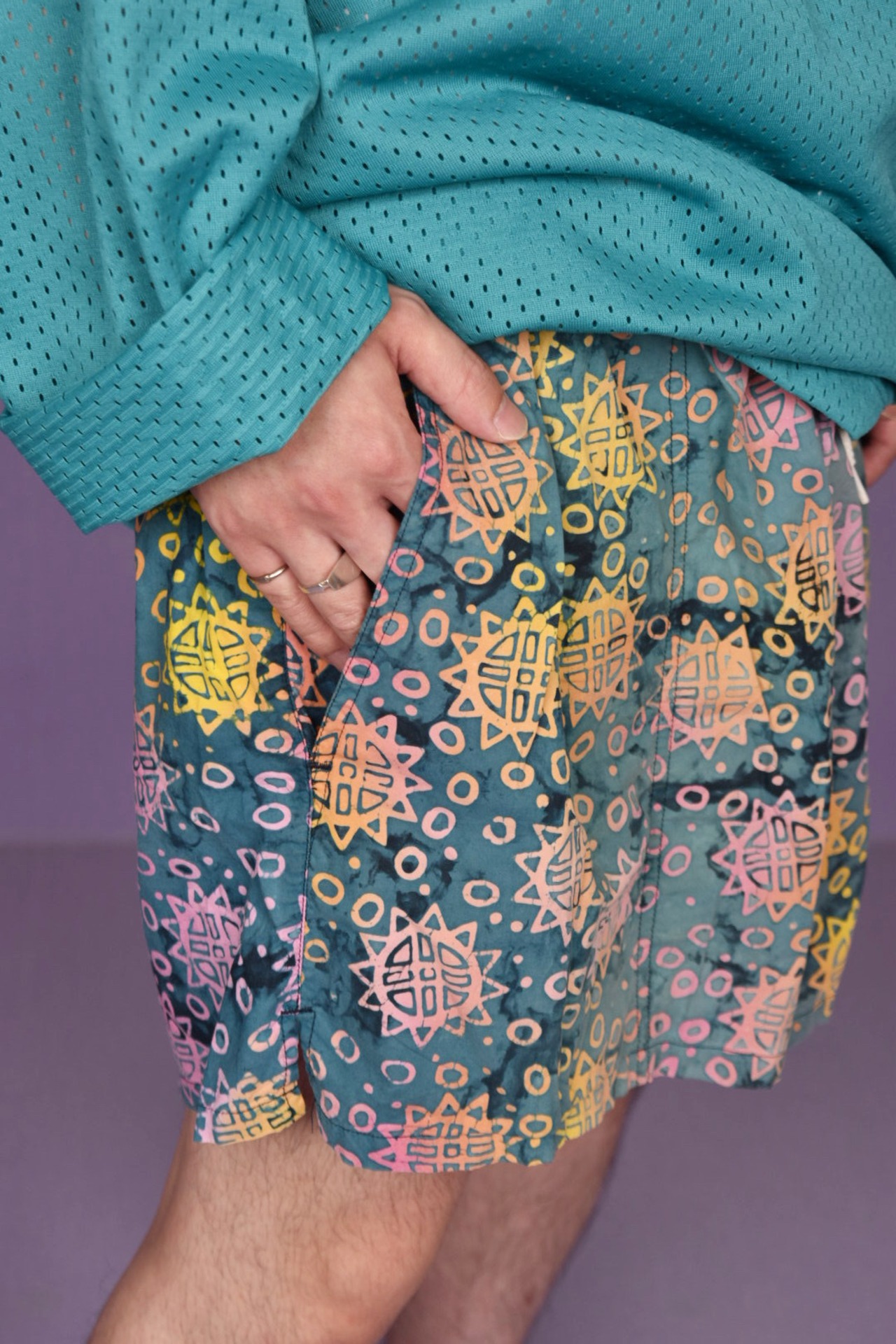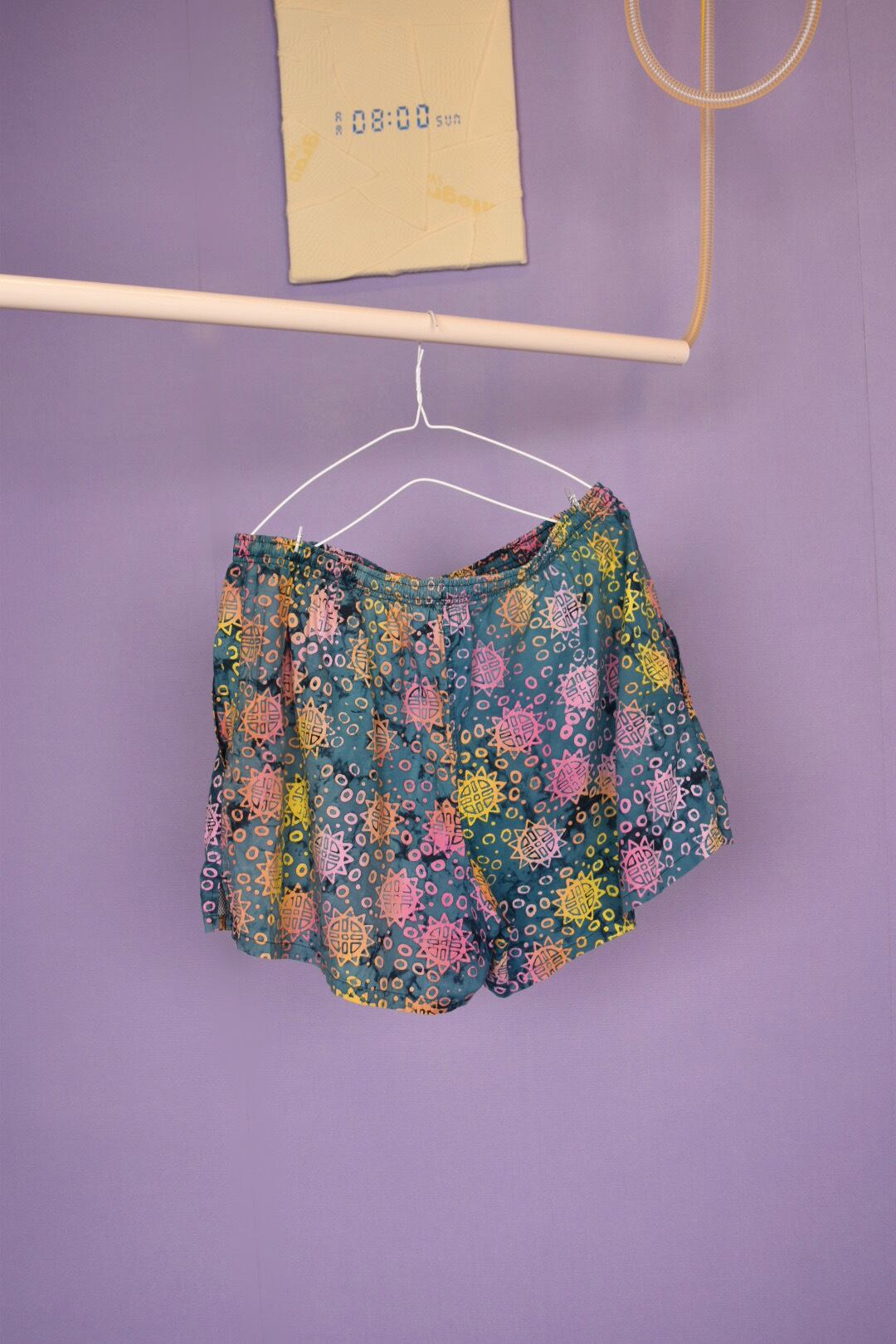 タイダイ柄のボディに鮮やかなヒマワリのようなカラフルなプリントが全体に入ったスイムショーツです。カラーセンス抜群で、幅のあるパターンメイキングも秀逸。両サイドにポケット有、ユニセックスで着用可能です。