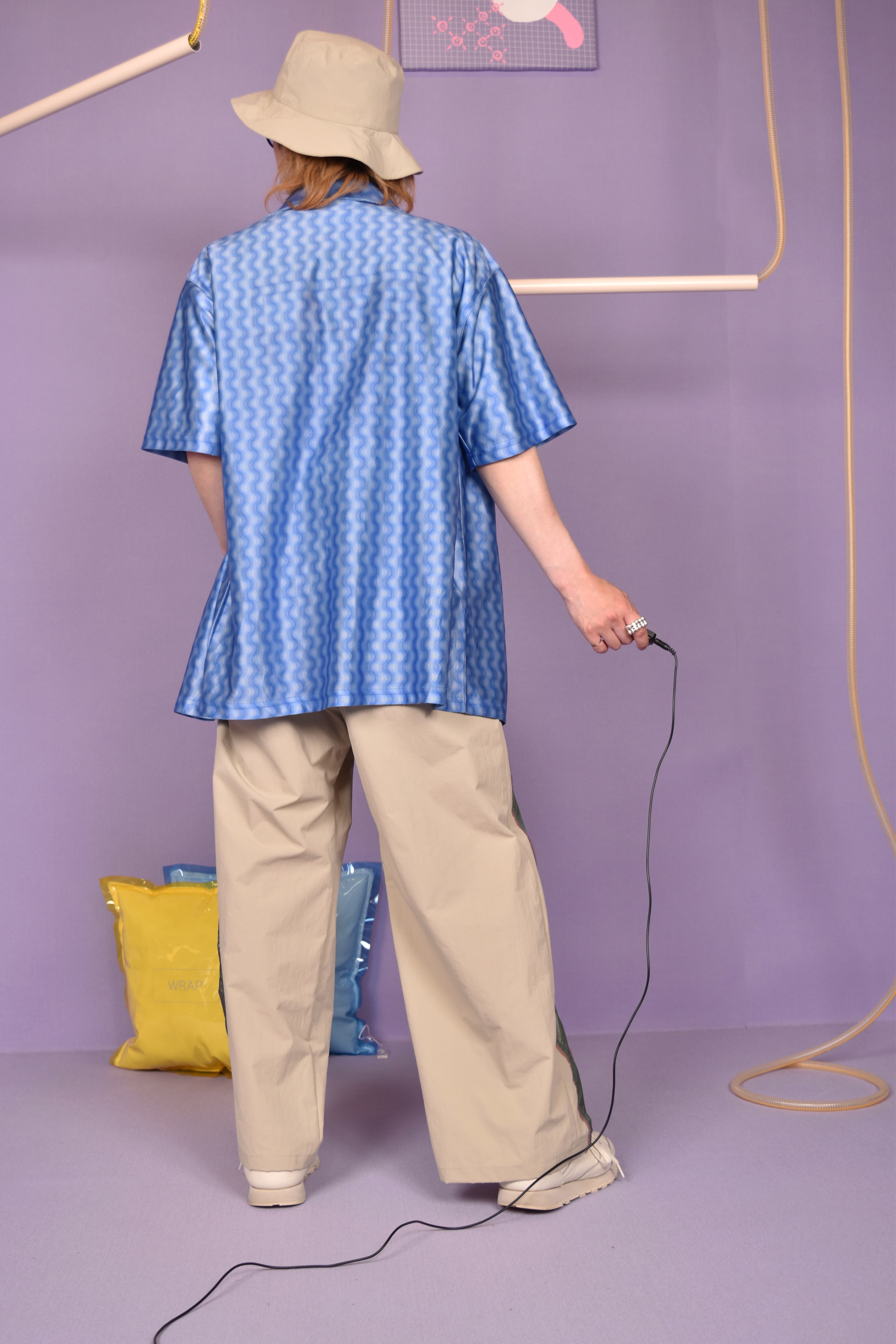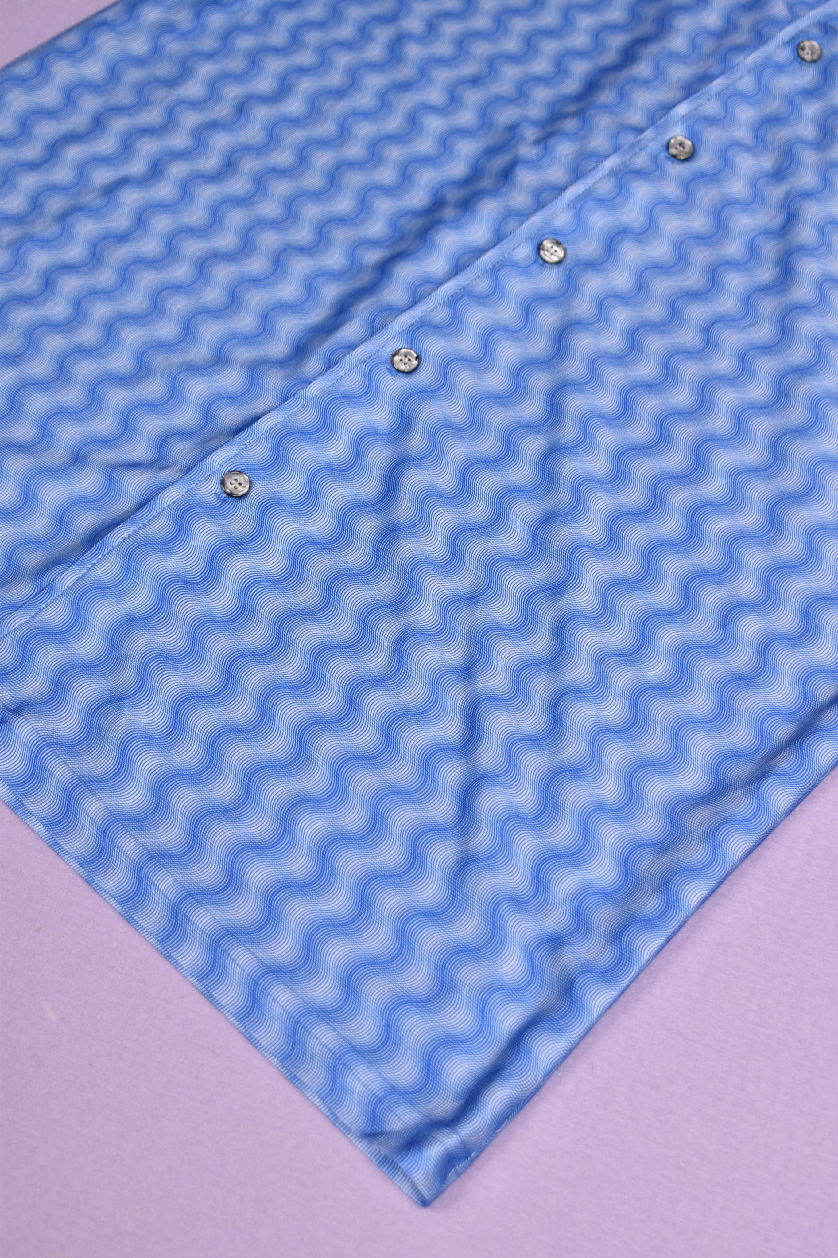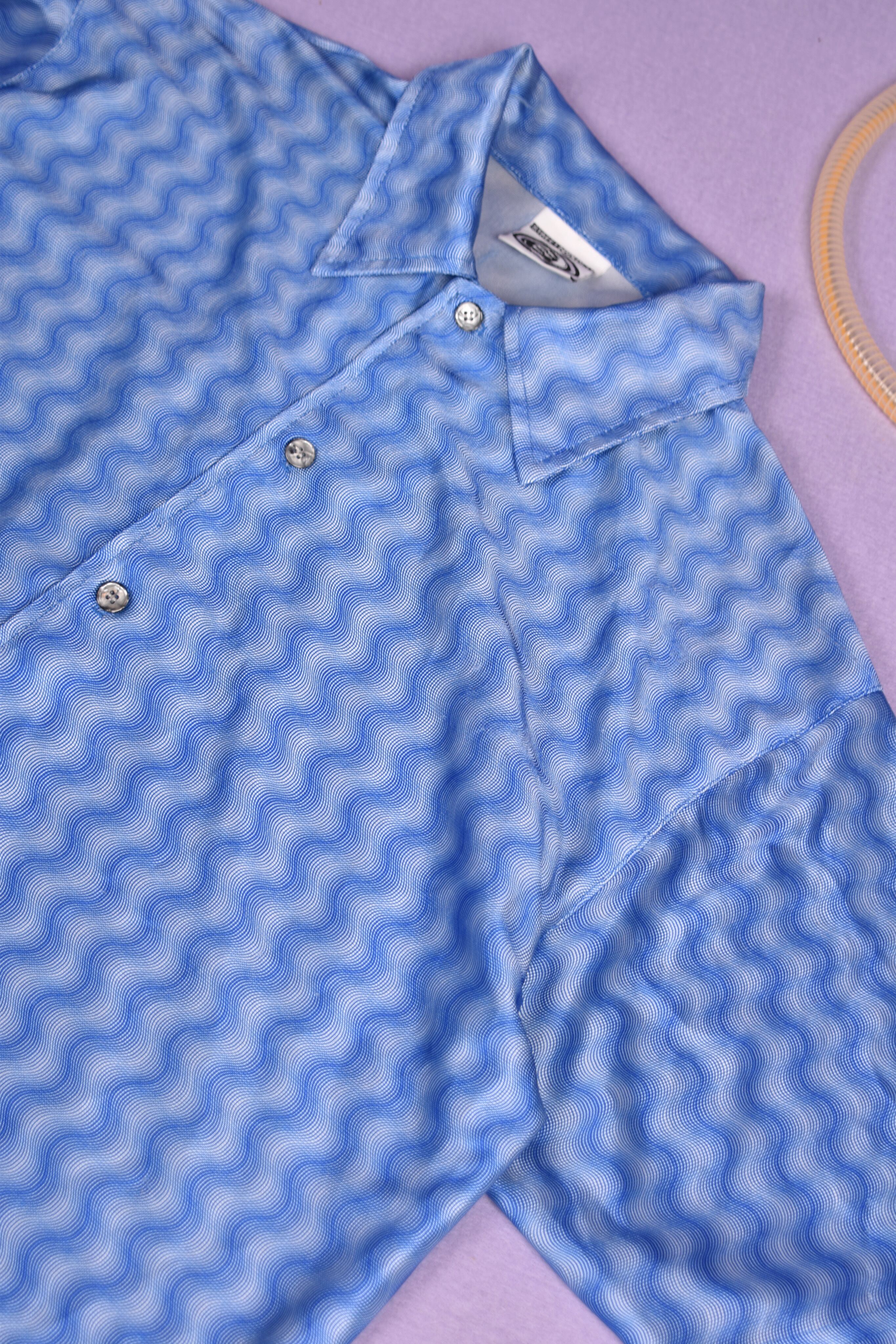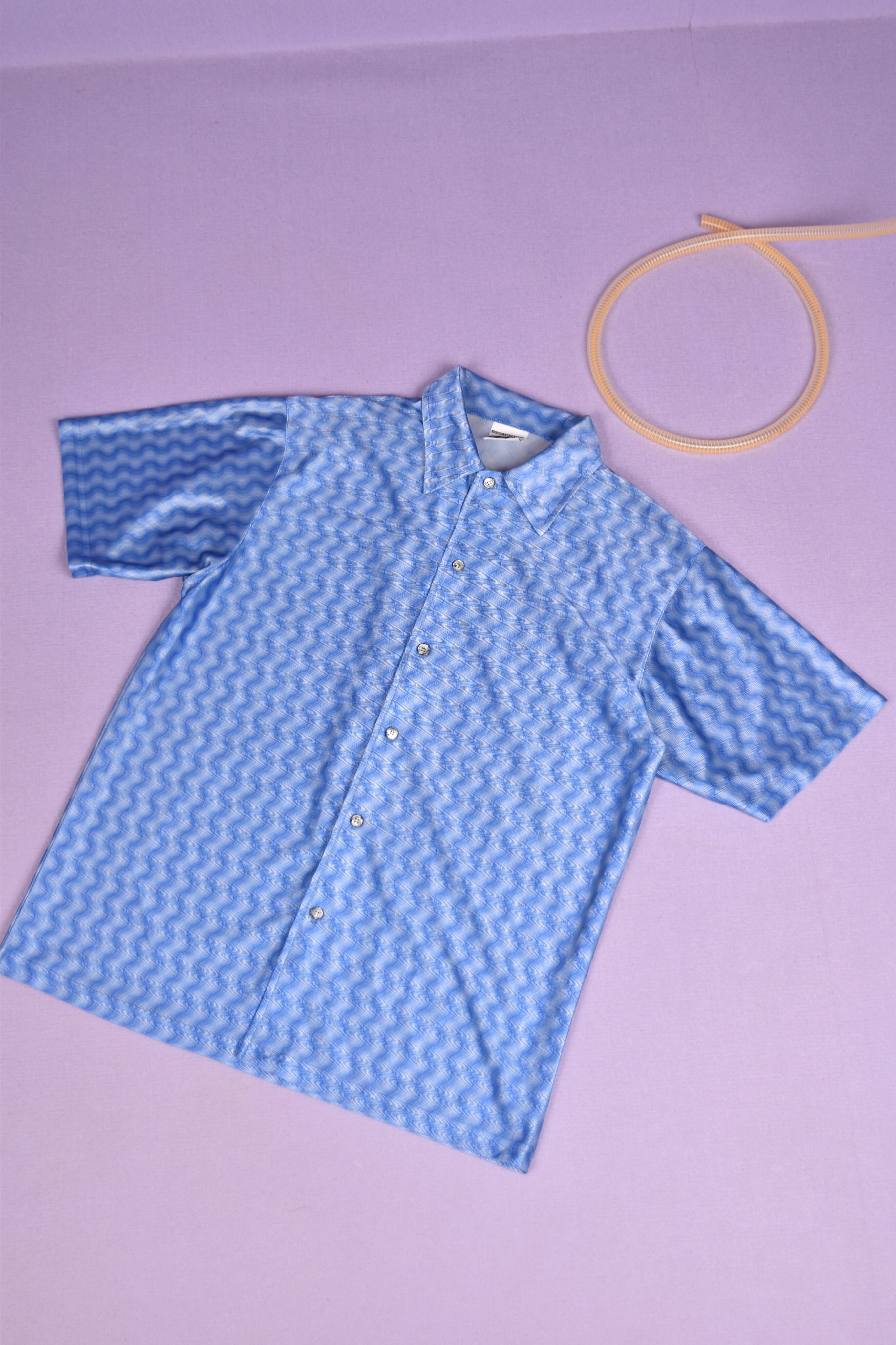 光沢感のあるウェーブ総柄のユニークな開襟シャツです。伸縮性のある生地で着心地も良いです。シワになりにくいのもポイントです。