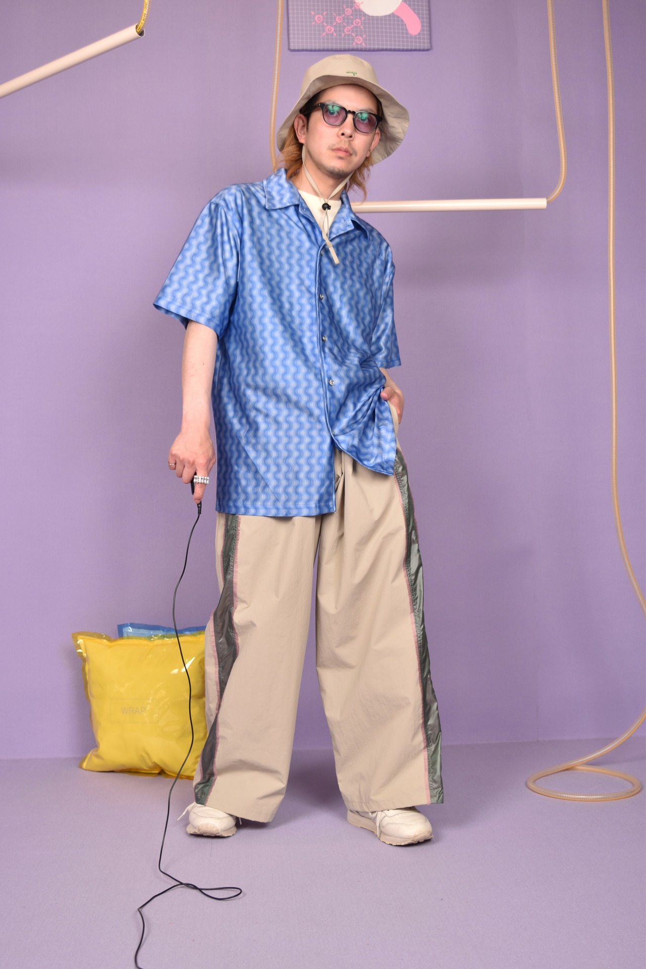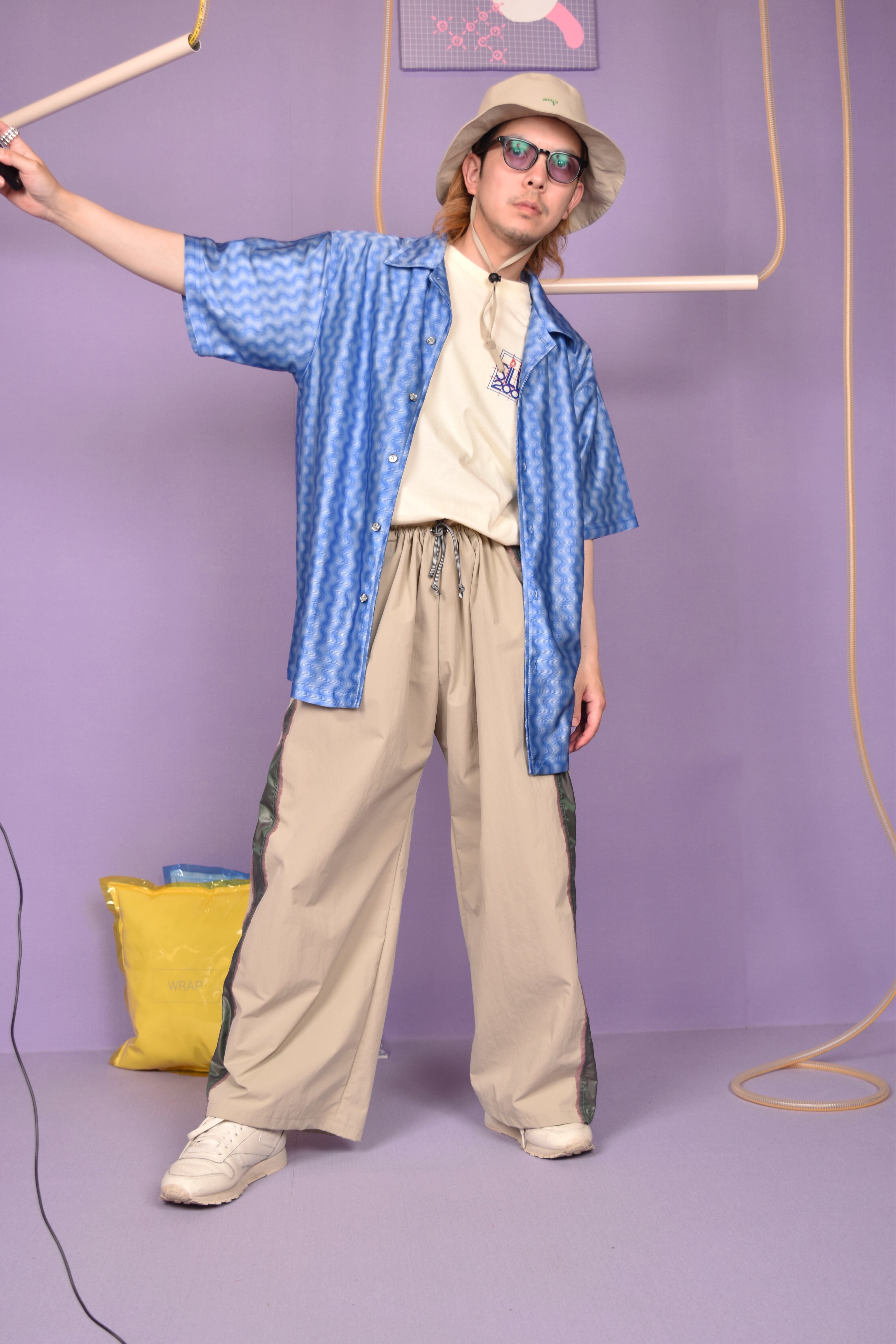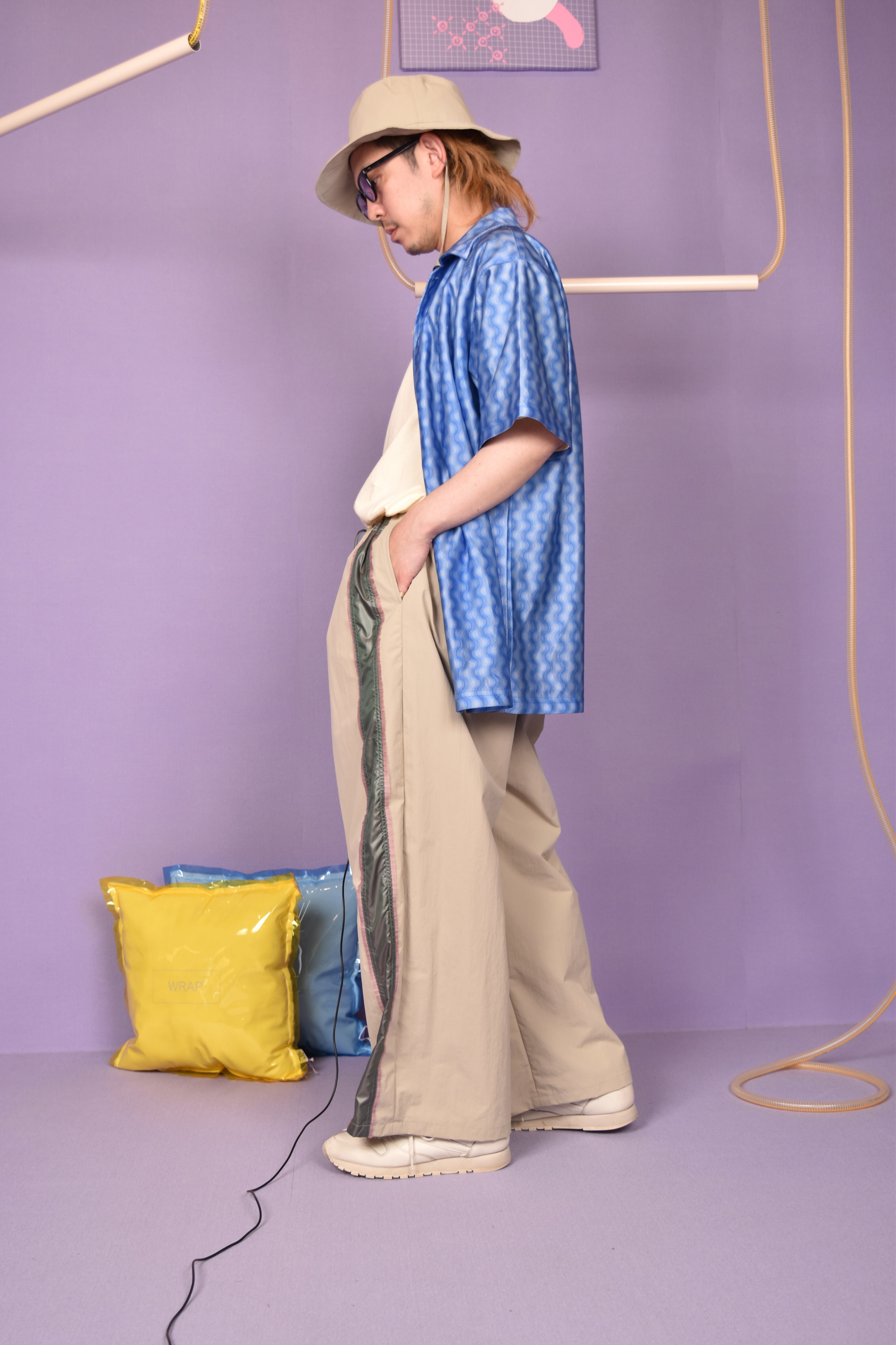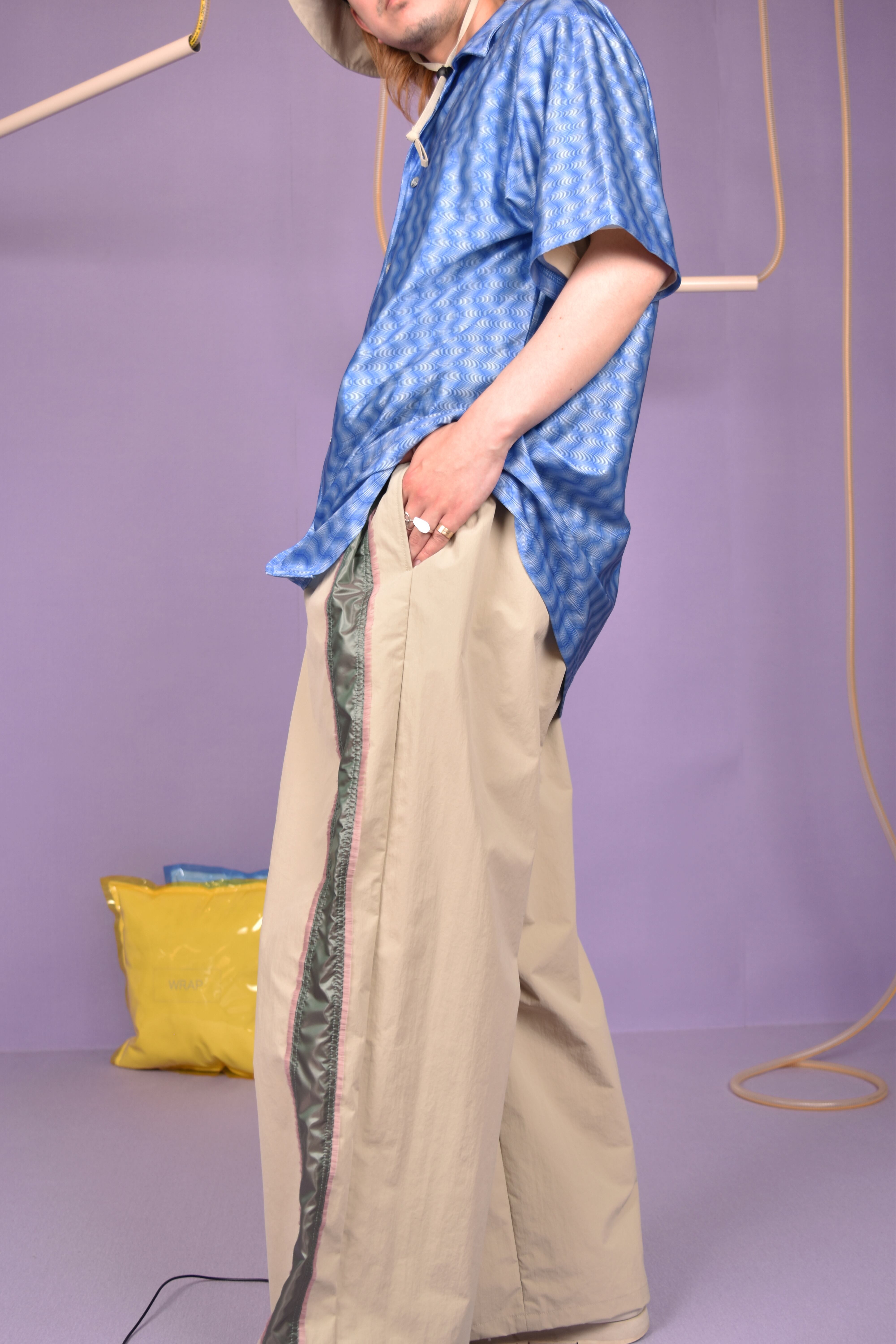 光沢感のあるウェーブ総柄のユニークな開襟シャツです。伸縮性のある生地で着心地も良いです。シワになりにくいのもポイントです。
