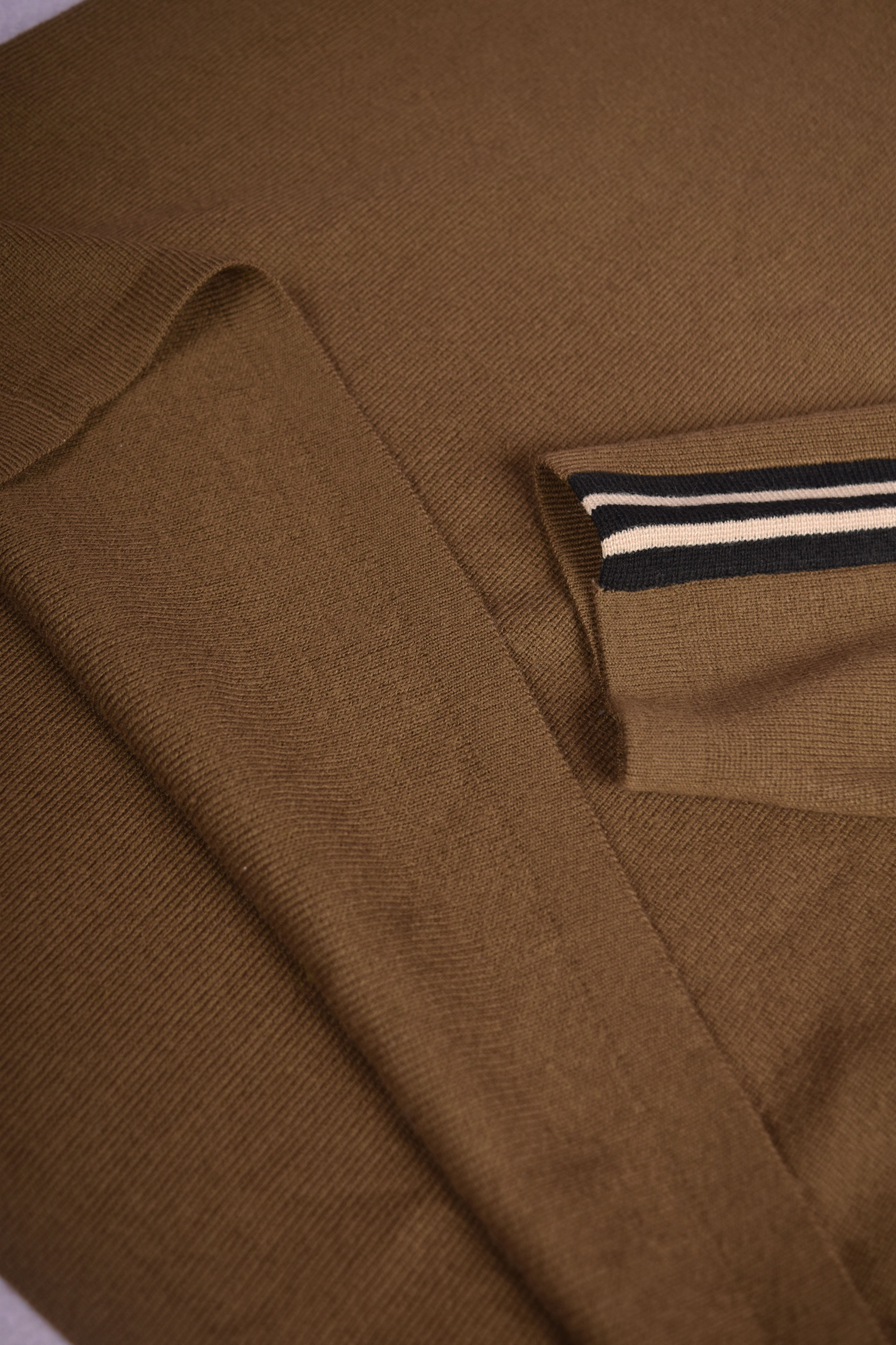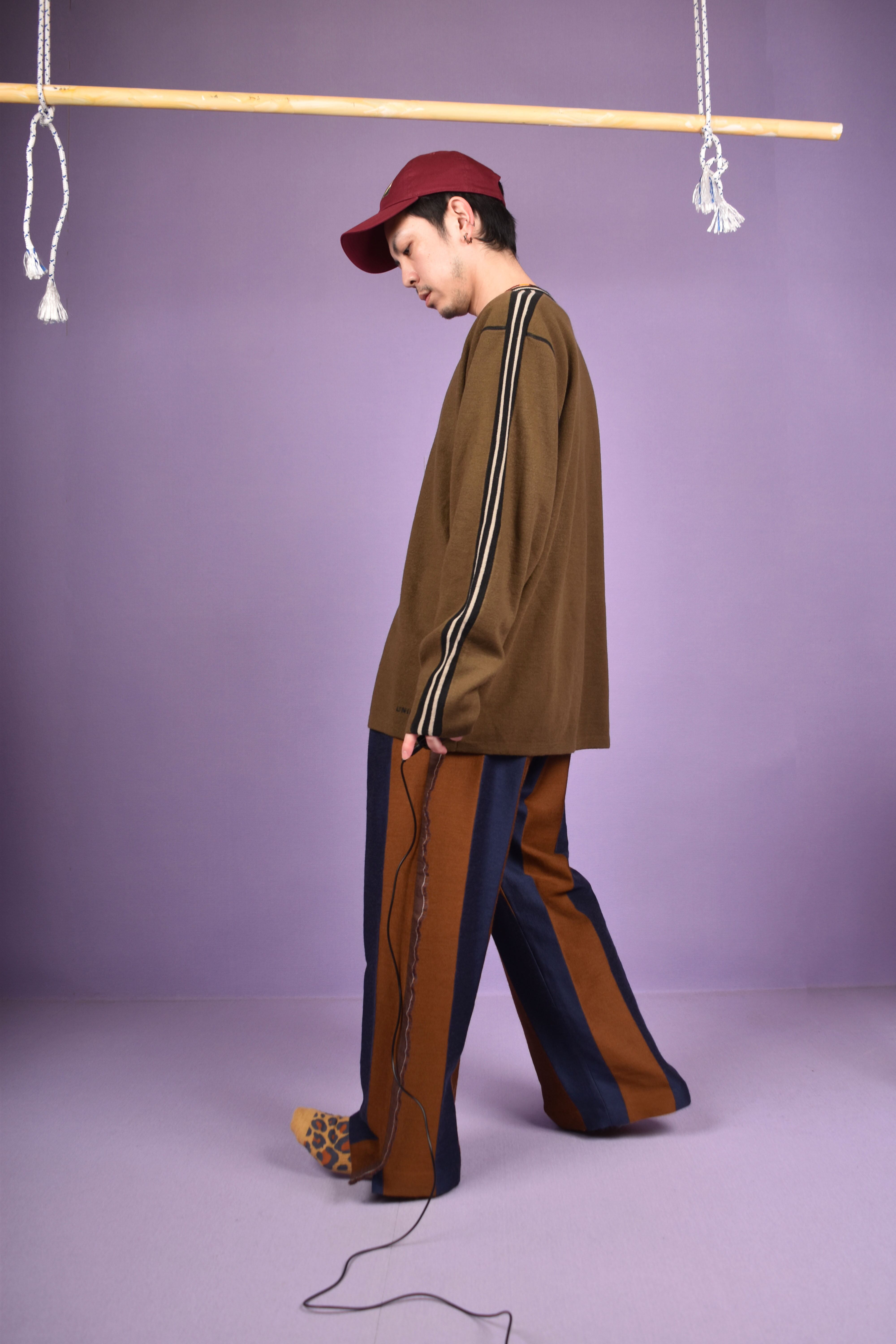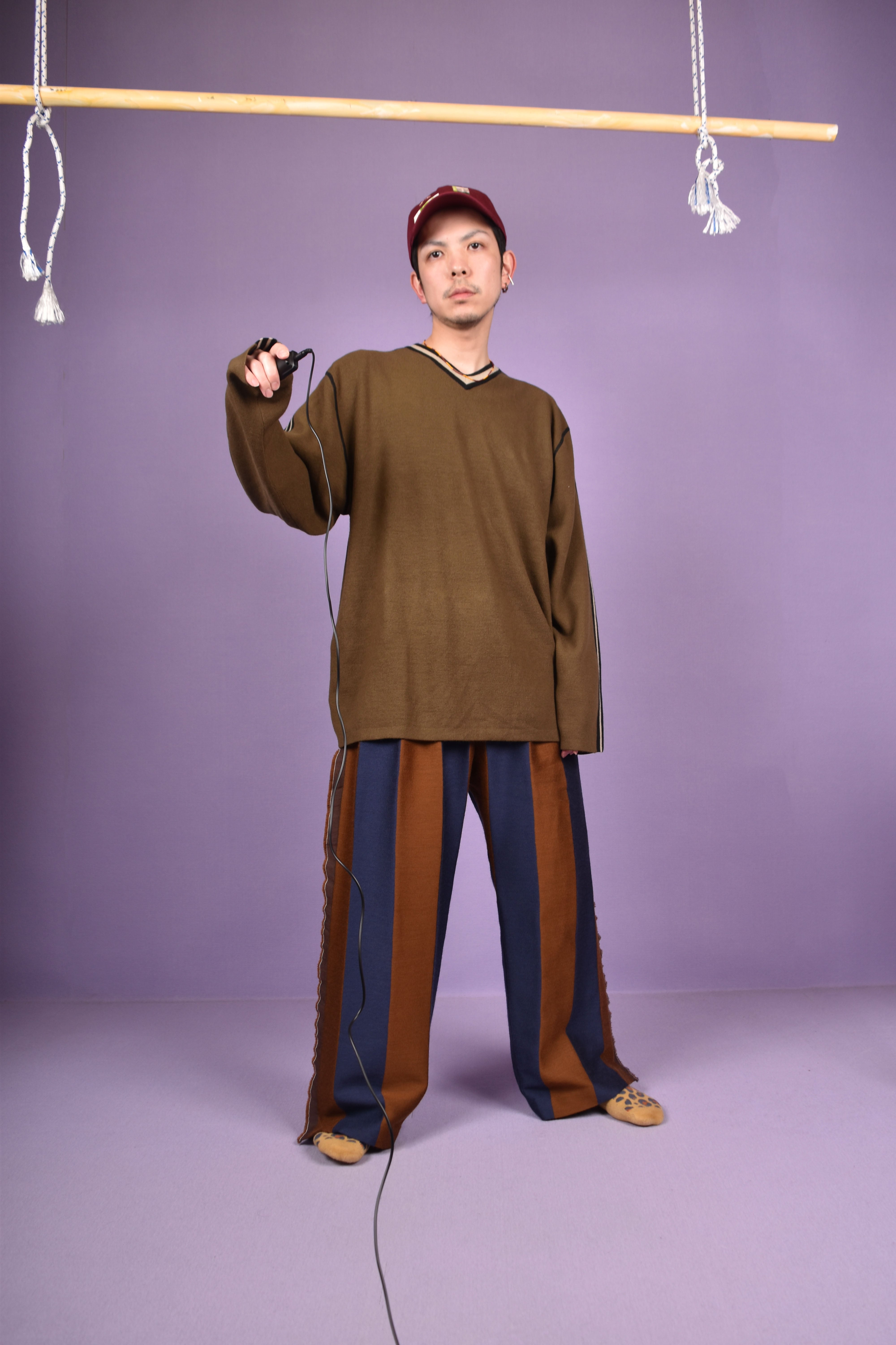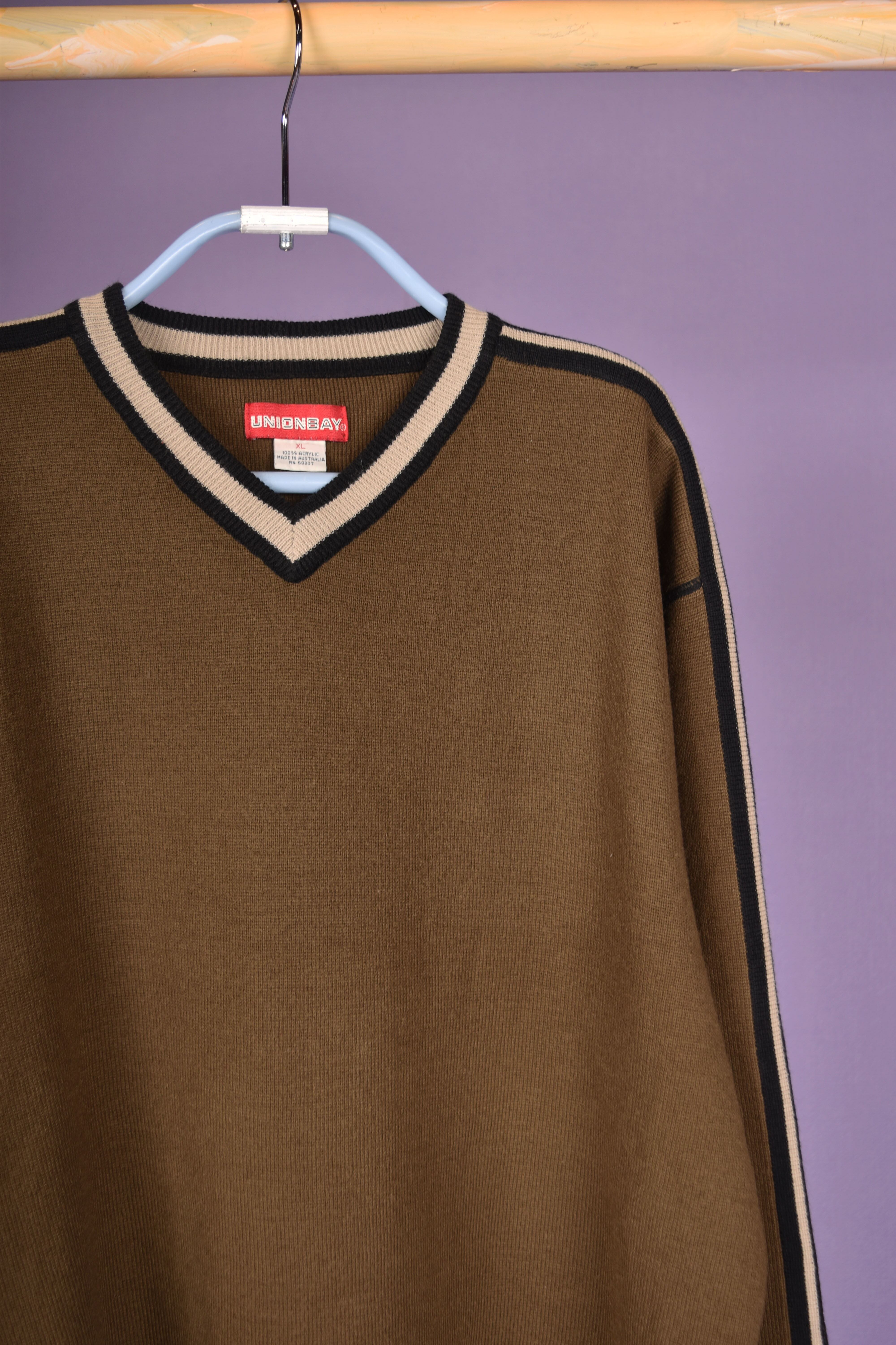 UNIONBAYのVネックニットです。肩から袖口にかけてラインが入ったスポーティなデザインです。リブフリーのデザインで程よい落ち感があります。浅めのvネックがクールな印象です。秋〜春先まで活躍しロンTのような感覚で着用いただけると思います。