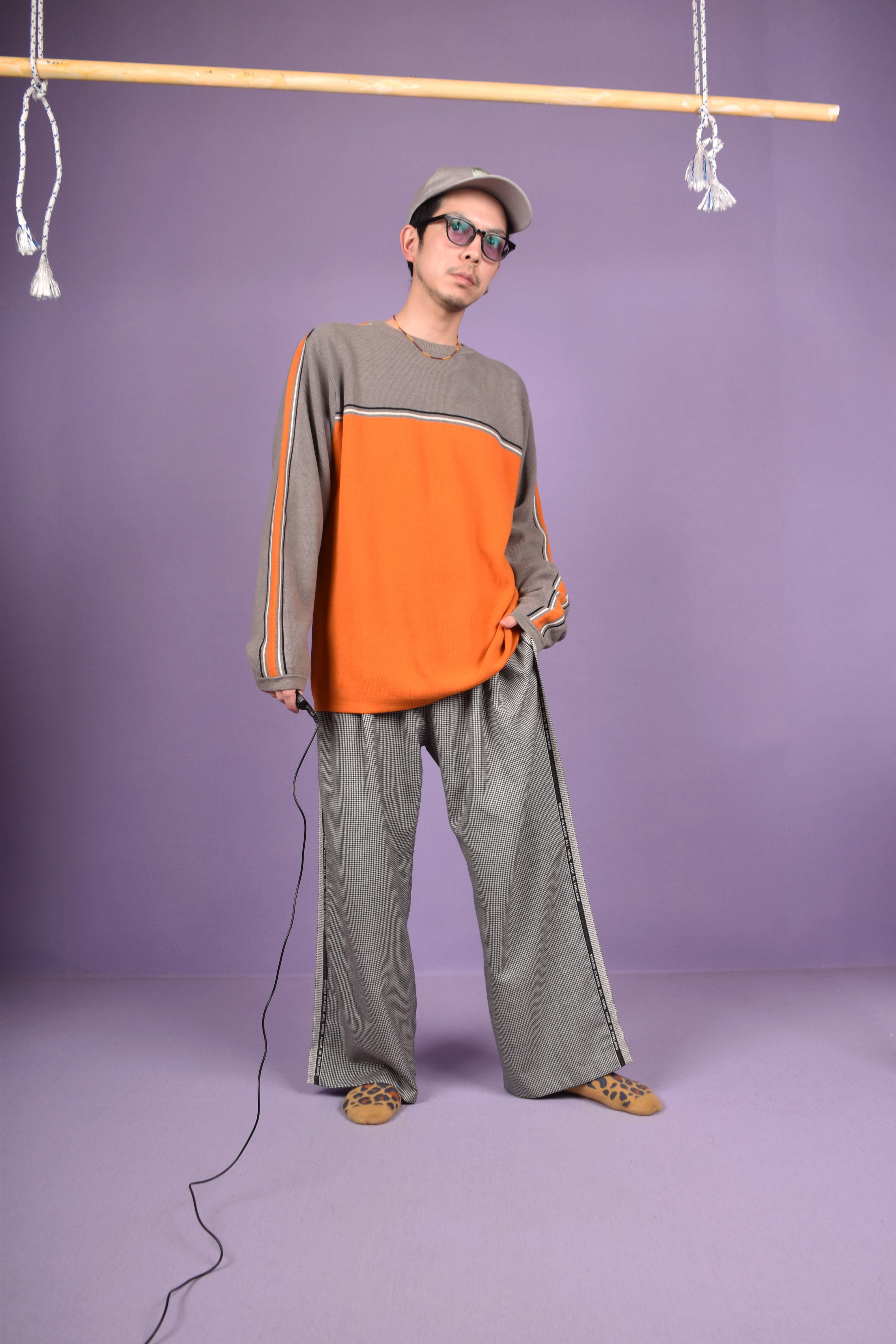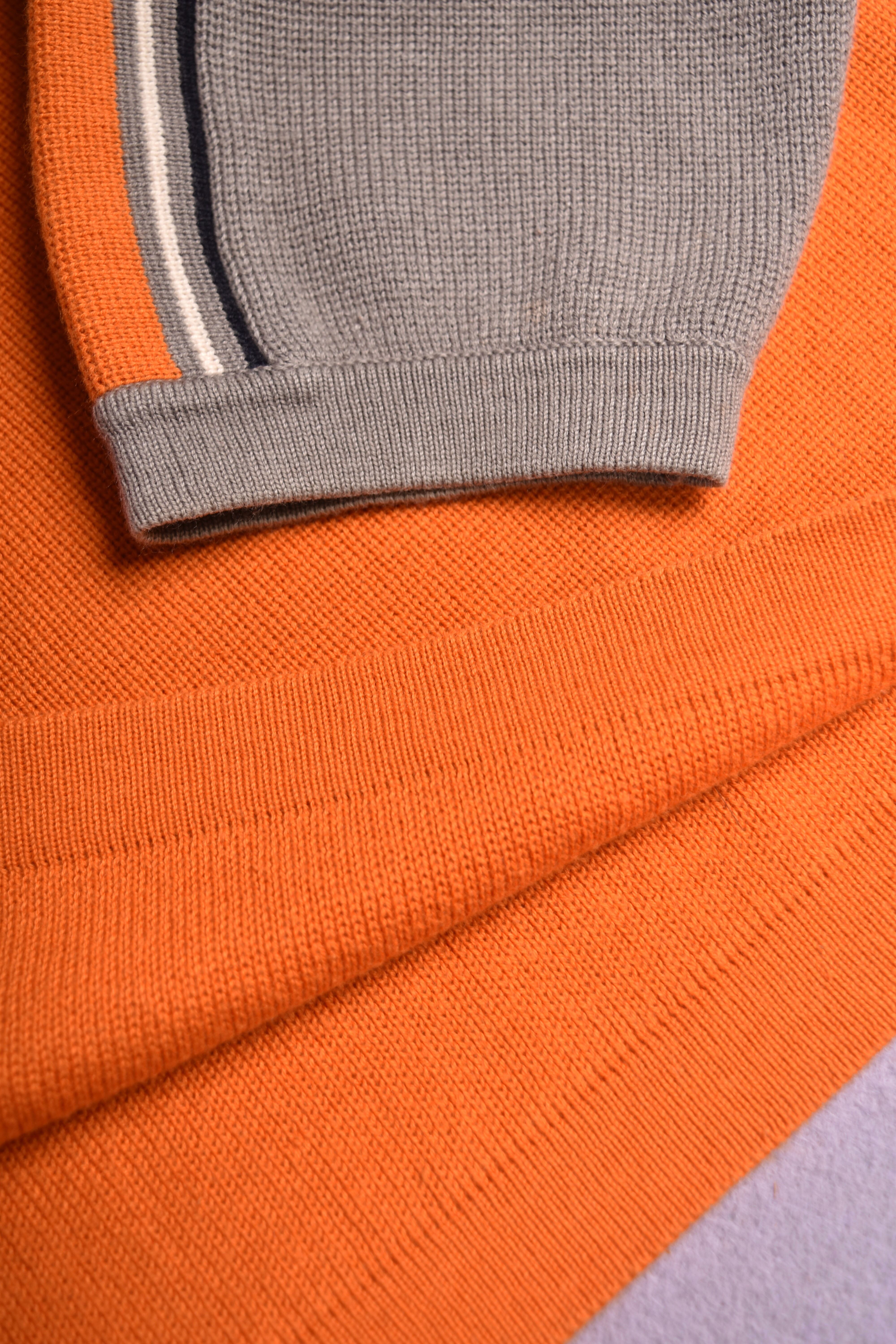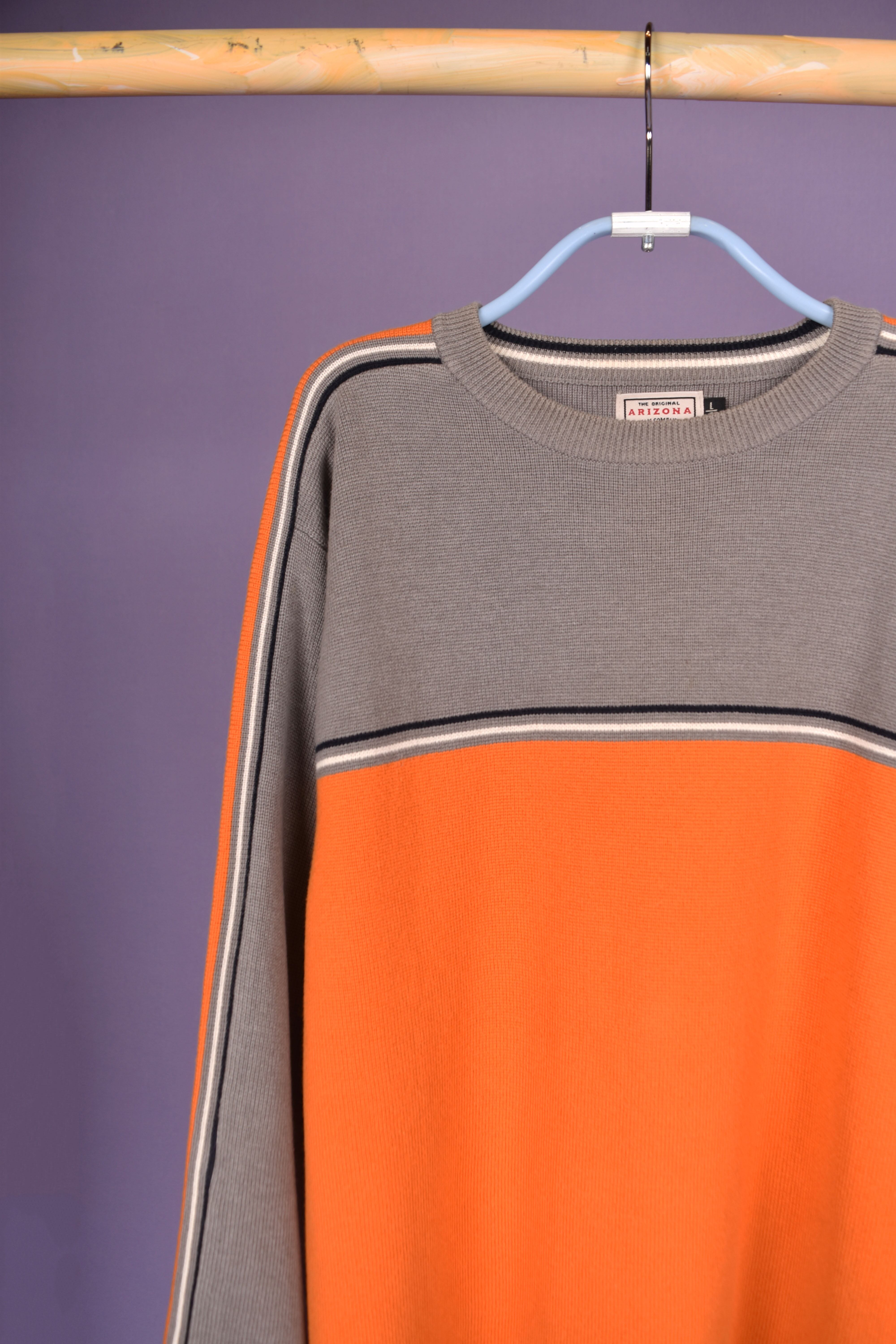 ARIZONA JEANのカラーネックセーターです。肩から袖口にかけてラインが入ったスポーティなデザインです。ライトグレーとオレンジの配色デザインが抜群です。秋〜春先まで活躍しロンTのような感覚で着用いただけると思います。
