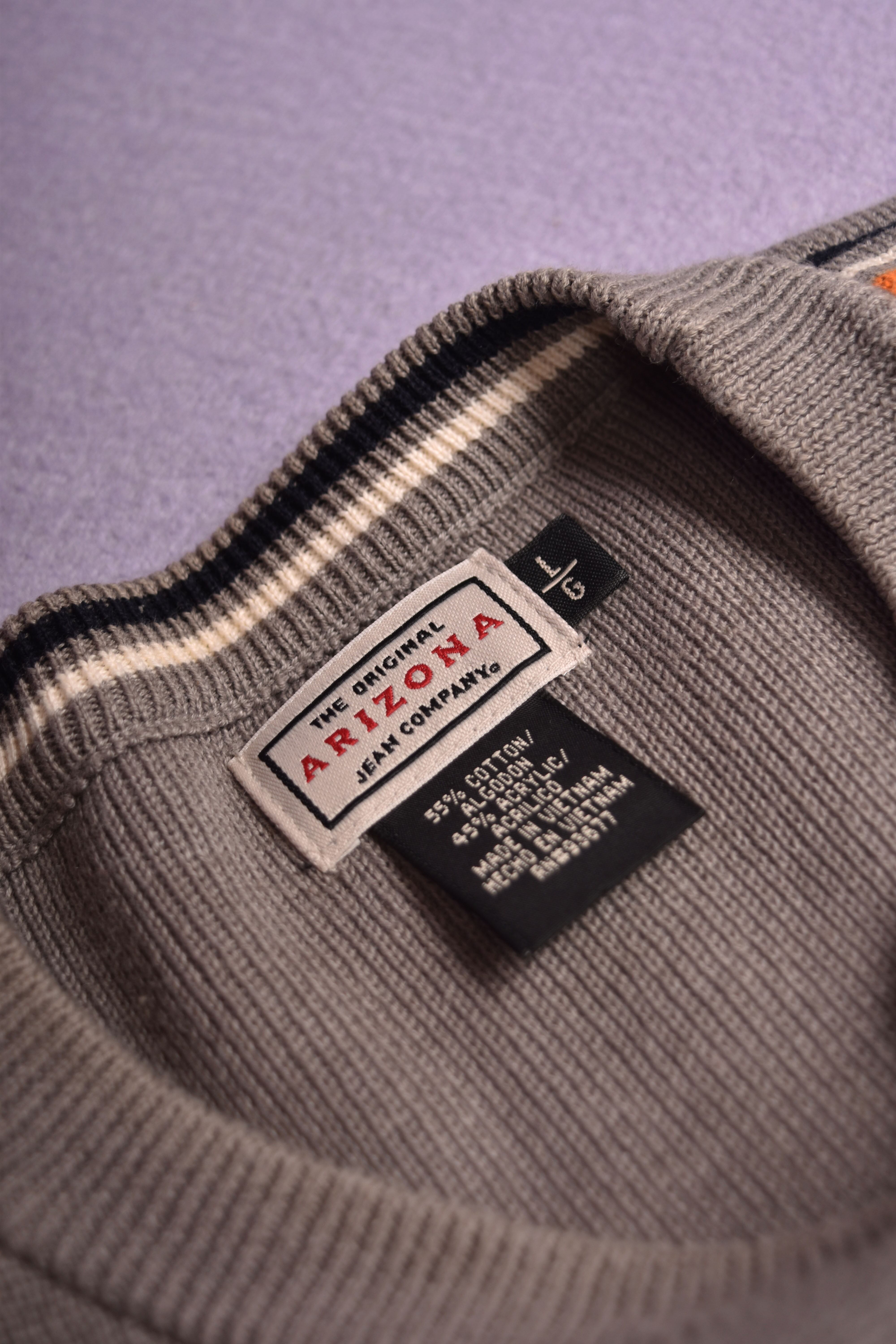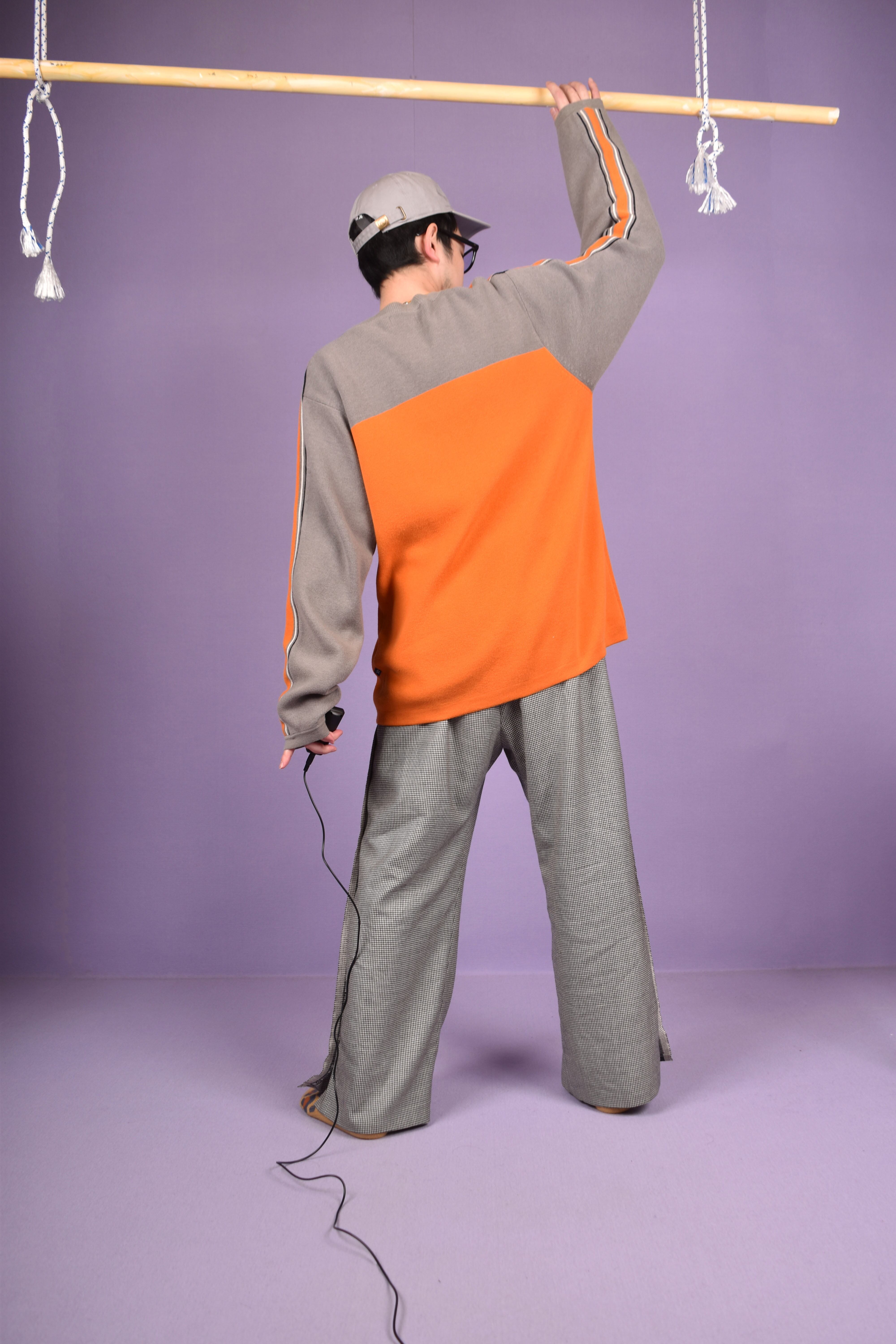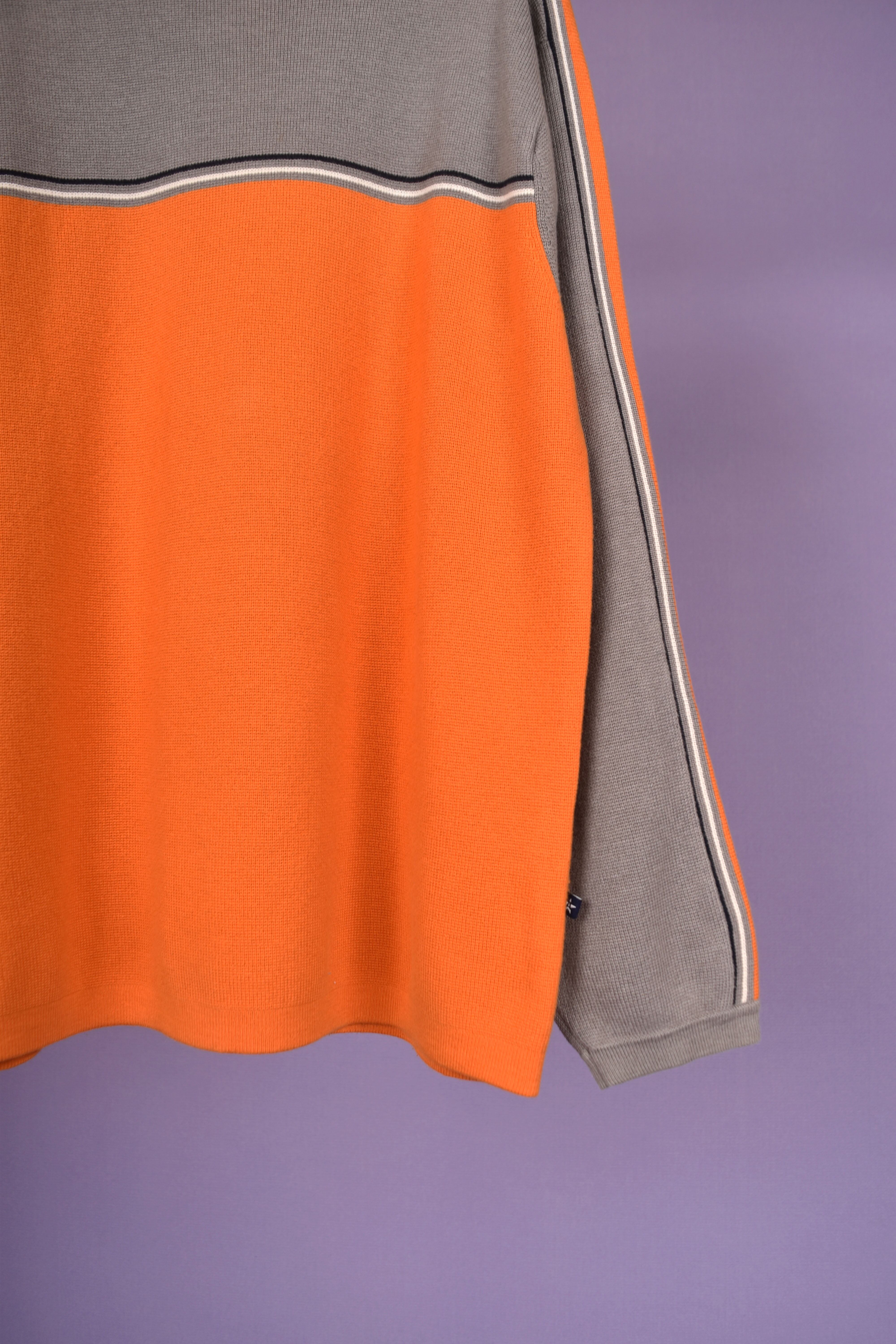 ARIZONA JEANのカラーネックセーターです。肩から袖口にかけてラインが入ったスポーティなデザインです。ライトグレーとオレンジの配色デザインが抜群です。秋〜春先まで活躍しロンTのような感覚で着用いただけると思います。