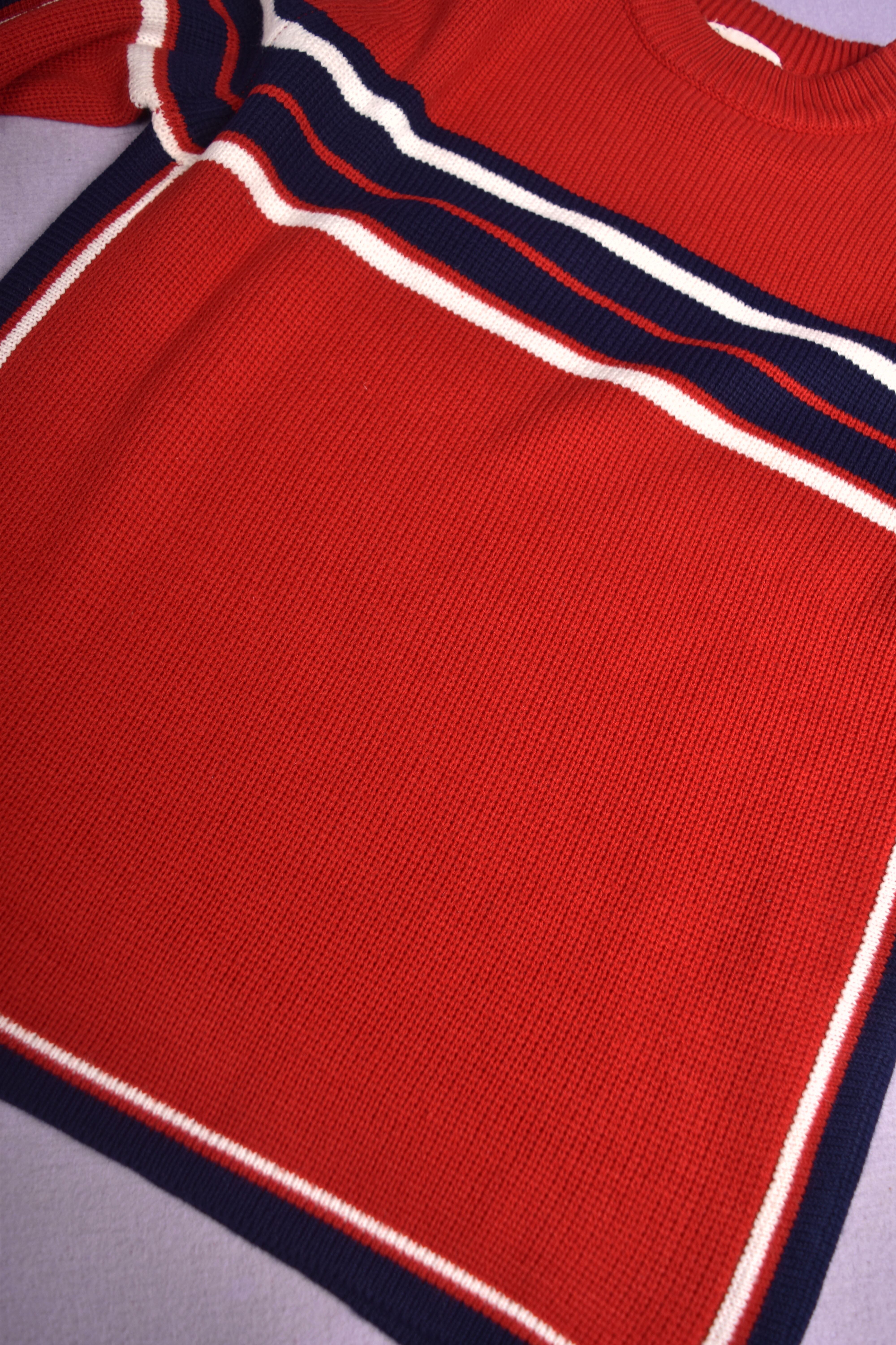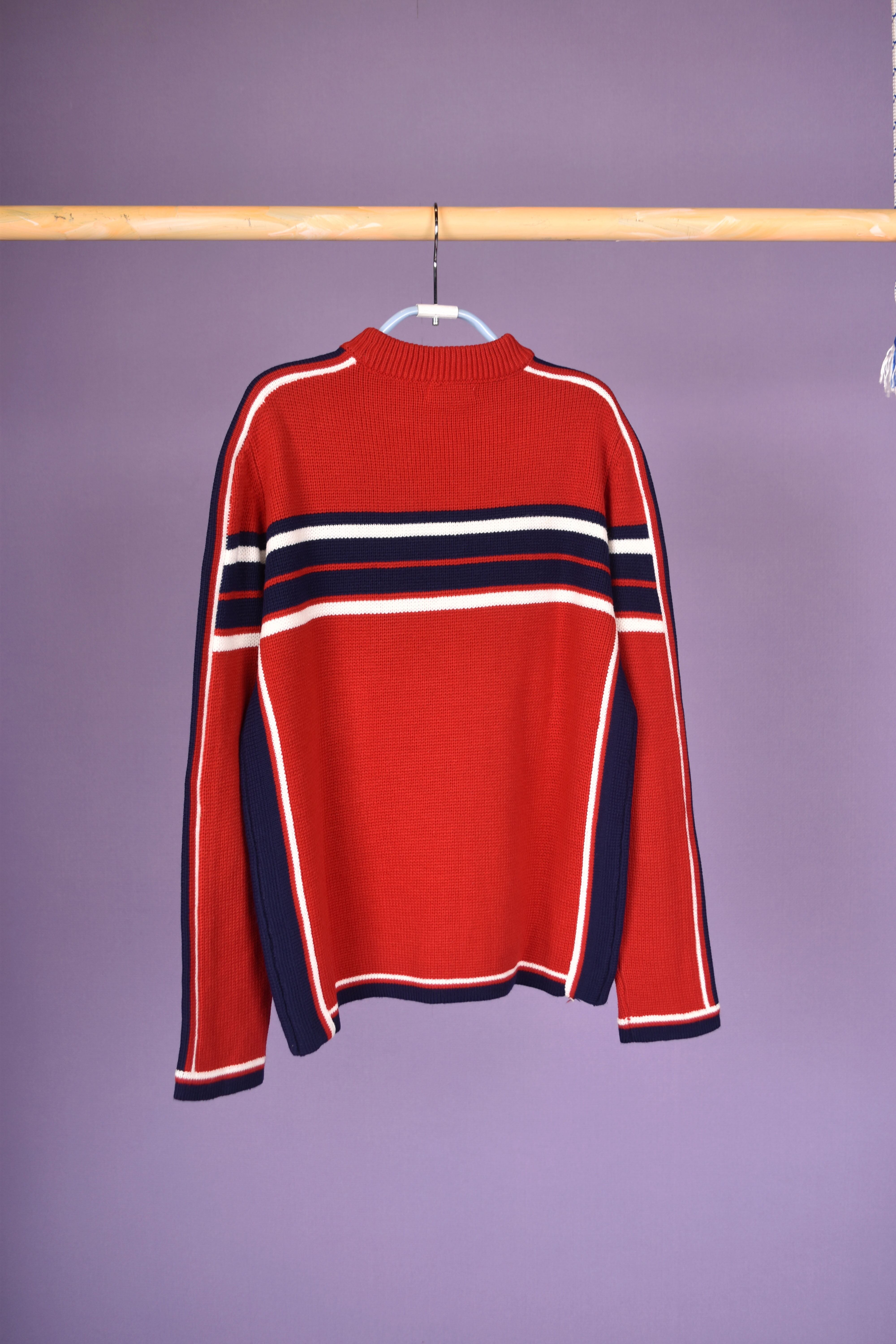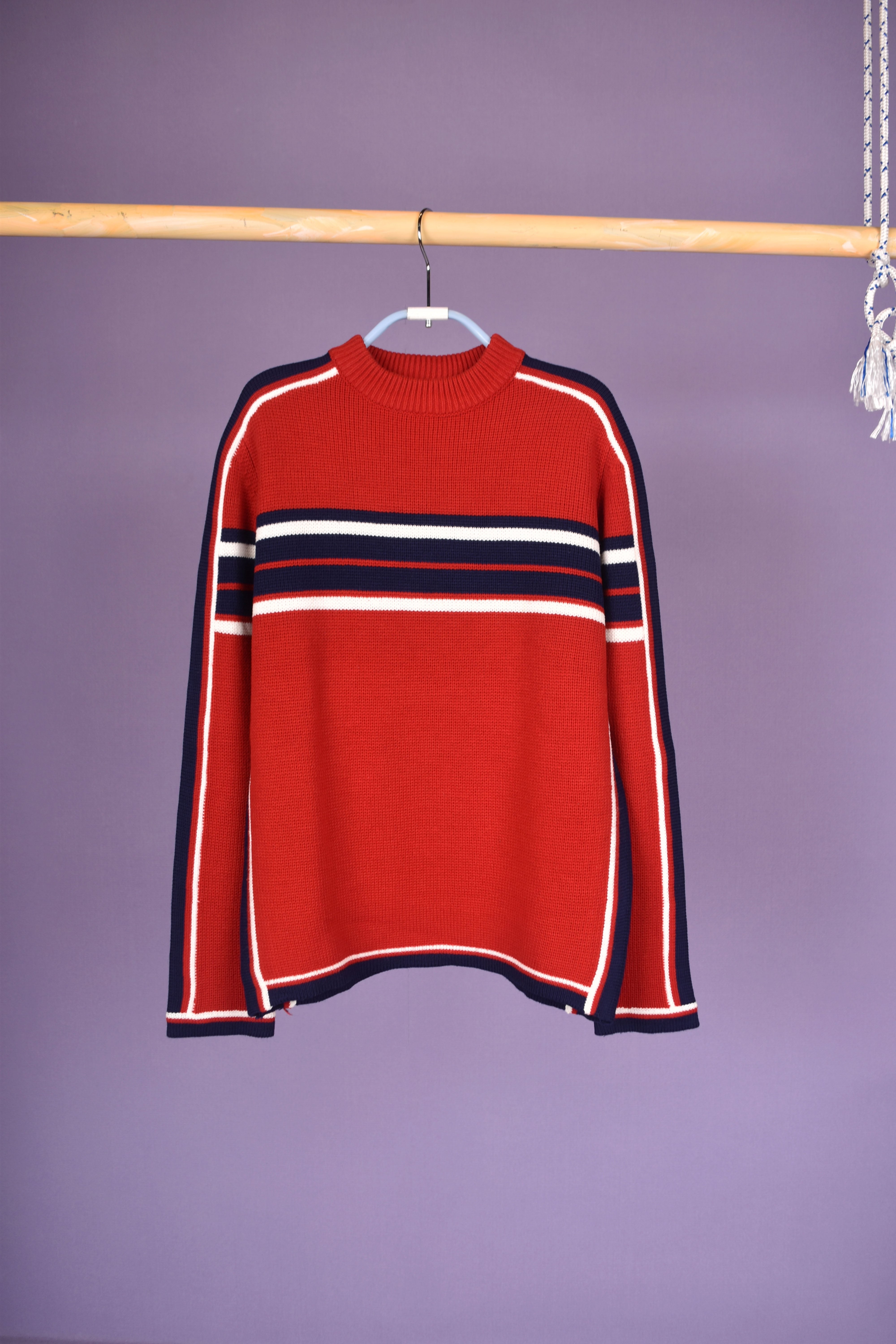 スクエア調のデザインのセーターです。タイトめなシルエットでスポーティandモードな印象です。ユニセックスで着用可能です。