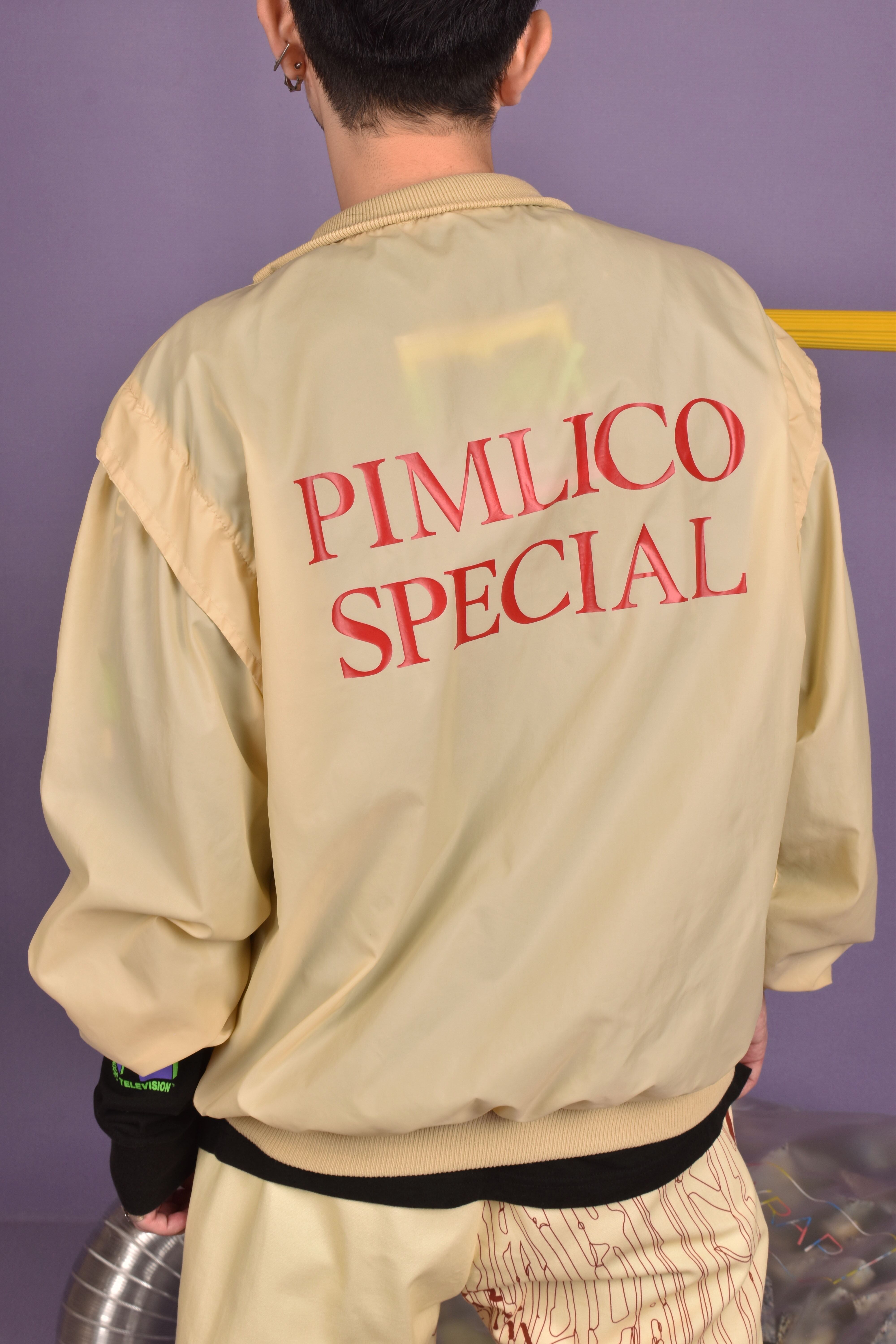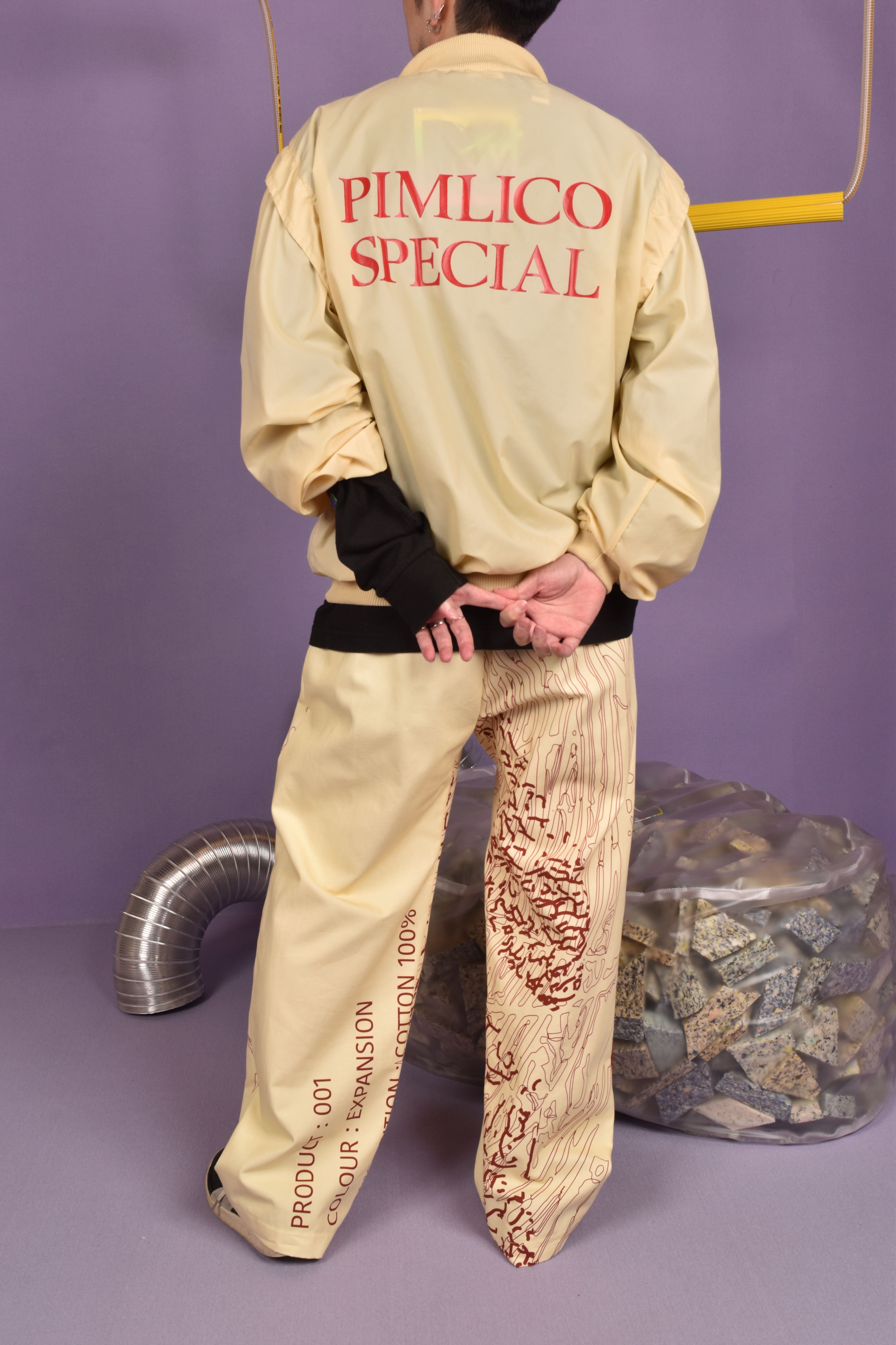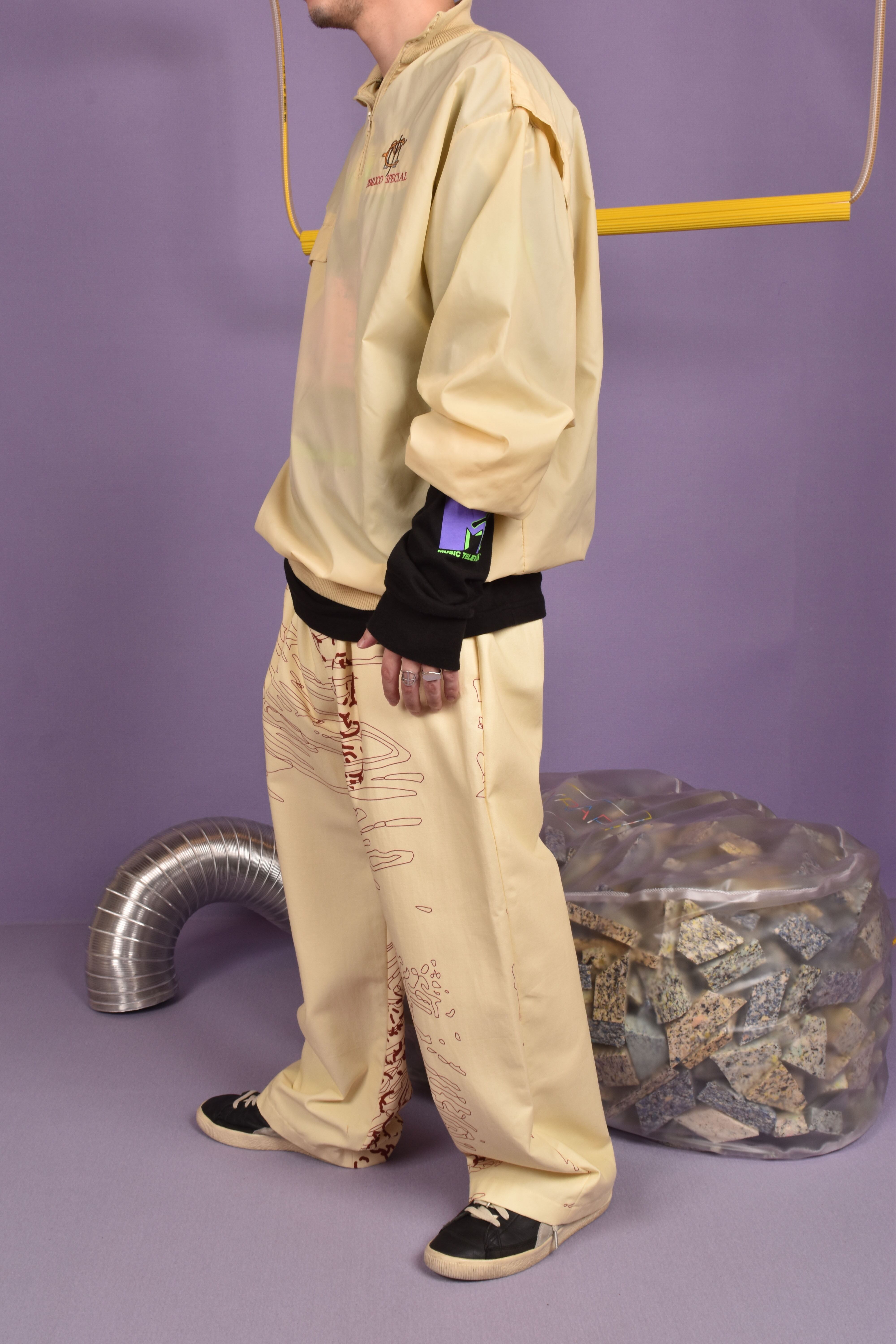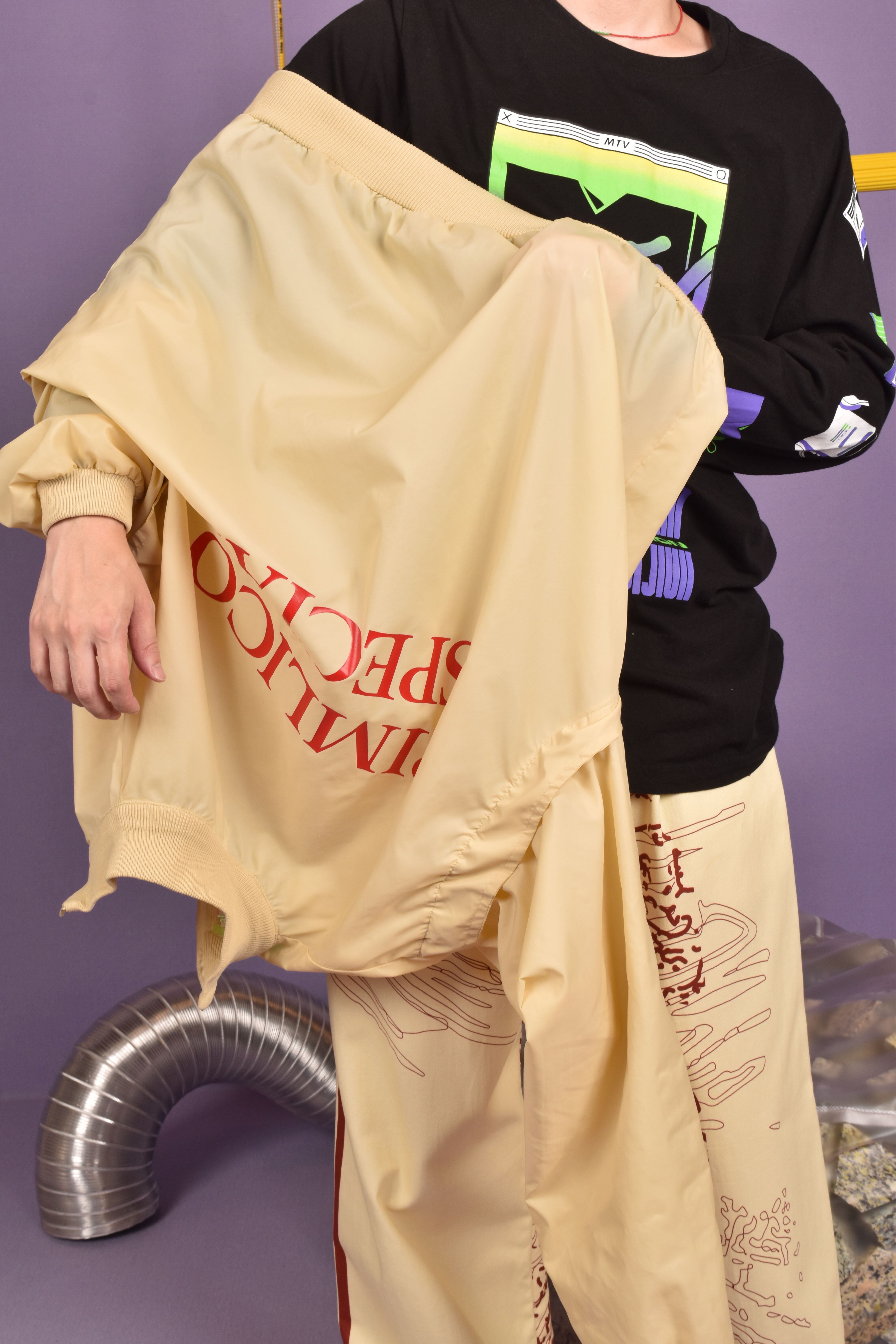 この時期使えるナイロン地のプルオーバー。まずライトイエローのボディカラーにレッドのバックプリントがめちゃめちゃいい。そして後ろ袖ぐりはタックの中にリブを使用し運動量を考えた仕様に。胸には刺繍とポケットを。高めのモックネックになっており、寒い日には防寒性もあります!機能性とデザインを兼ね備えた優れものです。