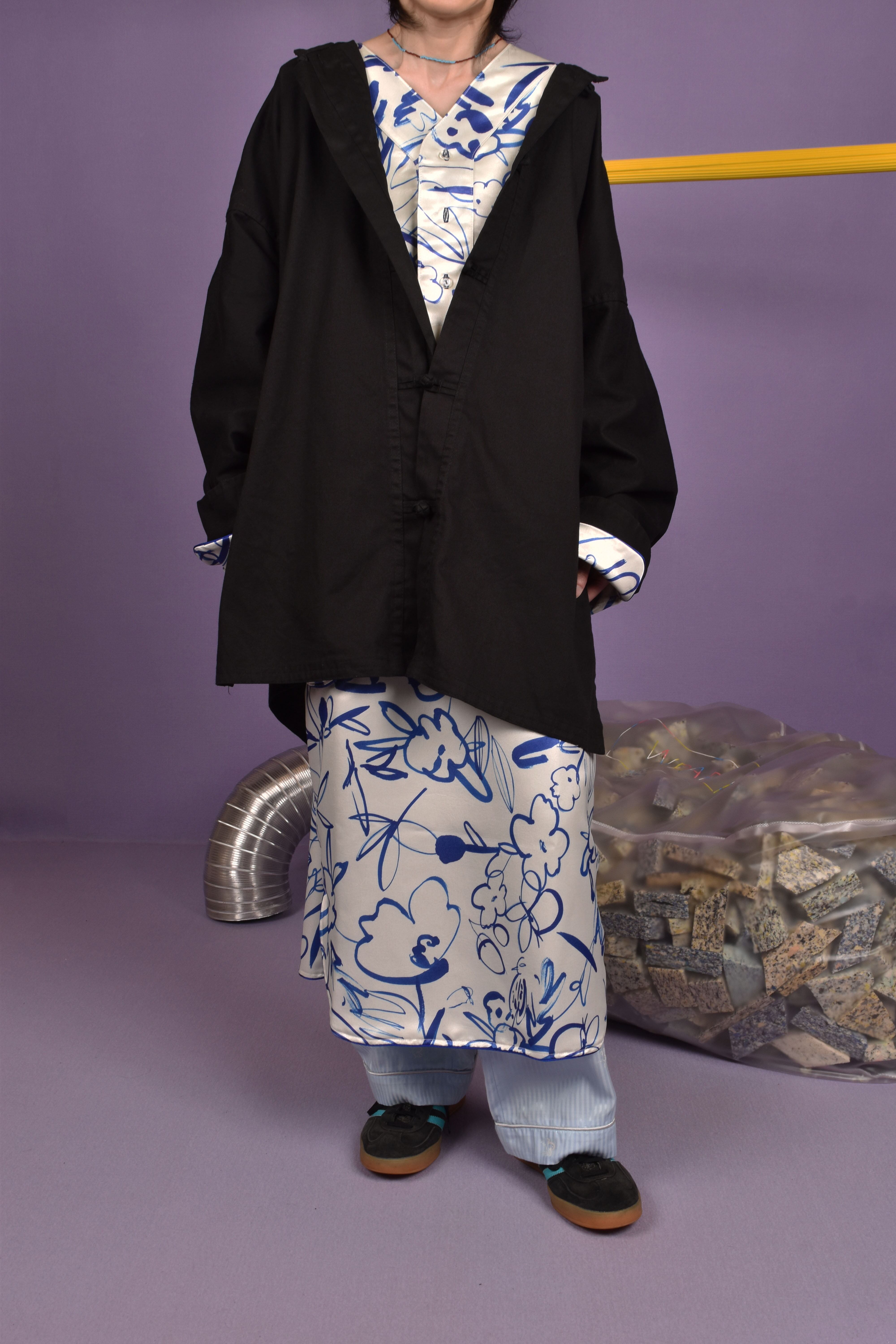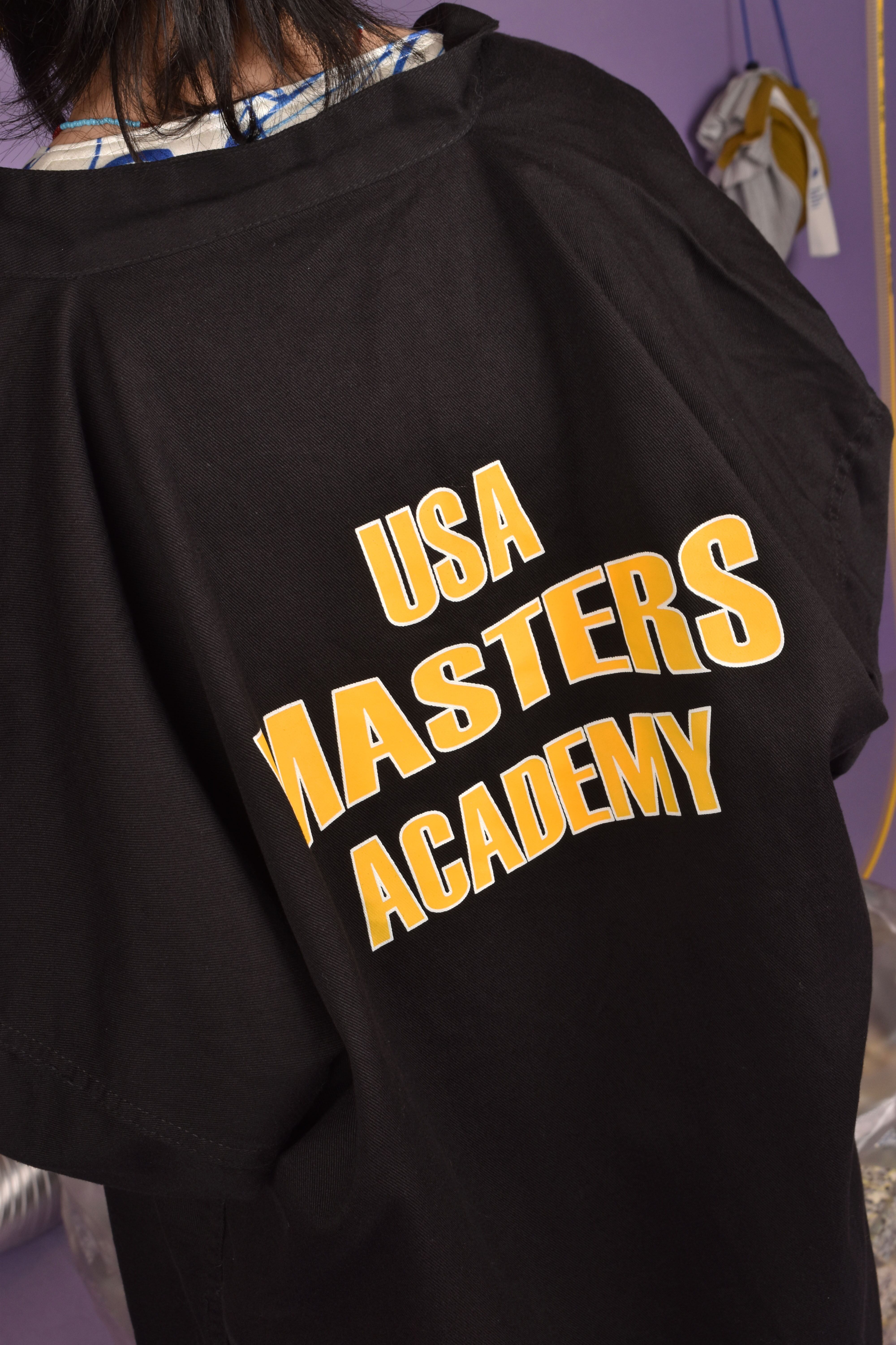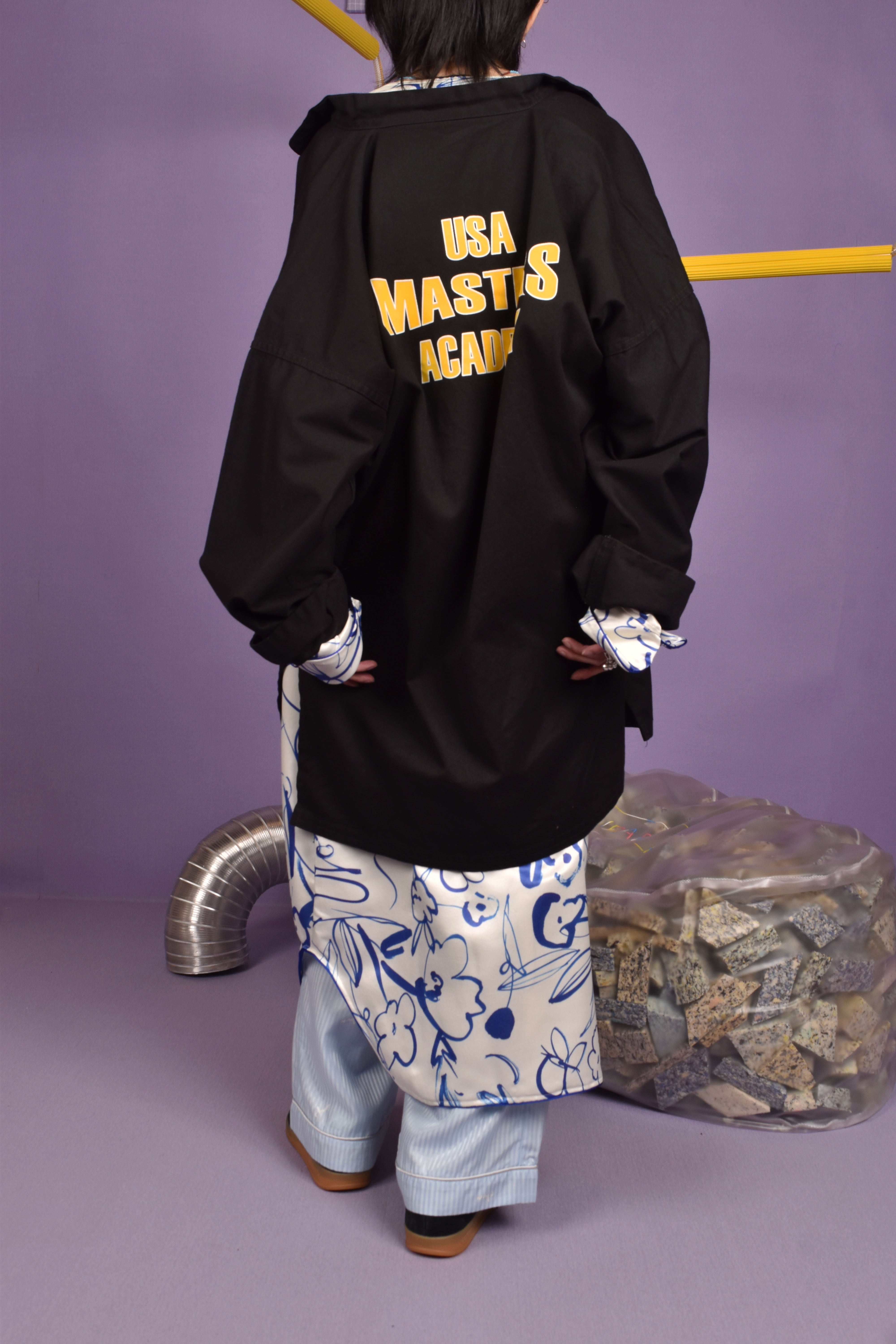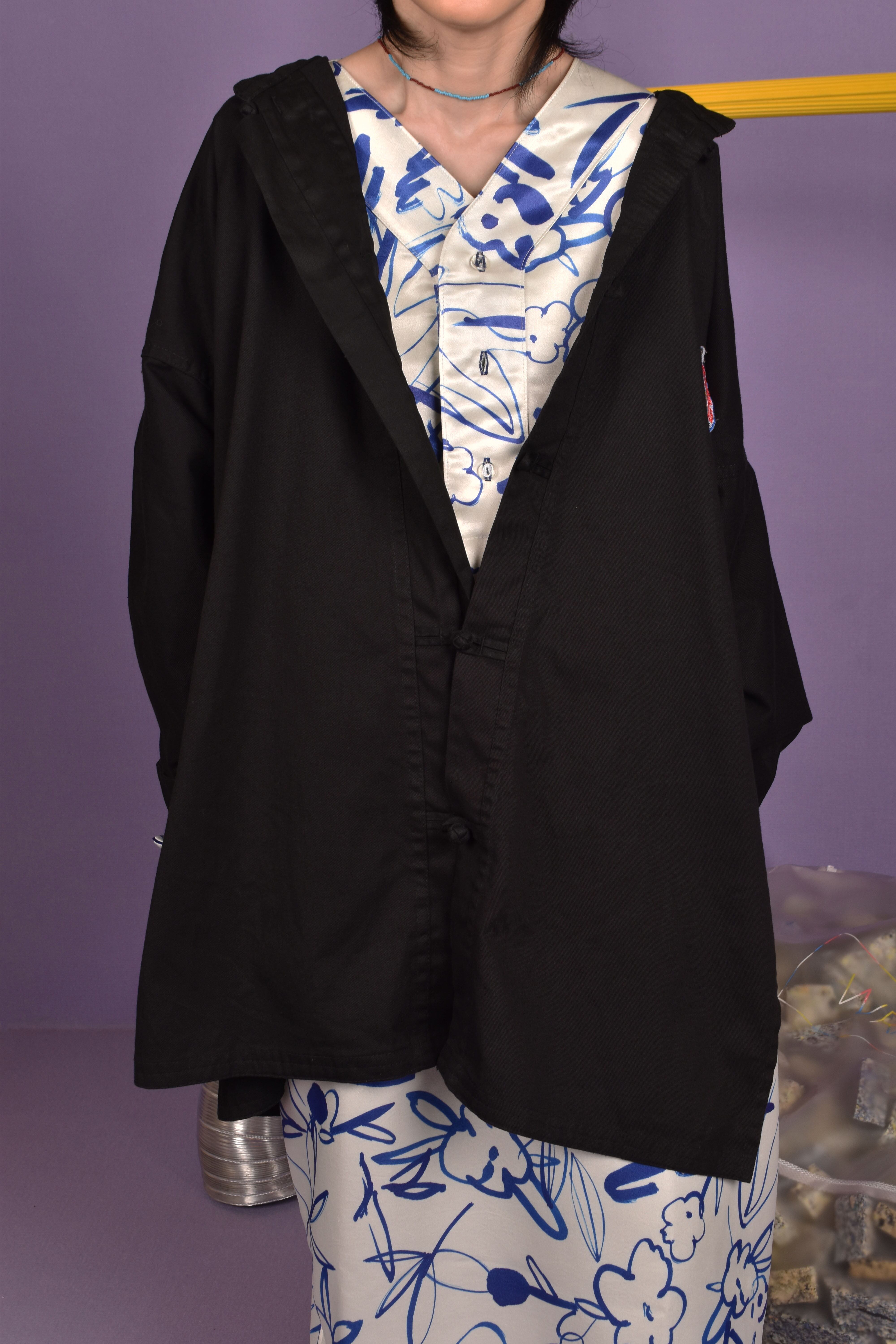 みなさん大好きチャイナジャケットです。薄手のワークシャツに使うような生地。イエローのバックプリントが目を惹きます!メンズサイズですが女性がワンピースやスカートスタイルに合わせるのがおすすめです。ユニセックス。