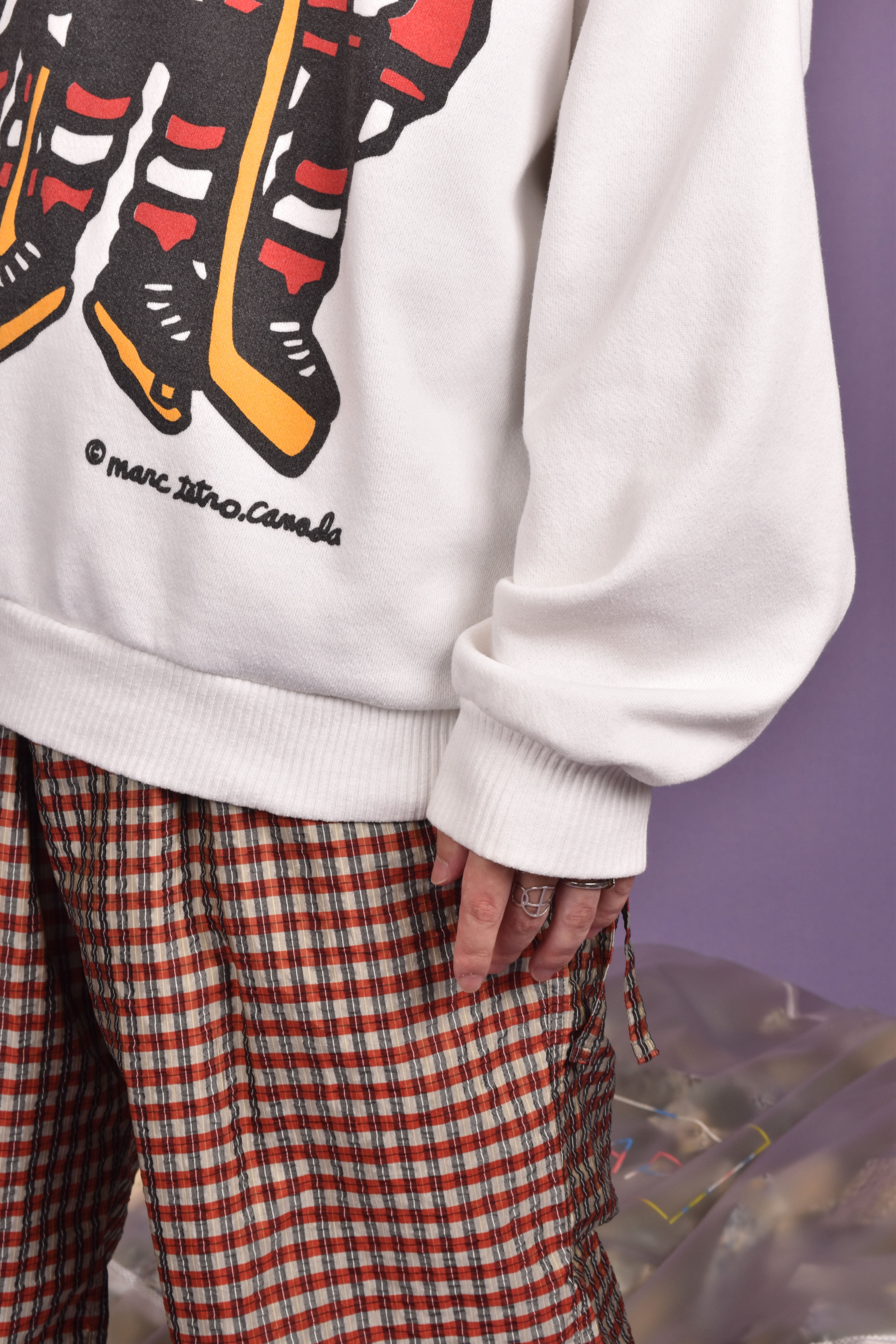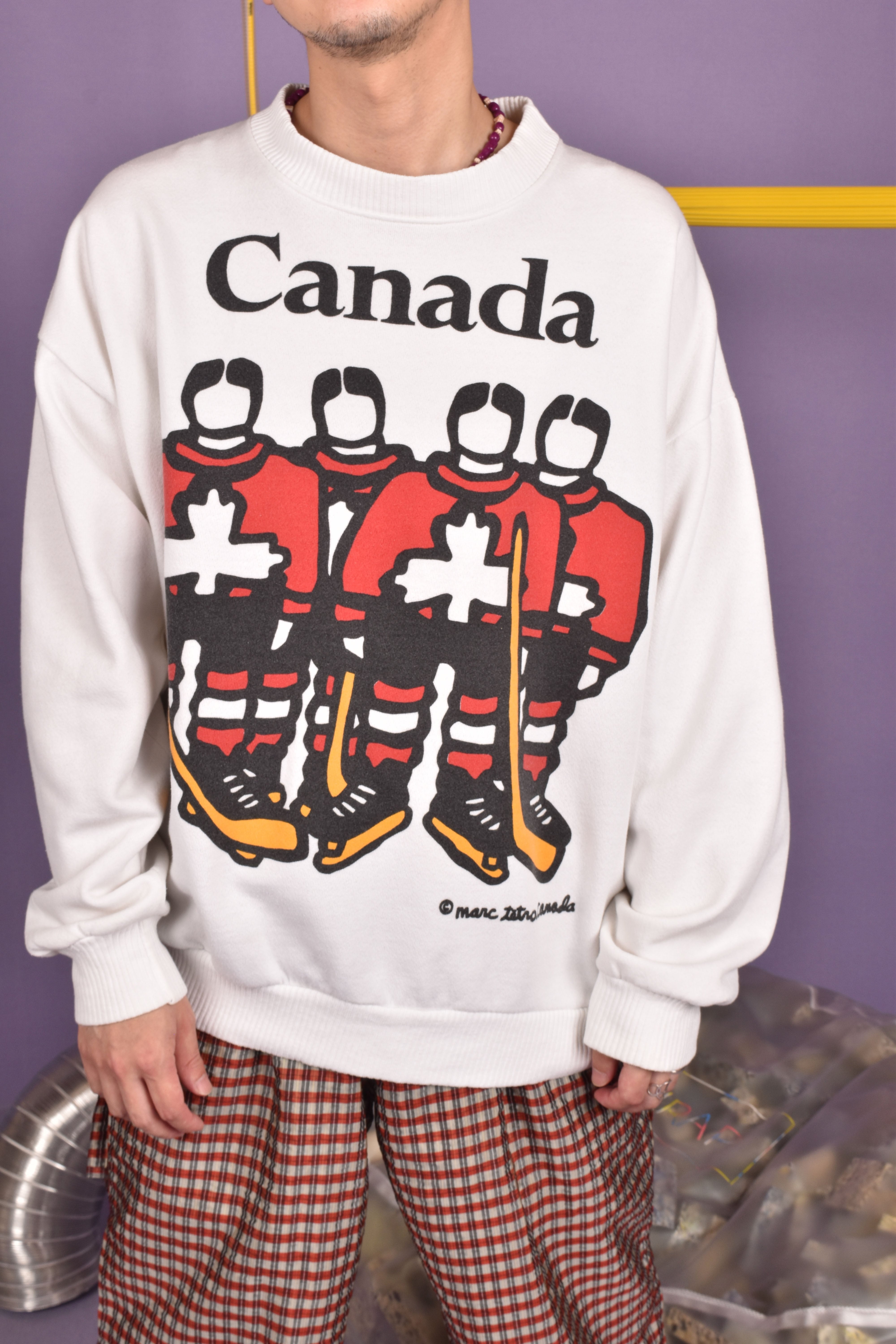 真っ白なボディにプリントが映えるアート要素のあるスウェット。横広に立つようなネックの仕様も不思議な良さがあります。間違いなく主役になる1着です!ユニセックス。