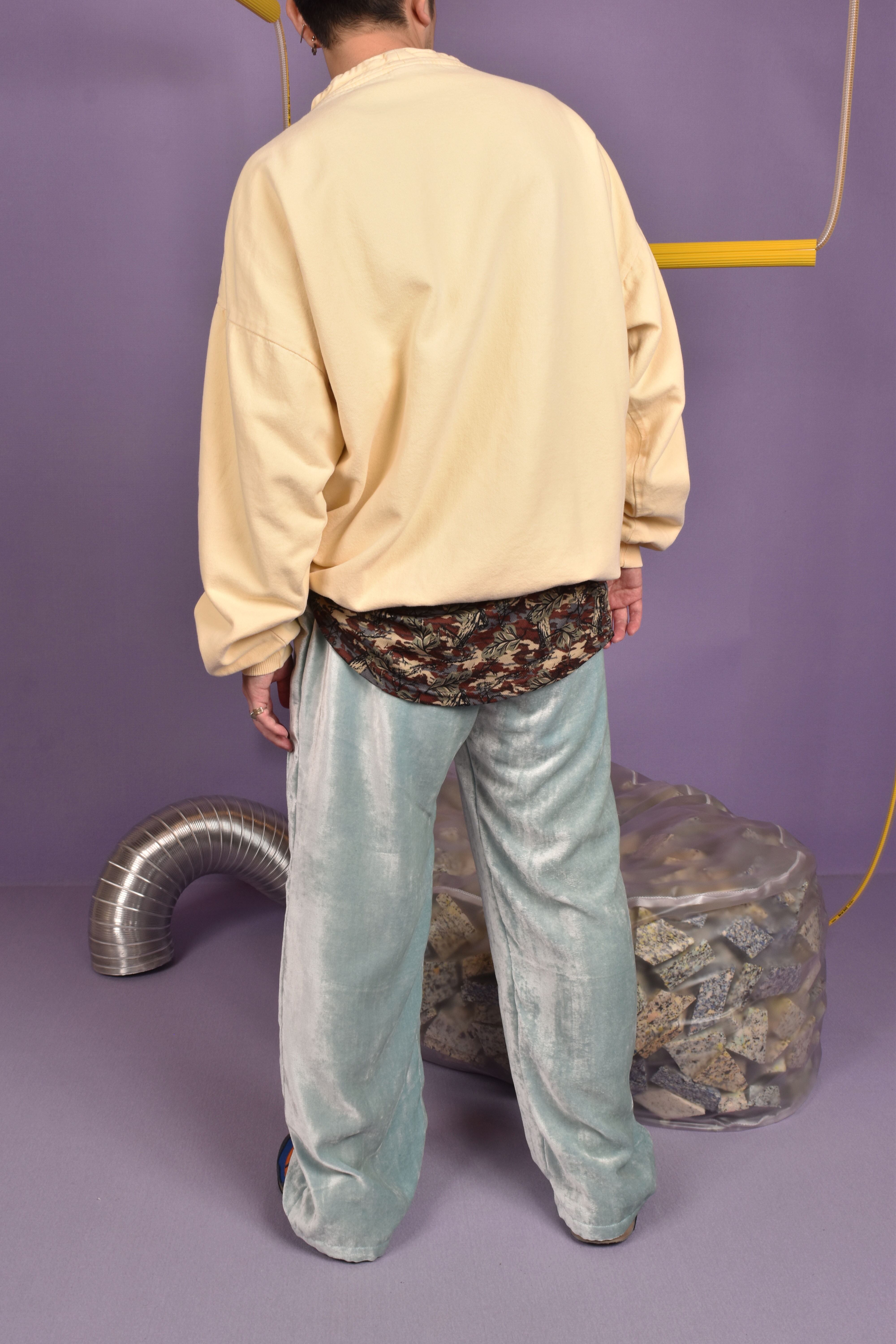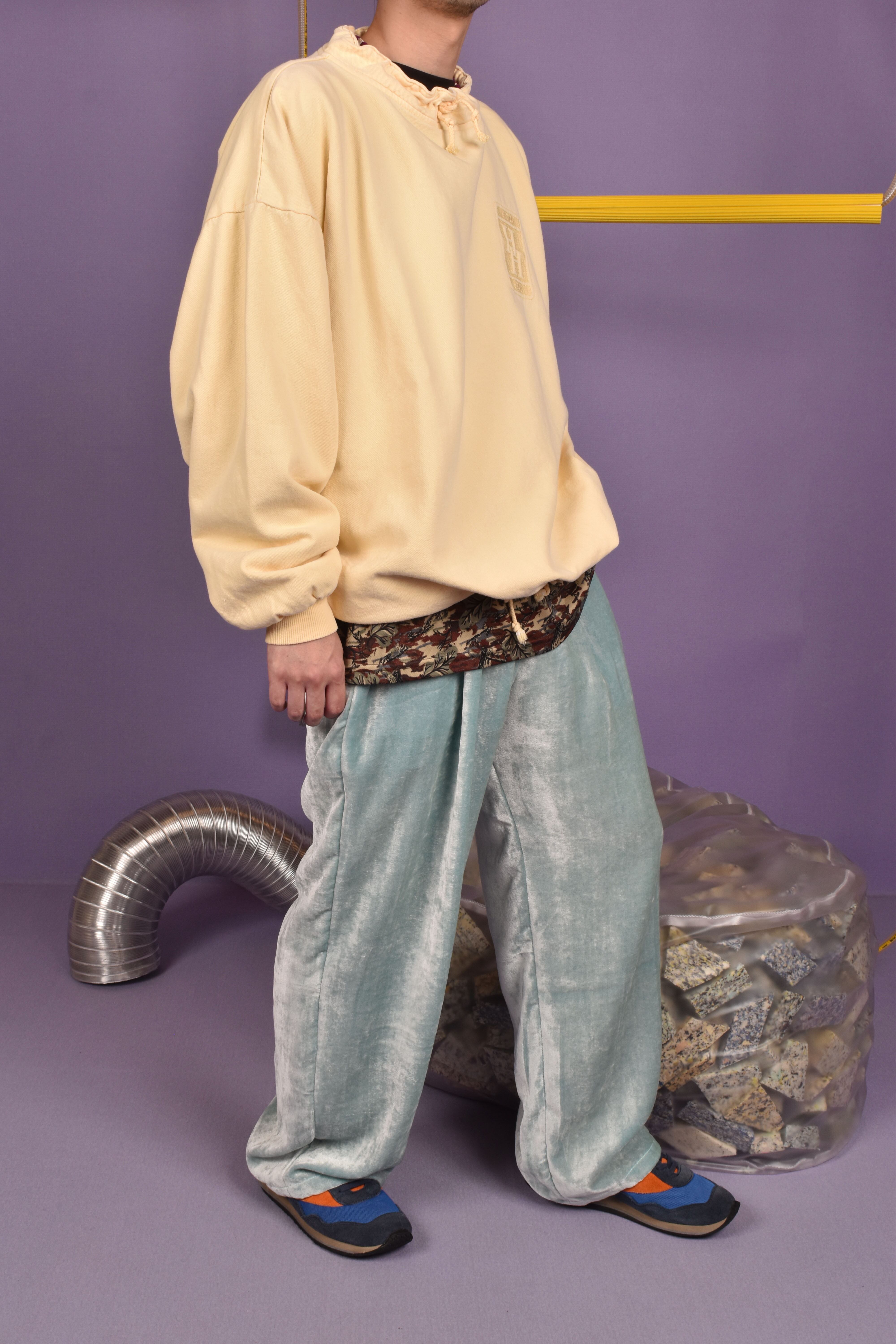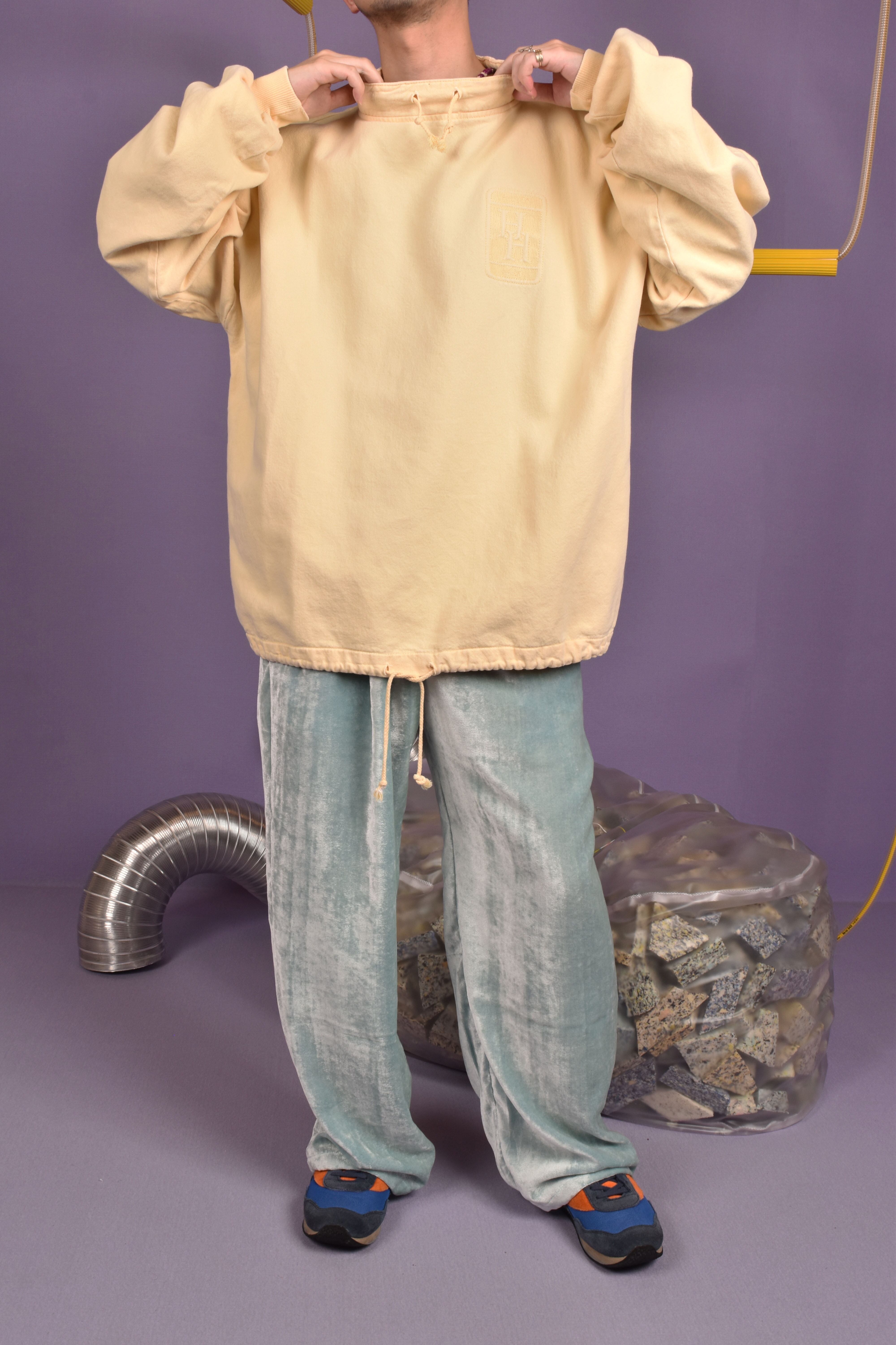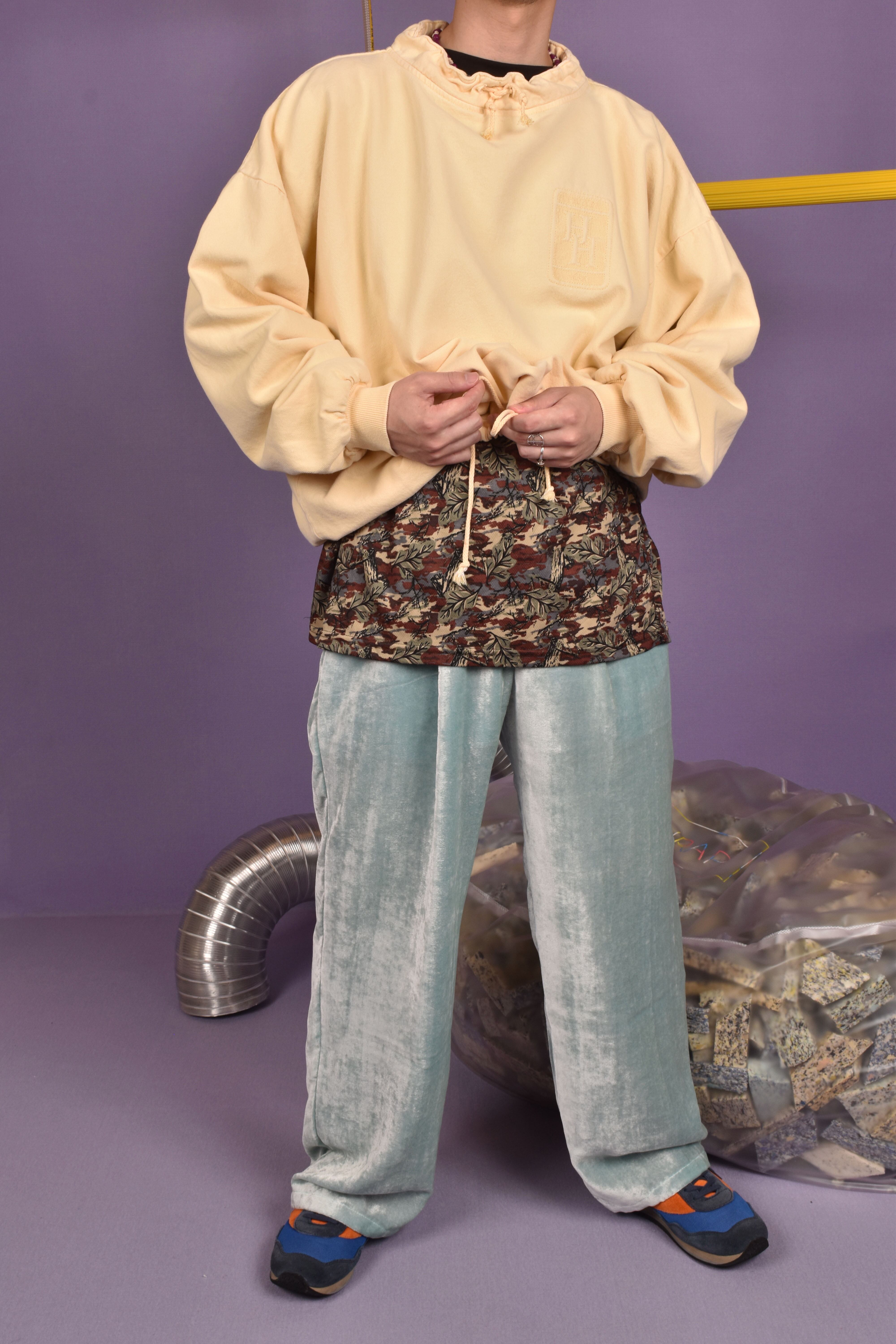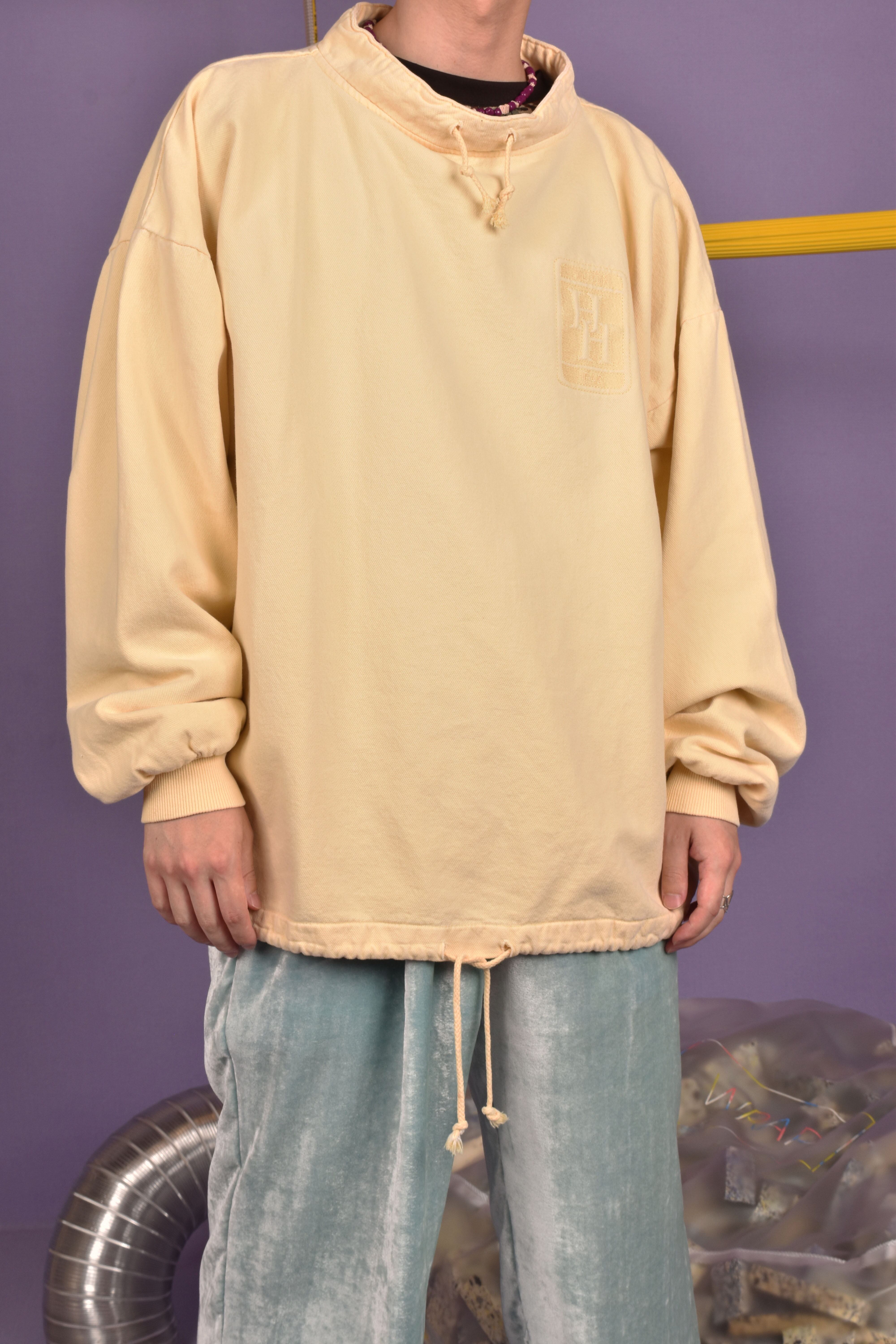 抜群の合わせやすさでWRAP SHOPでは大人気カラーのライトイエロー。やや厚手のしっかりとしたツイル生地で良いボリューム感。裾と首元は紐で絞る事も可能です。写真のように柄物のアイテムとのレイャースタイルがオススメです!ユニセックスです。
