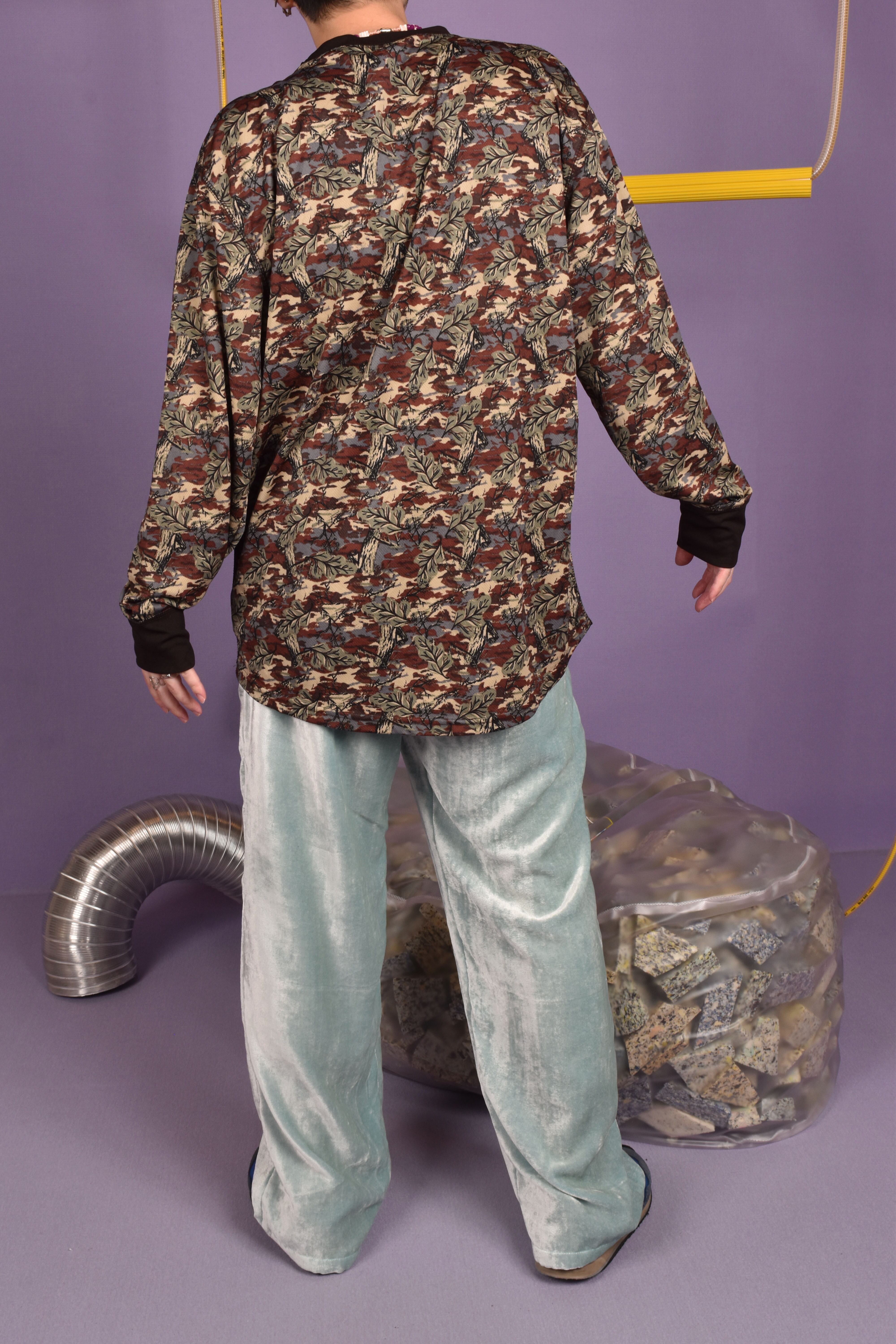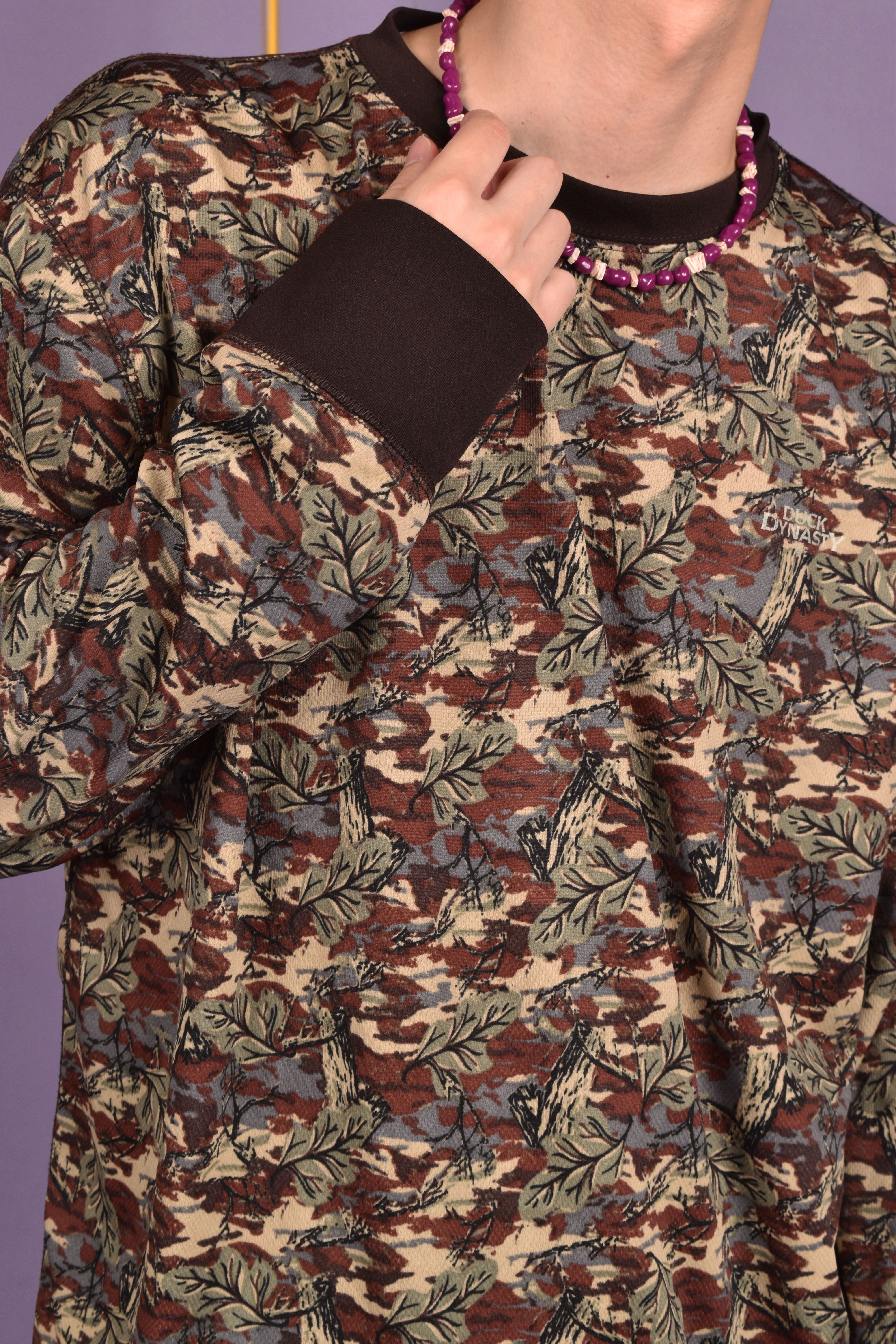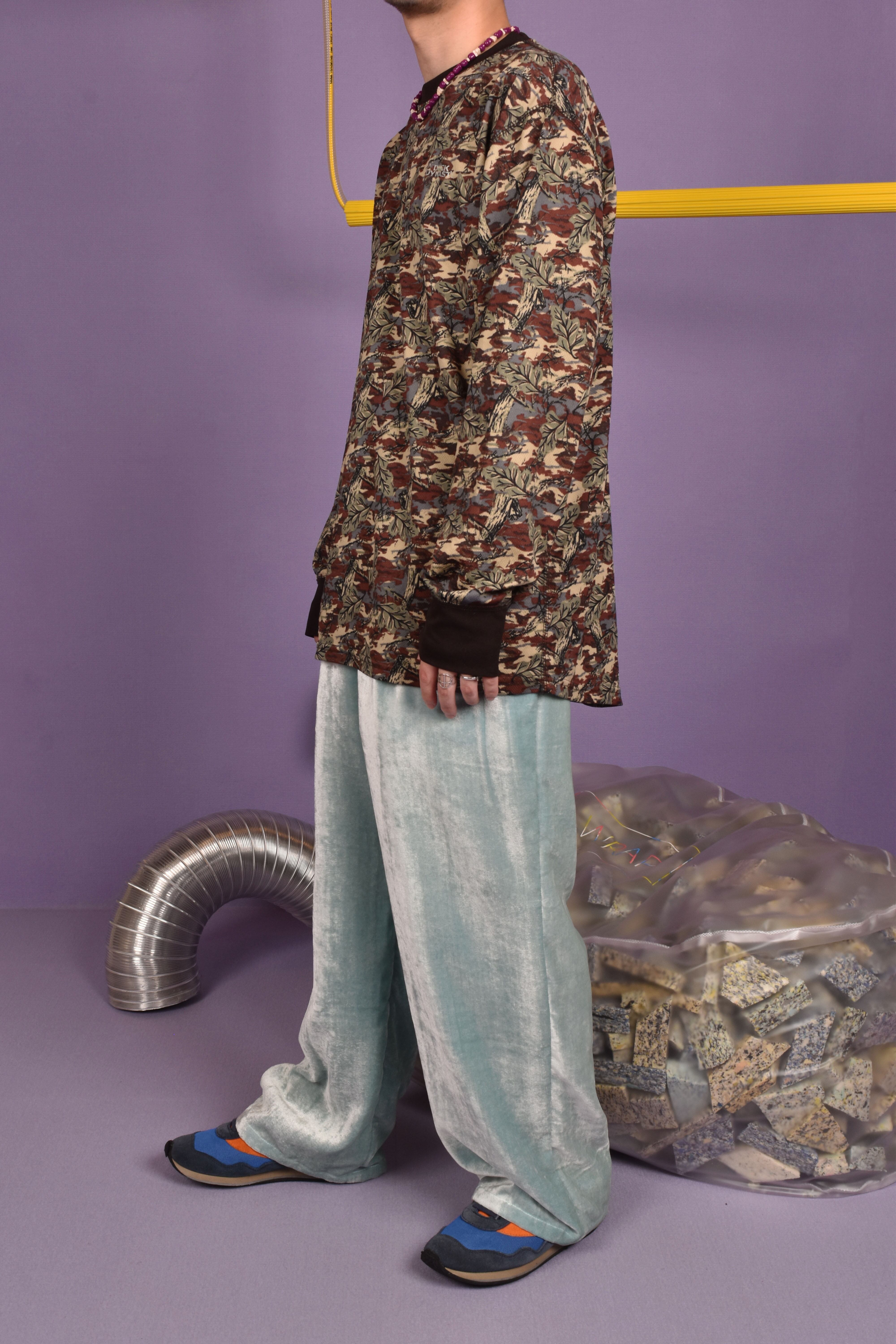 シワになりづらく着心地もさらりと気持ちよい、個人的に大好物なポリ100のロングスリーブTee。これが探すとなかなかない。迷彩モチーフとブラウンのリブカラーの組み合わせがかなり大人っぽく渋い、おしゃれな合わせ。ユニセックス。